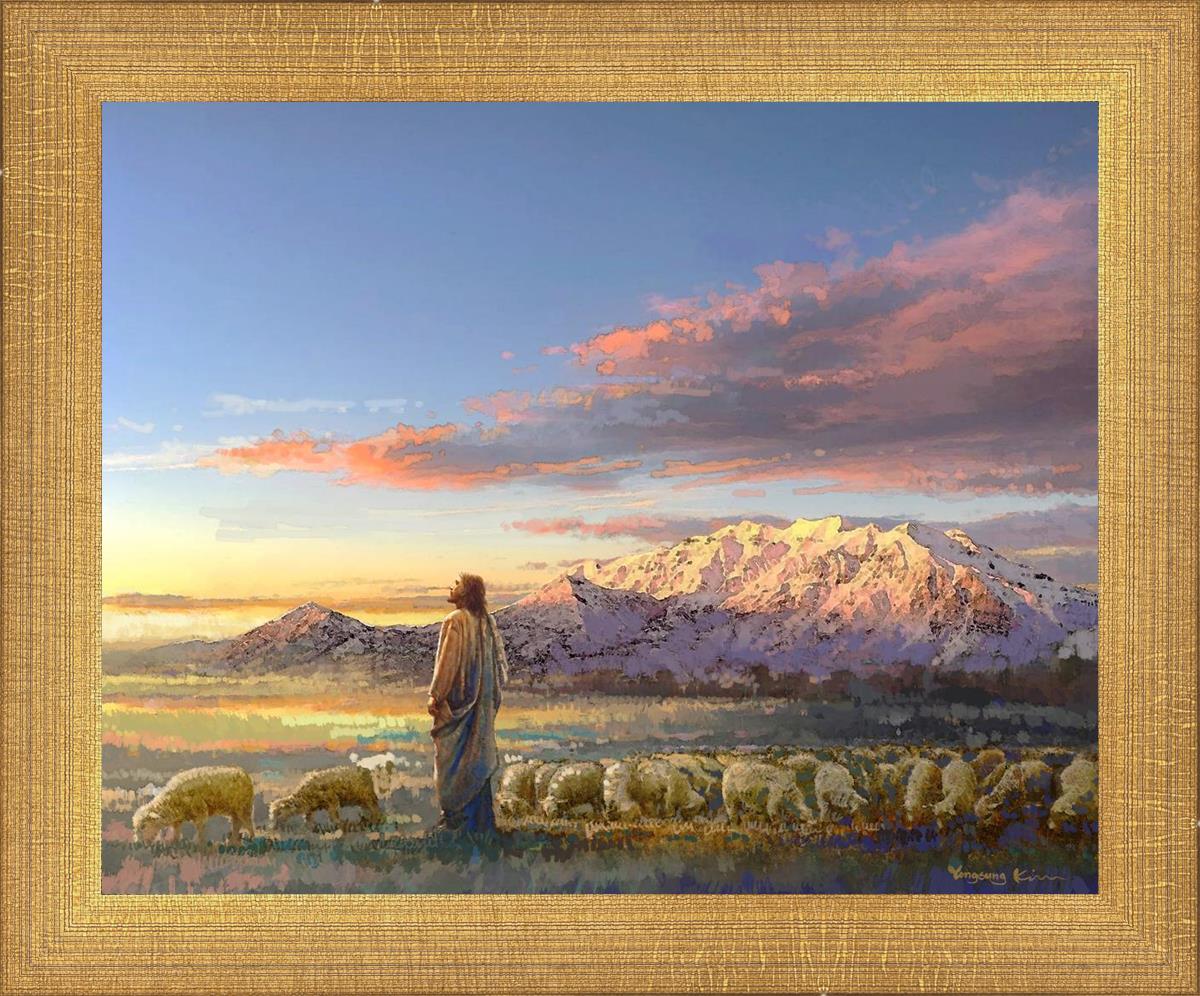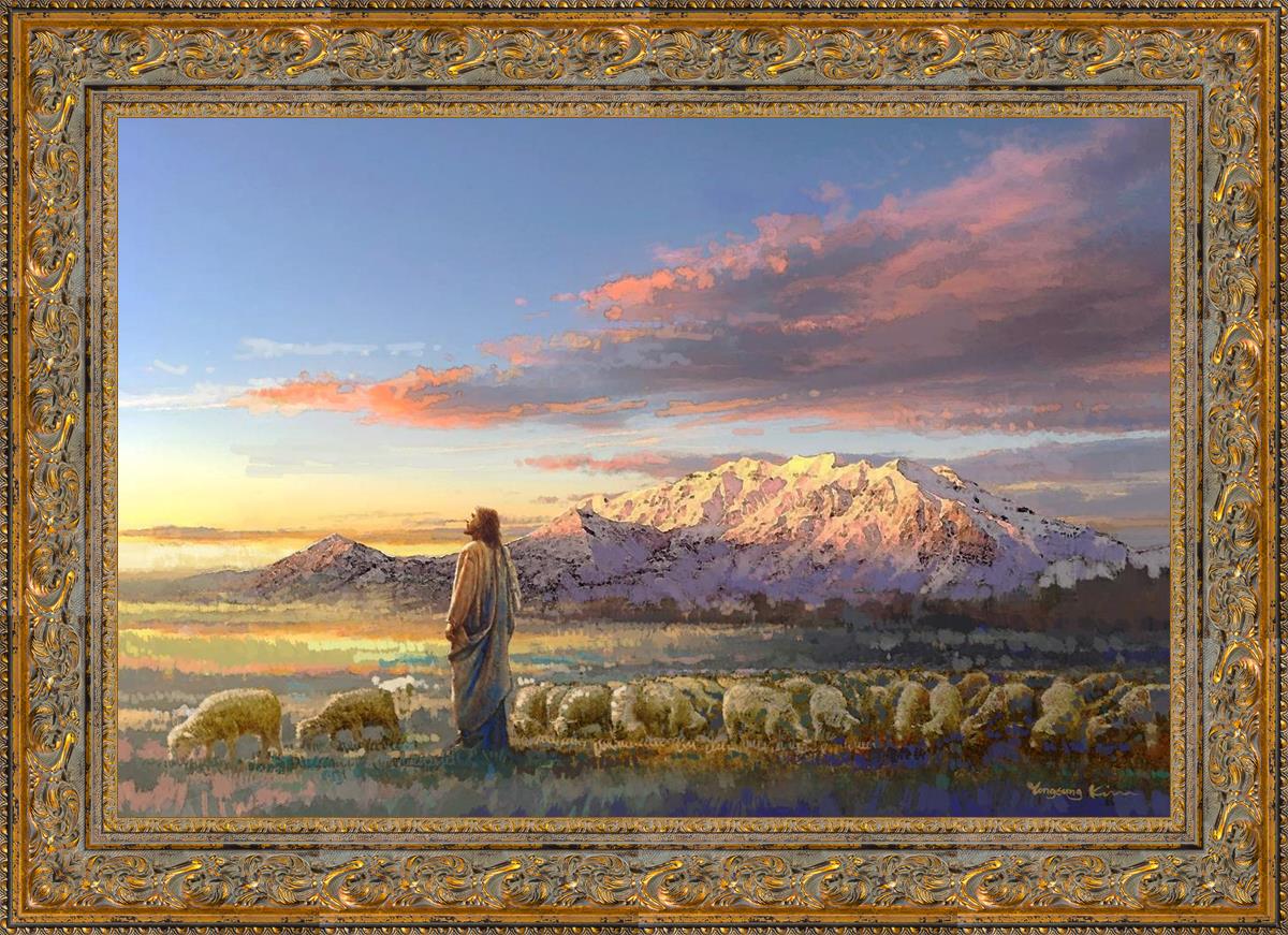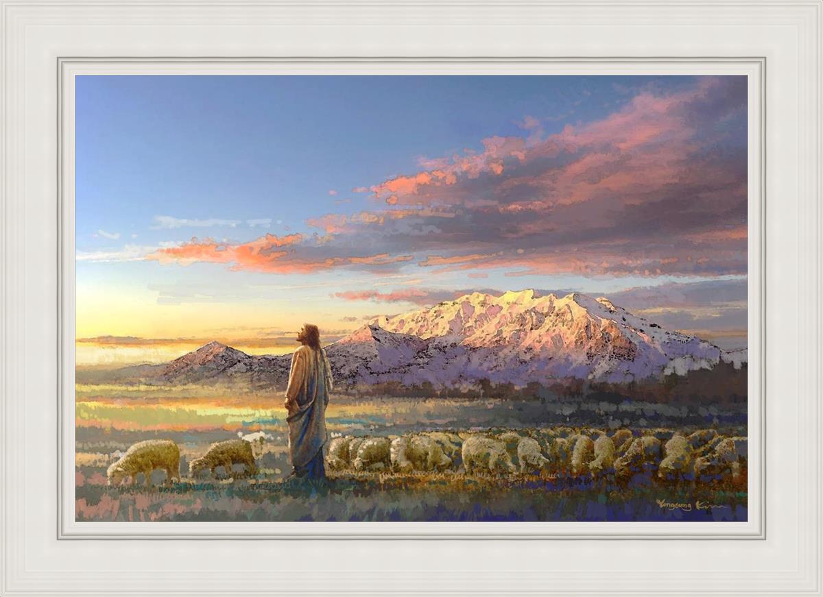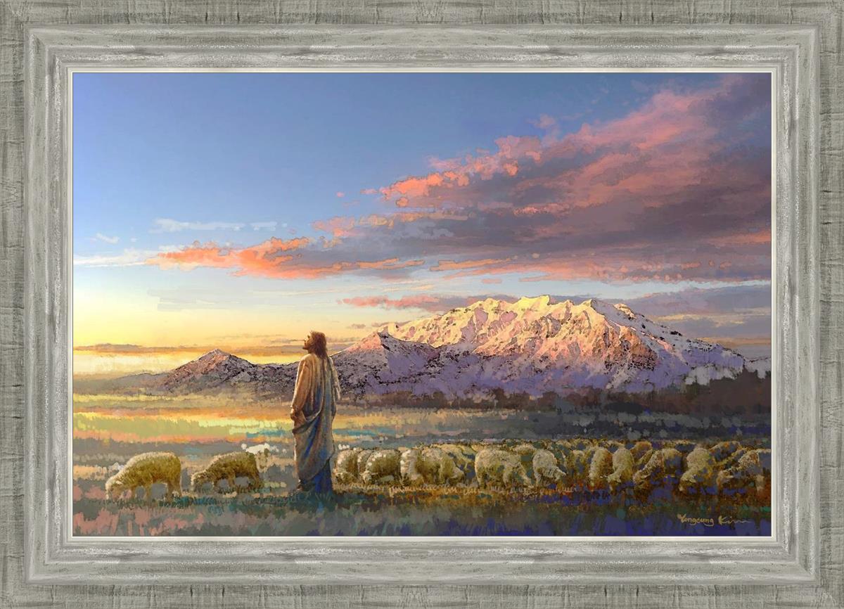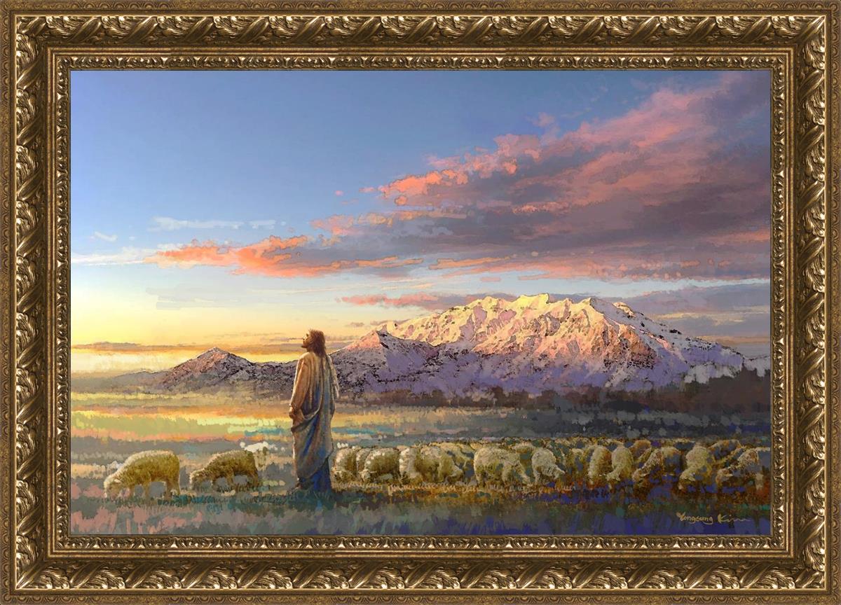 This painting portrays Jesus Christ with His flock of sheep set against a majestic mountain backdrop, where the sun bathes the sky and mountaintops in a warm, radiant glow. The gentle landscape conveys a sense of peace and divine presence. Jesus stands at the center with sheep huddled closely, representing the faithful. The artist's brushstrokes capture the warmth of the moment, inviting viewers to reflect on faith, devotion, and the comfort of divine stewardship.