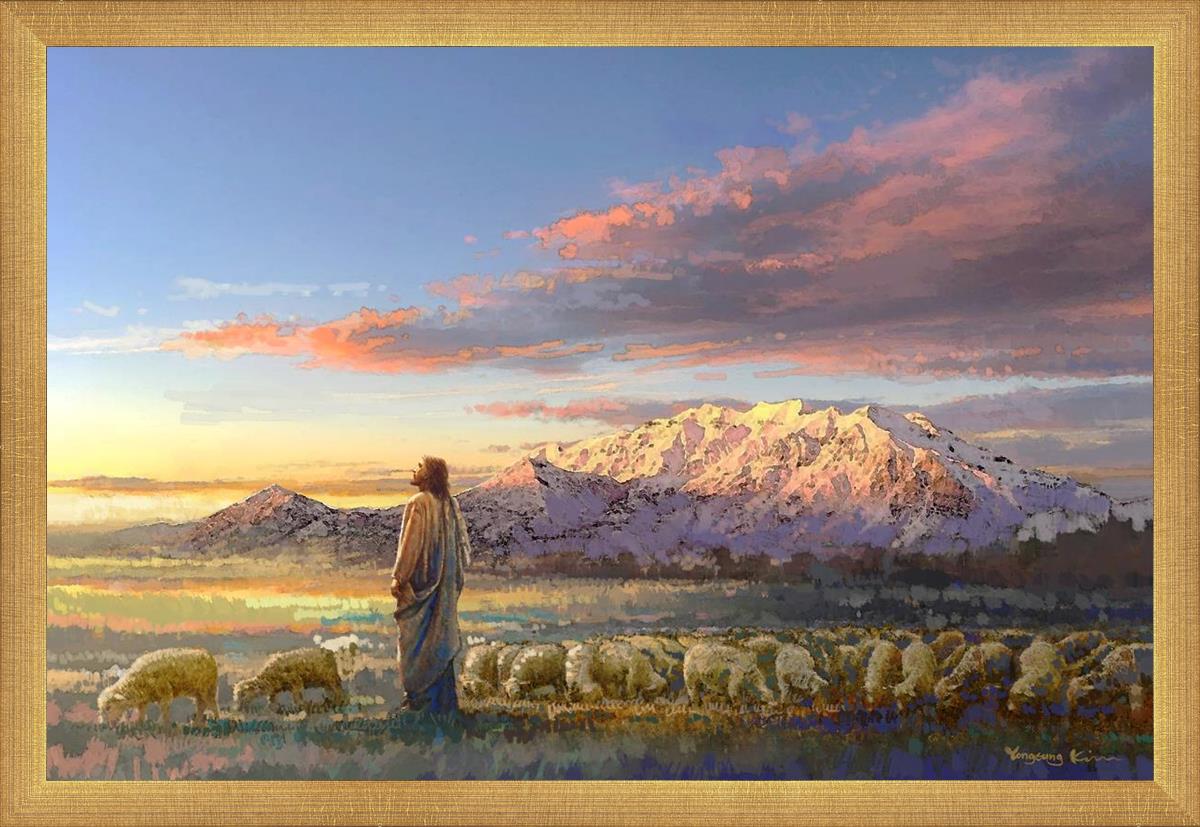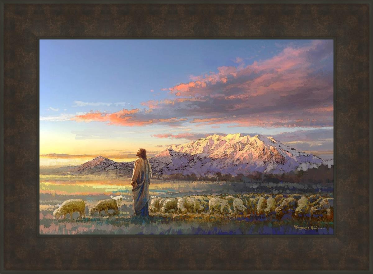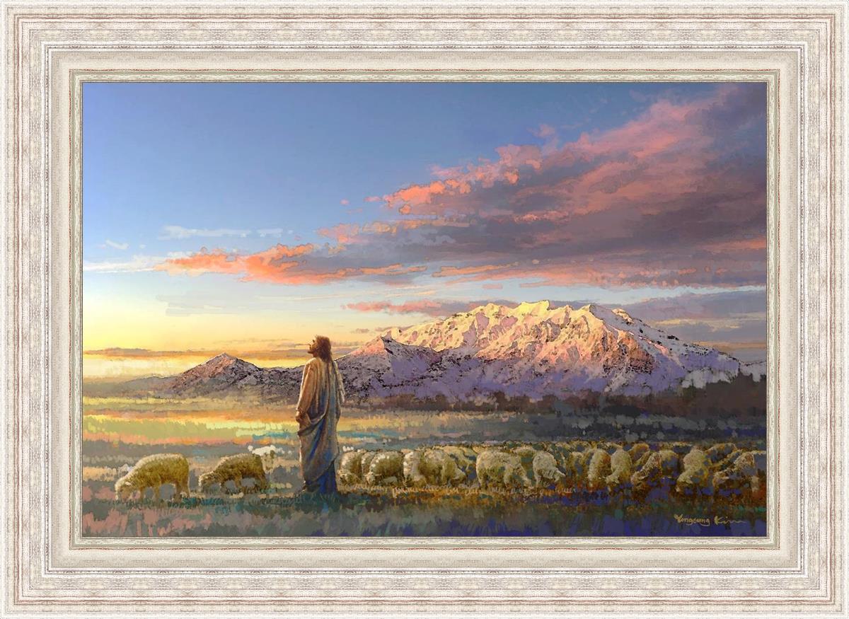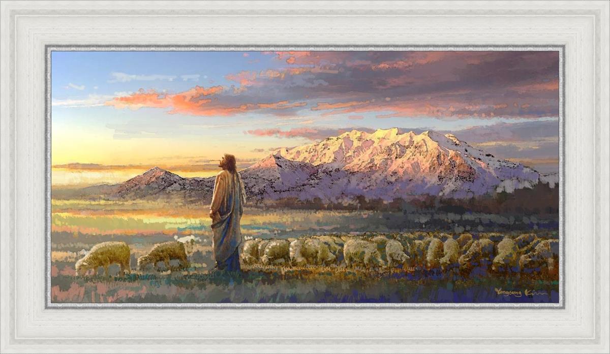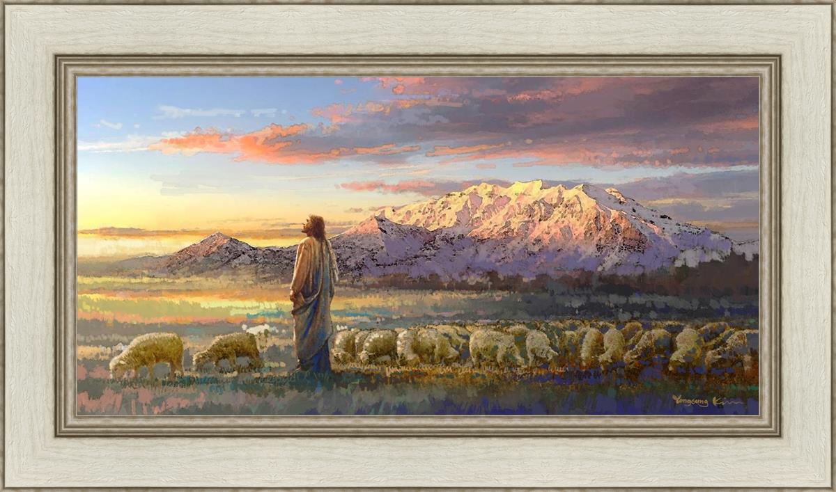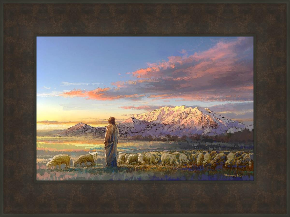 This painting portrays Jesus Christ with His flock of sheep set against a majestic mountain backdrop, where the sun bathes the sky and mountaintops in a warm, radiant glow. The gentle landscape conveys a sense of peace and divine presence. Jesus stands at the center with sheep huddled closely, representing the faithful. The artist's brushstrokes capture the warmth of the moment, inviting viewers to reflect on faith, devotion, and the comfort of divine stewardship.