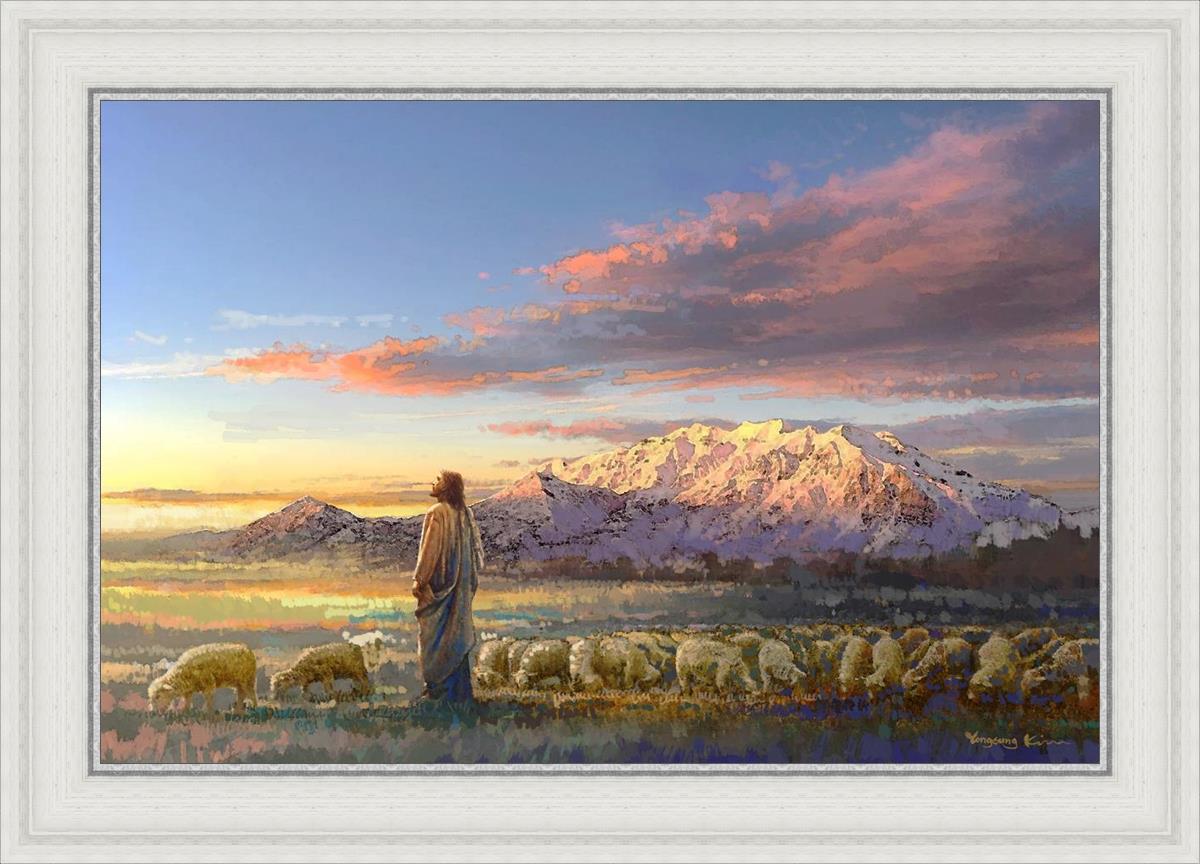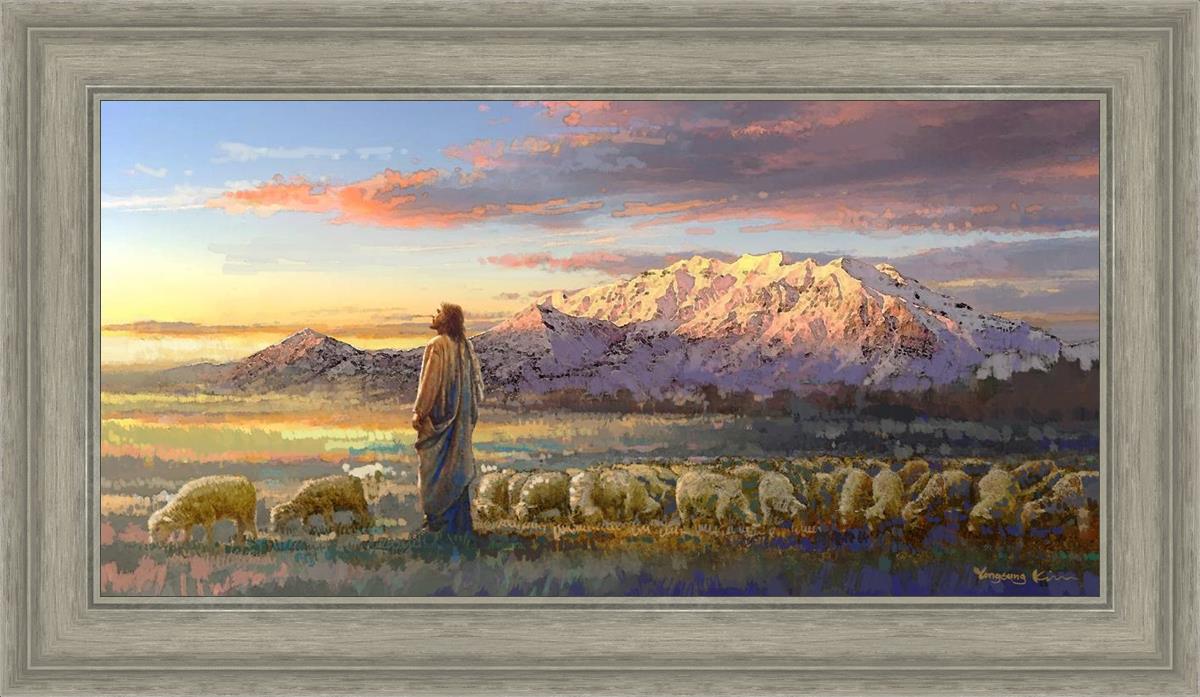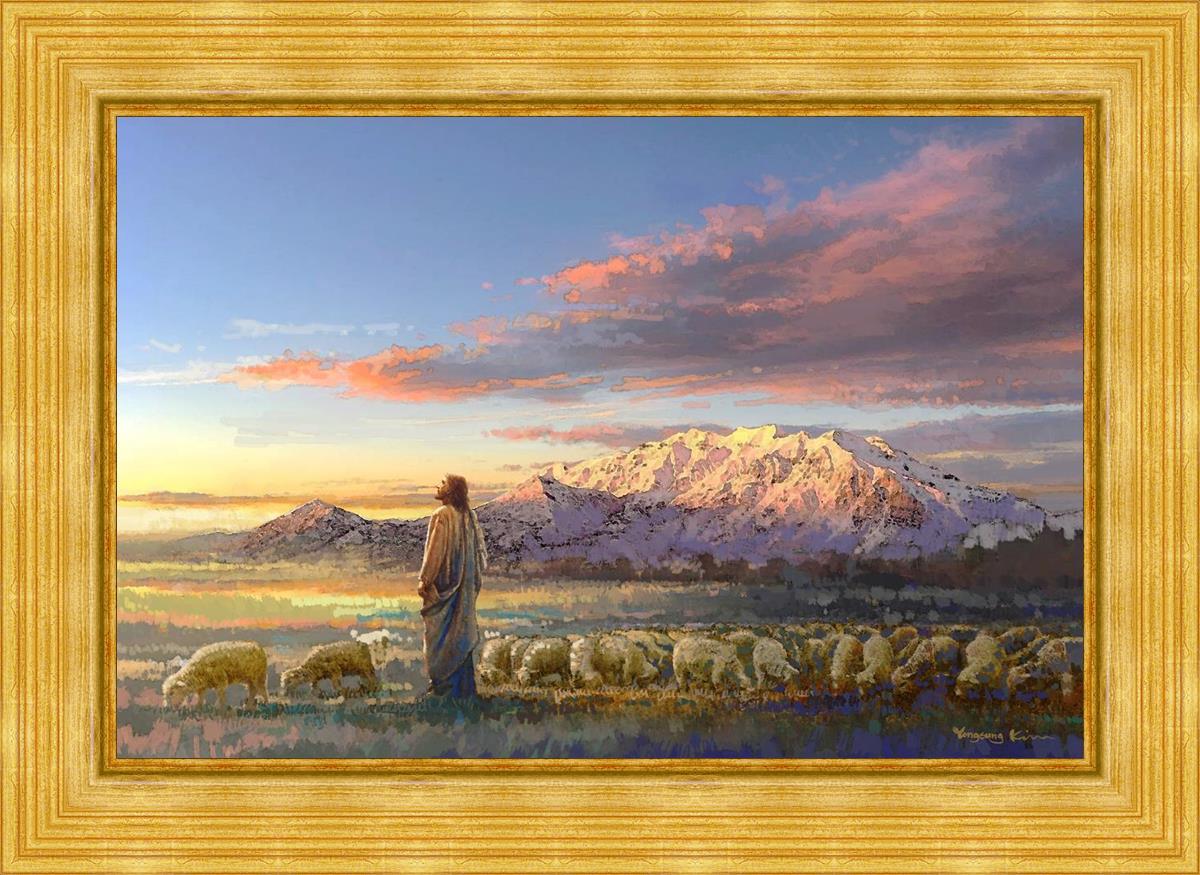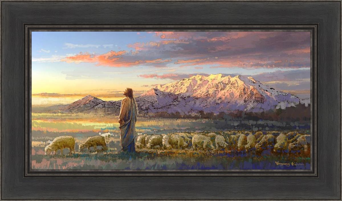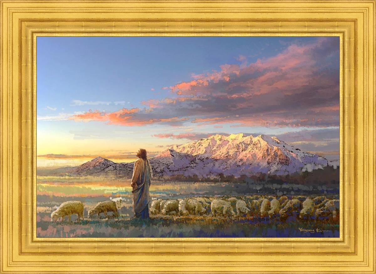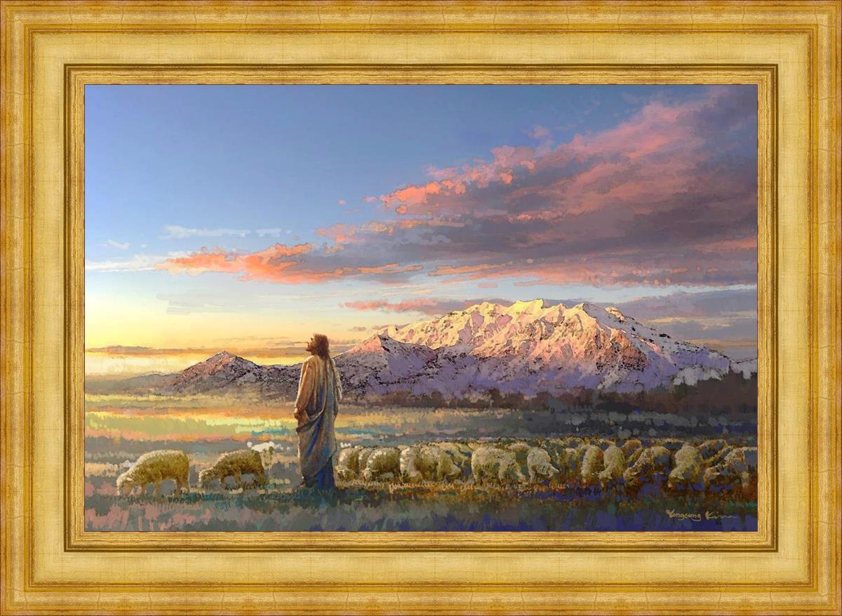 This painting portrays Jesus Christ with His flock of sheep set against a majestic mountain backdrop, where the sun bathes the sky and mountaintops in a warm, radiant glow. The gentle landscape conveys a sense of peace and divine presence. Jesus stands at the center with sheep huddled closely, representing the faithful. The artist's brushstrokes capture the warmth of the moment, inviting viewers to reflect on faith, devotion, and the comfort of divine stewardship.