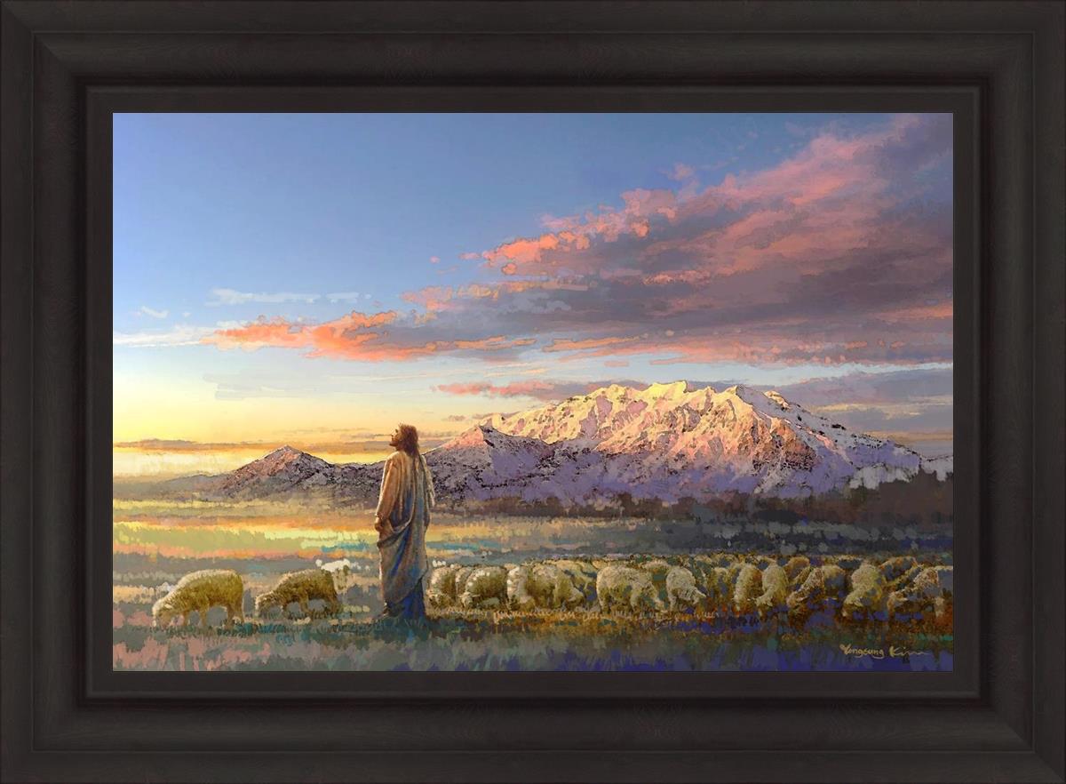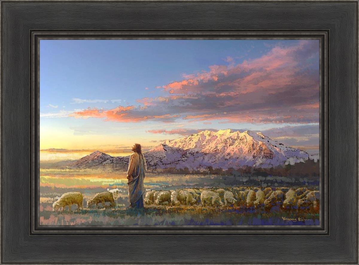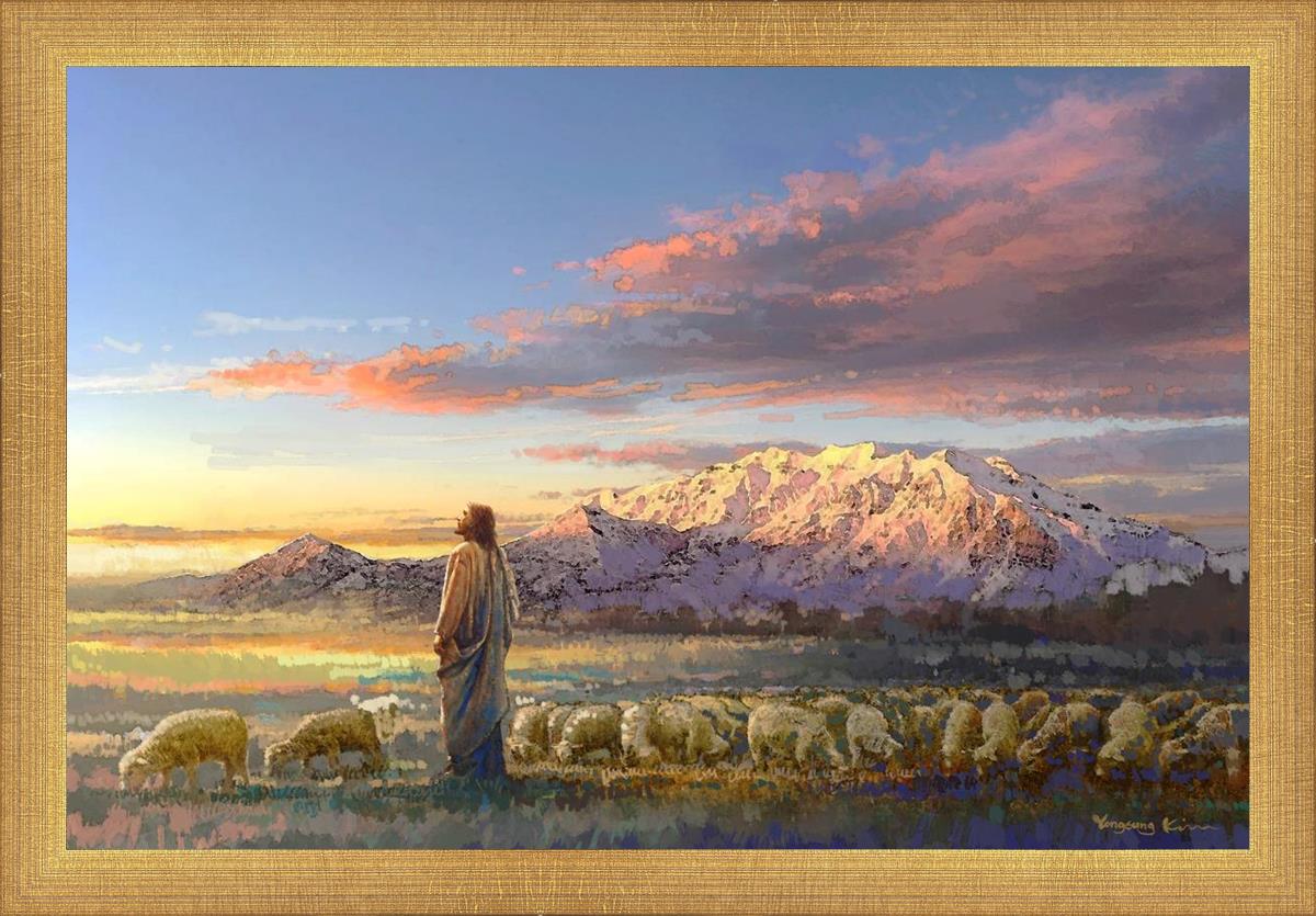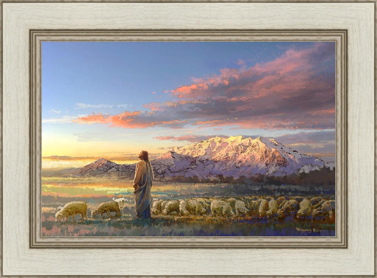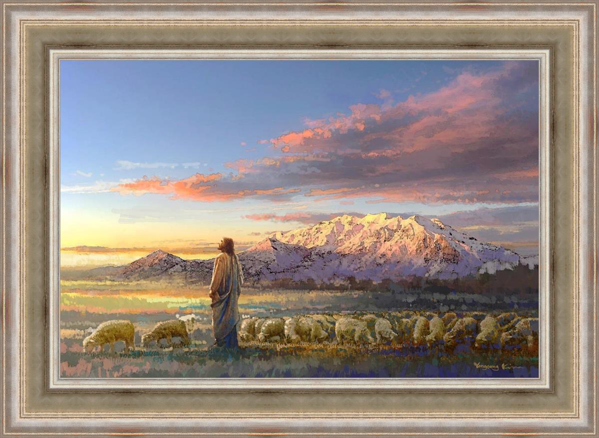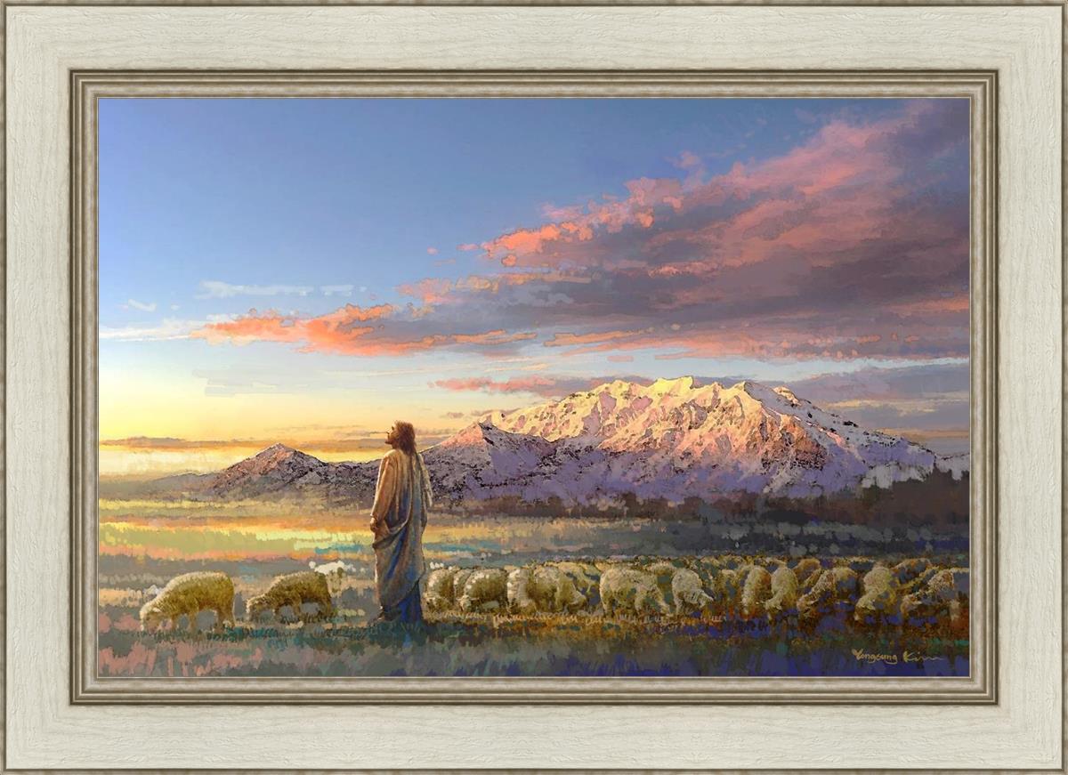 This painting portrays Jesus Christ with His flock of sheep set against a majestic mountain backdrop, where the sun bathes the sky and mountaintops in a warm, radiant glow. The gentle landscape conveys a sense of peace and divine presence. Jesus stands at the center with sheep huddled closely, representing the faithful. The artist's brushstrokes capture the warmth of the moment, inviting viewers to reflect on faith, devotion, and the comfort of divine stewardship.
