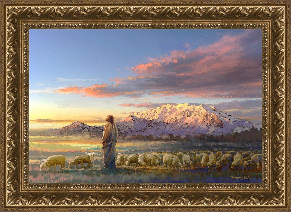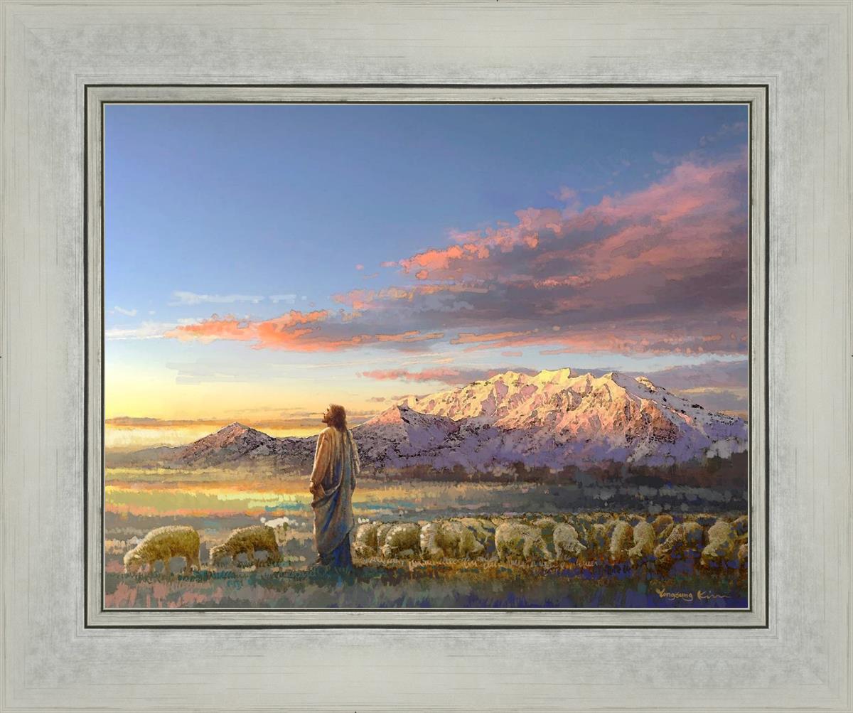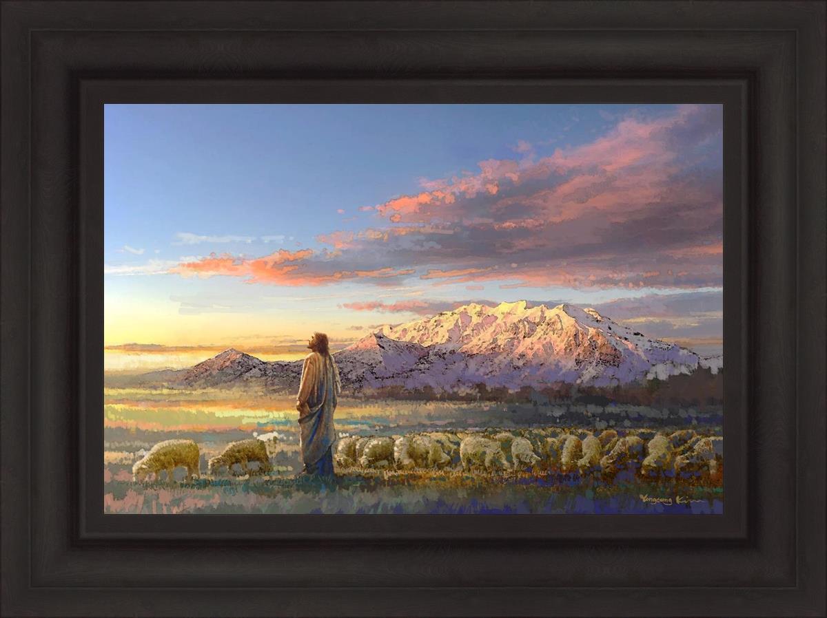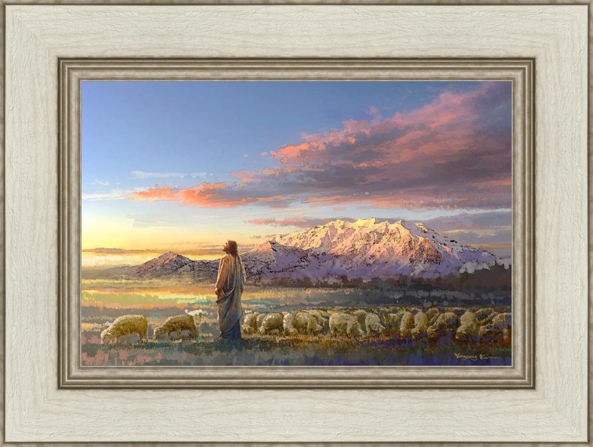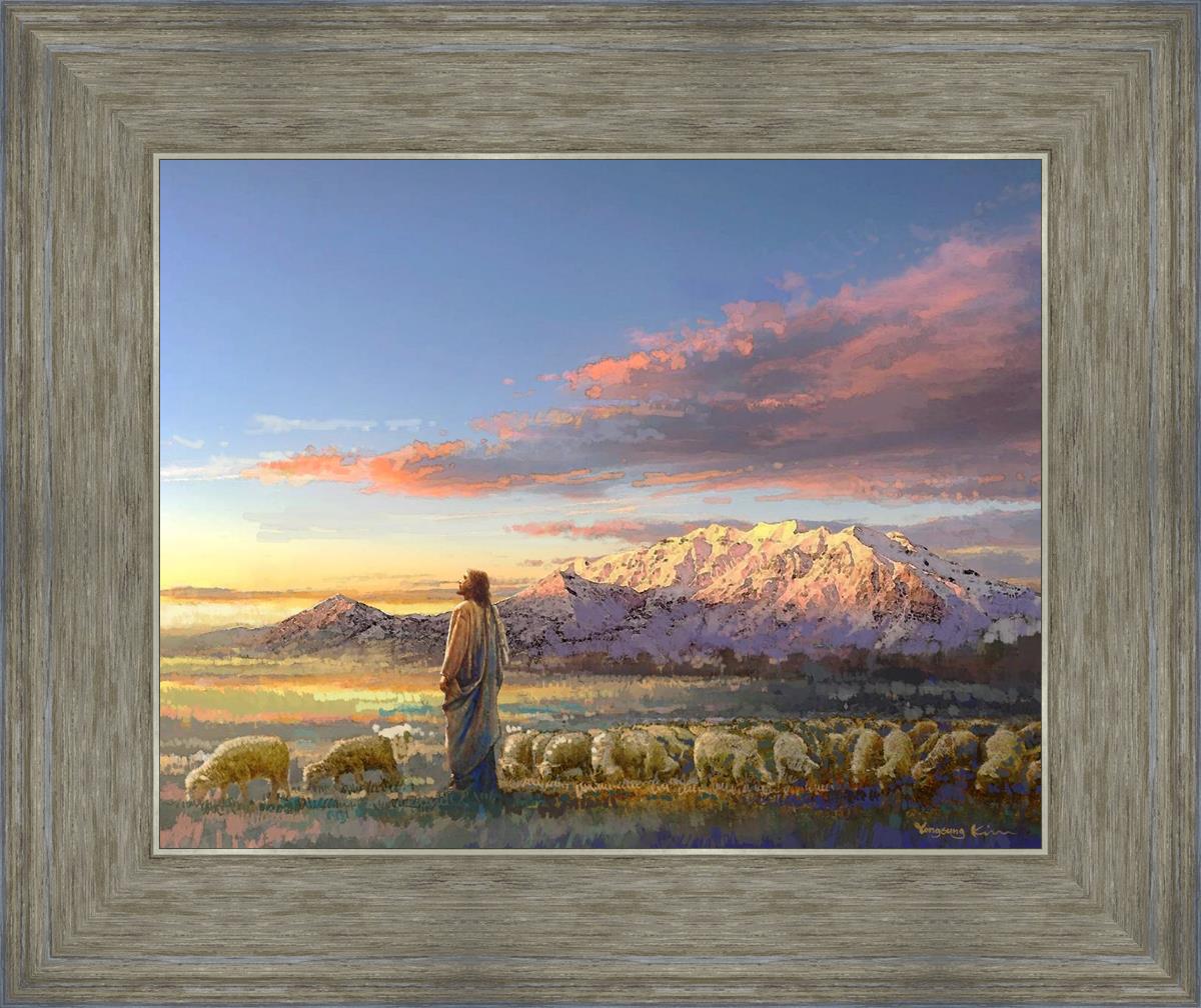 This painting portrays Jesus Christ with His flock of sheep set against a majestic mountain backdrop, where the sun bathes the sky and mountaintops in a warm, radiant glow. The gentle landscape conveys a sense of peace and divine presence. Jesus stands at the center with sheep huddled closely, representing the faithful. The artist's brushstrokes capture the warmth of the moment, inviting viewers to reflect on faith, devotion, and the comfort of divine stewardship.