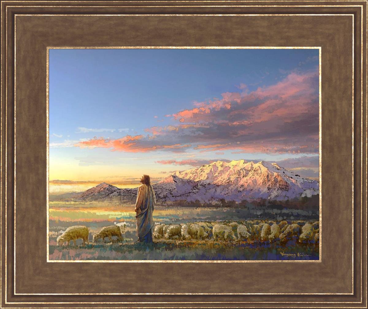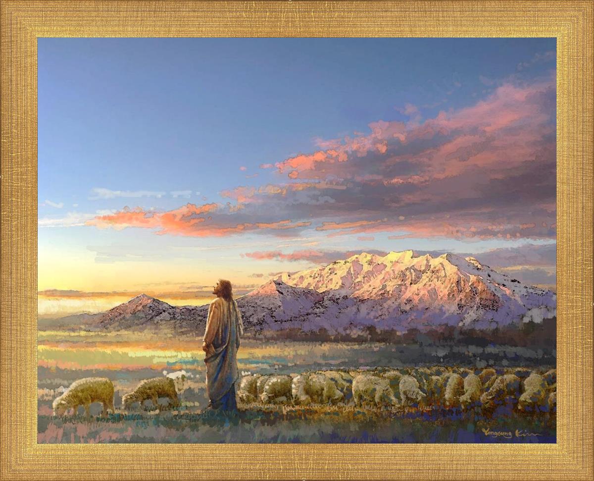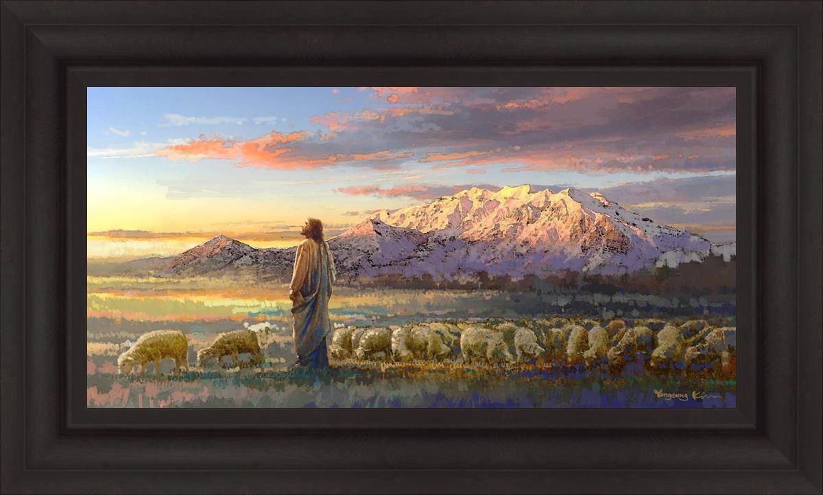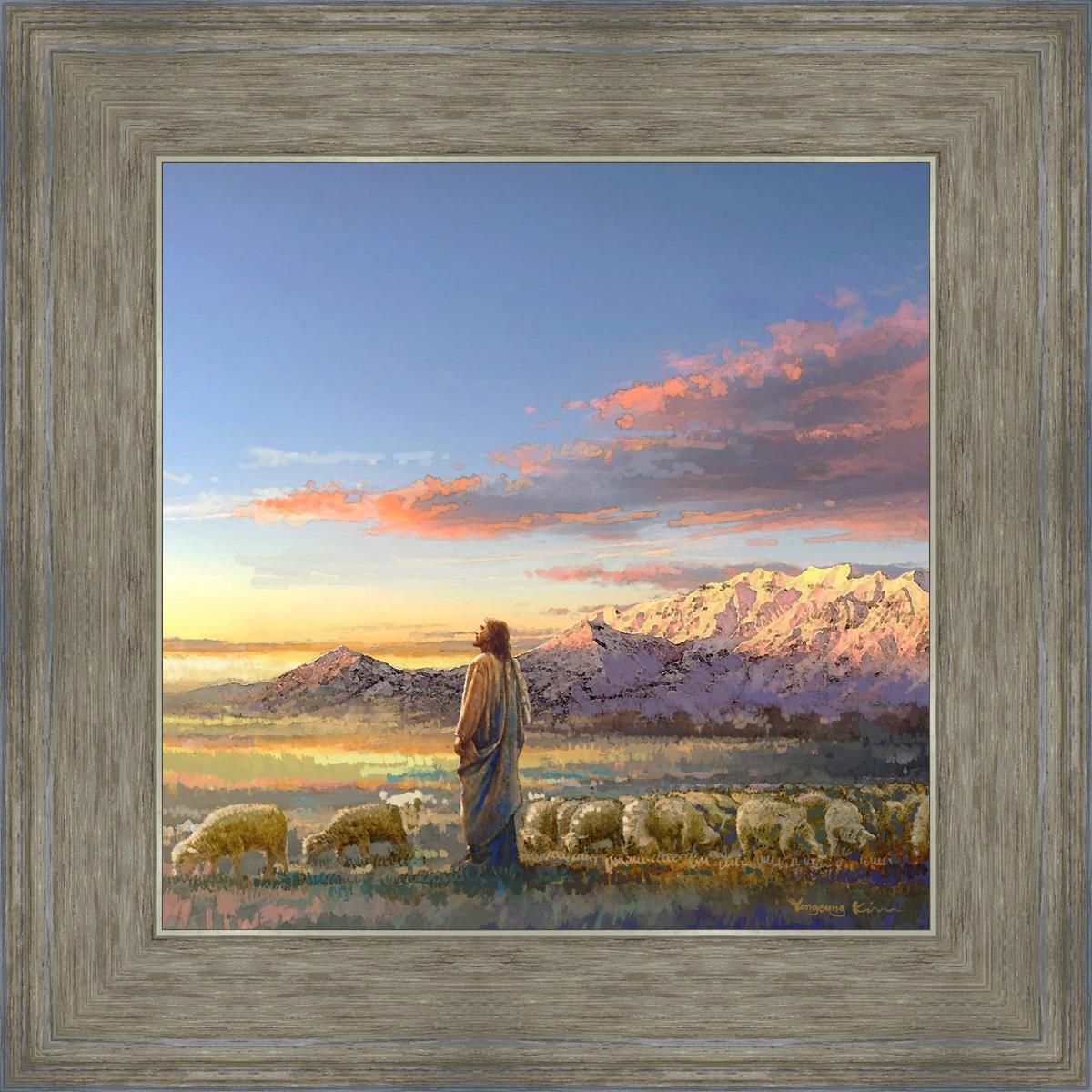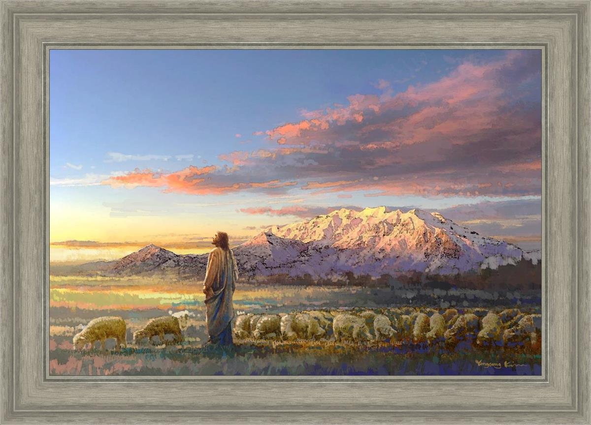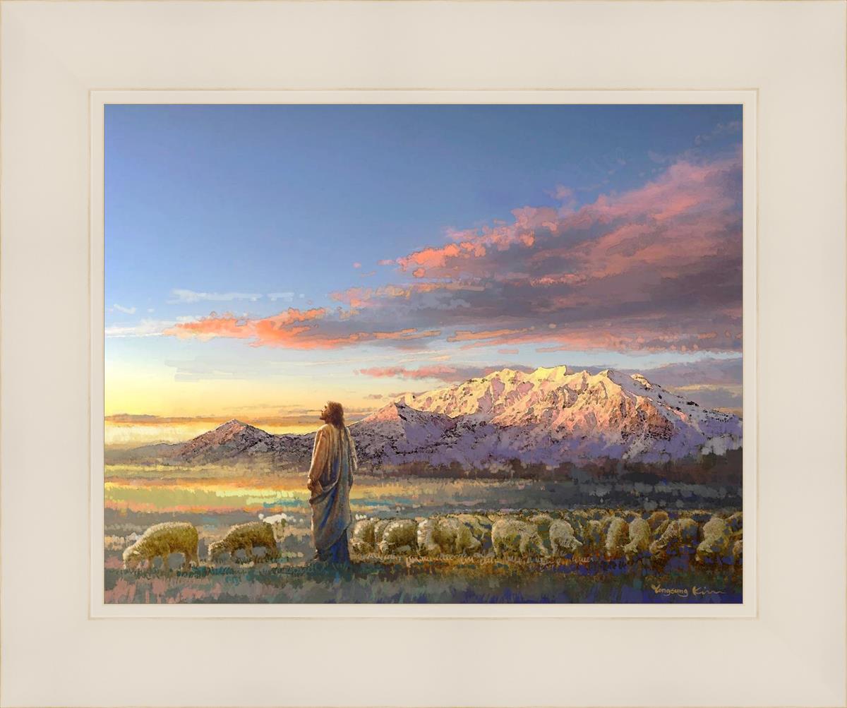This painting portrays Jesus Christ with His flock of sheep set against a majestic mountain backdrop, where the sun bathes the sky and mountaintops in a warm, radiant glow. The gentle landscape conveys a sense of peace and divine presence. Jesus stands at the center with sheep huddled closely, representing the faithful. The artist's brushstrokes capture the warmth of the moment, inviting viewers to reflect on faith, devotion, and the comfort of divine stewardship.