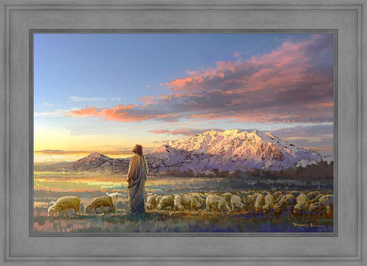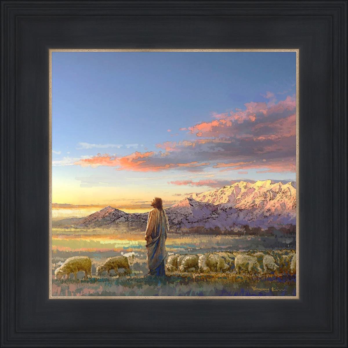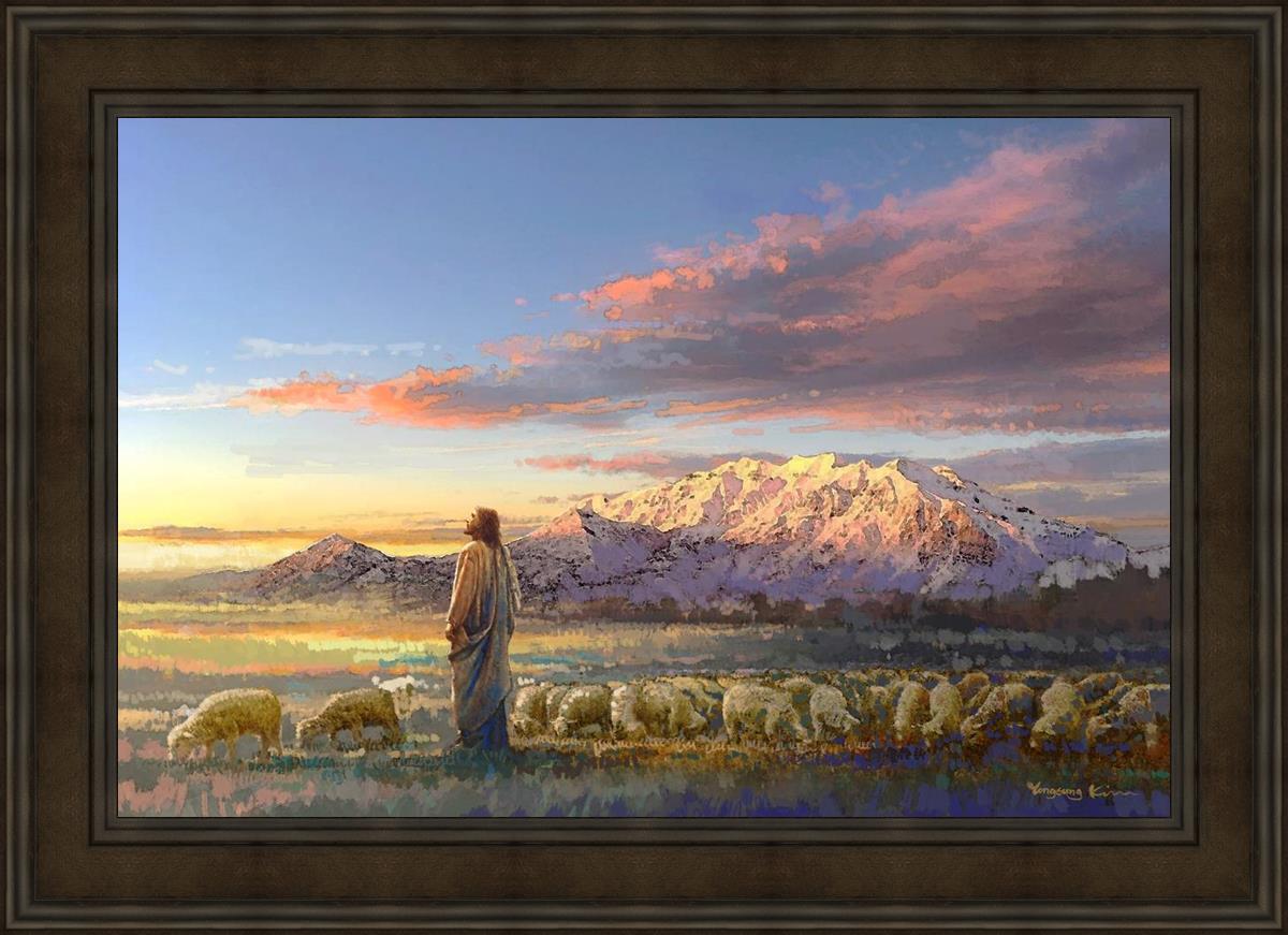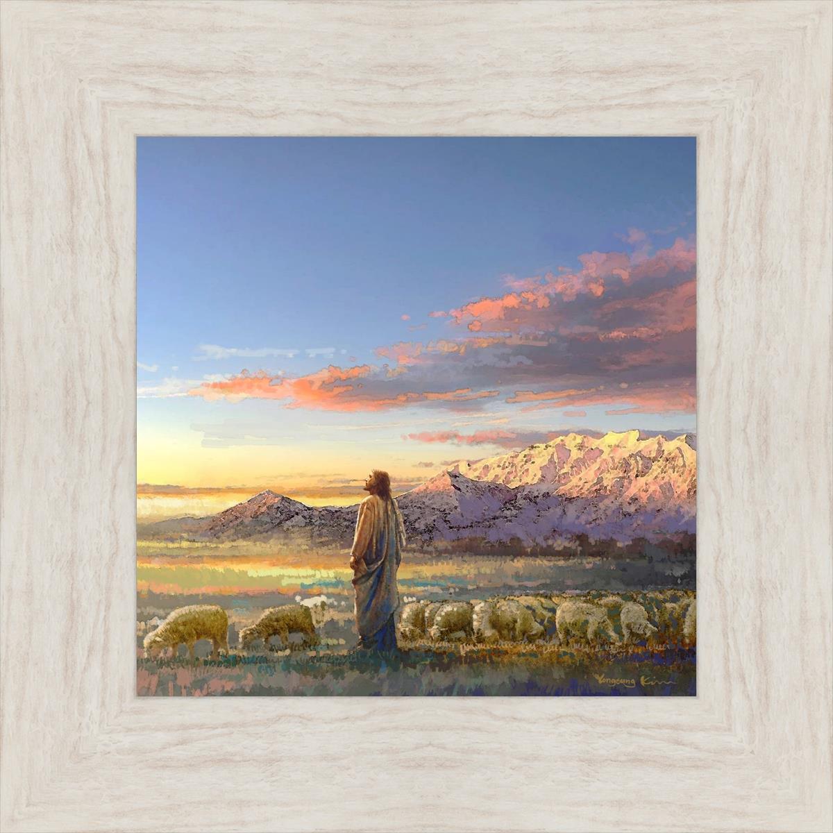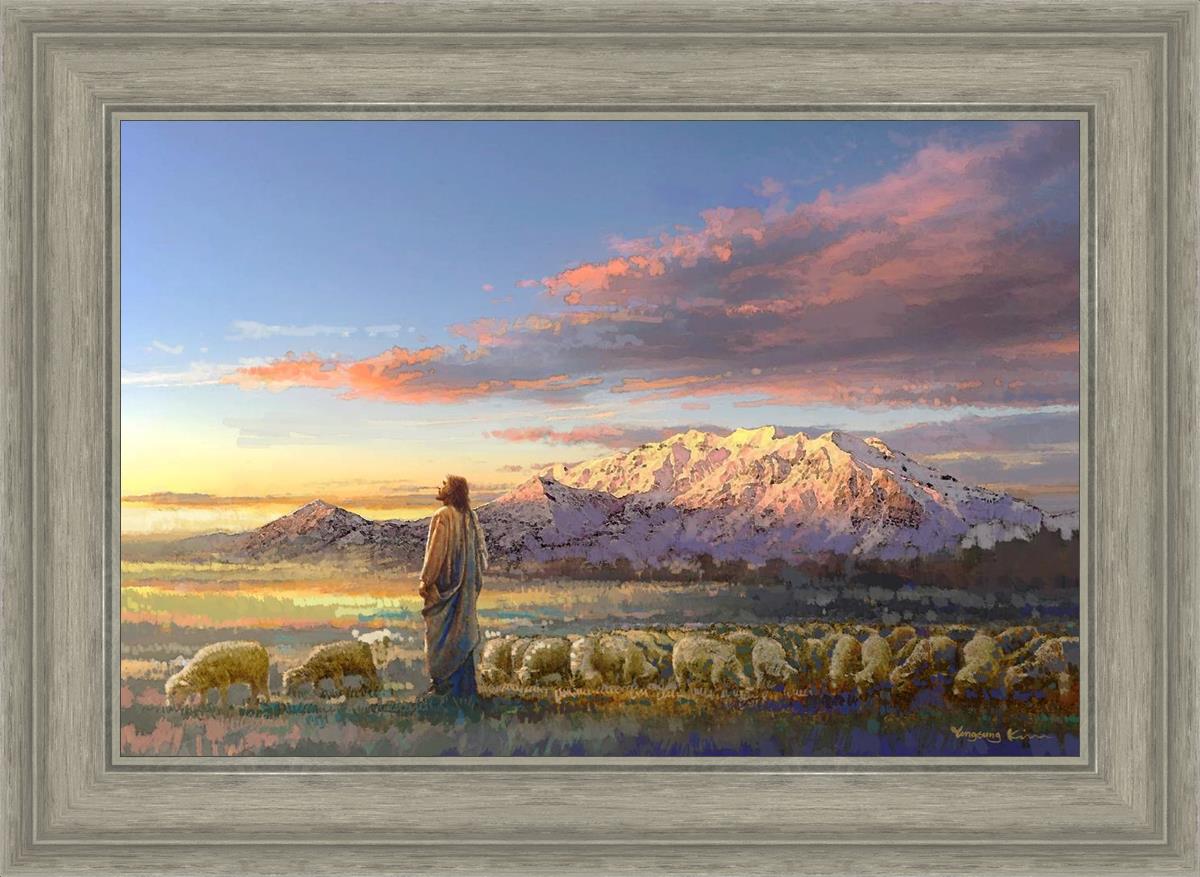 This painting portrays Jesus Christ with His flock of sheep set against a majestic mountain backdrop, where the sun bathes the sky and mountaintops in a warm, radiant glow. The gentle landscape conveys a sense of peace and divine presence. Jesus stands at the center with sheep huddled closely, representing the faithful. The artist's brushstrokes capture the warmth of the moment, inviting viewers to reflect on faith, devotion, and the comfort of divine stewardship.
