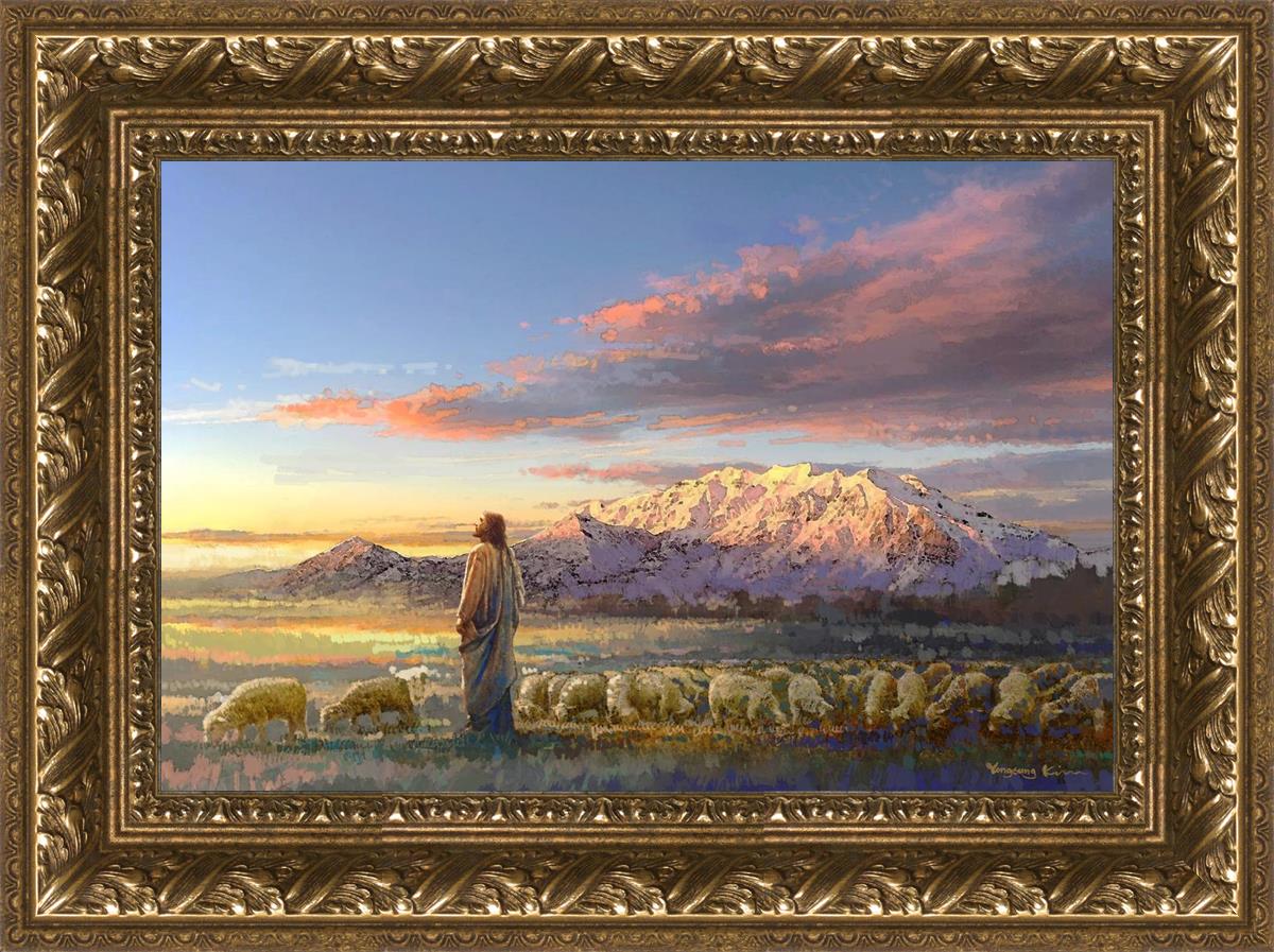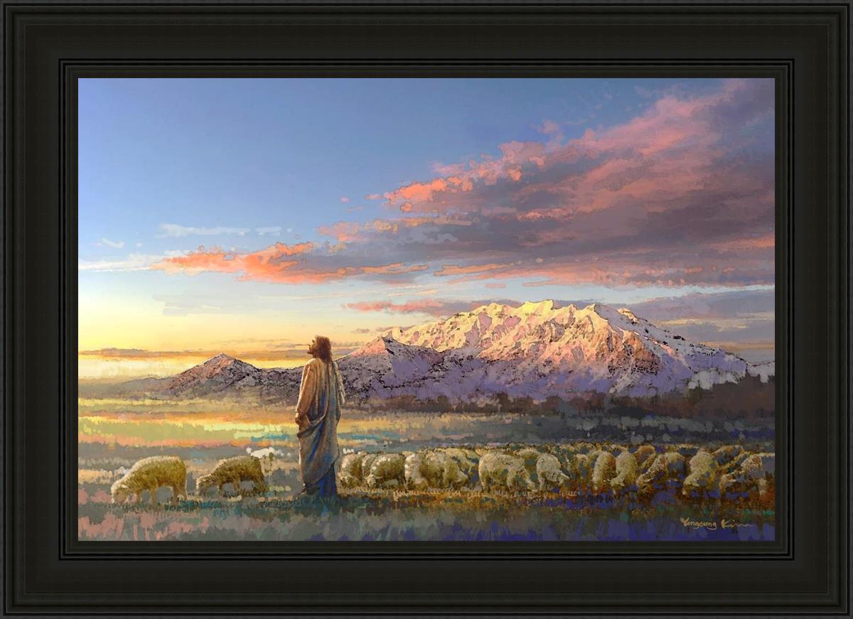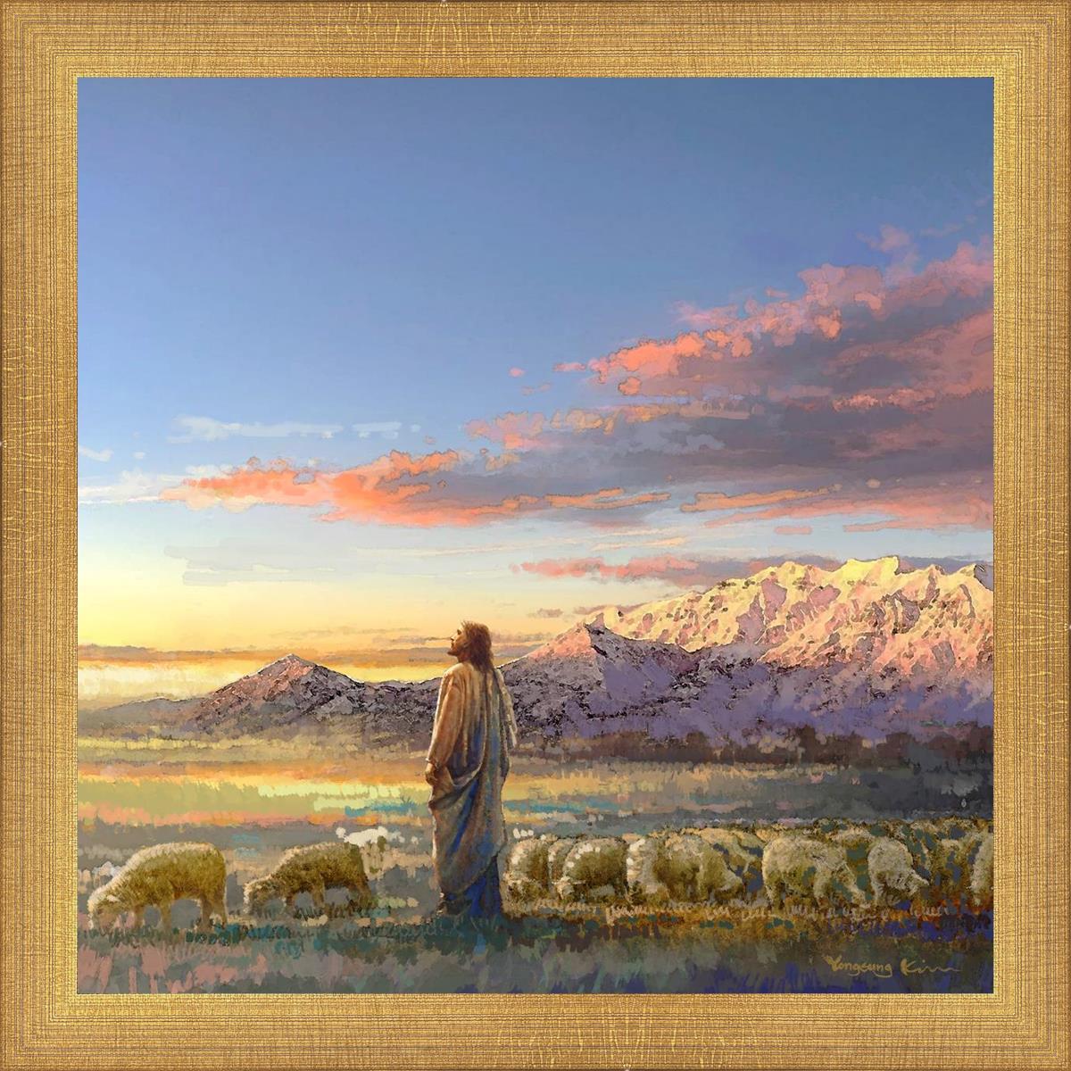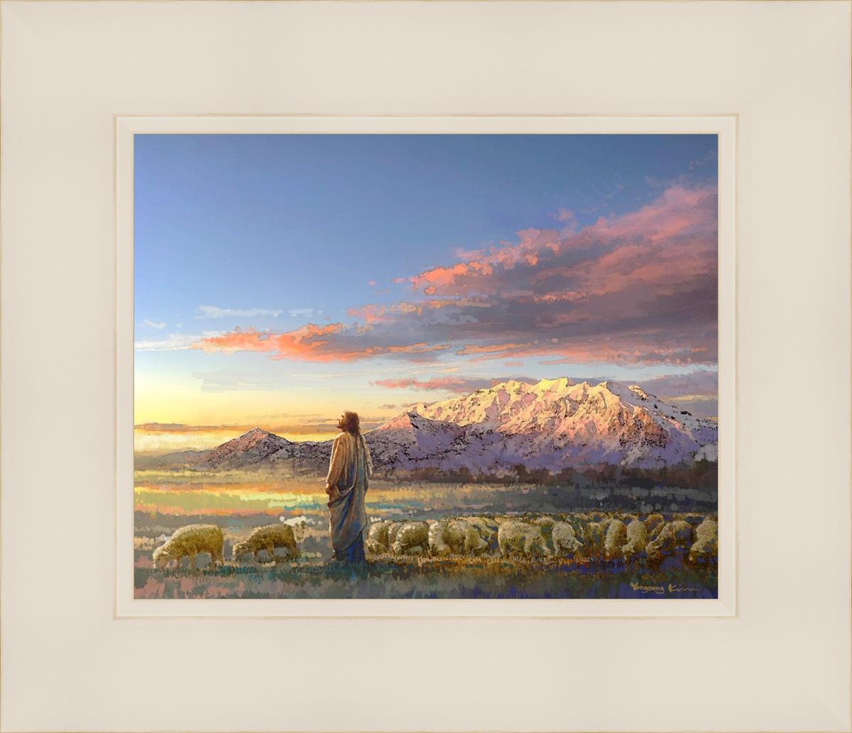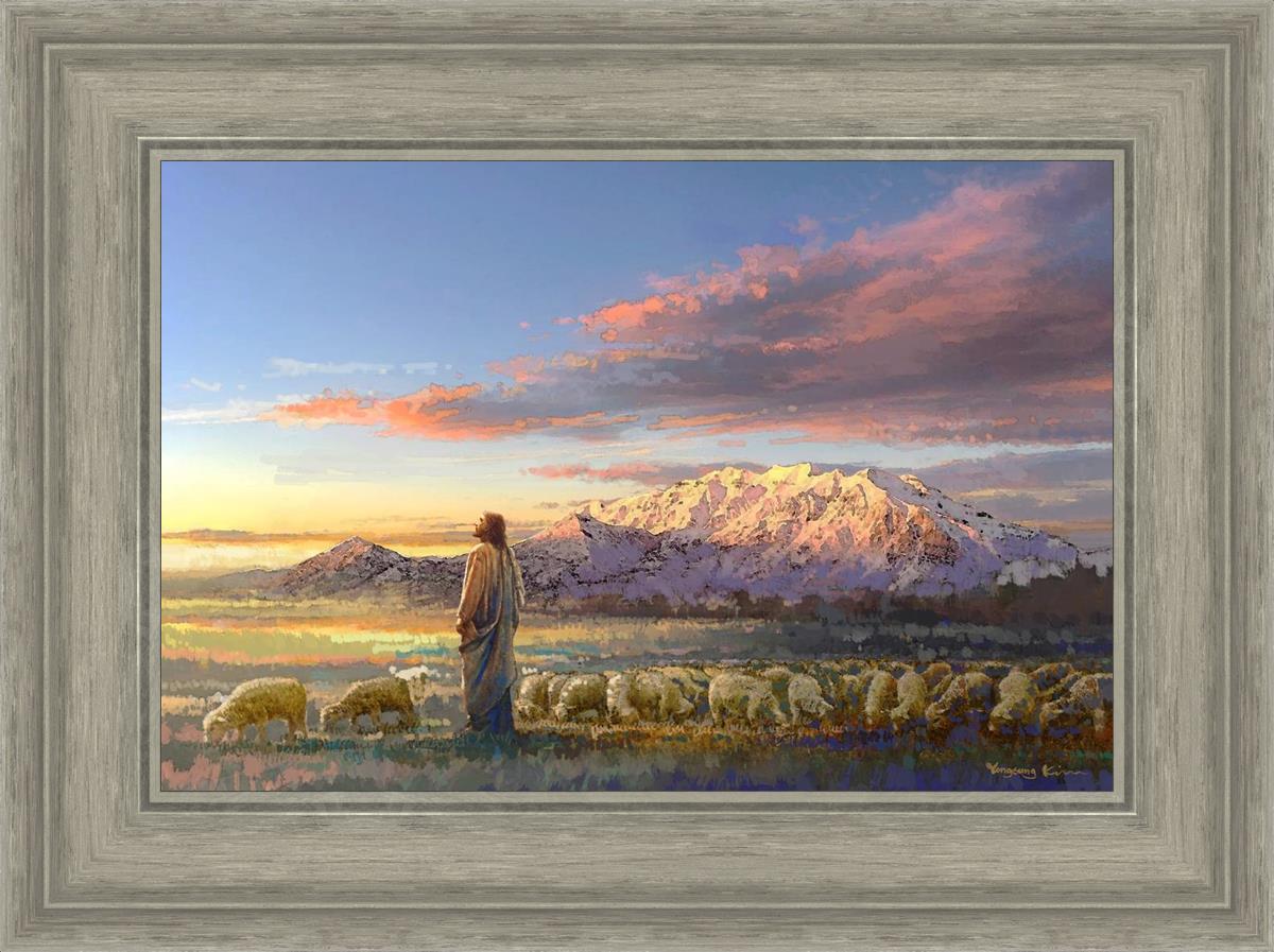 This painting portrays Jesus Christ with His flock of sheep set against a majestic mountain backdrop, where the sun bathes the sky and mountaintops in a warm, radiant glow. The gentle landscape conveys a sense of peace and divine presence. Jesus stands at the center with sheep huddled closely, representing the faithful. The artist's brushstrokes capture the warmth of the moment, inviting viewers to reflect on faith, devotion, and the comfort of divine stewardship.
