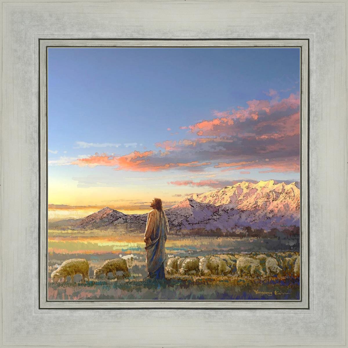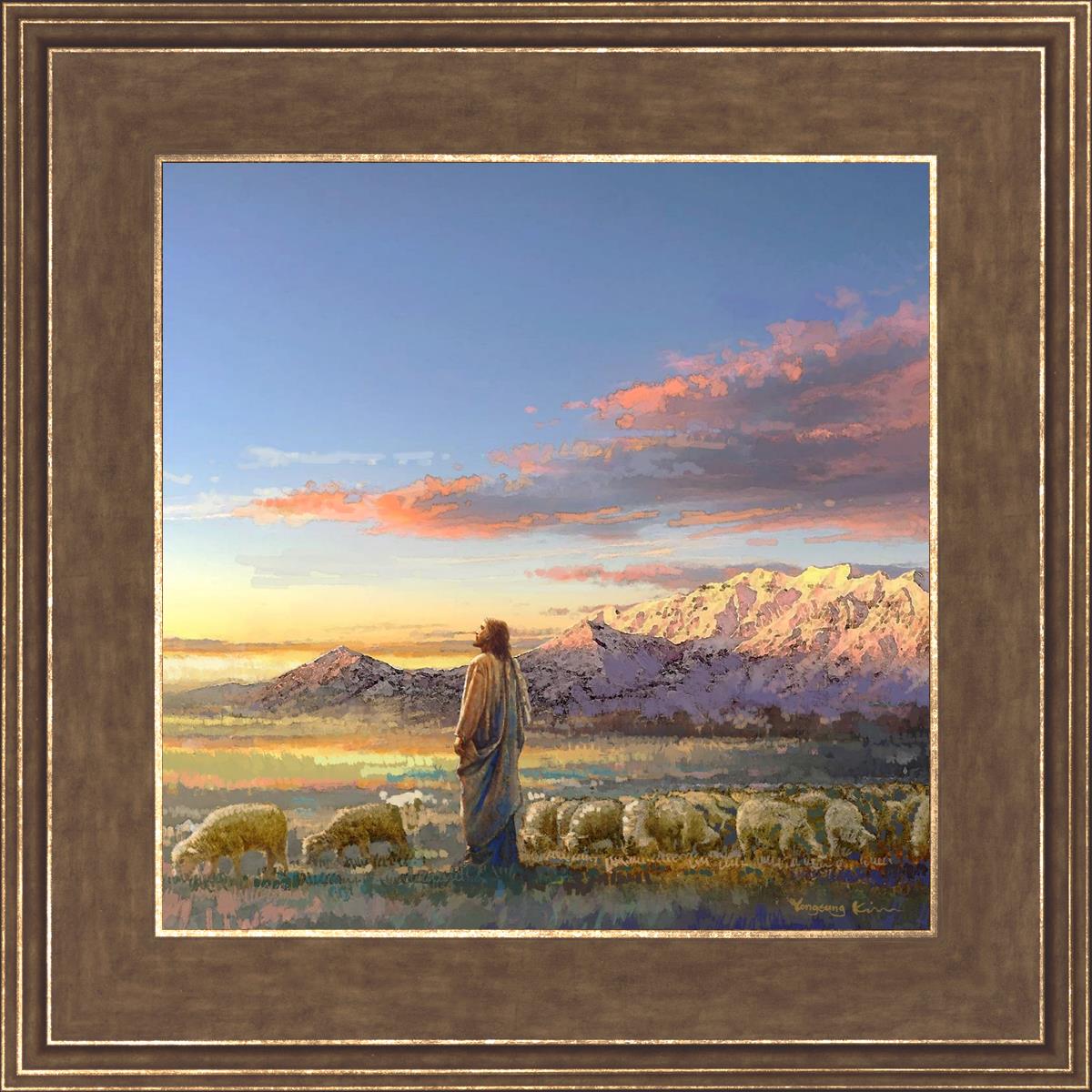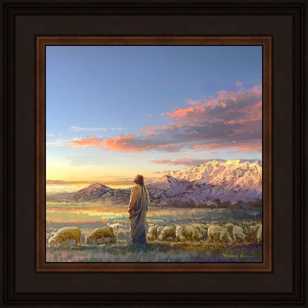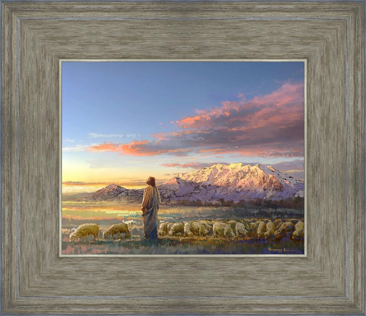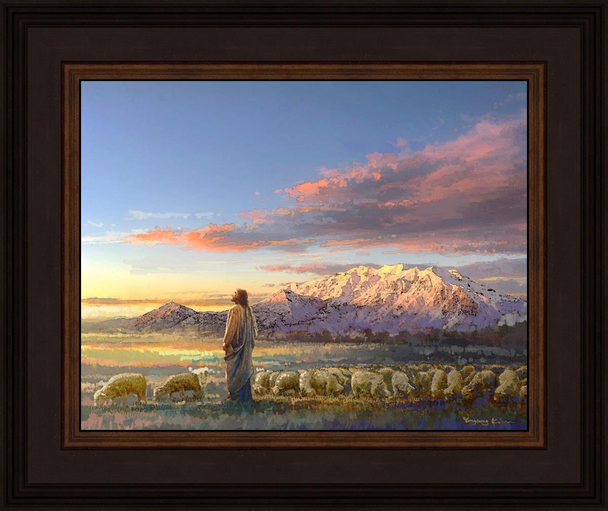 This painting portrays Jesus Christ with His flock of sheep set against a majestic mountain backdrop, where the sun bathes the sky and mountaintops in a warm, radiant glow. The gentle landscape conveys a sense of peace and divine presence. Jesus stands at the center with sheep huddled closely, representing the faithful. The artist's brushstrokes capture the warmth of the moment, inviting viewers to reflect on faith, devotion, and the comfort of divine stewardship.