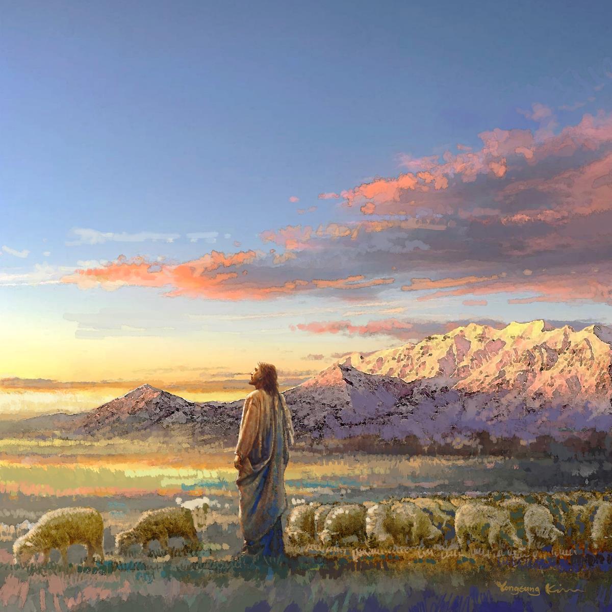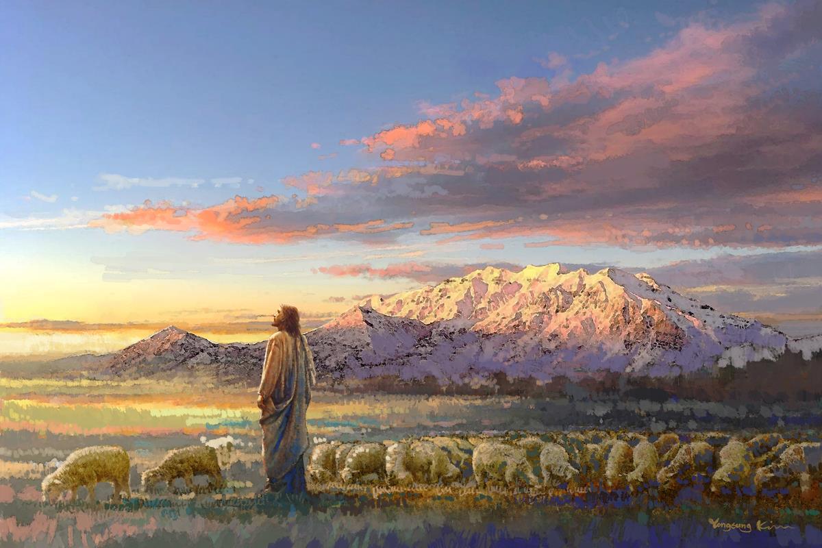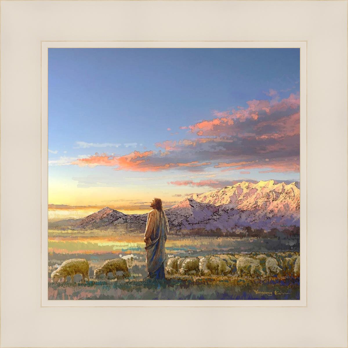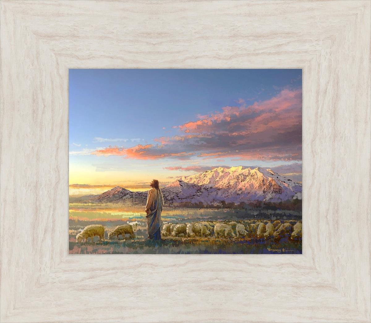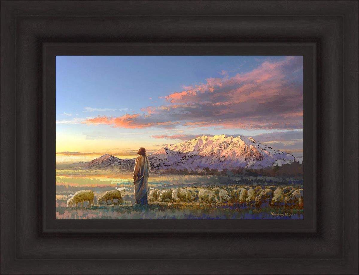 This painting portrays Jesus Christ with His flock of sheep set against a majestic mountain backdrop, where the sun bathes the sky and mountaintops in a warm, radiant glow. The gentle landscape conveys a sense of peace and divine presence. Jesus stands at the center with sheep huddled closely, representing the faithful. The artist's brushstrokes capture the warmth of the moment, inviting viewers to reflect on faith, devotion, and the comfort of divine stewardship.