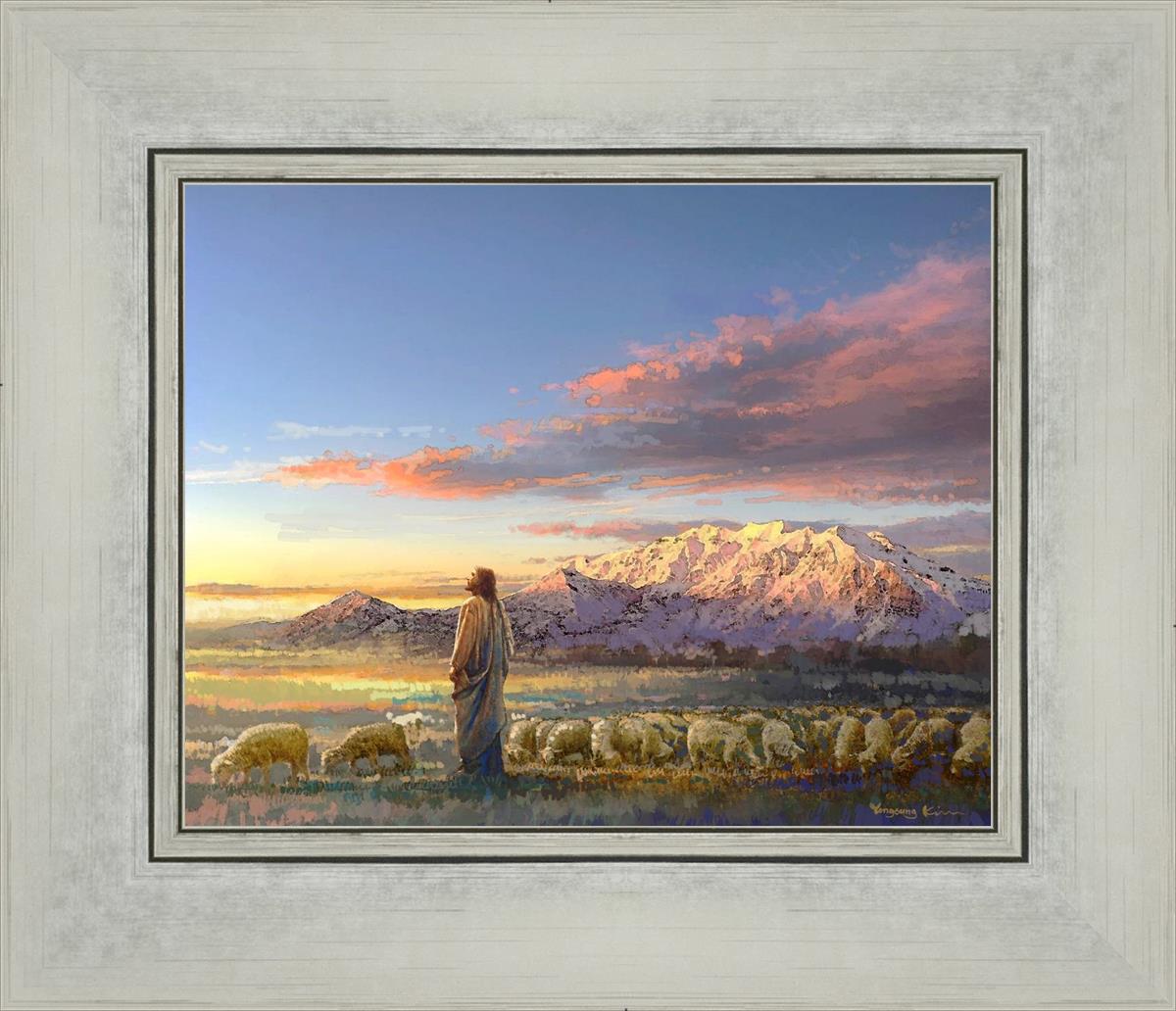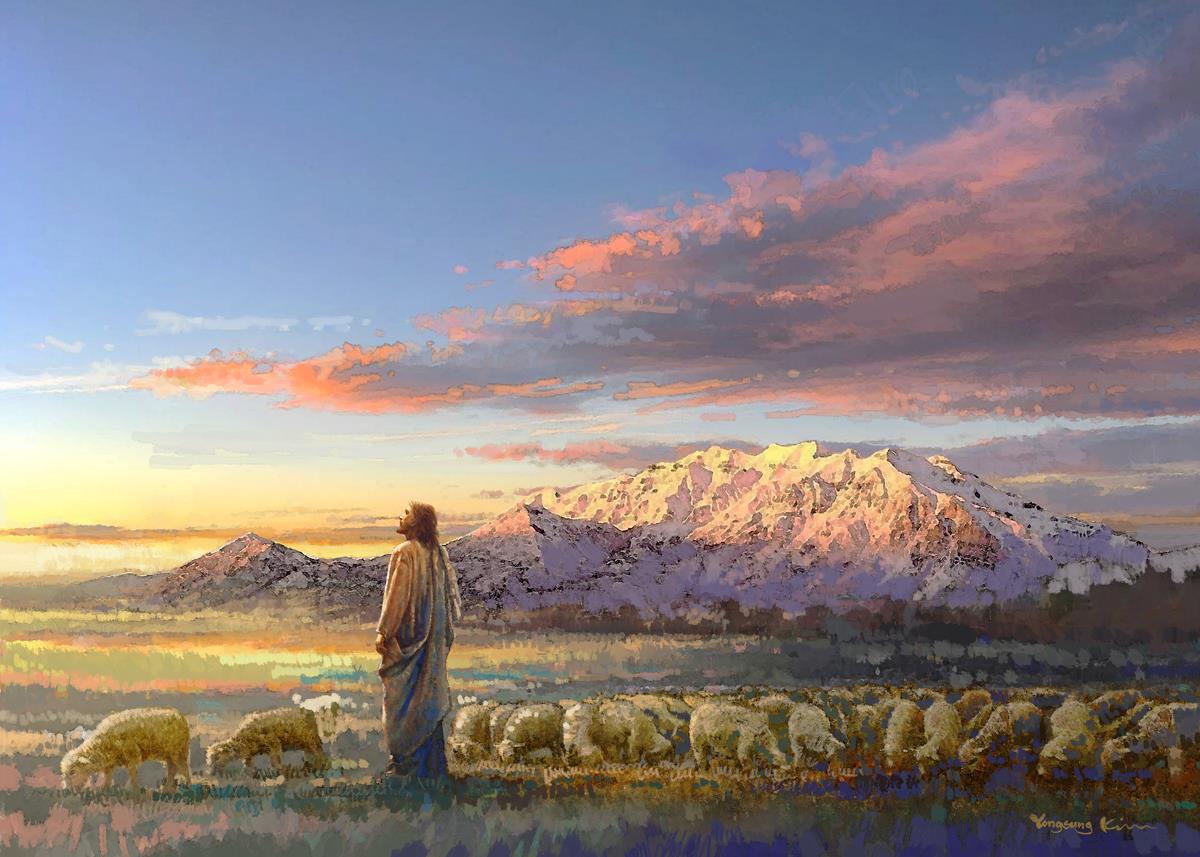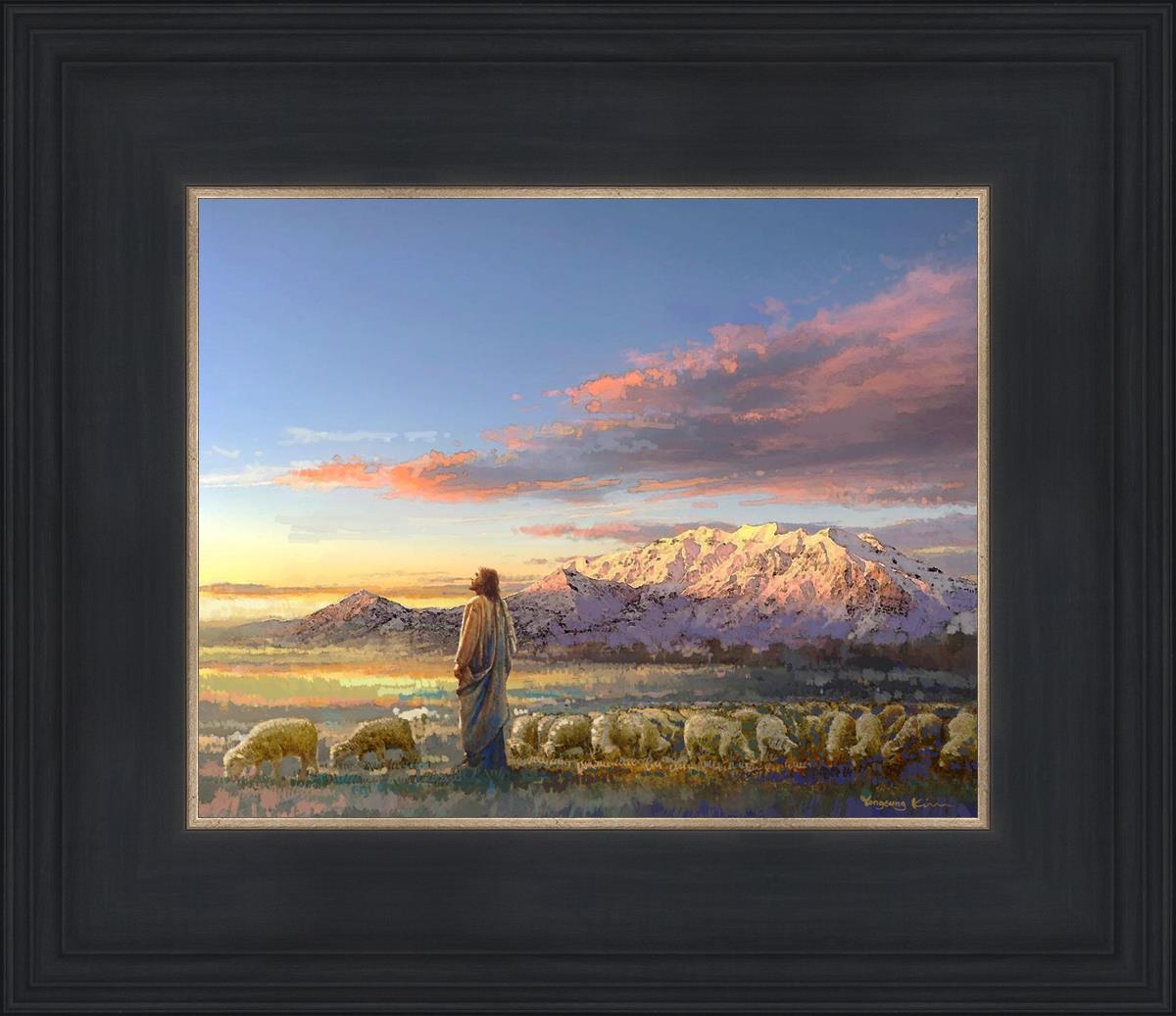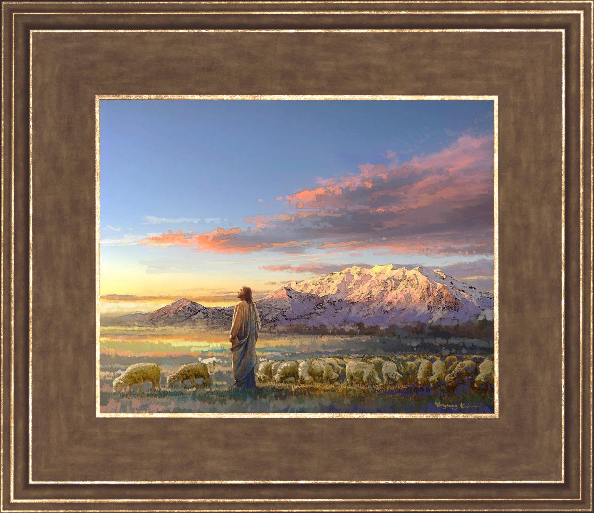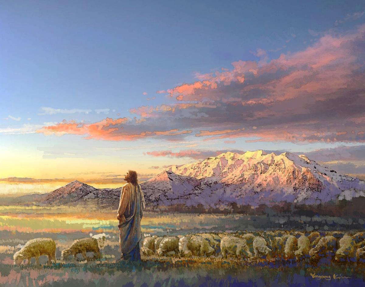 This painting portrays Jesus Christ with His flock of sheep set against a majestic mountain backdrop, where the sun bathes the sky and mountaintops in a warm, radiant glow. The gentle landscape conveys a sense of peace and divine presence. Jesus stands at the center with sheep huddled closely, representing the faithful. The artist's brushstrokes capture the warmth of the moment, inviting viewers to reflect on faith, devotion, and the comfort of divine stewardship.