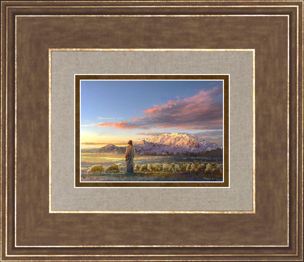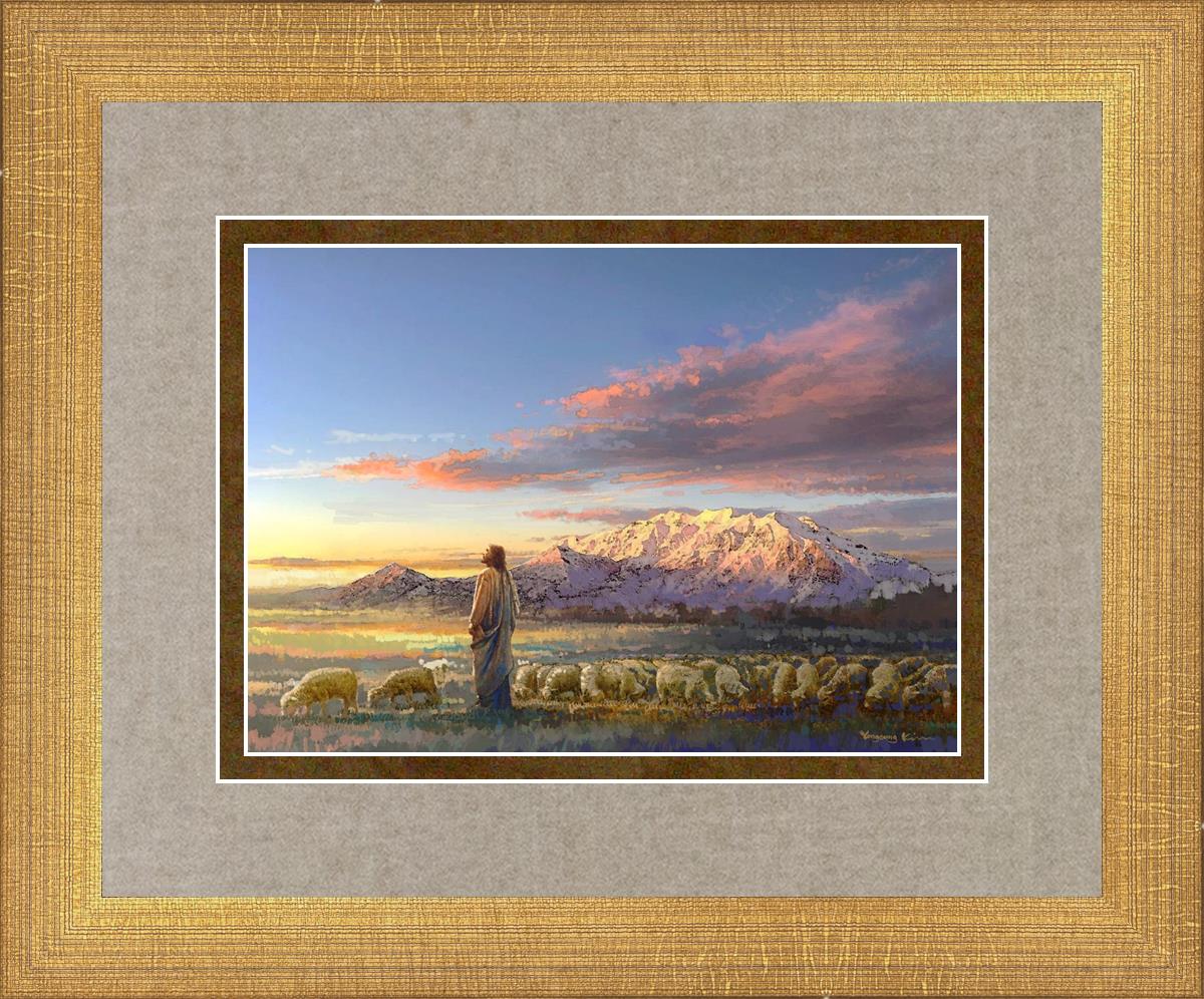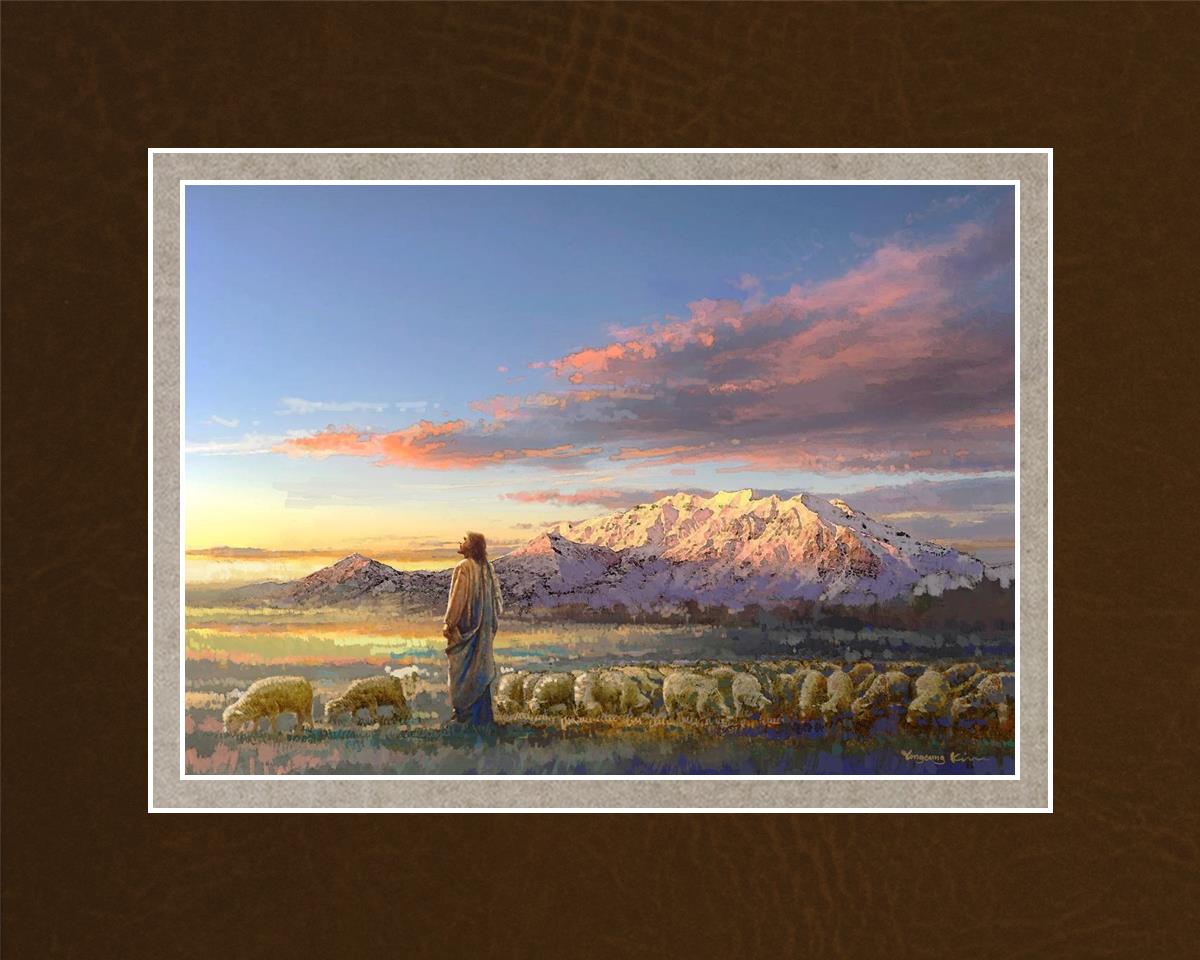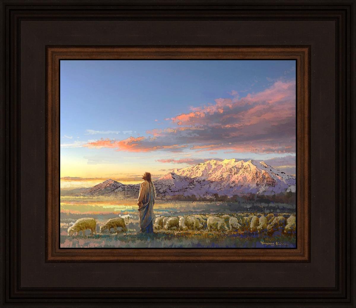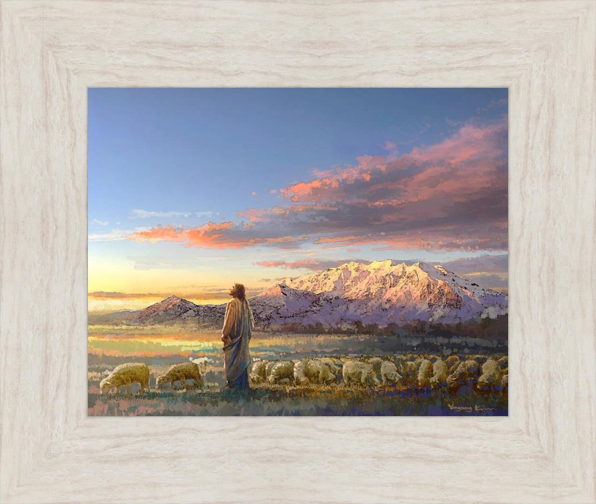 This painting portrays Jesus Christ with His flock of sheep set against a majestic mountain backdrop, where the sun bathes the sky and mountaintops in a warm, radiant glow. The gentle landscape conveys a sense of peace and divine presence. Jesus stands at the center with sheep huddled closely, representing the faithful. The artist's brushstrokes capture the warmth of the moment, inviting viewers to reflect on faith, devotion, and the comfort of divine stewardship.
