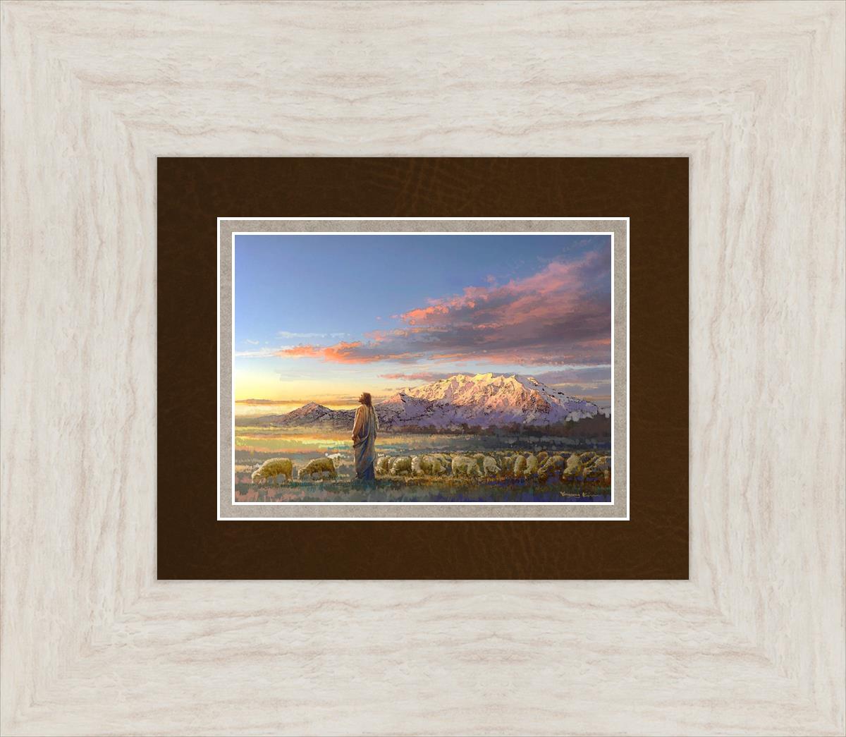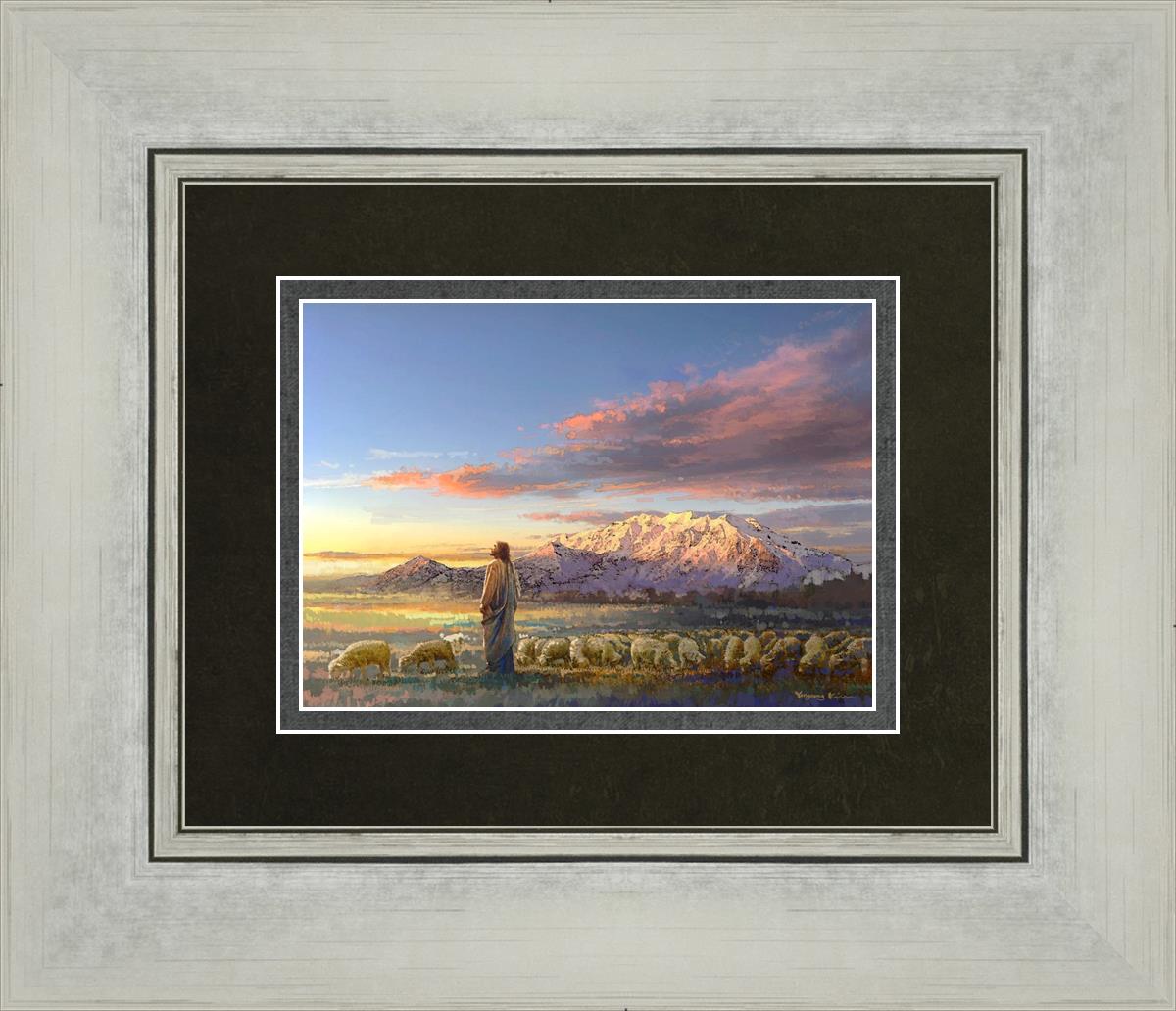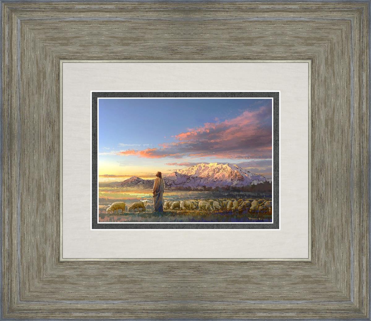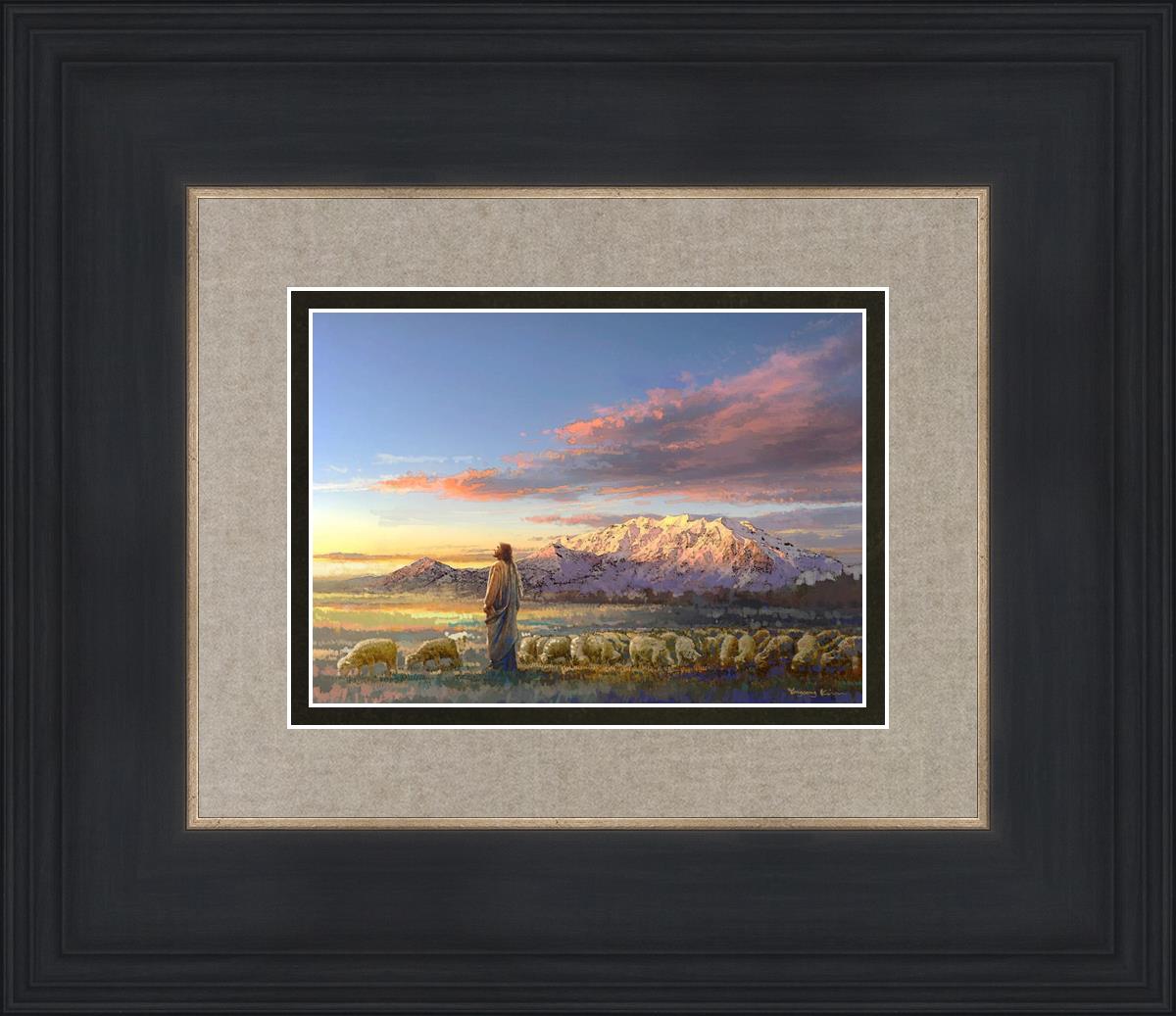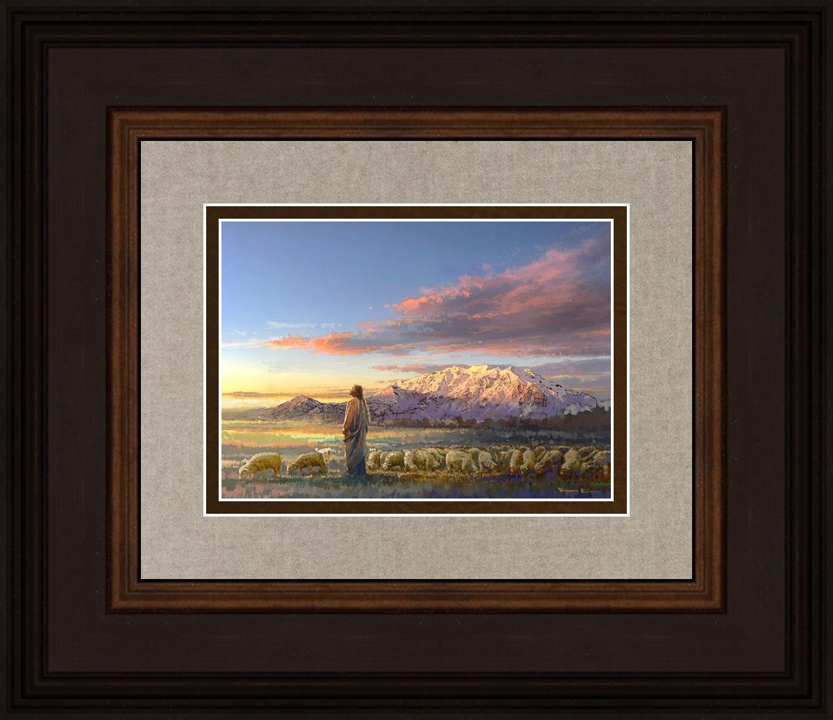 This painting portrays Jesus Christ with His flock of sheep set against a majestic mountain backdrop, where the sun bathes the sky and mountaintops in a warm, radiant glow. The gentle landscape conveys a sense of peace and divine presence. Jesus stands at the center with sheep huddled closely, representing the faithful. The artist's brushstrokes capture the warmth of the moment, inviting viewers to reflect on faith, devotion, and the comfort of divine stewardship.