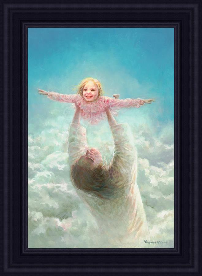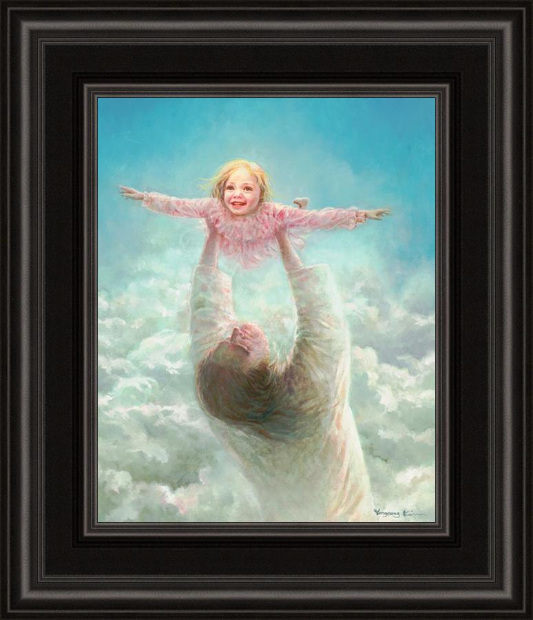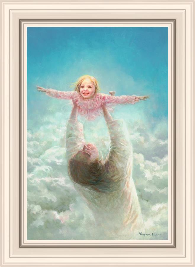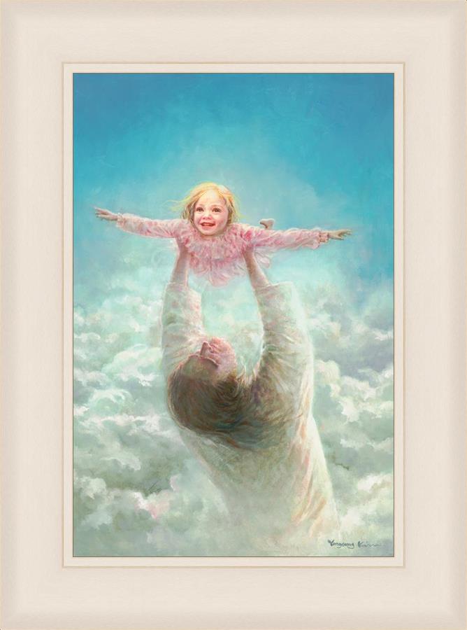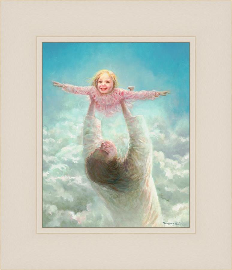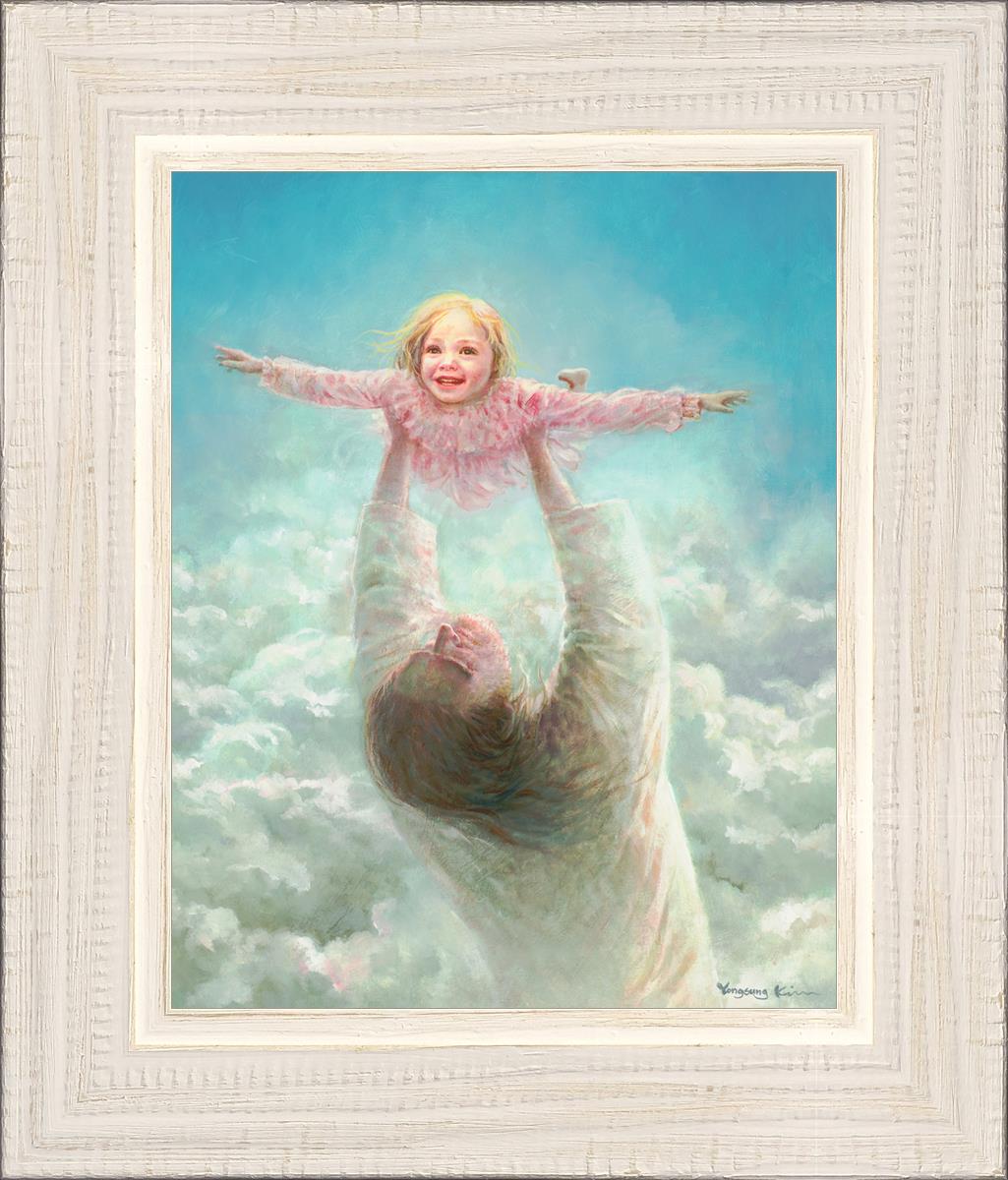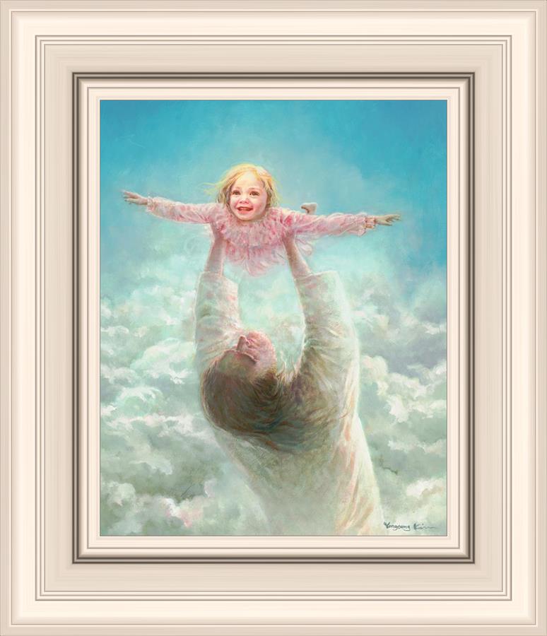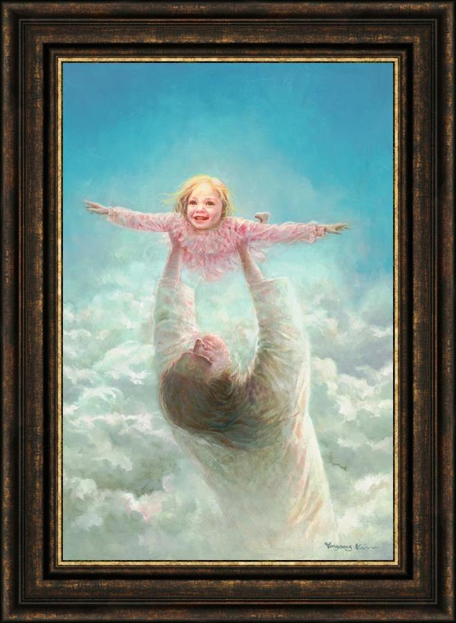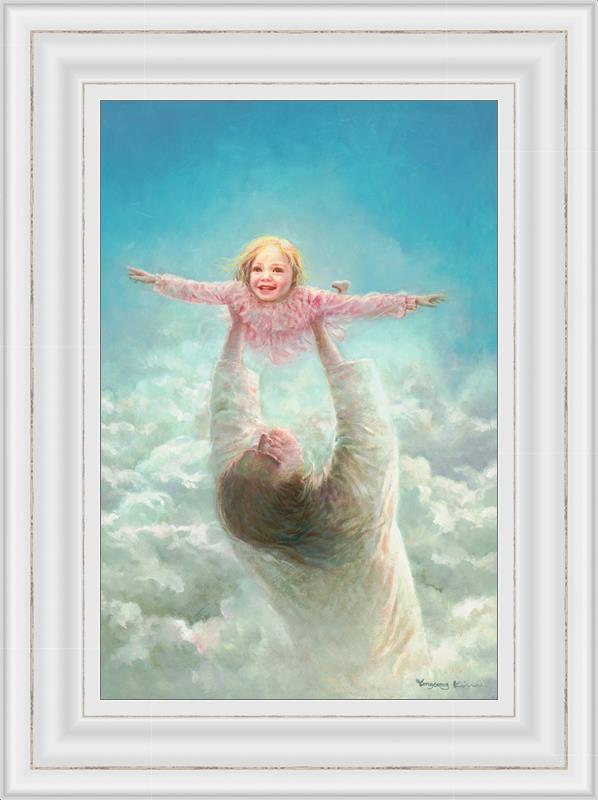 This painting captures a tender and uplifting moment that symbolizes trust, joy, and the boundless love of Jesus. It depicts Jesus lifting a young girl in a pink dress high above His head, her arms outstretched as though she is soaring through the heavens. Arms of Faith serves as a visual reminder that in the arms of Jesus, one can find freedom from fear and the comfort of unconditional love.