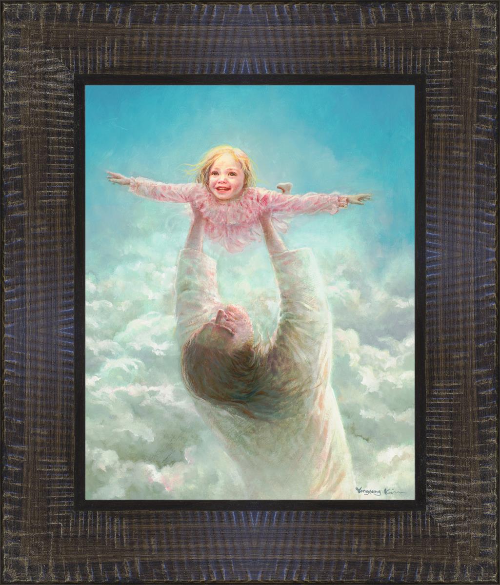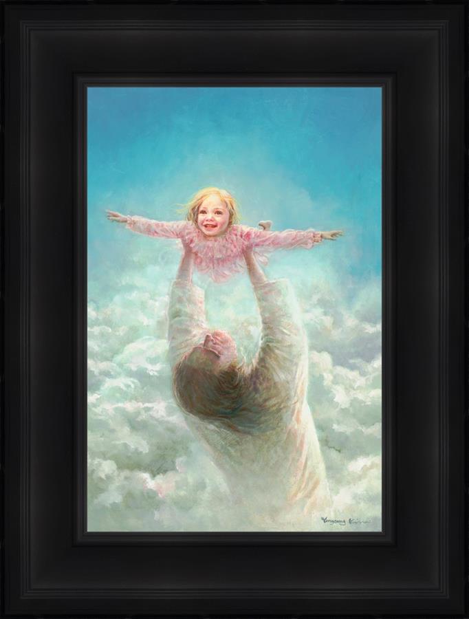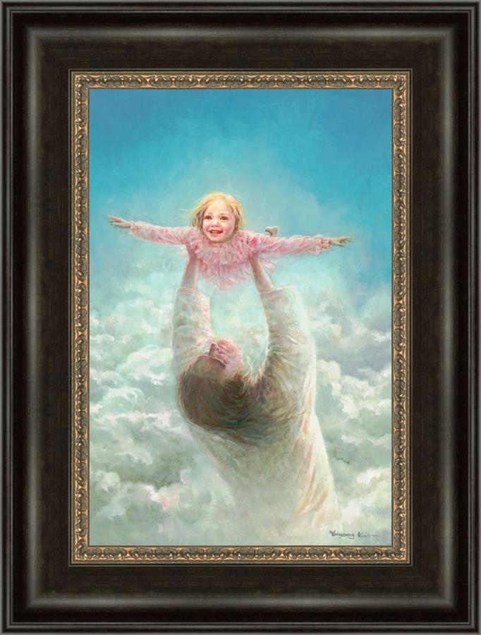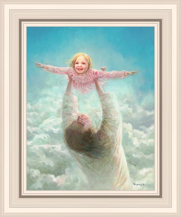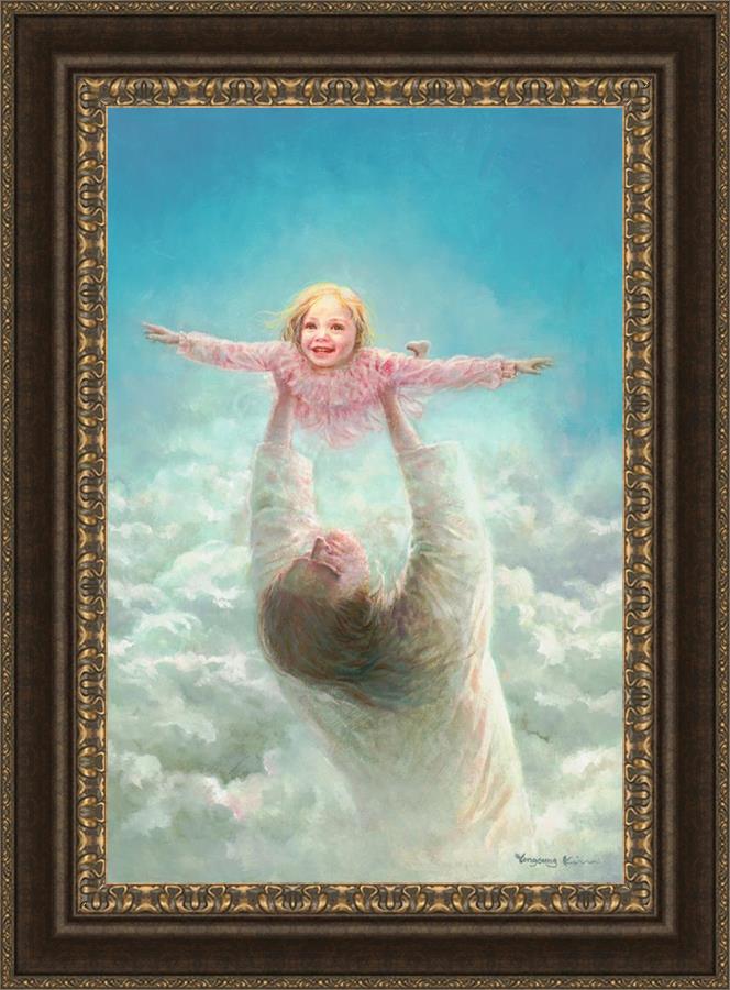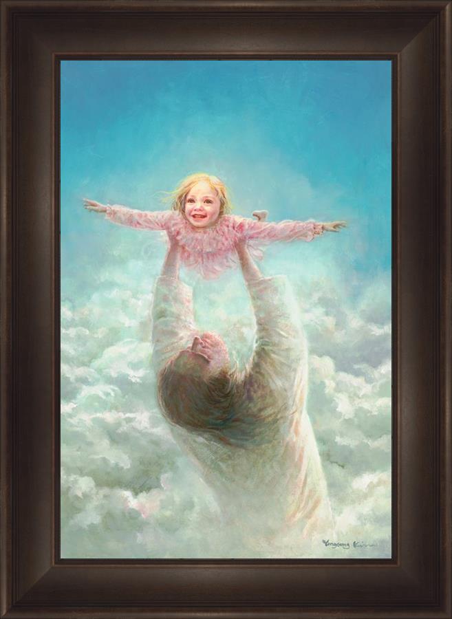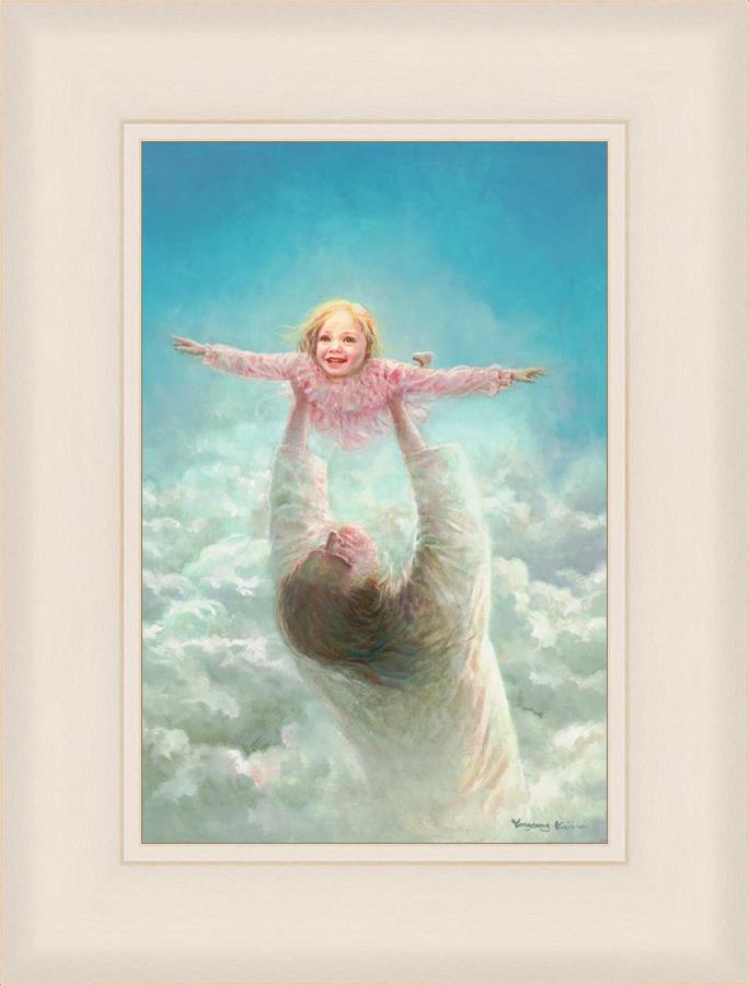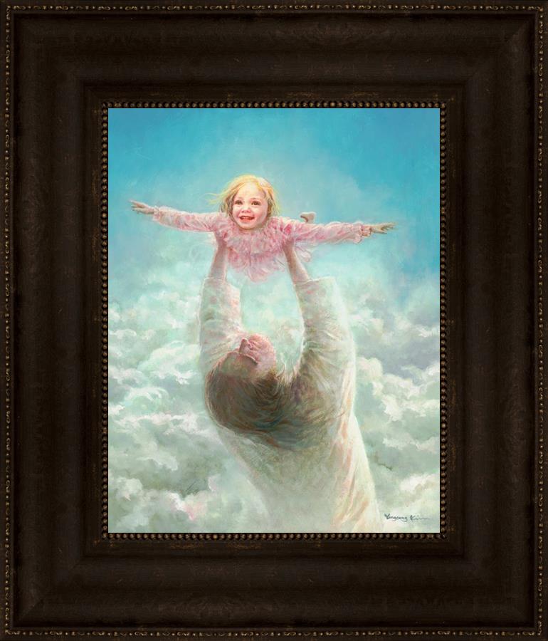 This painting captures a tender and uplifting moment that symbolizes trust, joy, and the boundless love of Jesus. It depicts Jesus lifting a young girl in a pink dress high above His head, her arms outstretched as though she is soaring through the heavens. Arms of Faith serves as a visual reminder that in the arms of Jesus, one can find freedom from fear and the comfort of unconditional love.