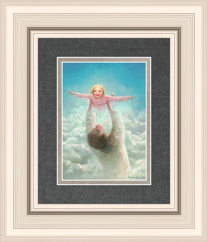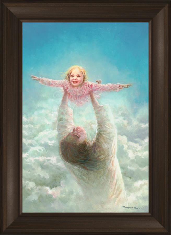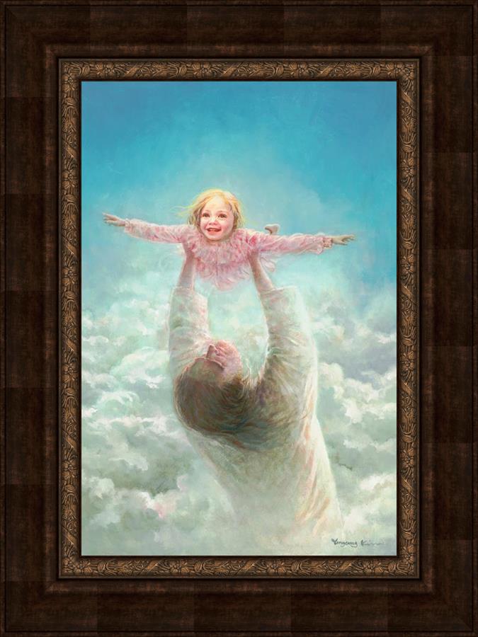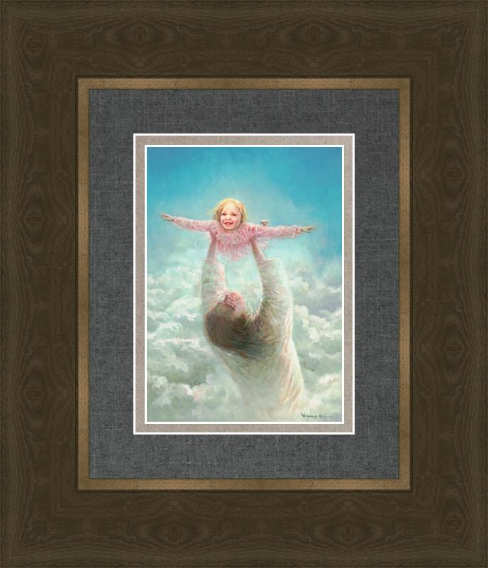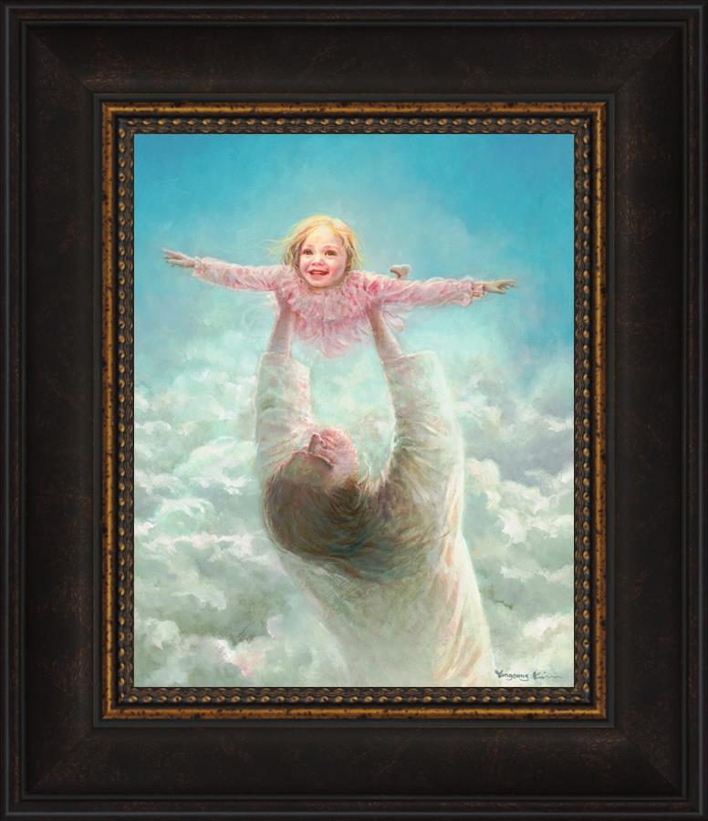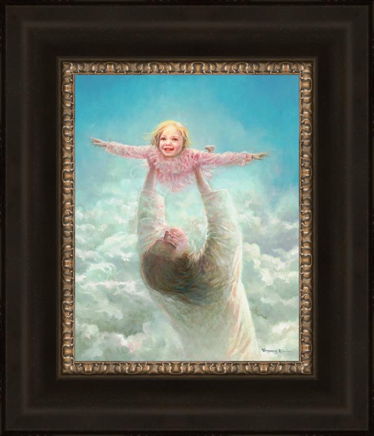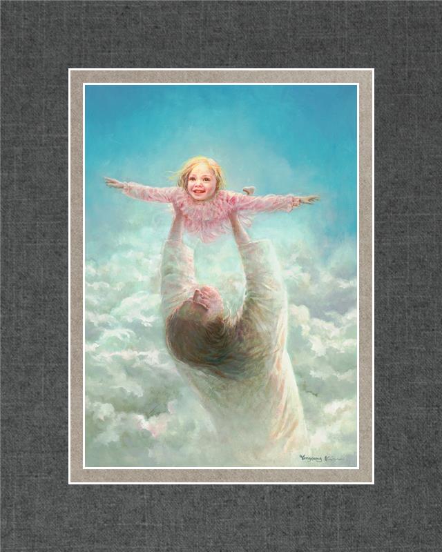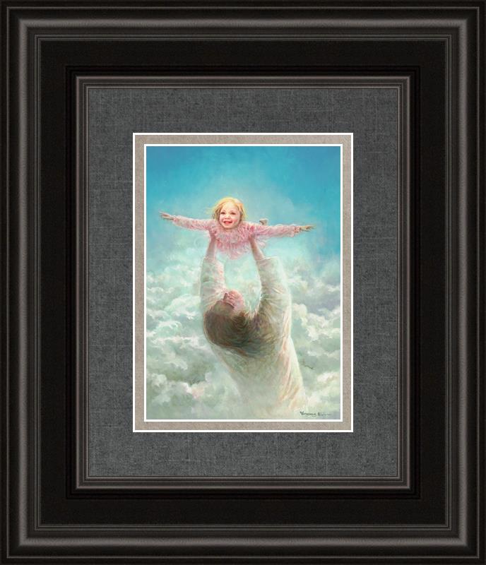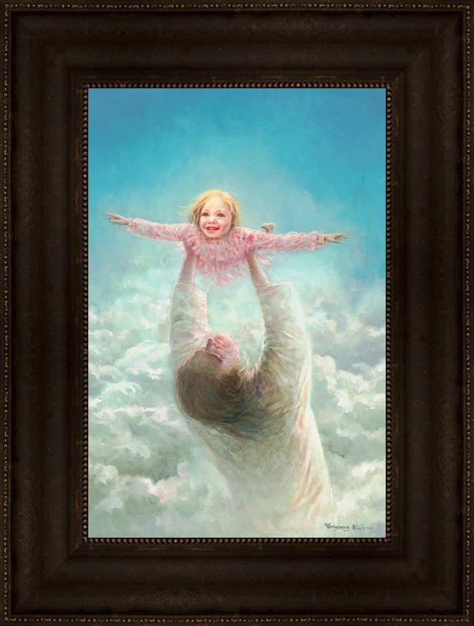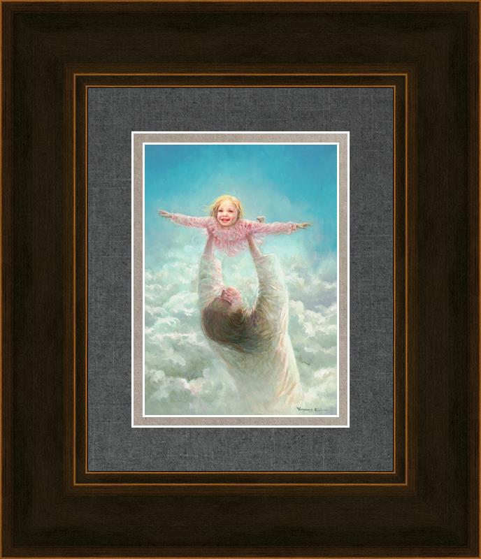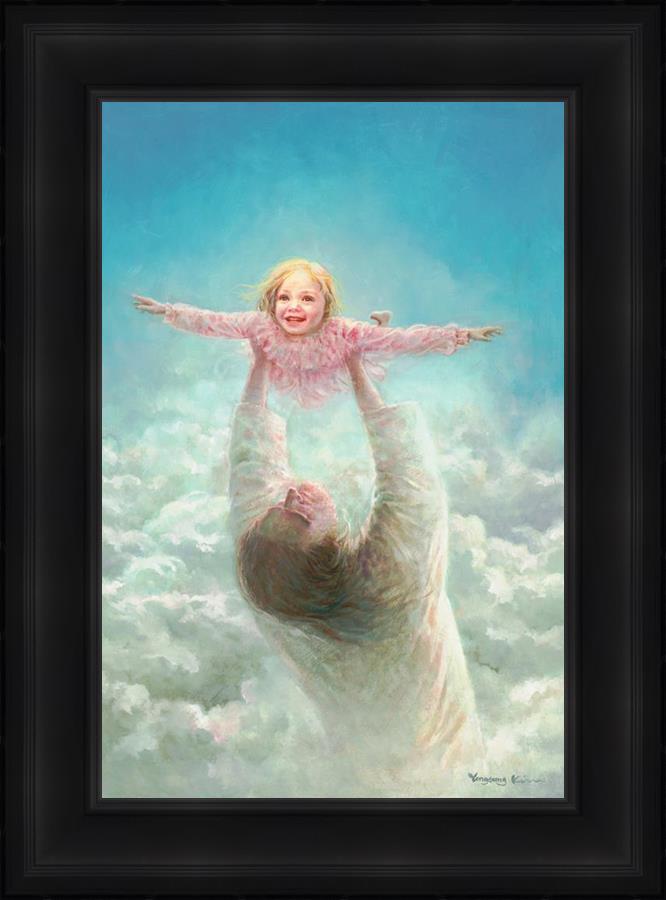 This painting captures a tender and uplifting moment that symbolizes trust, joy, and the boundless love of Jesus. It depicts Jesus lifting a young girl in a pink dress high above His head, her arms outstretched as though she is soaring through the heavens. Arms of Faith serves as a visual reminder that in the arms of Jesus, one can find freedom from fear and the comfort of unconditional love.