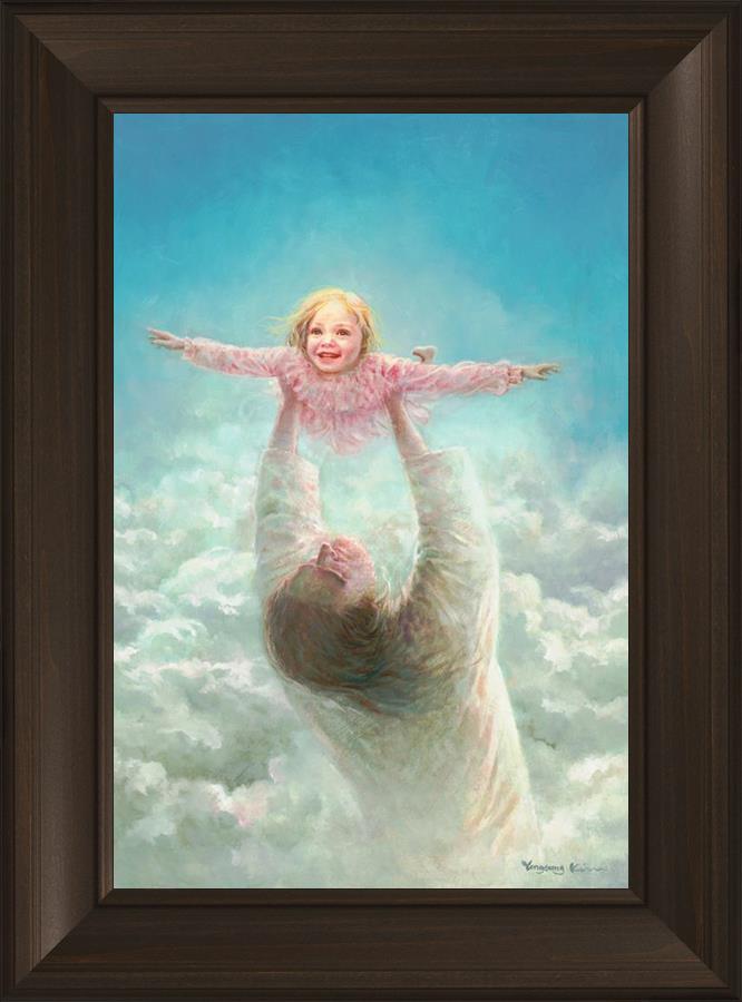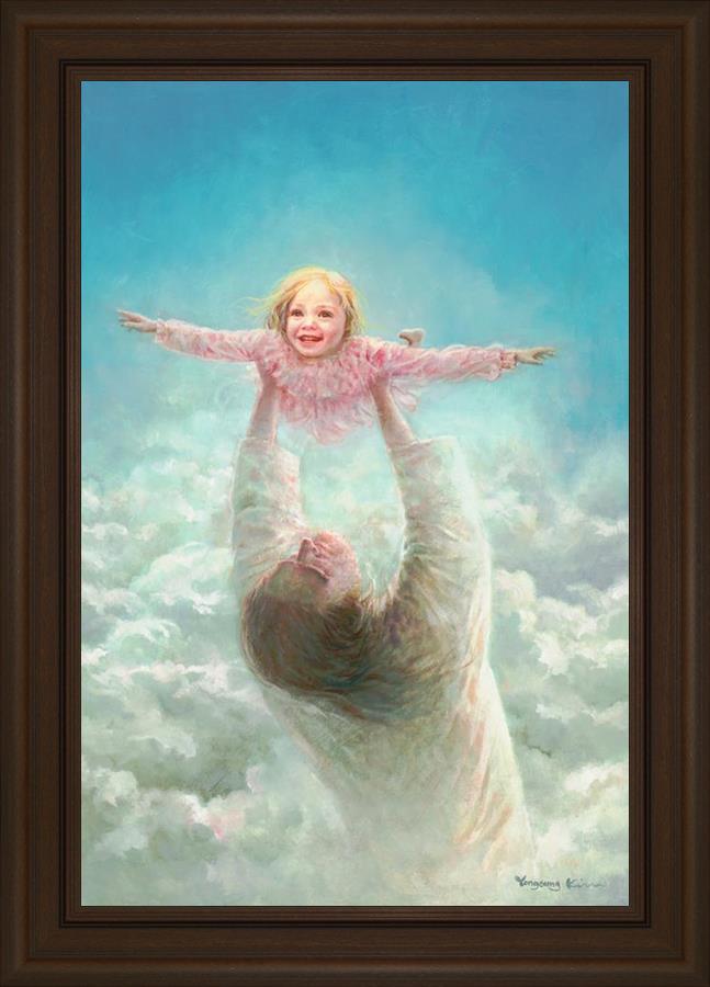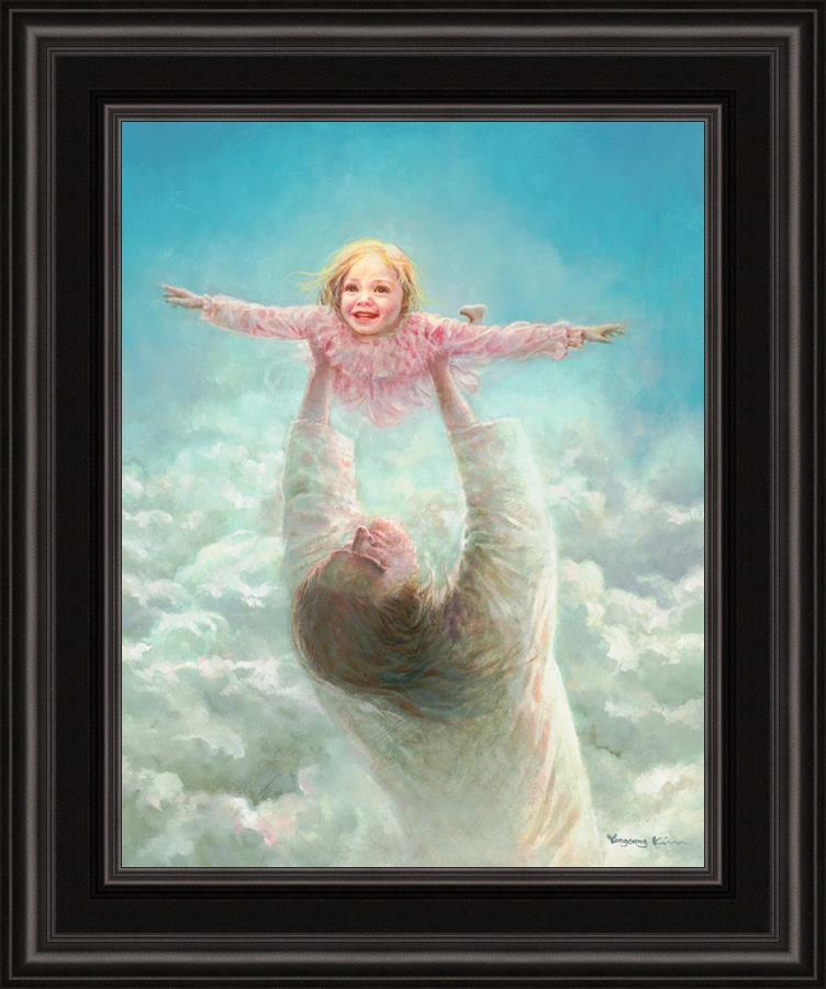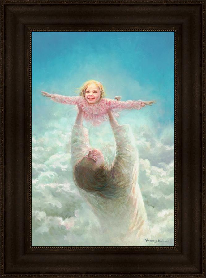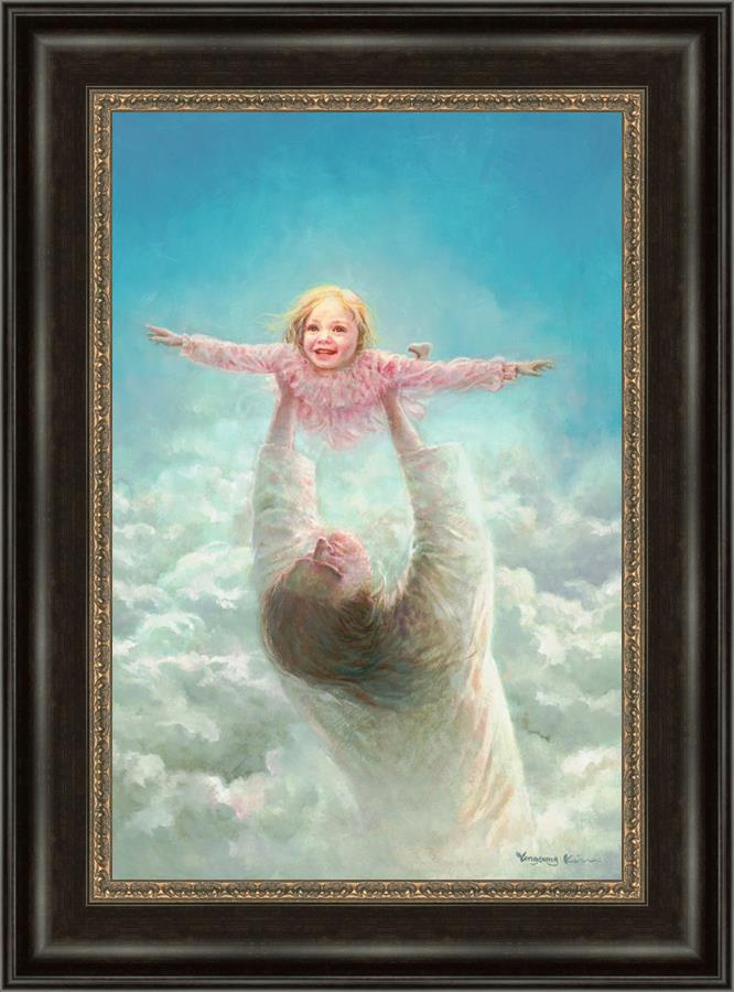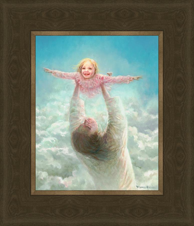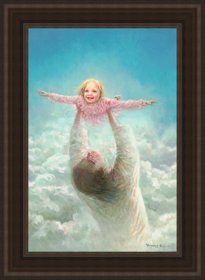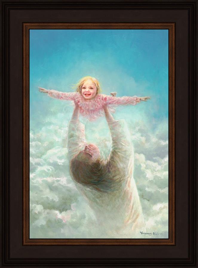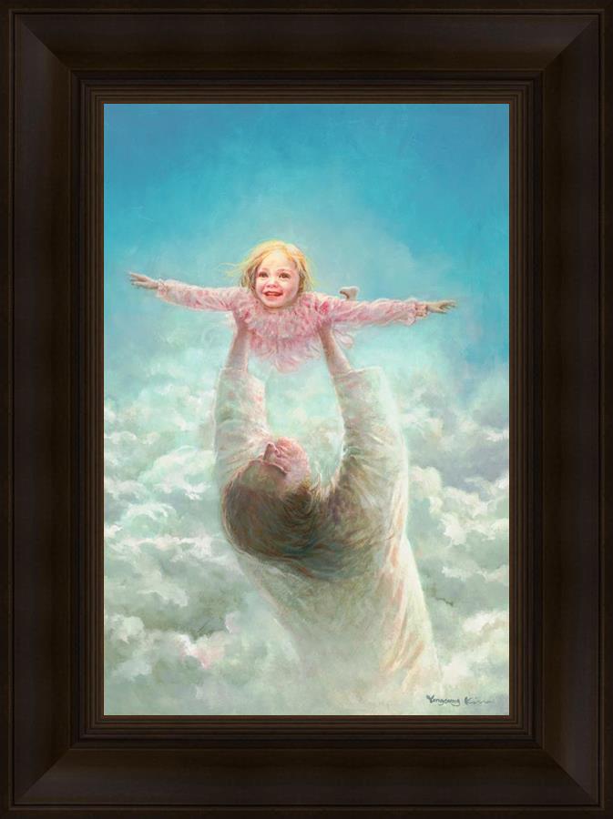 This painting captures a tender and uplifting moment that symbolizes trust, joy, and the boundless love of Jesus. It depicts Jesus lifting a young girl in a pink dress high above His head, her arms outstretched as though she is soaring through the heavens. Arms of Faith serves as a visual reminder that in the arms of Jesus, one can find freedom from fear and the comfort of unconditional love.
