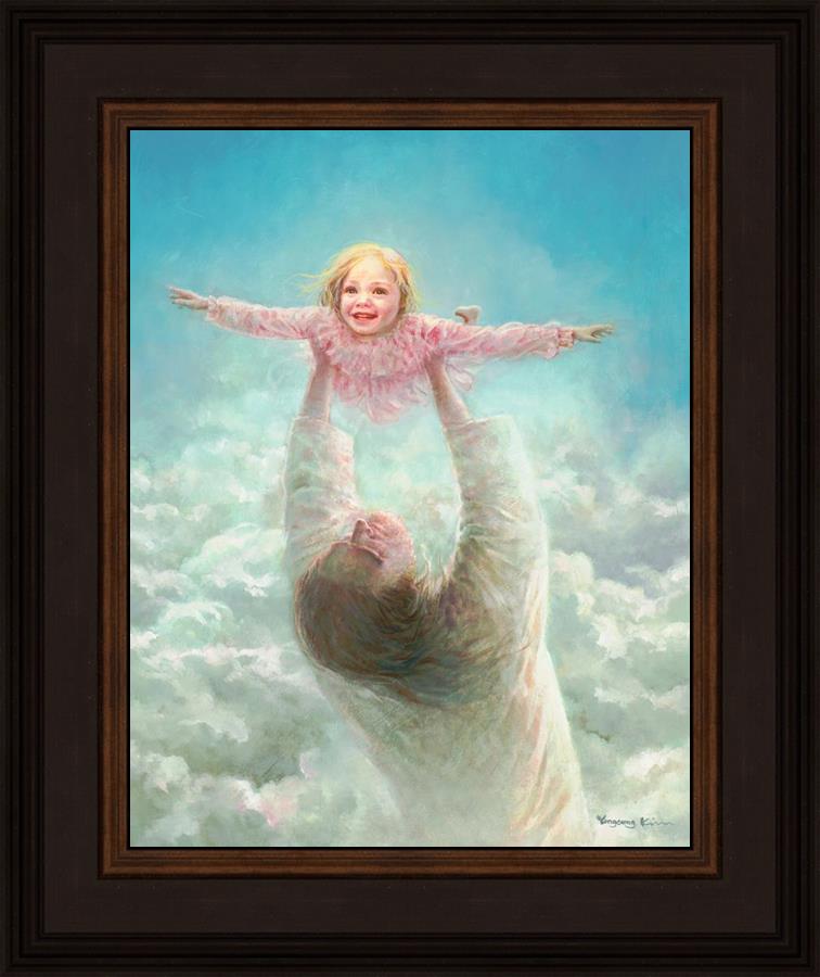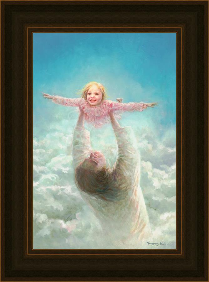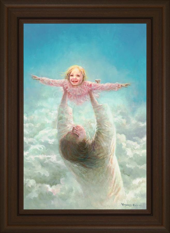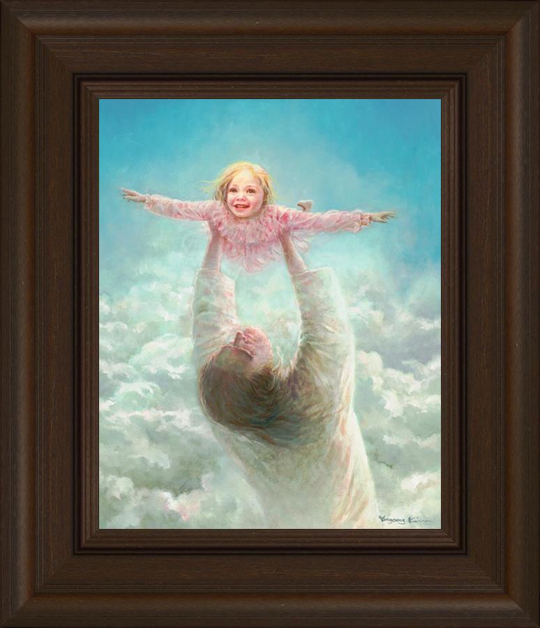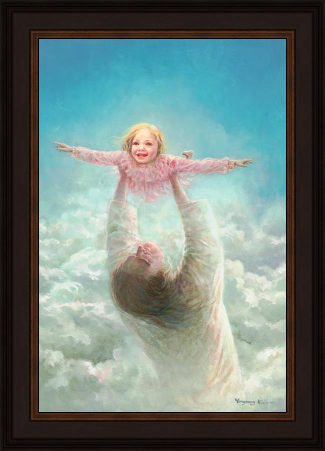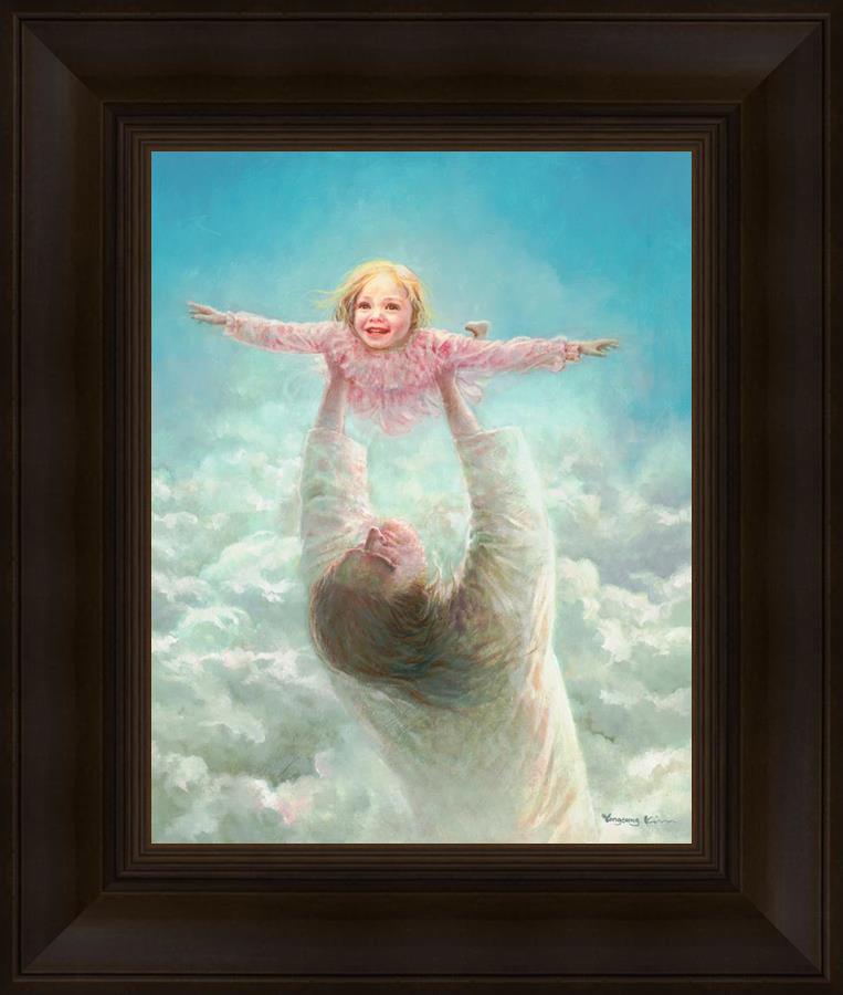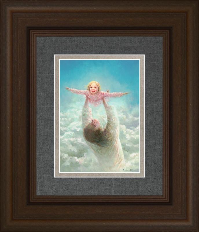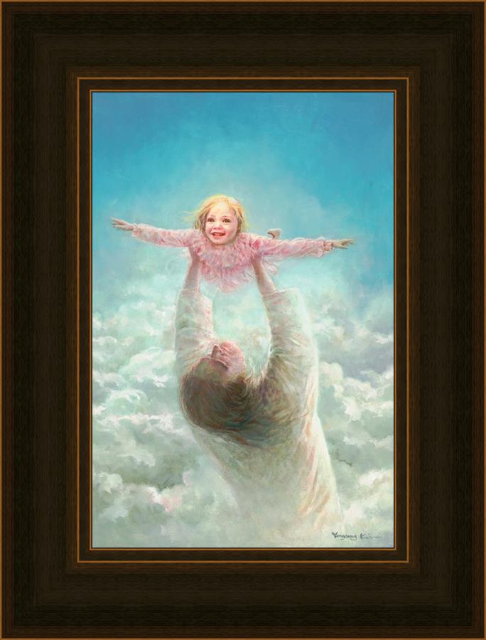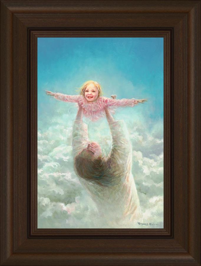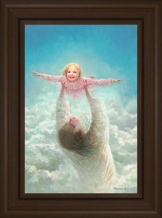 This painting captures a tender and uplifting moment that symbolizes trust, joy, and the boundless love of Jesus. It depicts Jesus lifting a young girl in a pink dress high above His head, her arms outstretched as though she is soaring through the heavens. Arms of Faith serves as a visual reminder that in the arms of Jesus, one can find freedom from fear and the comfort of unconditional love.