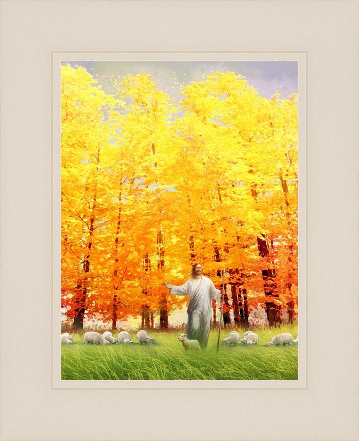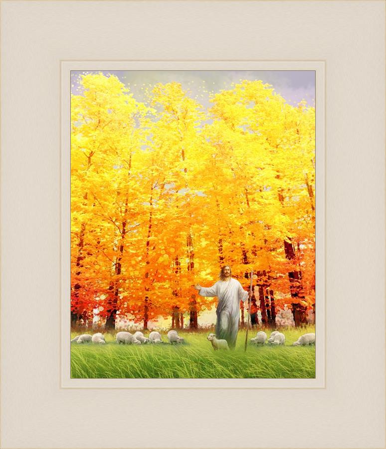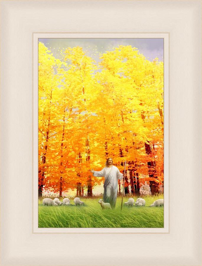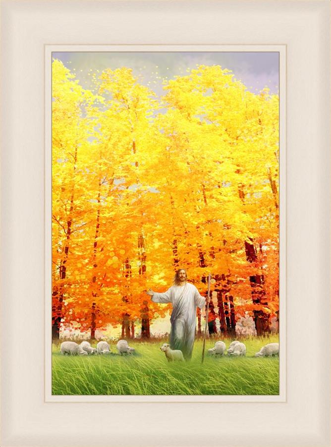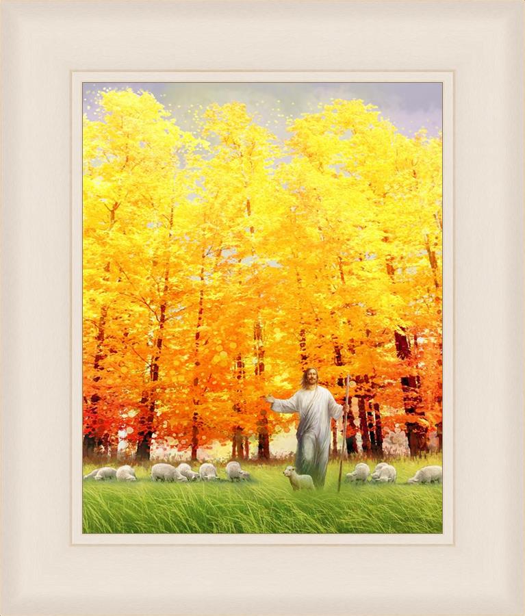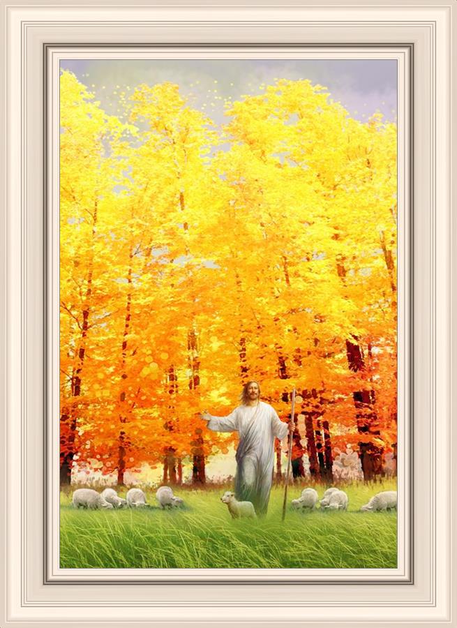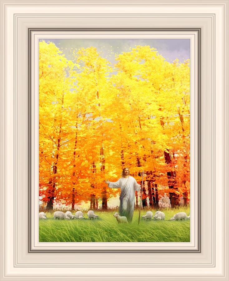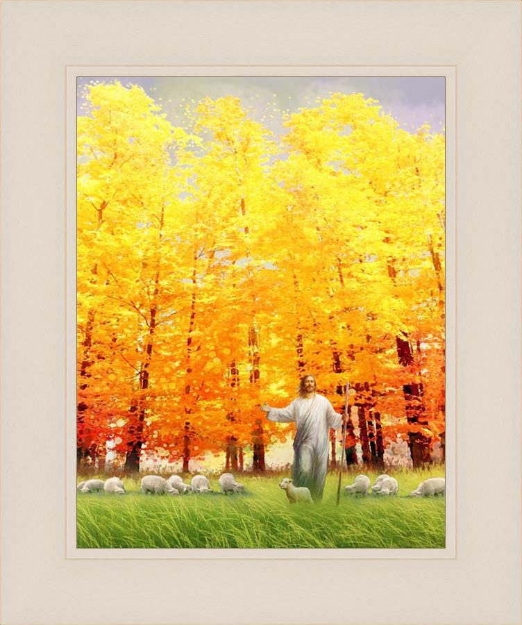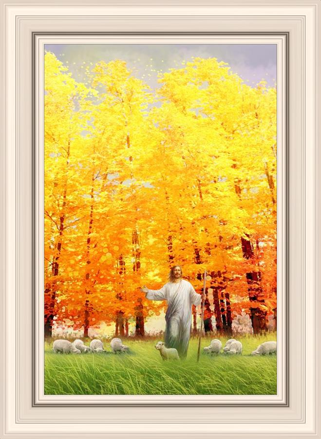 This artwork depicts Jesus standing in a green field, surrounded by a gentle flock of sheep, symbolizing His role as the Good Shepherd. Behind Him, towering yellow trees stretch toward the sky. The sheep reflect a sense of peace and security, emphasizing the relationship between Christ and His followers. Autumn Breeze encourages contemplation on Christ's closeness to nature and humanity, offering a visual meditation on His promise of rest and care for all who seek Him.