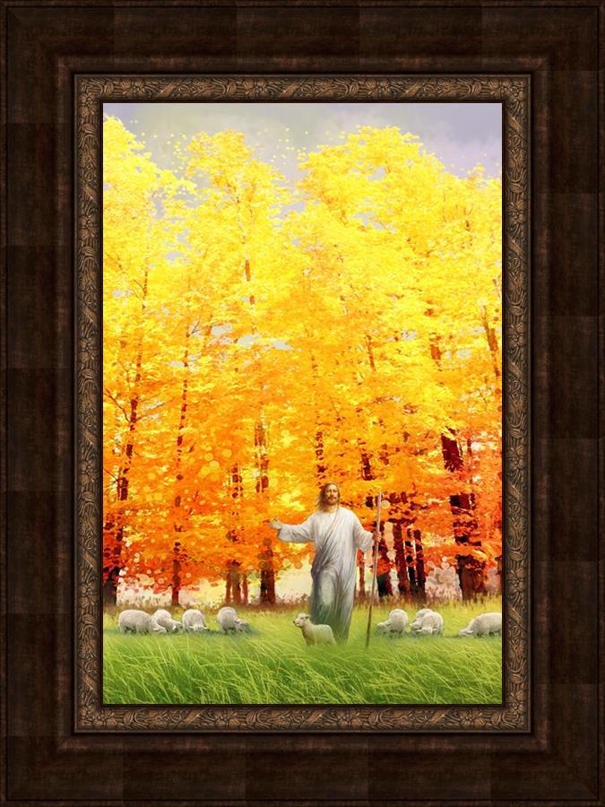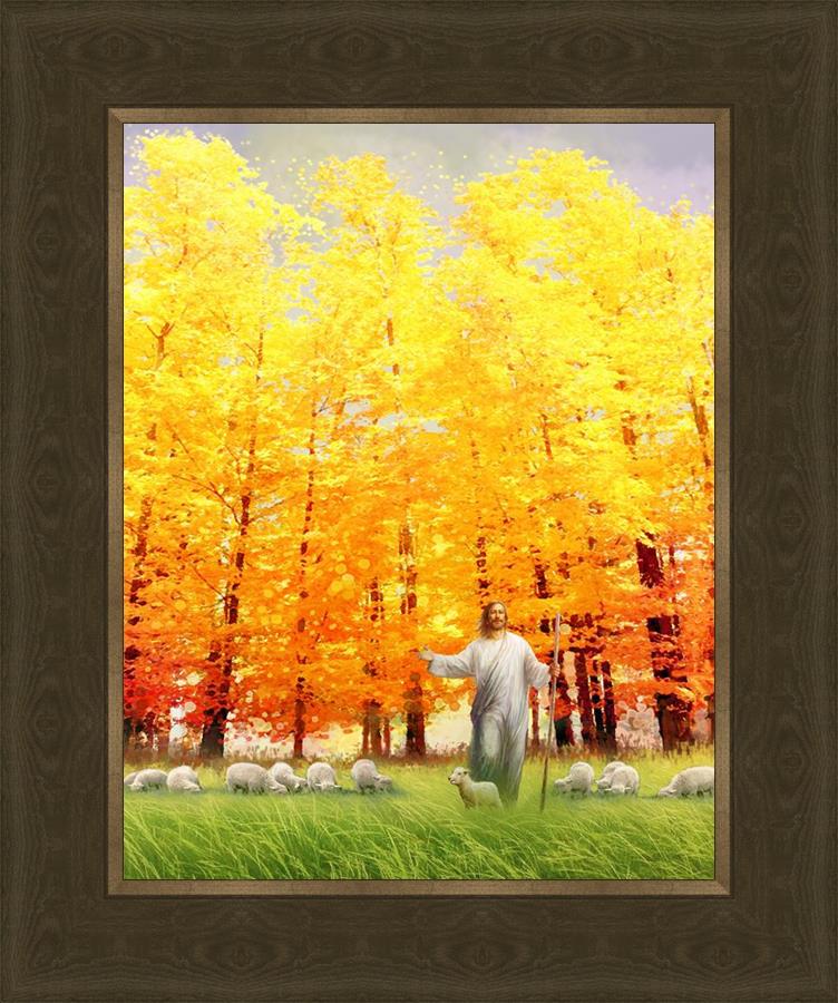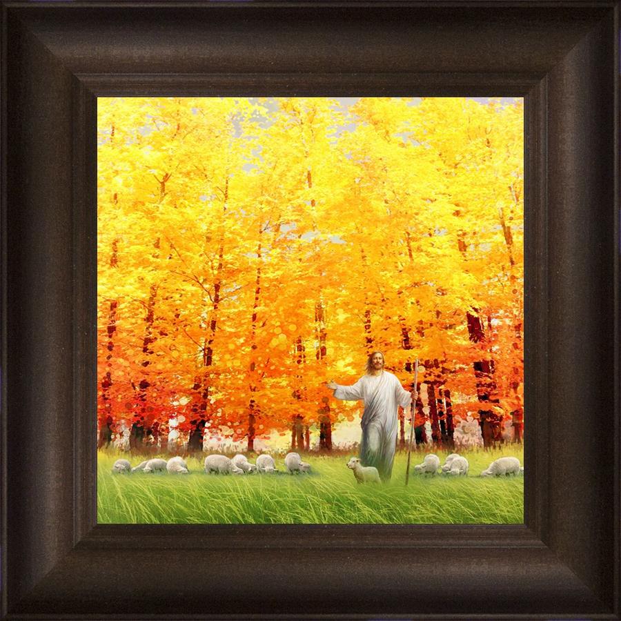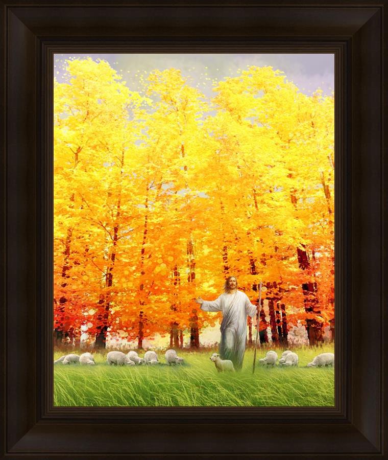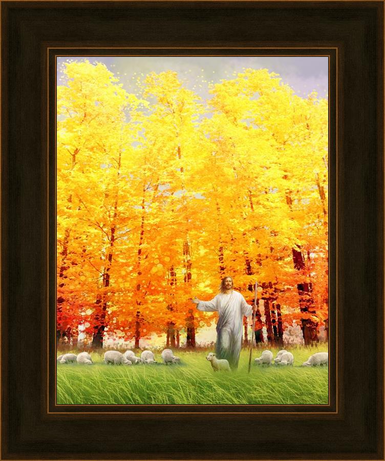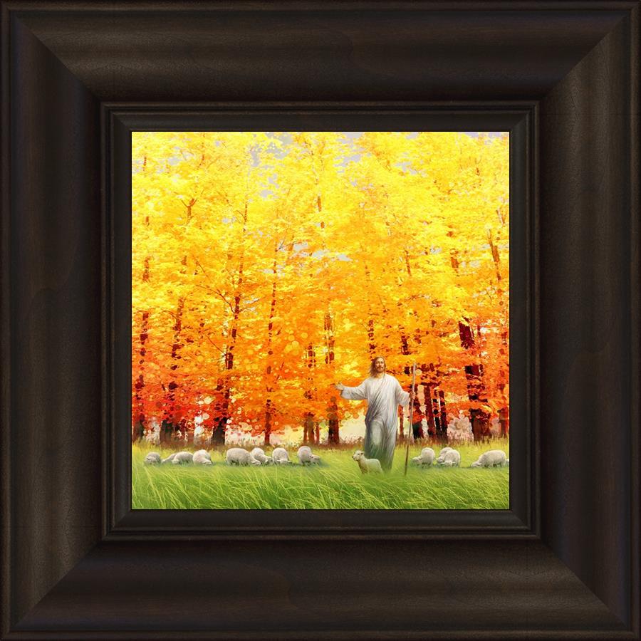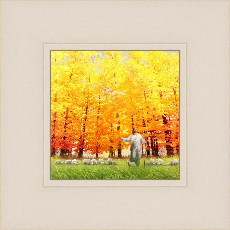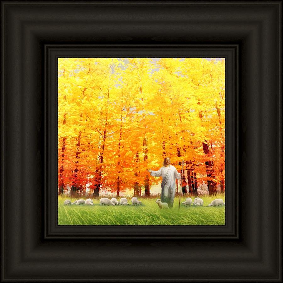 This artwork depicts Jesus standing in a green field, surrounded by a gentle flock of sheep, symbolizing His role as the Good Shepherd. Behind Him, towering yellow trees stretch toward the sky. The sheep reflect a sense of peace and security, emphasizing the relationship between Christ and His followers. Autumn Breeze encourages contemplation on Christ's closeness to nature and humanity, offering a visual meditation on His promise of rest and care for all who seek Him.