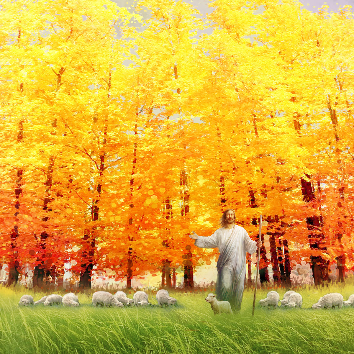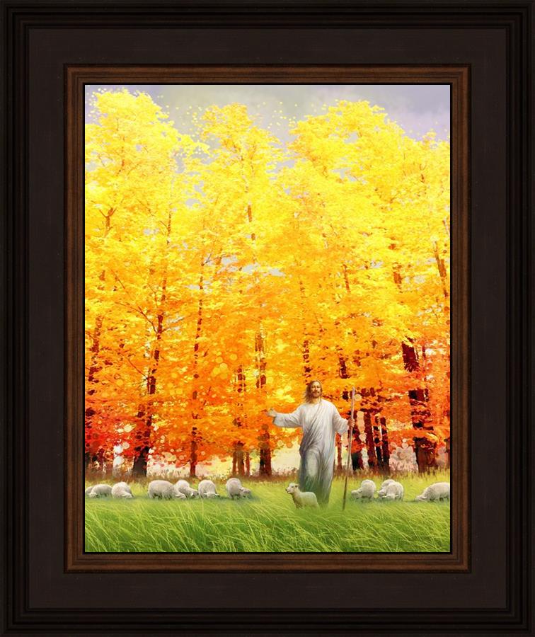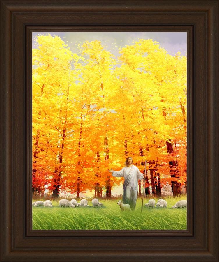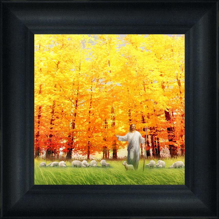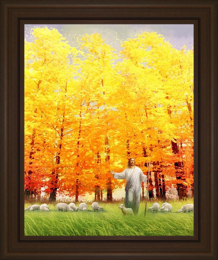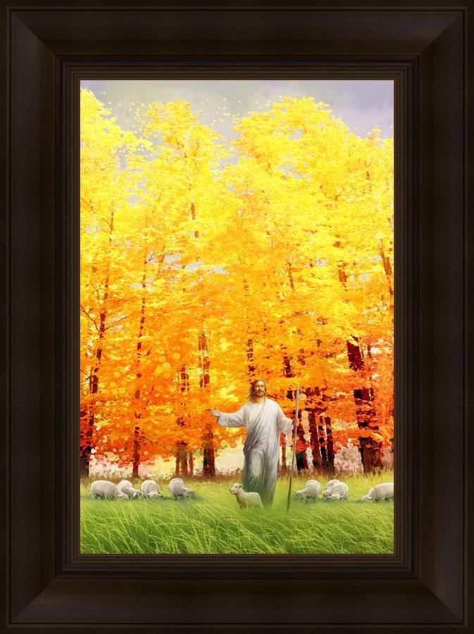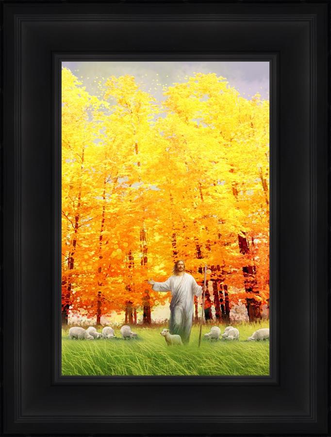 This artwork depicts Jesus standing in a green field, surrounded by a gentle flock of sheep, symbolizing His role as the Good Shepherd. Behind Him, towering yellow trees stretch toward the sky. The sheep reflect a sense of peace and security, emphasizing the relationship between Christ and His followers. Autumn Breeze encourages contemplation on Christ's closeness to nature and humanity, offering a visual meditation on His promise of rest and care for all who seek Him.