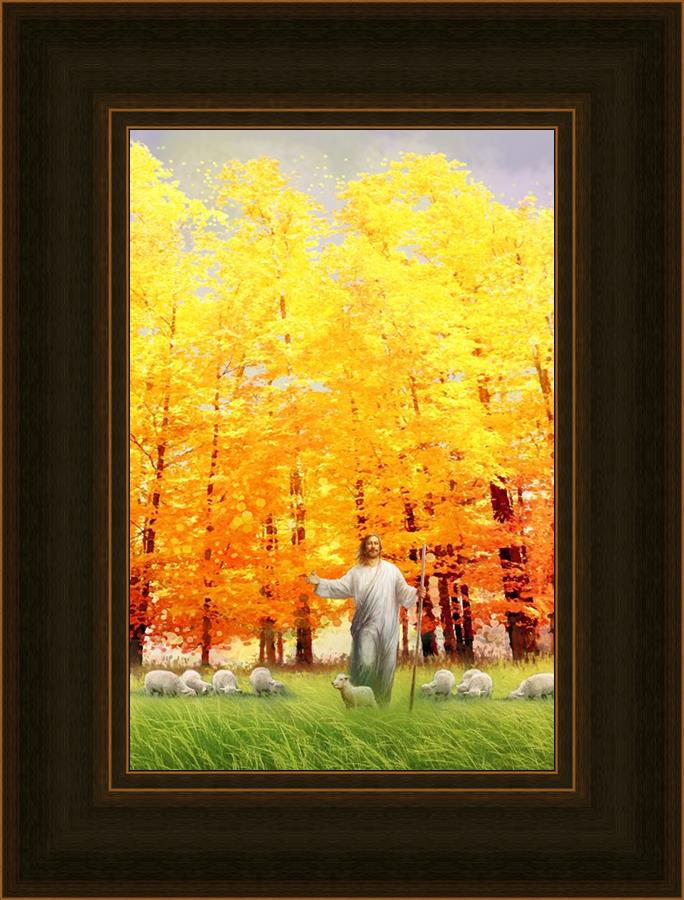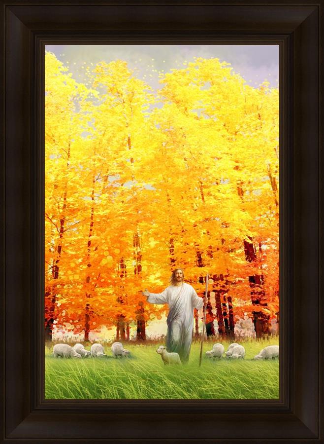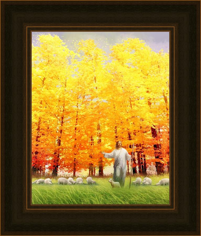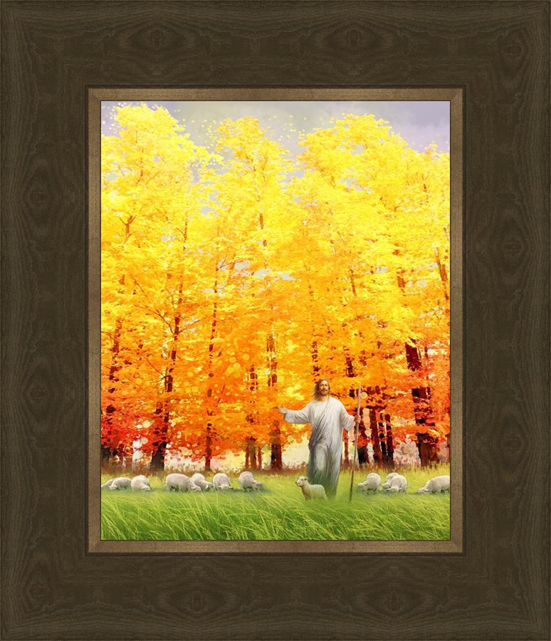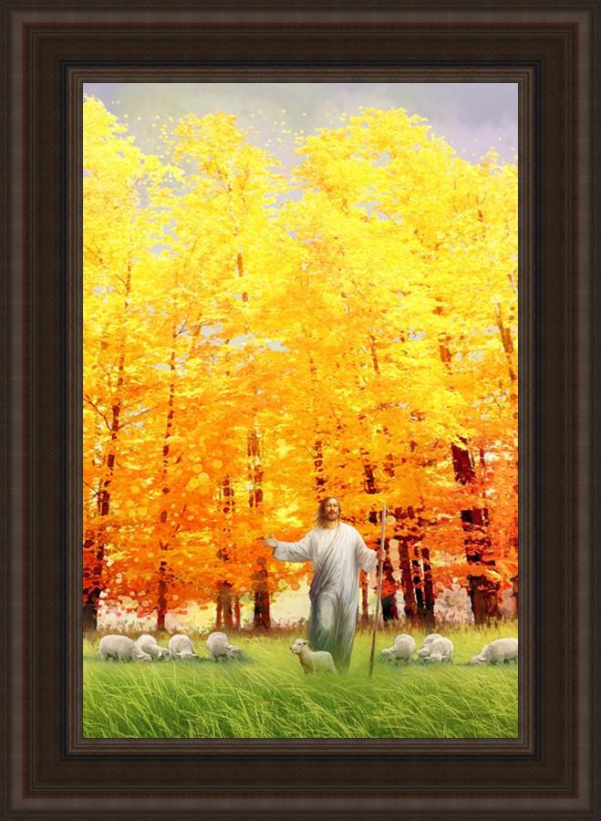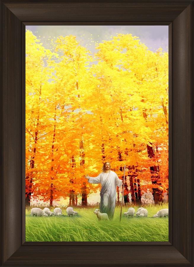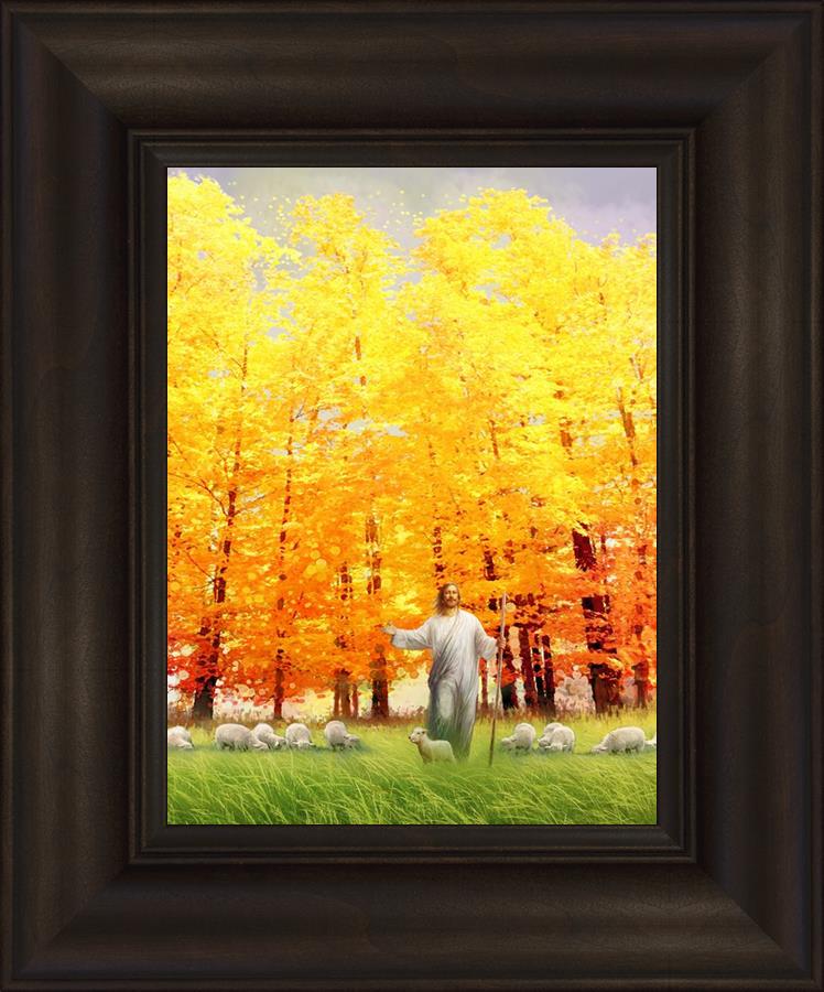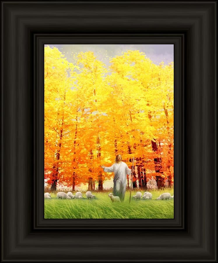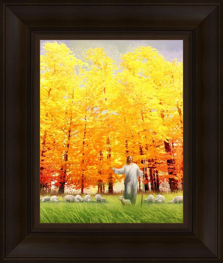 This artwork depicts Jesus standing in a green field, surrounded by a gentle flock of sheep, symbolizing His role as the Good Shepherd. Behind Him, towering yellow trees stretch toward the sky. The sheep reflect a sense of peace and security, emphasizing the relationship between Christ and His followers. Autumn Breeze encourages contemplation on Christ's closeness to nature and humanity, offering a visual meditation on His promise of rest and care for all who seek Him.