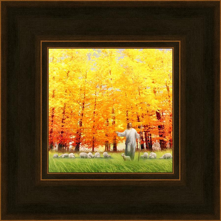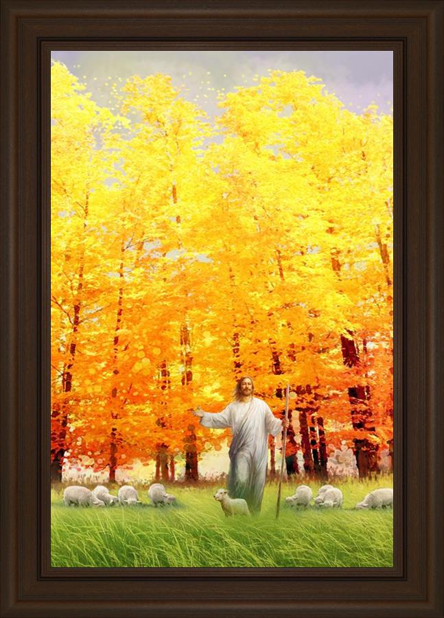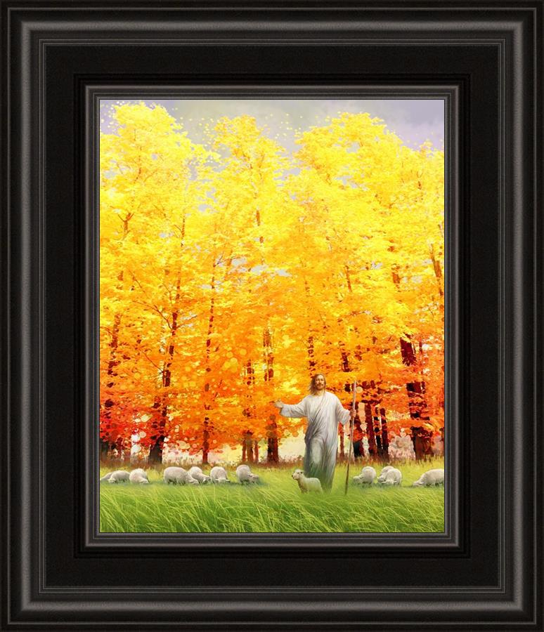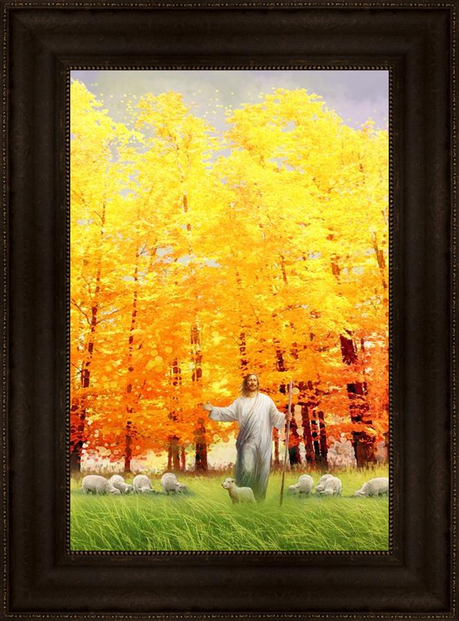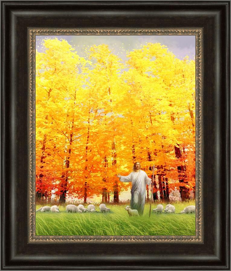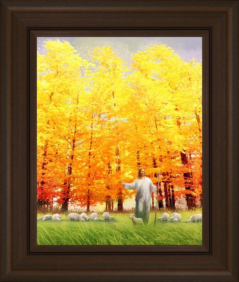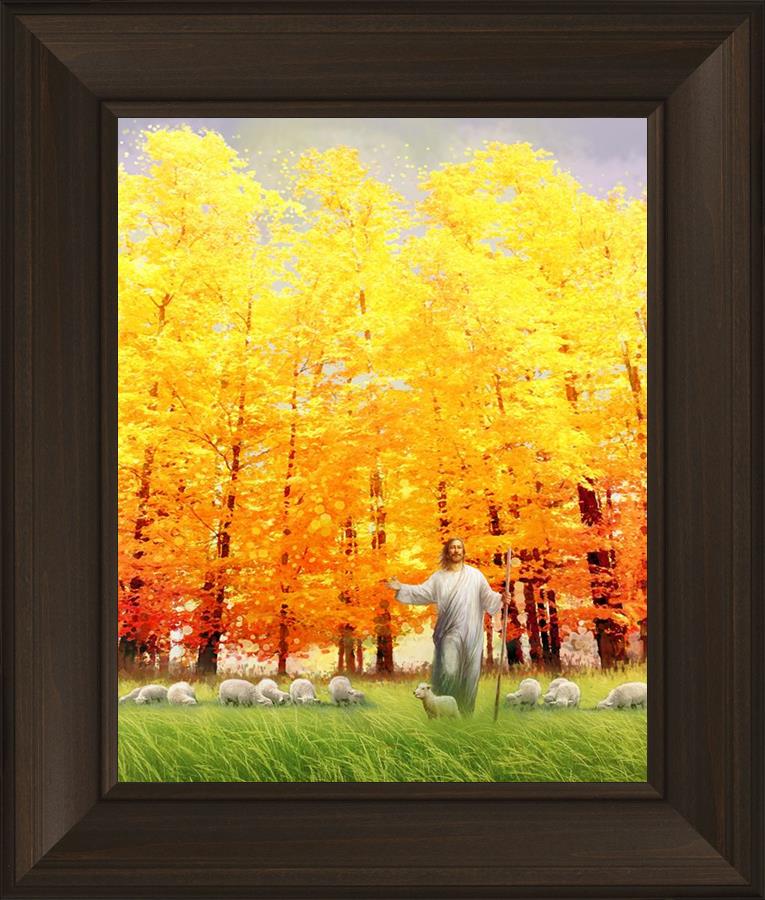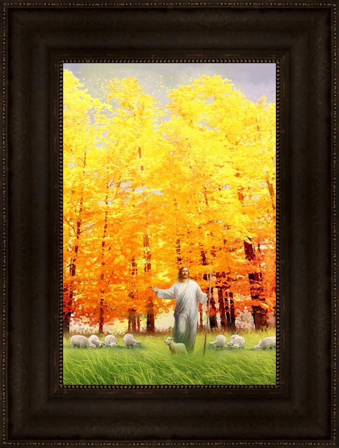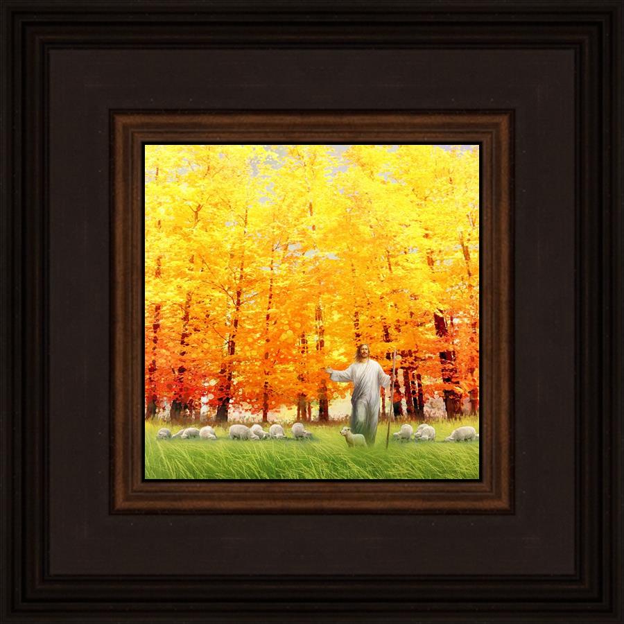 This artwork depicts Jesus standing in a green field, surrounded by a gentle flock of sheep, symbolizing His role as the Good Shepherd. Behind Him, towering yellow trees stretch toward the sky. The sheep reflect a sense of peace and security, emphasizing the relationship between Christ and His followers. Autumn Breeze encourages contemplation on Christ's closeness to nature and humanity, offering a visual meditation on His promise of rest and care for all who seek Him.