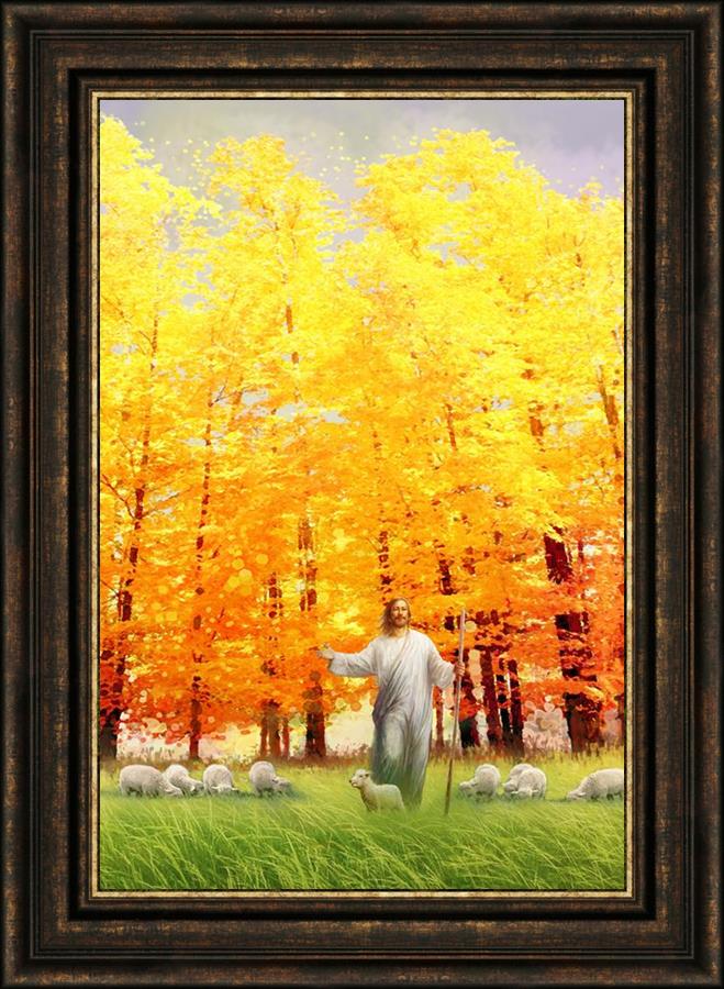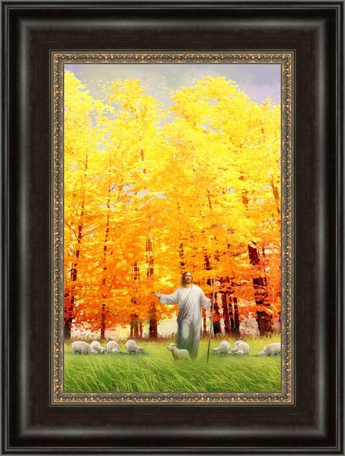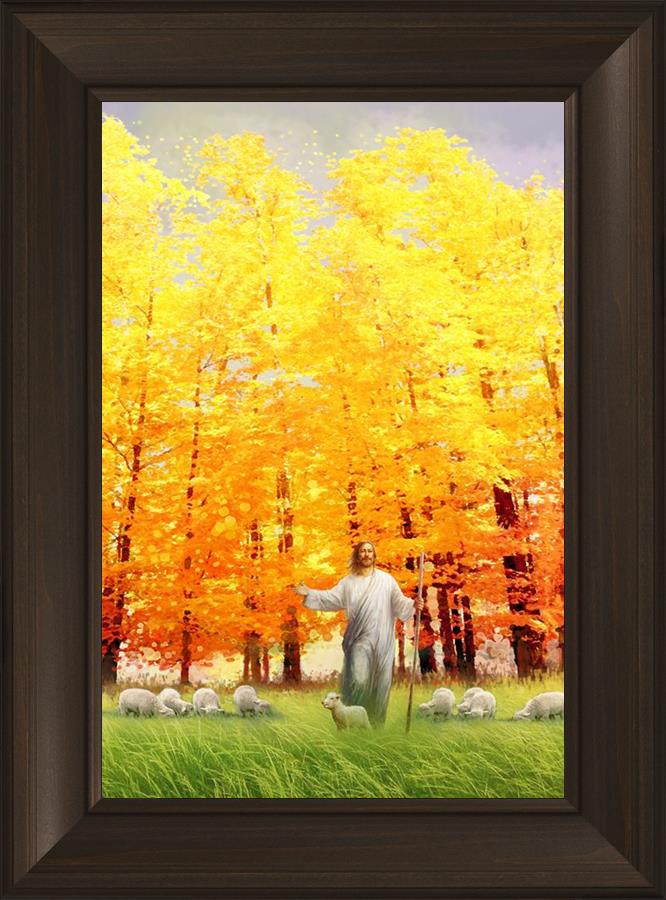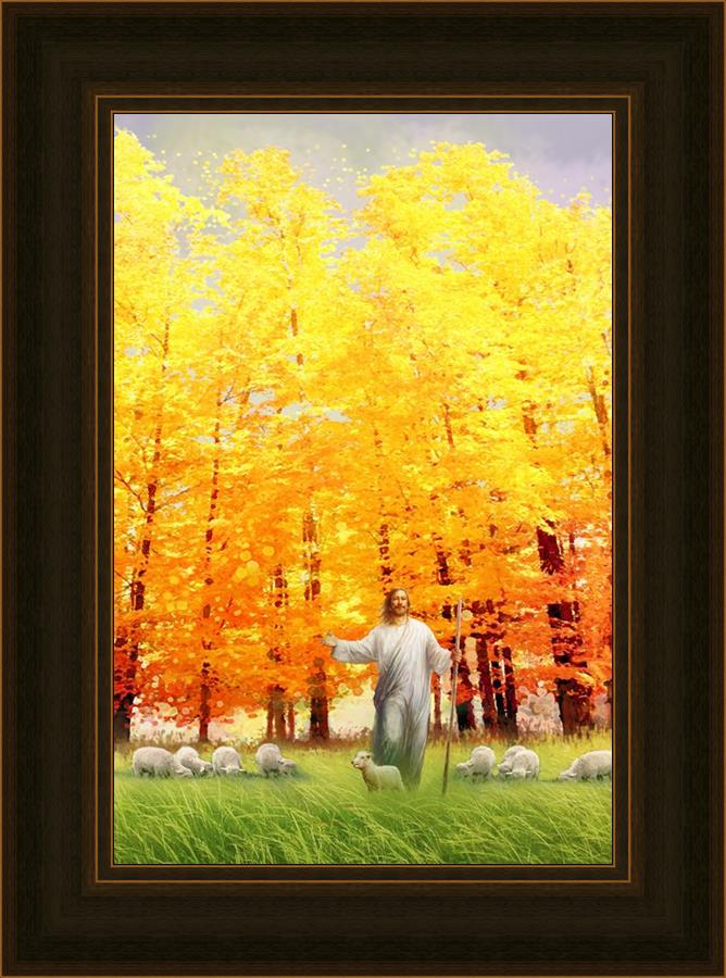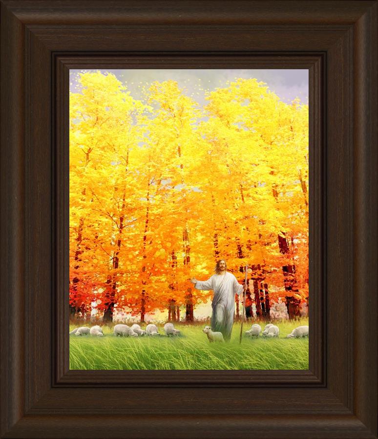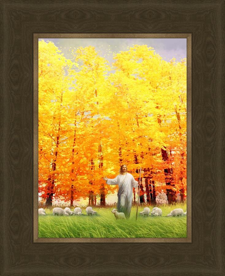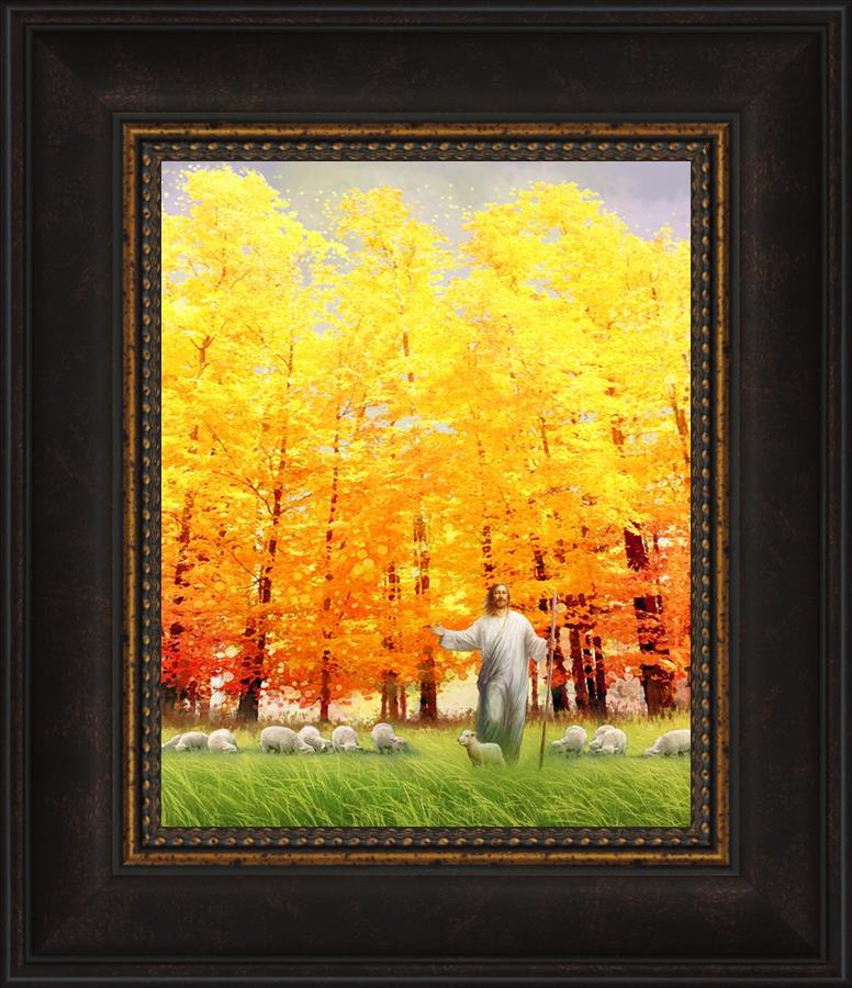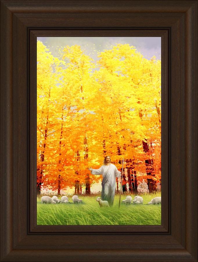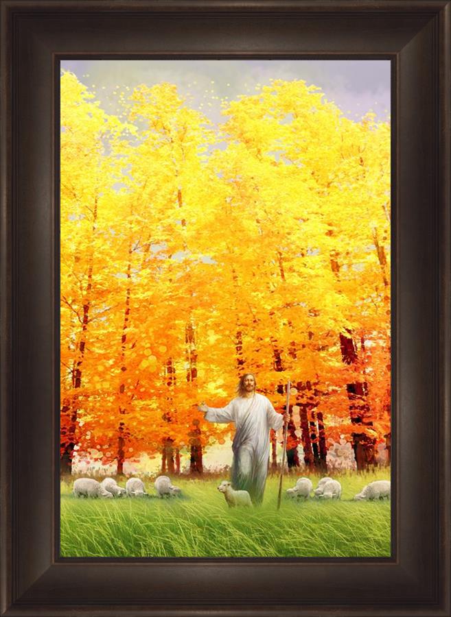 This artwork depicts Jesus standing in a green field, surrounded by a gentle flock of sheep, symbolizing His role as the Good Shepherd. Behind Him, towering yellow trees stretch toward the sky. The sheep reflect a sense of peace and security, emphasizing the relationship between Christ and His followers. Autumn Breeze encourages contemplation on Christ's closeness to nature and humanity, offering a visual meditation on His promise of rest and care for all who seek Him.