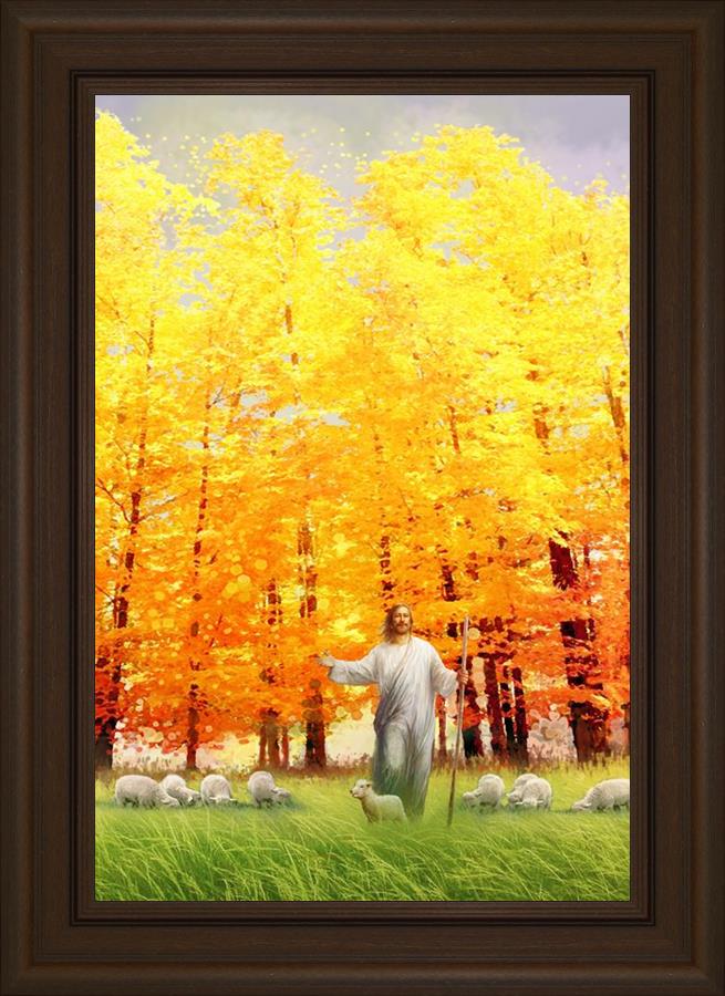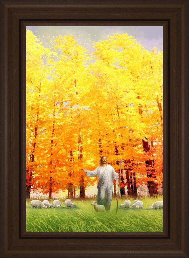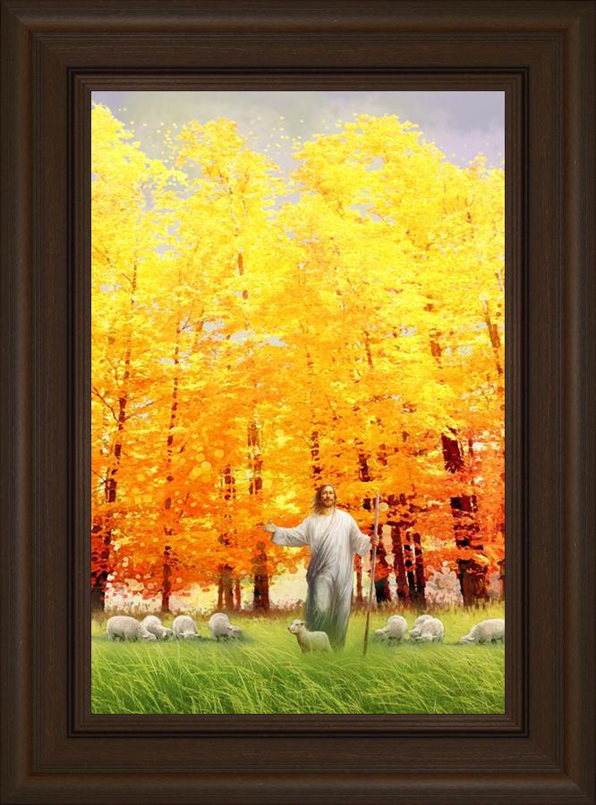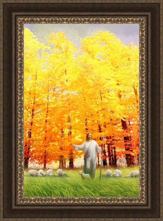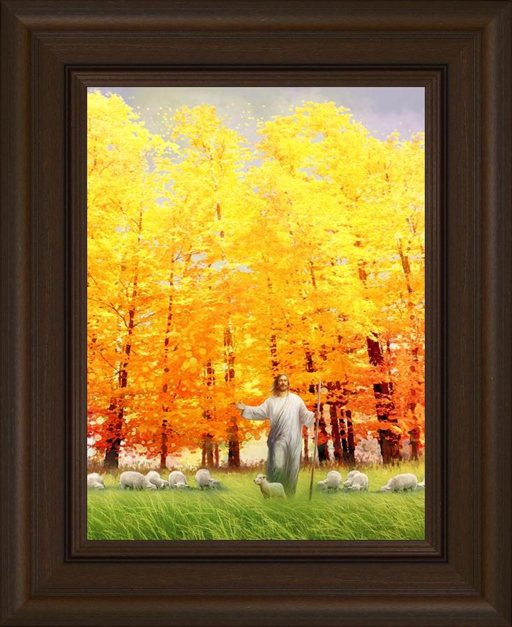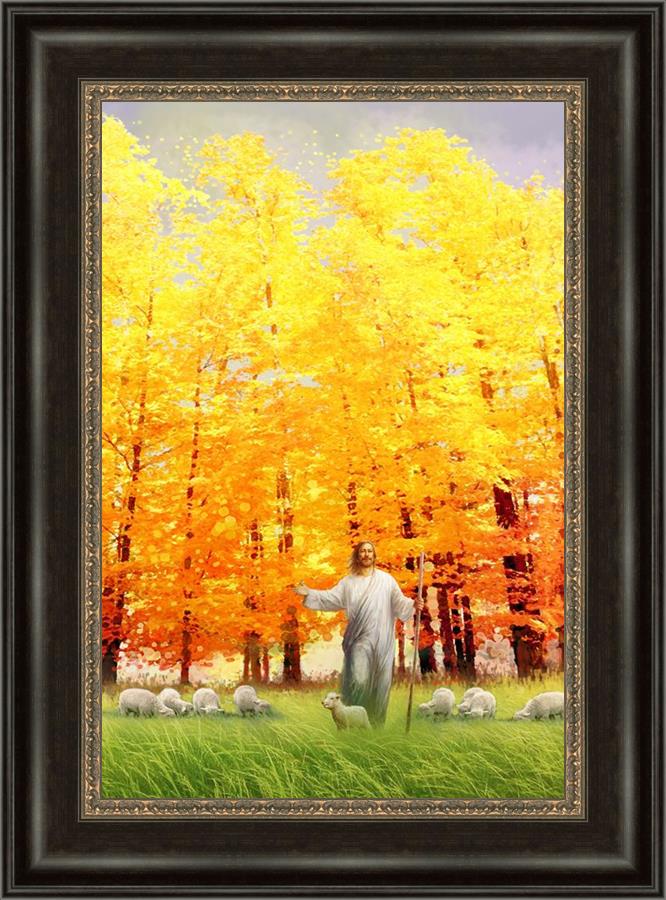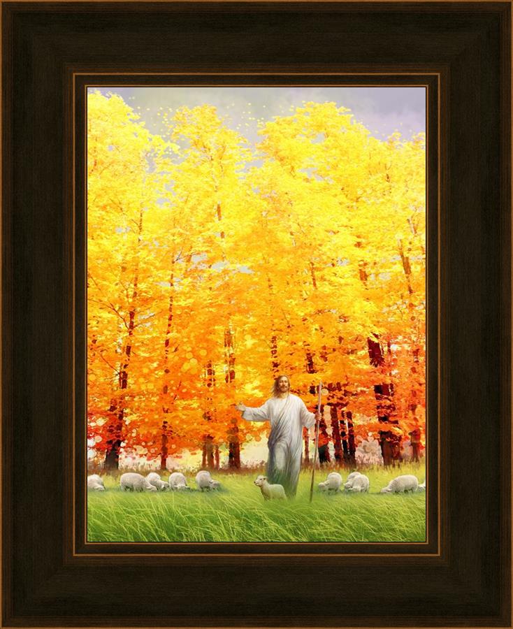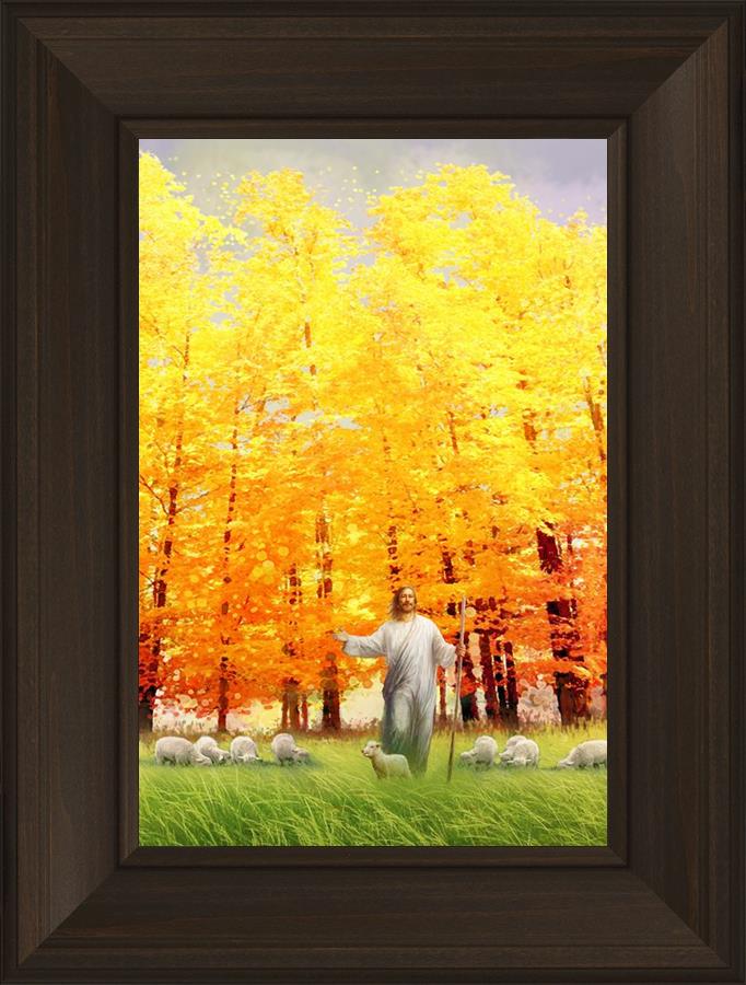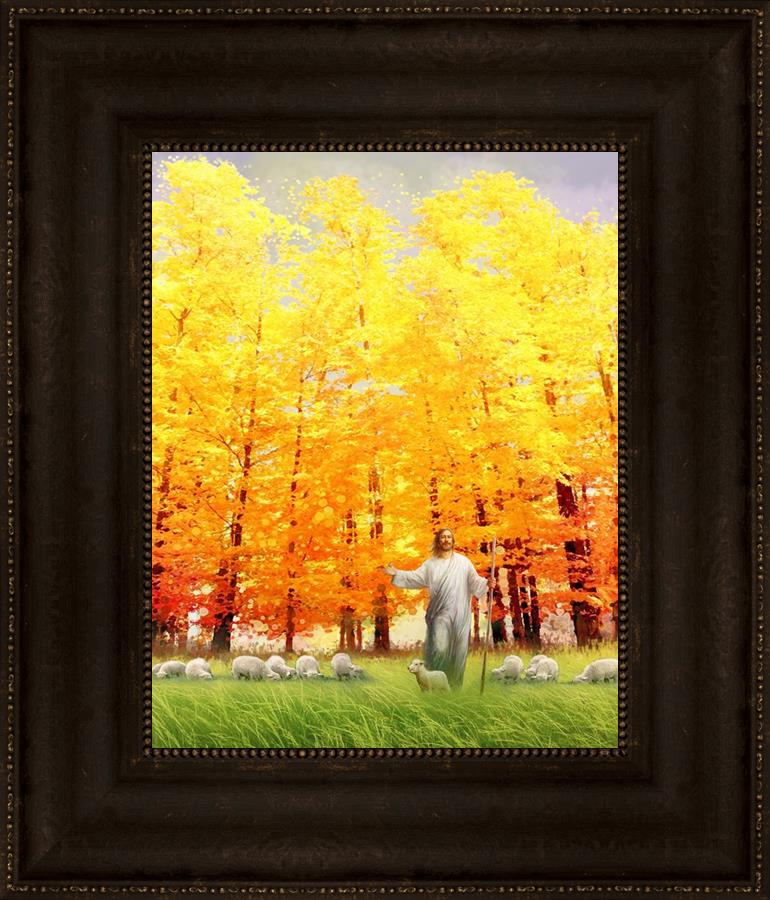 This artwork depicts Jesus standing in a green field, surrounded by a gentle flock of sheep, symbolizing His role as the Good Shepherd. Behind Him, towering yellow trees stretch toward the sky. The sheep reflect a sense of peace and security, emphasizing the relationship between Christ and His followers. Autumn Breeze encourages contemplation on Christ's closeness to nature and humanity, offering a visual meditation on His promise of rest and care for all who seek Him.