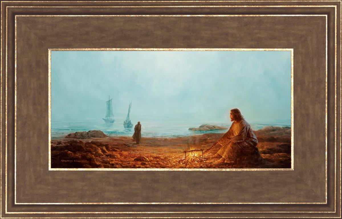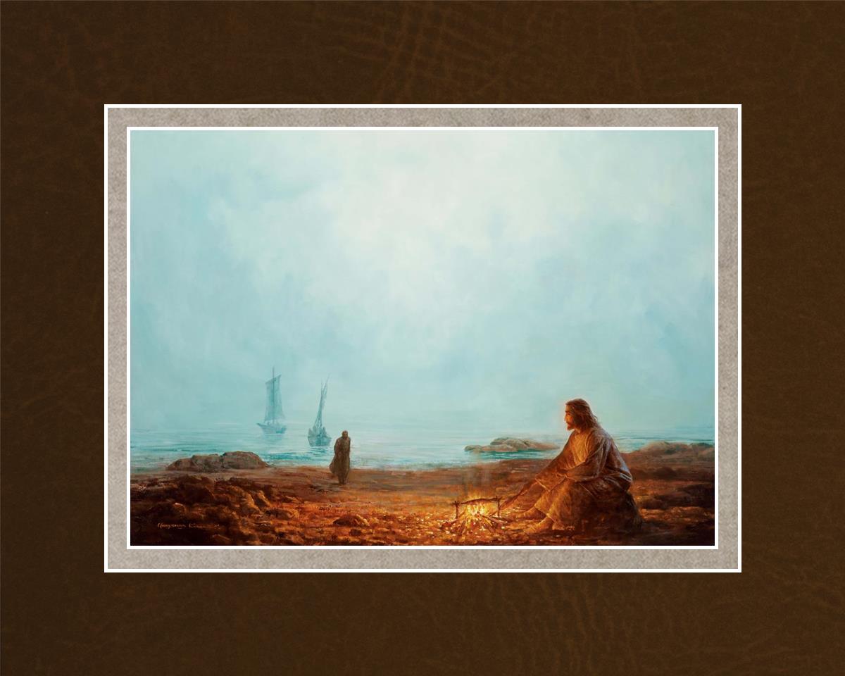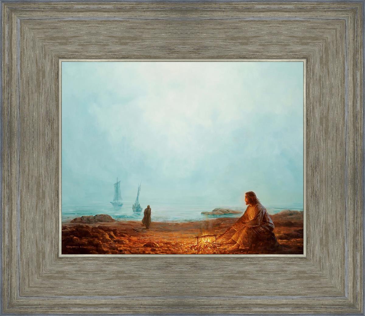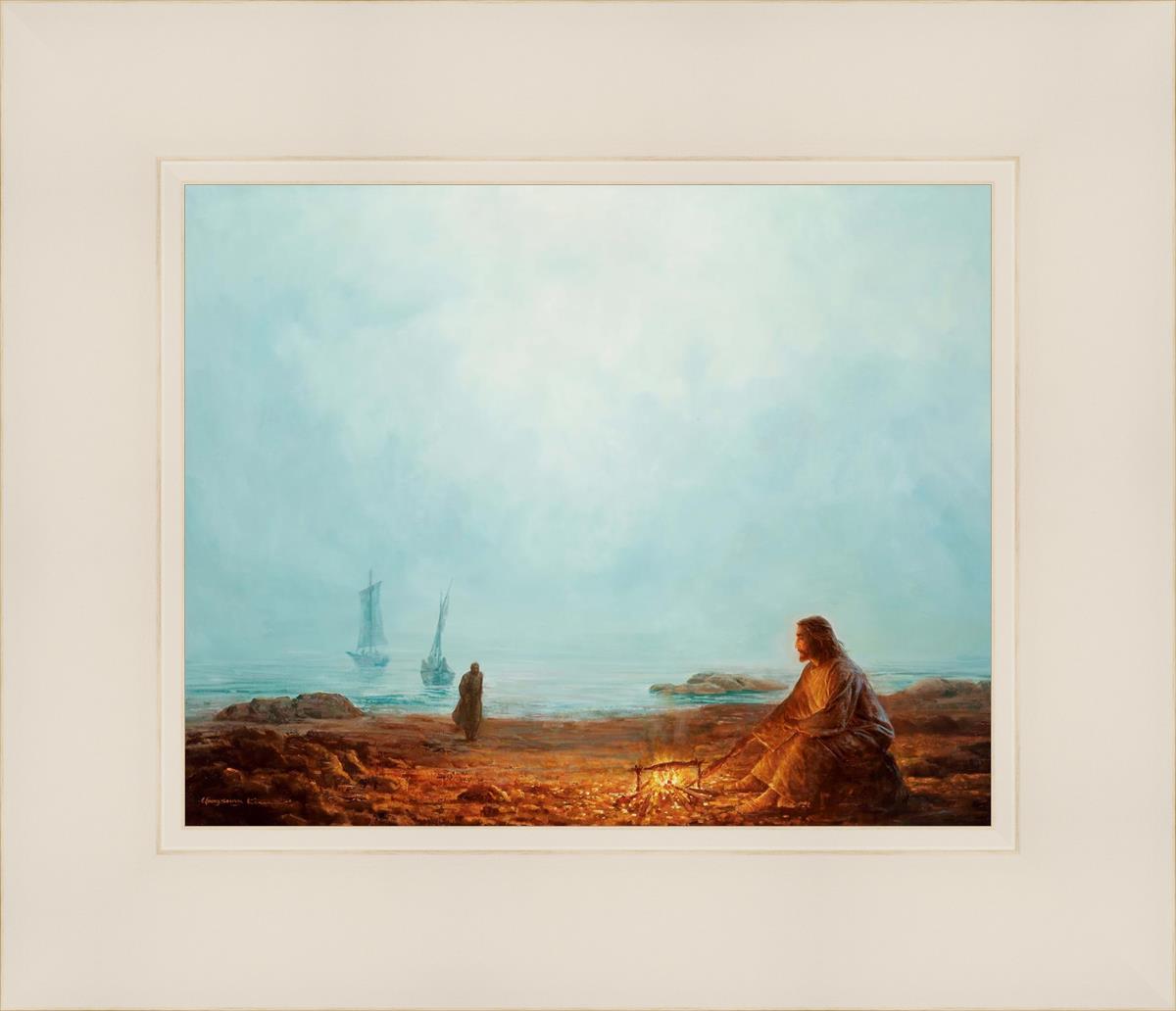 In this painting Jesus is depicted with quiet grace, preparing a meal of fish over a small fire on the shore, as the calm waters stretch out before Him. Peter, a beloved disciple, approaches Him with fishing boats in the background. The simple act of cooking fish speaks to Jesus' care and provision, a moment of intimate fellowship after His resurrection, where He offers both sustenance and communion to His disciples. By the Shore captures the quiet intimacy of a moment where Jesus lovingly tends to the needs of His followers, inviting them into His presence, ready to share in the joy and restoration He offers.