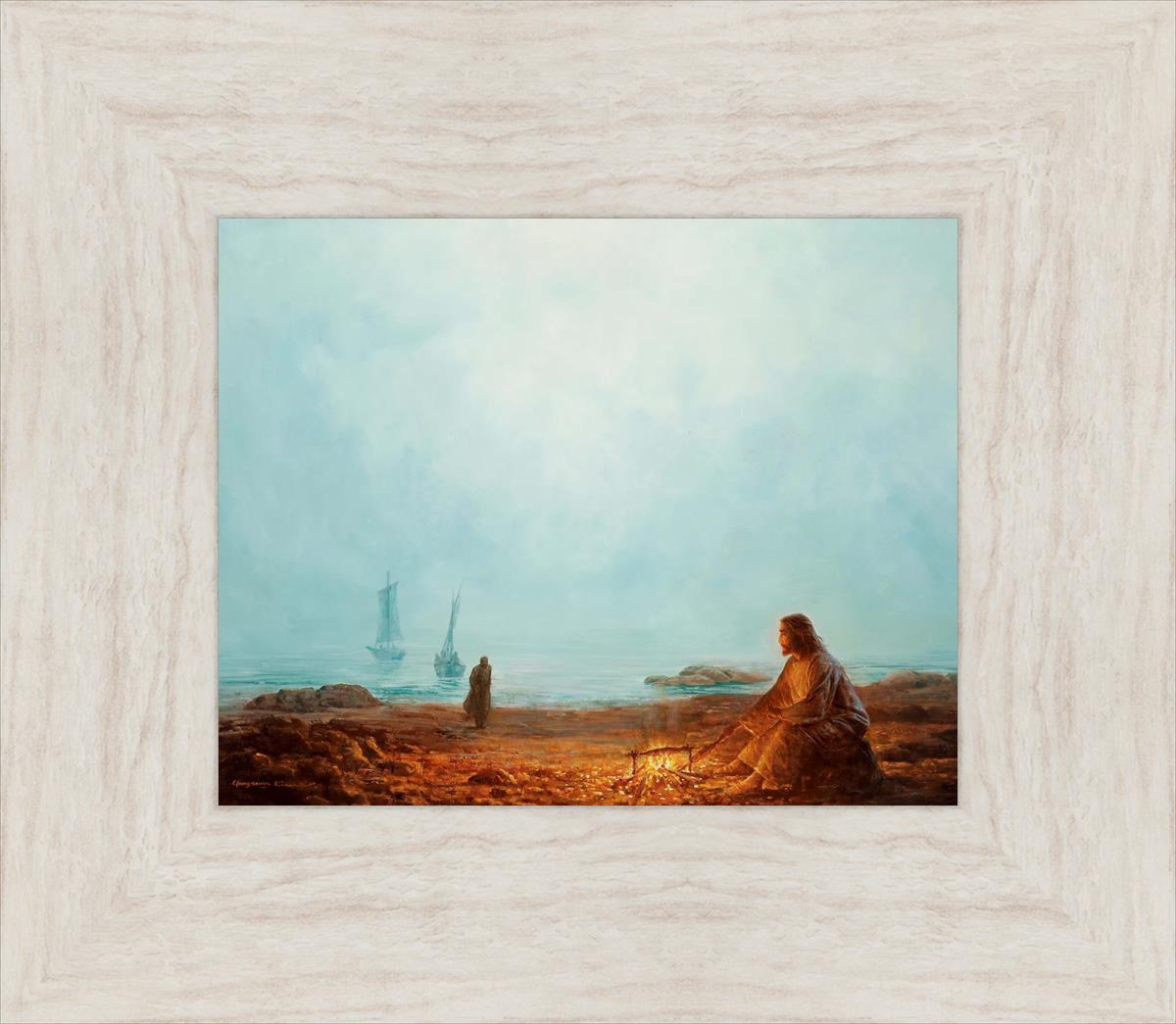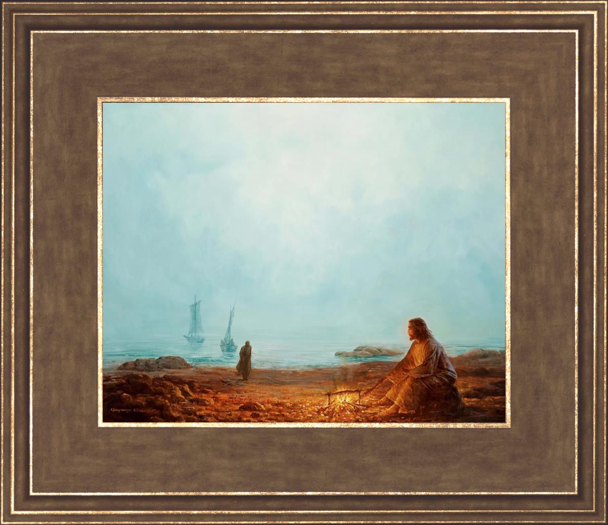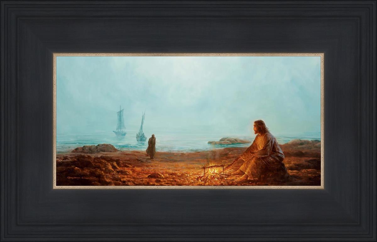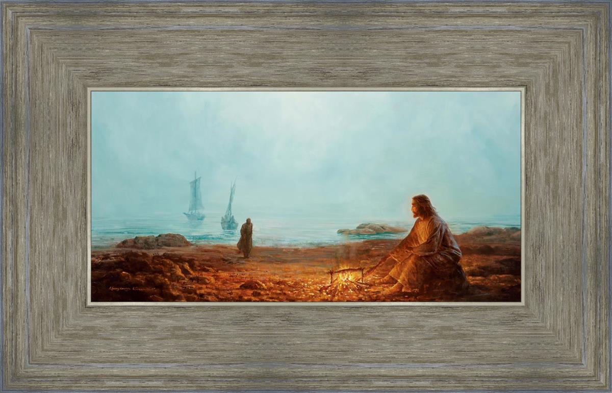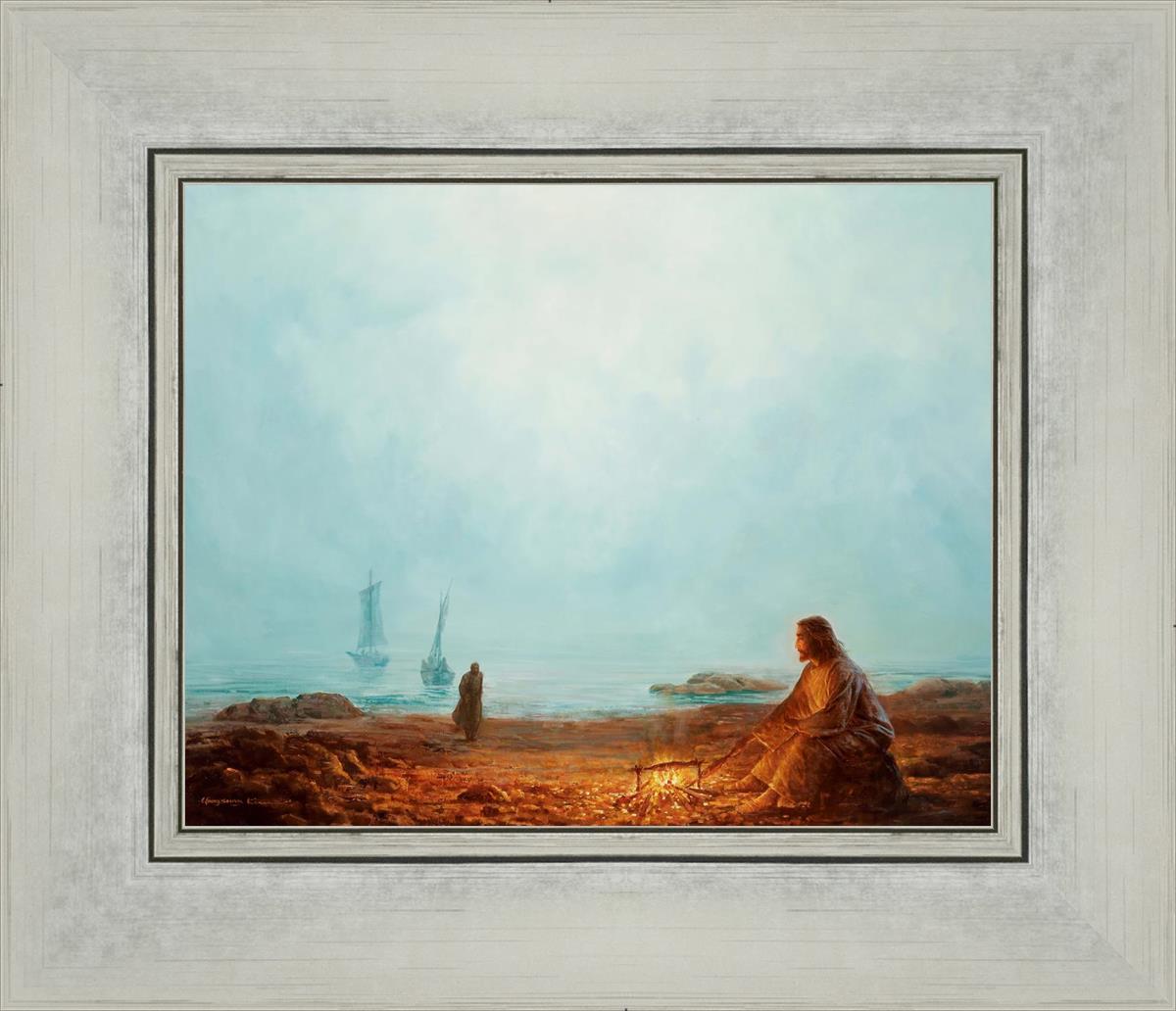 In this painting Jesus is depicted with quiet grace, preparing a meal of fish over a small fire on the shore, as the calm waters stretch out before Him. Peter, a beloved disciple, approaches Him with fishing boats in the background. The simple act of cooking fish speaks to Jesus' care and provision, a moment of intimate fellowship after His resurrection, where He offers both sustenance and communion to His disciples. By the Shore captures the quiet intimacy of a moment where Jesus lovingly tends to the needs of His followers, inviting them into His presence, ready to share in the joy and restoration He offers.