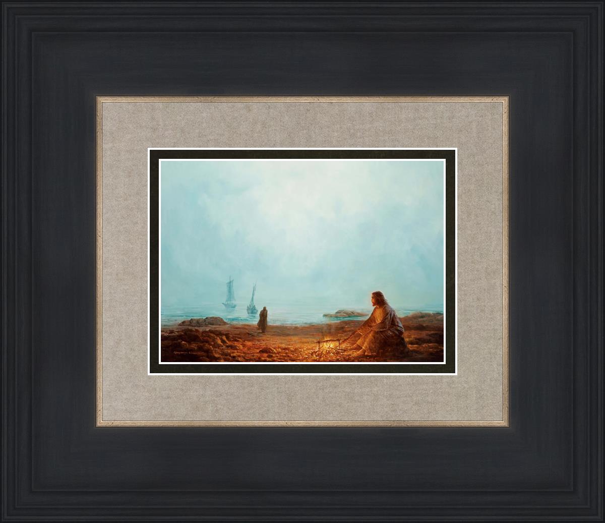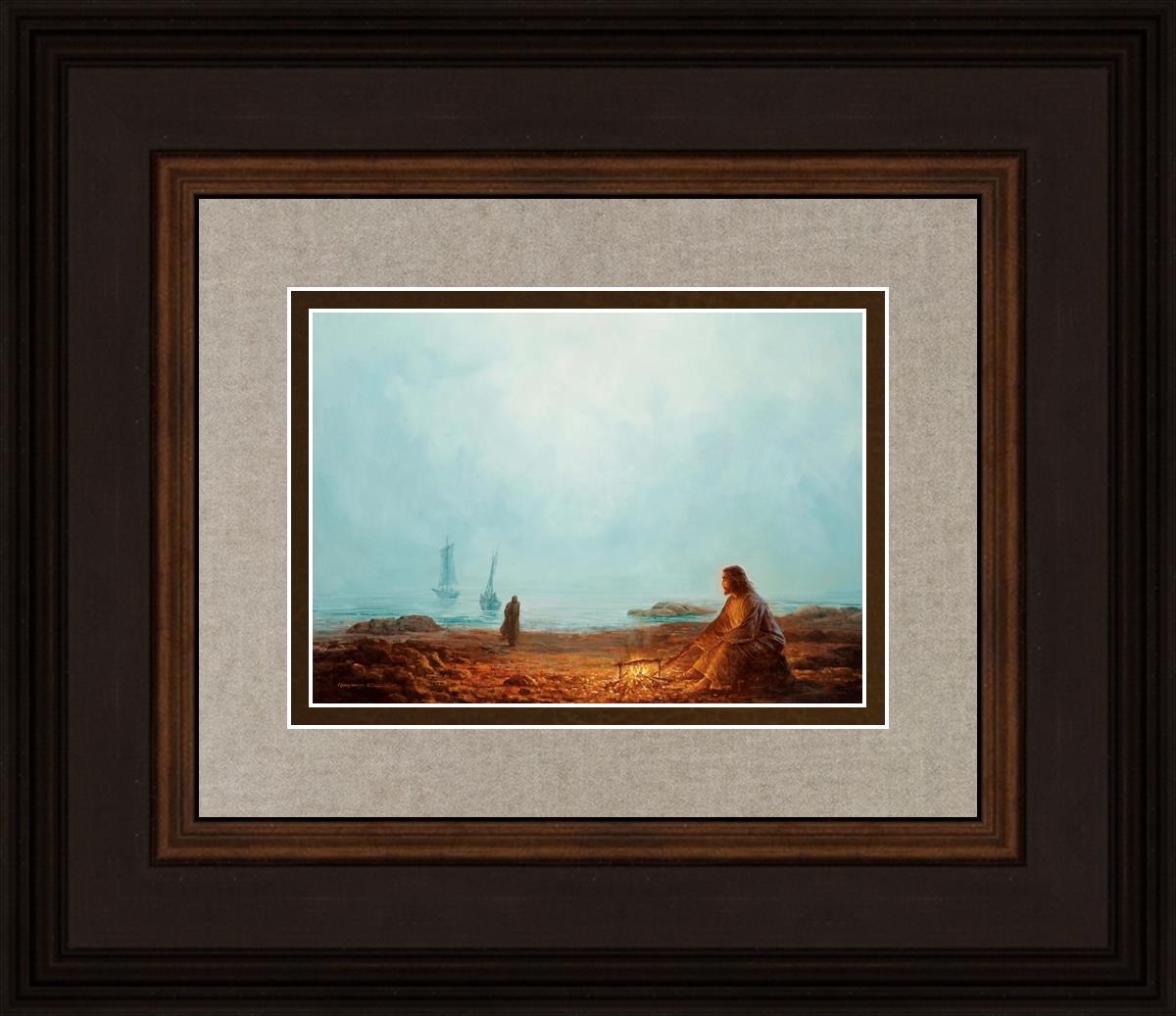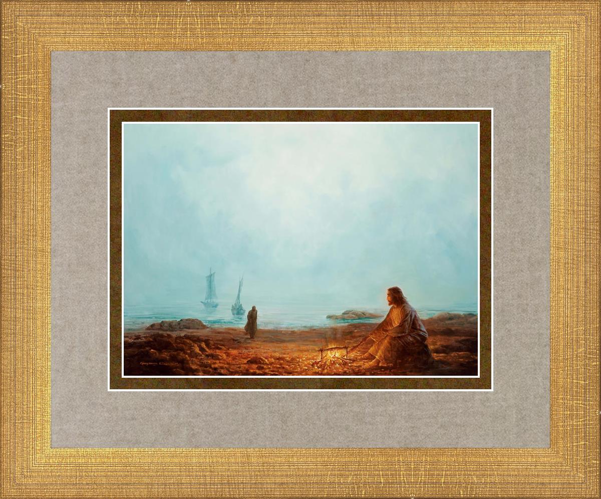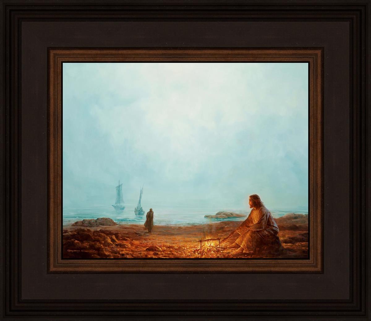 In this painting Jesus is depicted with quiet grace, preparing a meal of fish over a small fire on the shore, as the calm waters stretch out before Him. Peter, a beloved disciple, approaches Him with fishing boats in the background. The simple act of cooking fish speaks to Jesus' care and provision, a moment of intimate fellowship after His resurrection, where He offers both sustenance and communion to His disciples. By the Shore captures the quiet intimacy of a moment where Jesus lovingly tends to the needs of His followers, inviting them into His presence, ready to share in the joy and restoration He offers.
