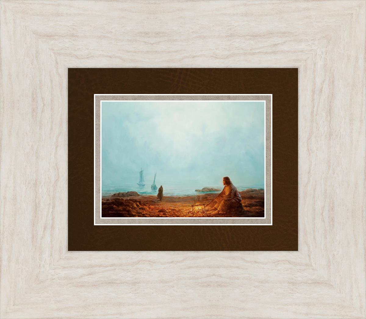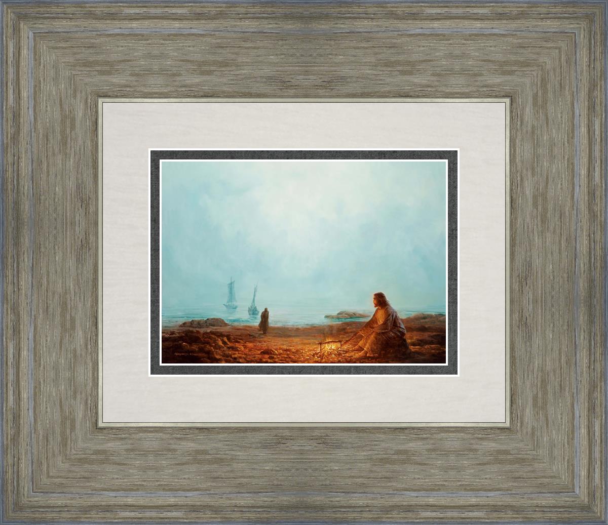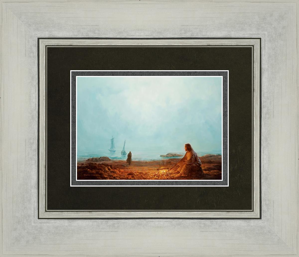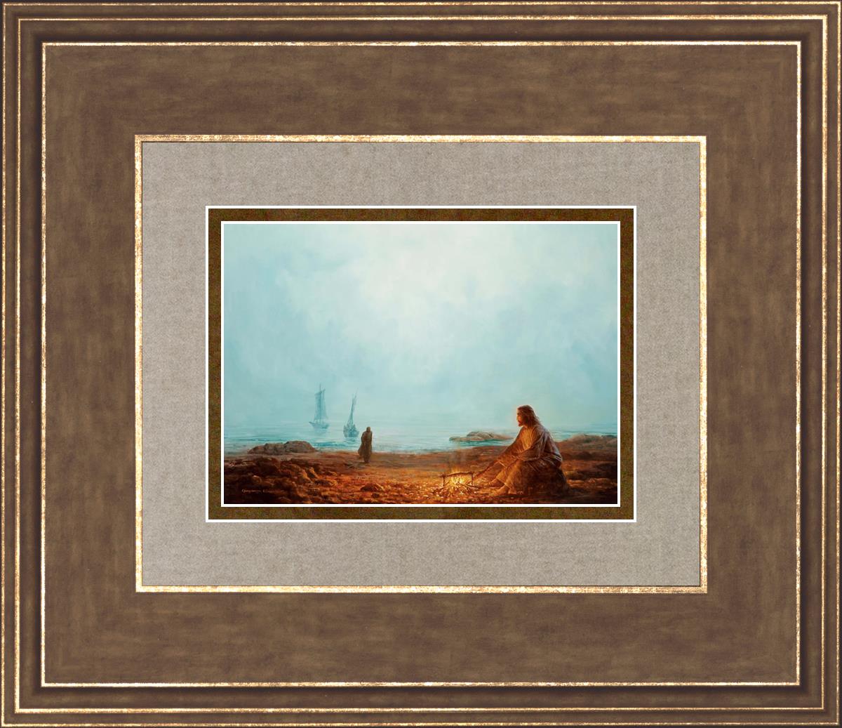 In this painting Jesus is depicted with quiet grace, preparing a meal of fish over a small fire on the shore, as the calm waters stretch out before Him. Peter, a beloved disciple, approaches Him with fishing boats in the background. The simple act of cooking fish speaks to Jesus' care and provision, a moment of intimate fellowship after His resurrection, where He offers both sustenance and communion to His disciples. By the Shore captures the quiet intimacy of a moment where Jesus lovingly tends to the needs of His followers, inviting them into His presence, ready to share in the joy and restoration He offers.