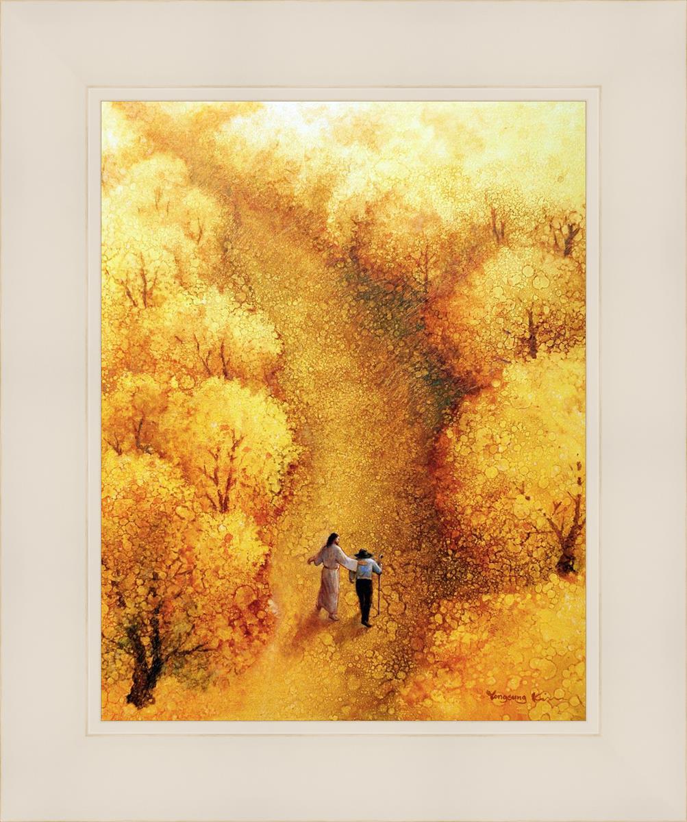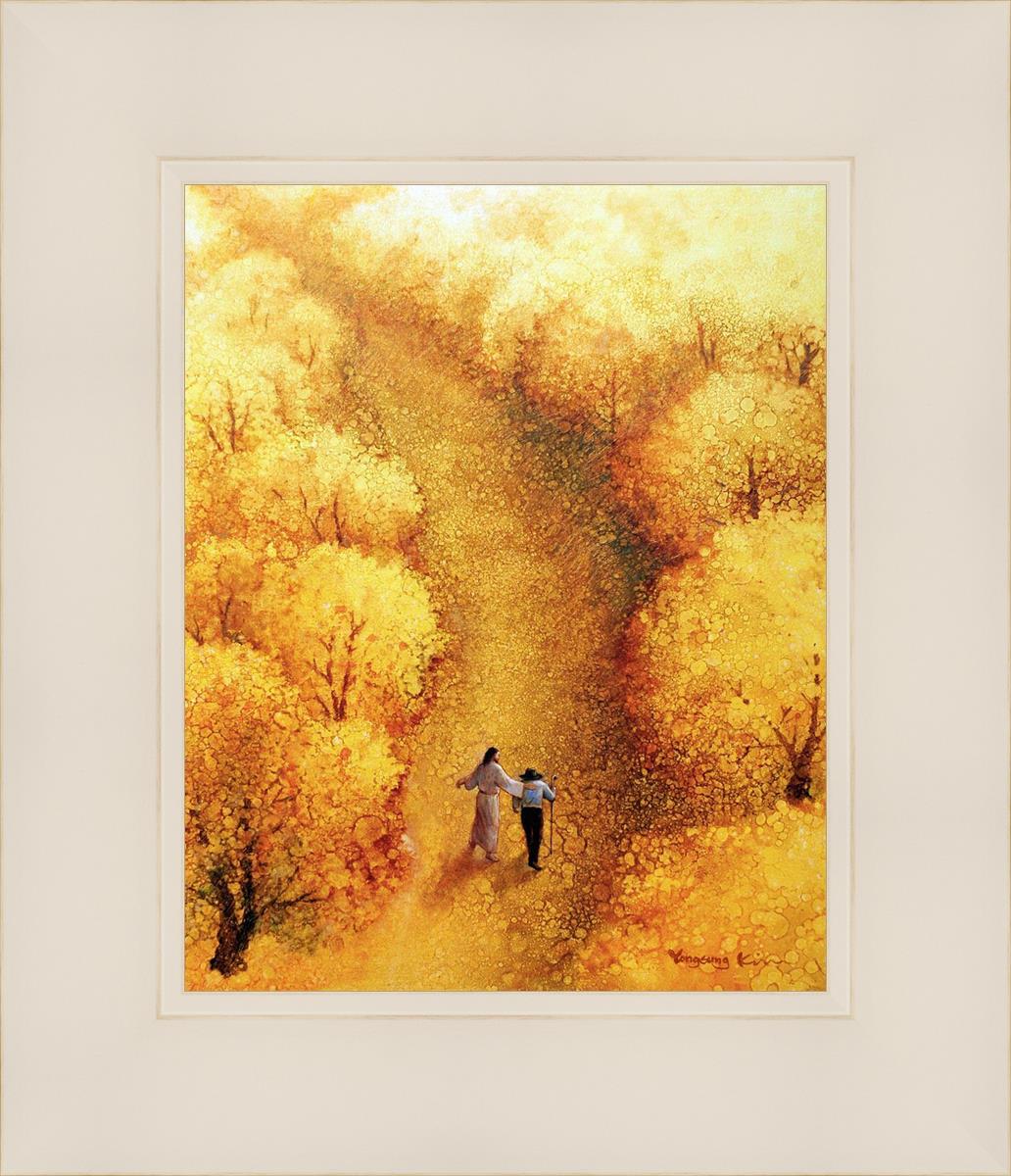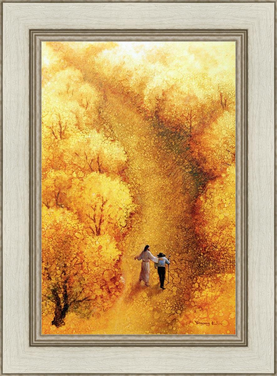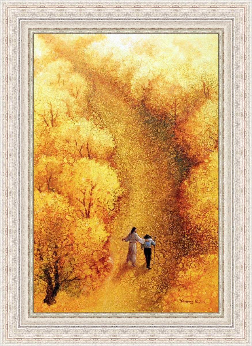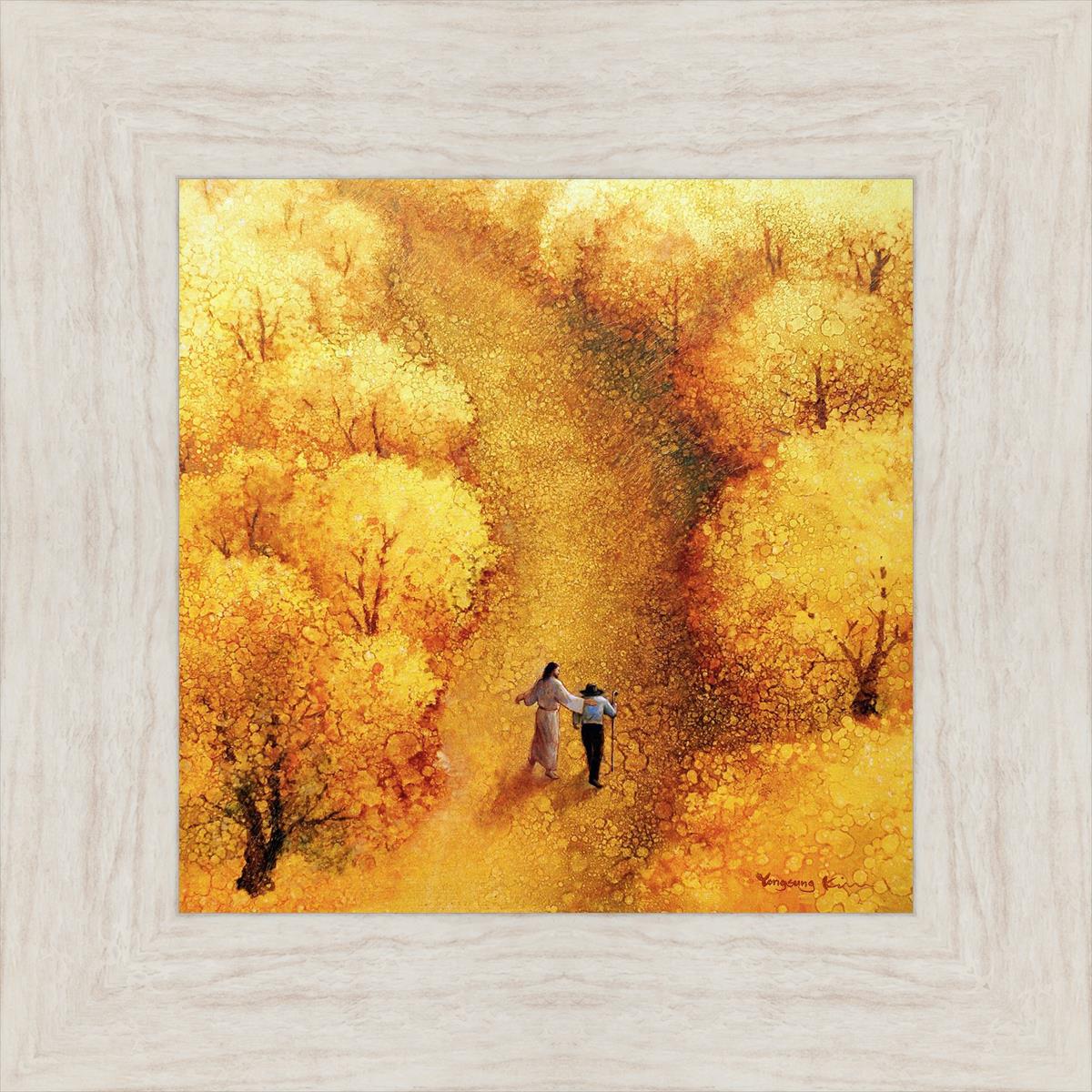 This painting portrays Jesus walking alongside a man through a peaceful path lined with golden yellow trees. It exudes a sense of calm and companionship, as Jesus compassionately walks with the man, offering His comfort and guidance. The man, leaning on a cane, walks with a measured step, his posture reflecting both the weight of his journey and the quiet assurance he finds in the Savior’s presence. The contrast between the man’s cane and Jesus’ gentle, yet firm, presence symbolizes the strength found in divine companionship. By Your Side captures the intimate, personal relationship between Jesus and His followers, reminding us that, no matter the journey, He walks with us—always by our side—offering His love, strength, and support.
