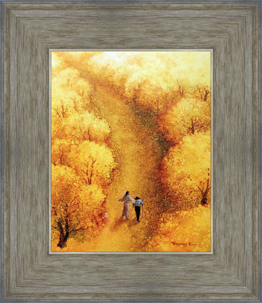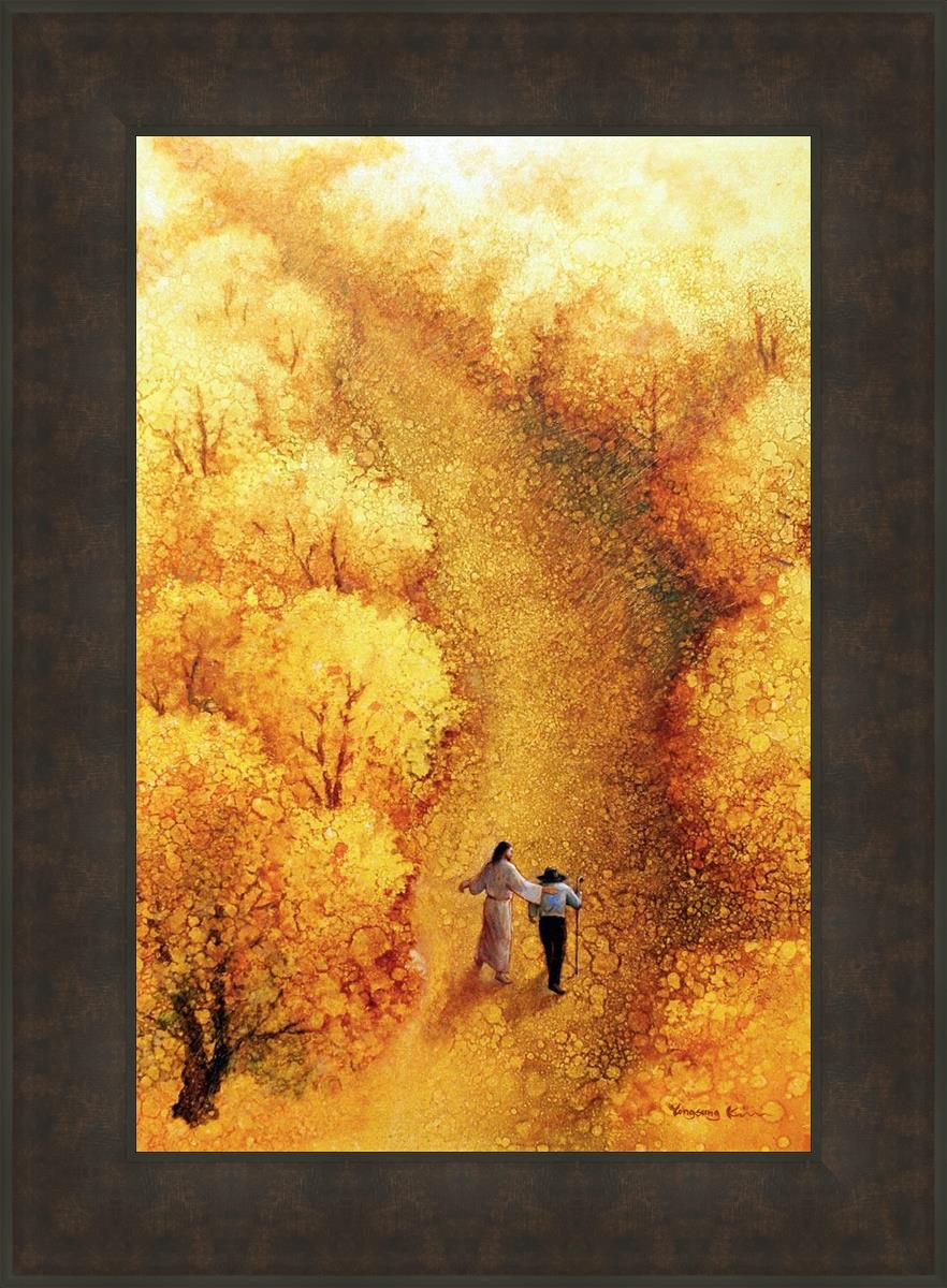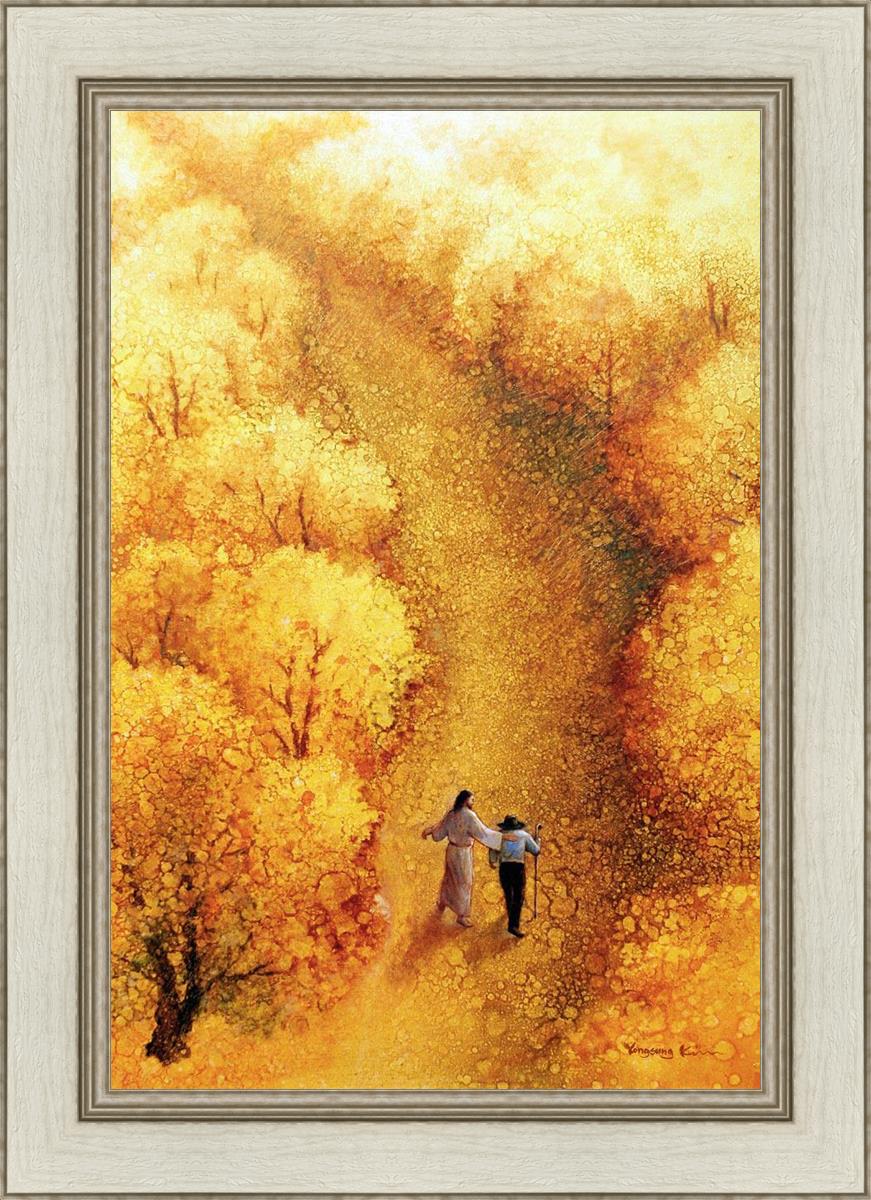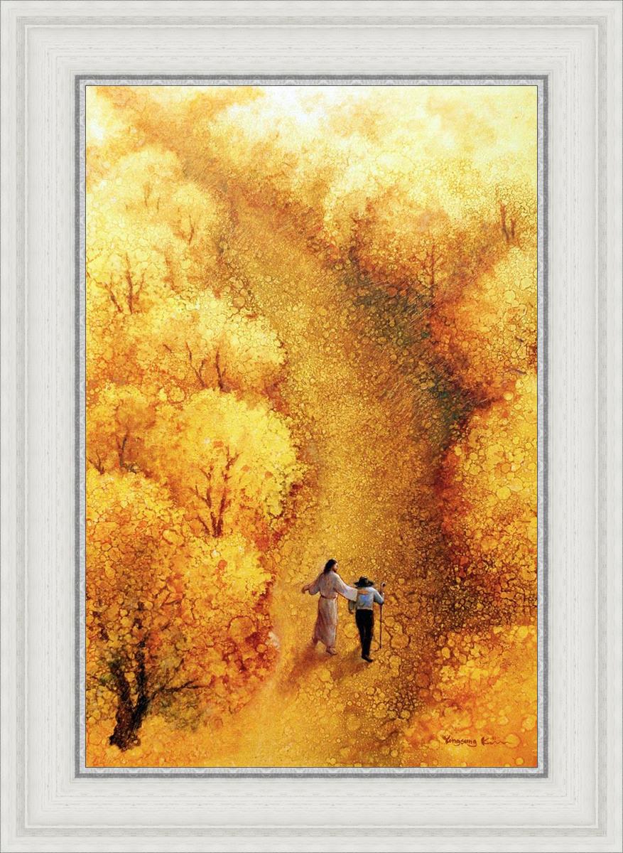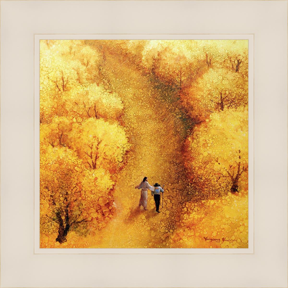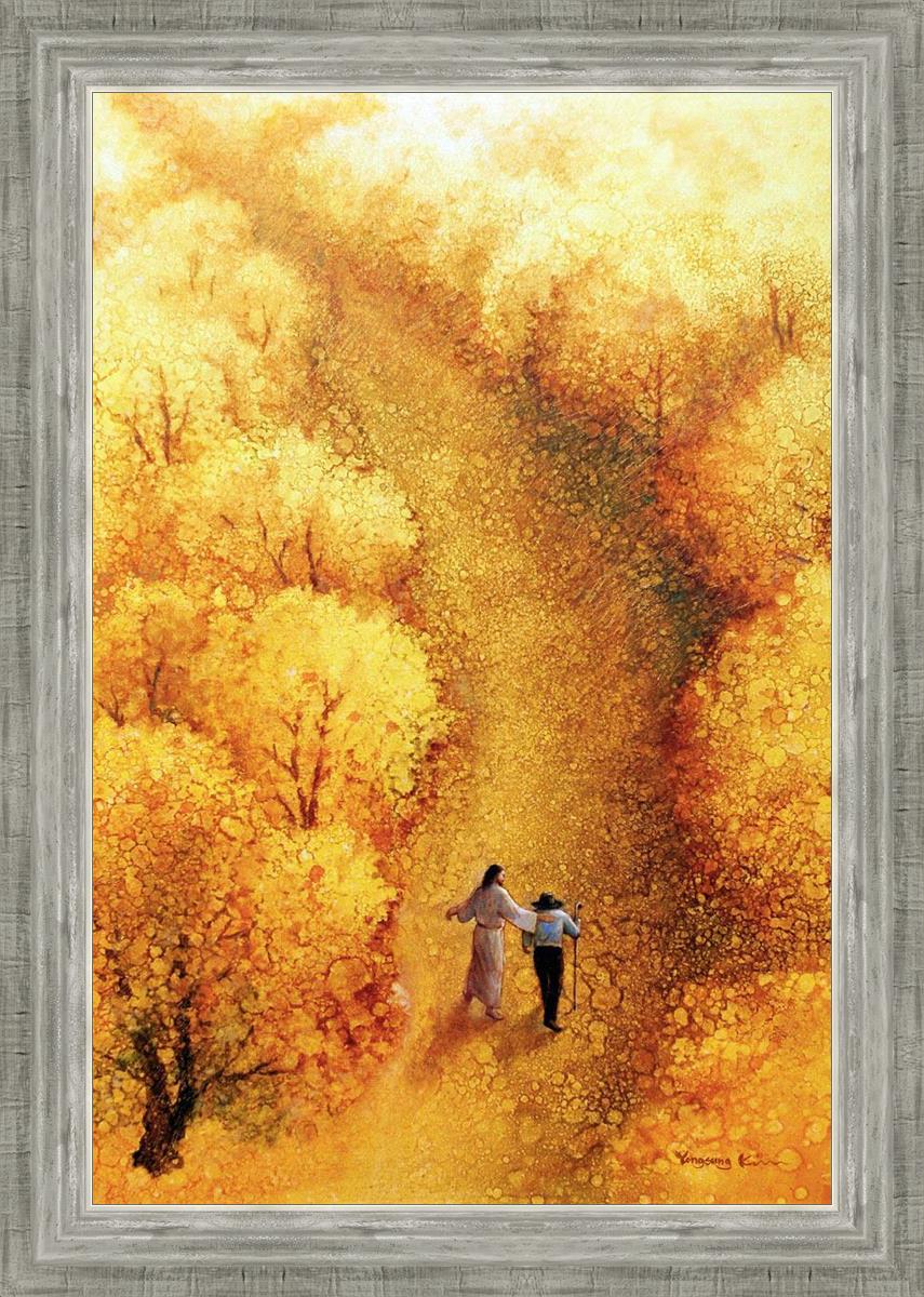 This painting portrays Jesus walking alongside a man through a peaceful path lined with golden yellow trees. It exudes a sense of calm and companionship, as Jesus compassionately walks with the man, offering His comfort and guidance. The man, leaning on a cane, walks with a measured step, his posture reflecting both the weight of his journey and the quiet assurance he finds in the Savior’s presence. The contrast between the man’s cane and Jesus’ gentle, yet firm, presence symbolizes the strength found in divine companionship. By Your Side captures the intimate, personal relationship between Jesus and His followers, reminding us that, no matter the journey, He walks with us—always by our side—offering His love, strength, and support.