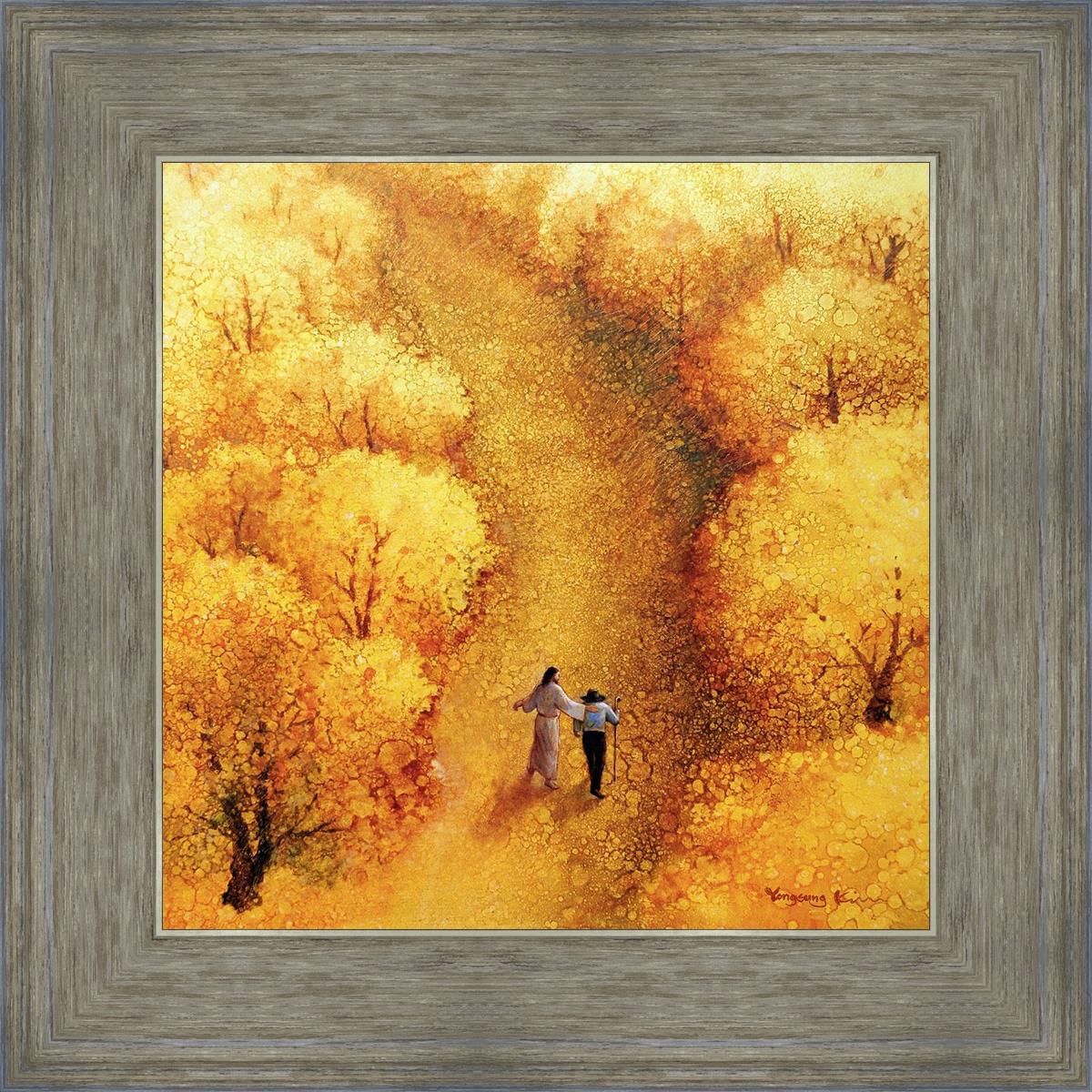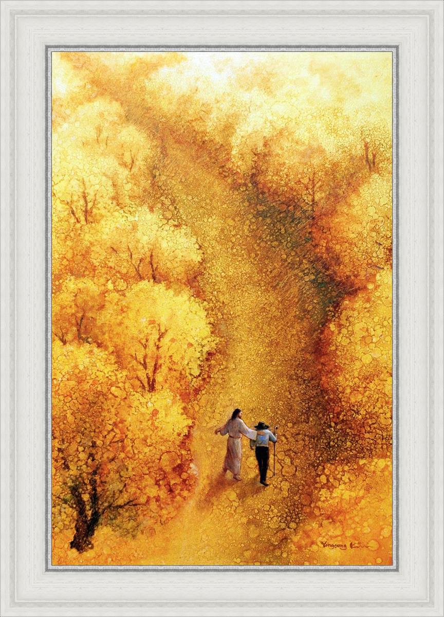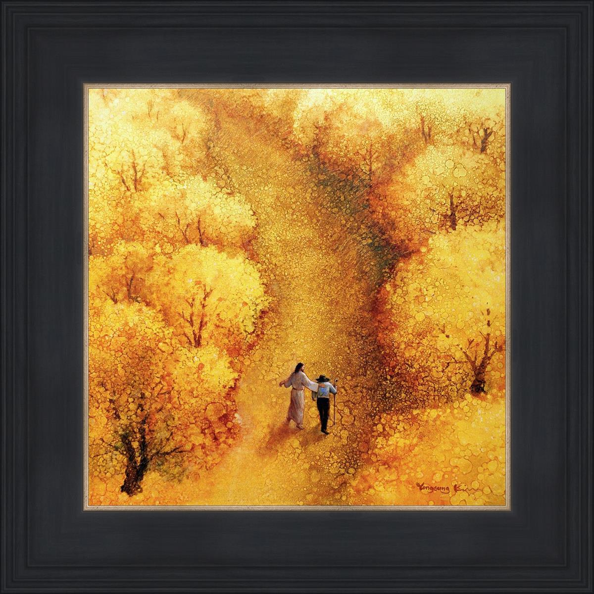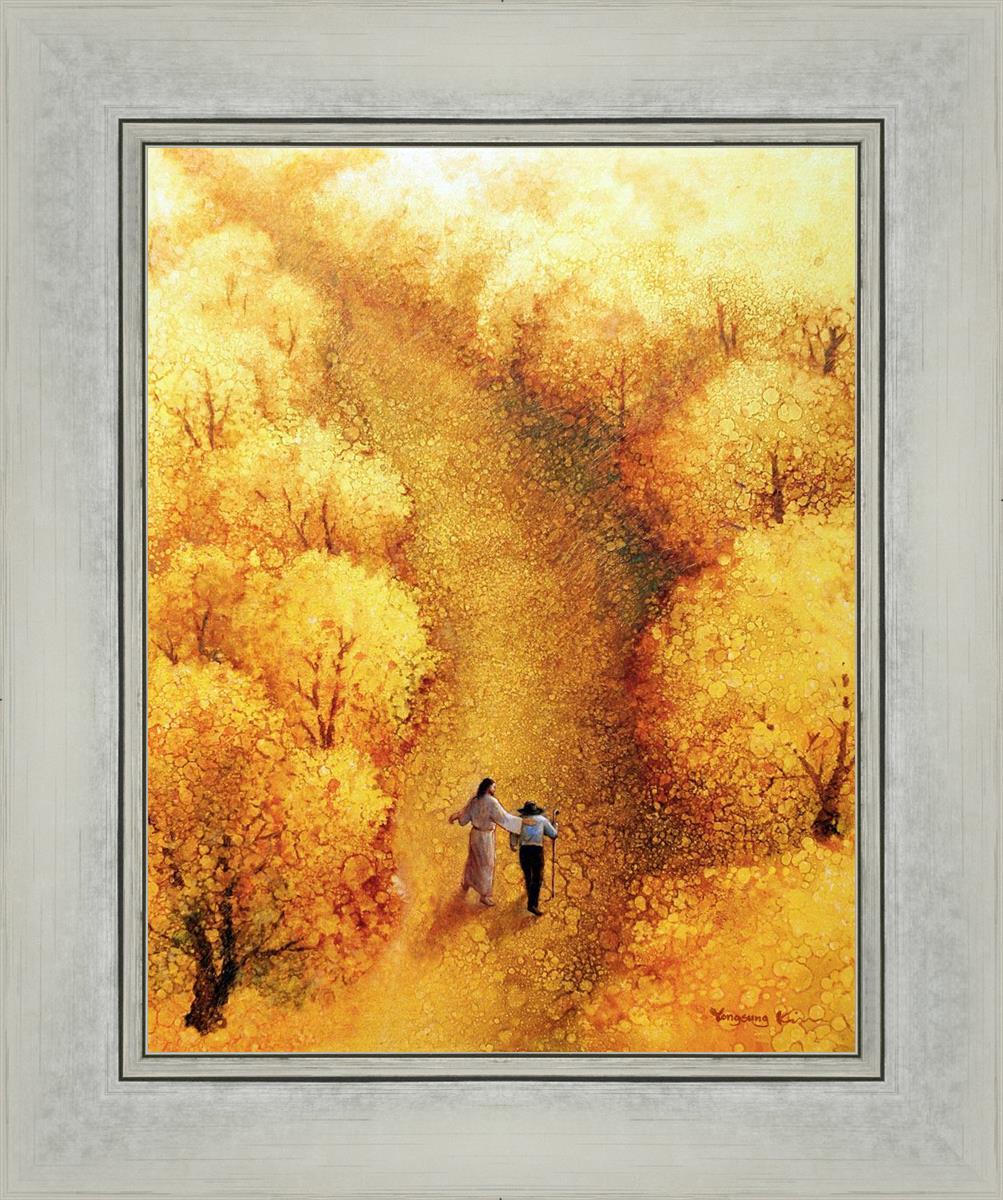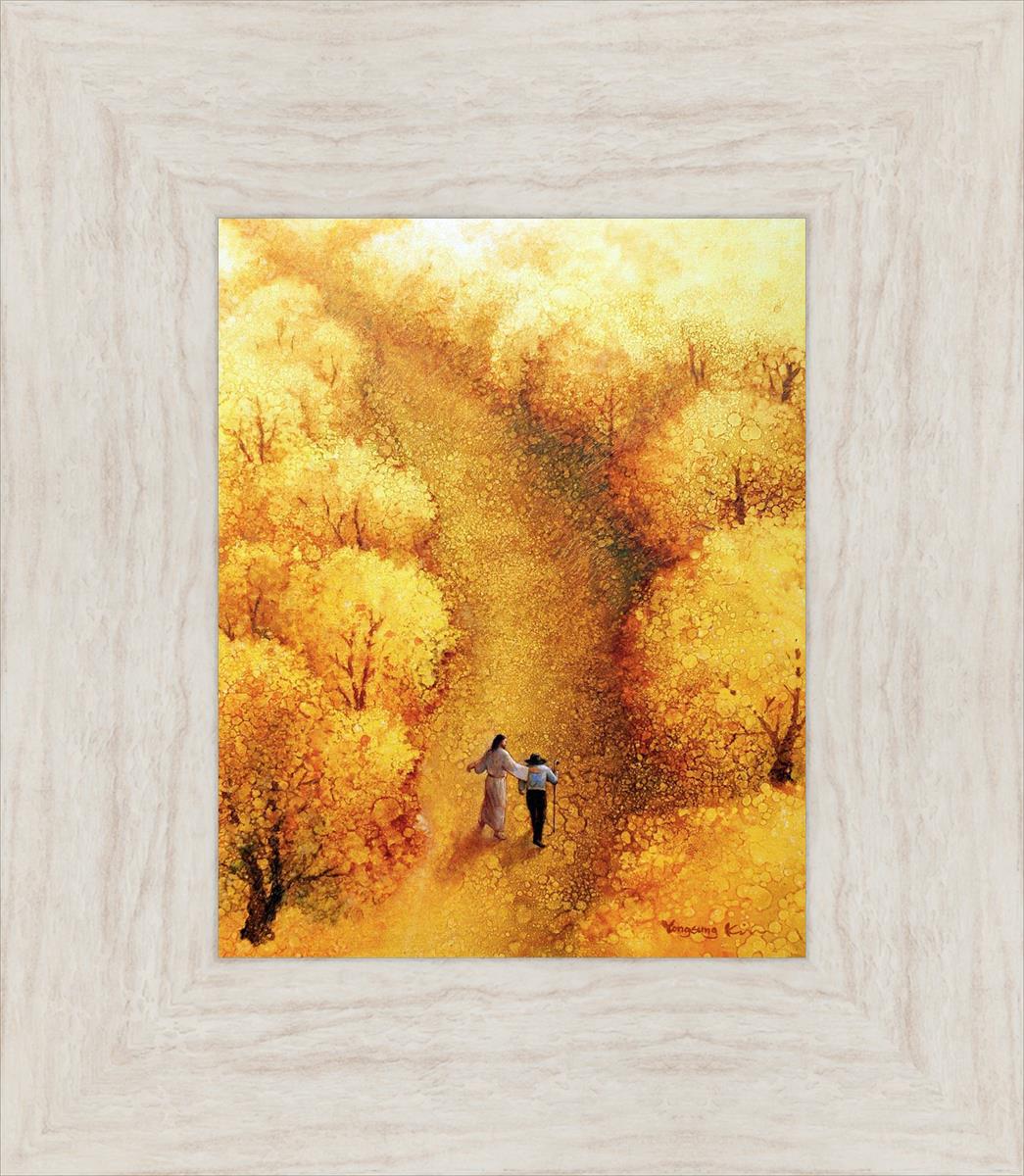 This painting portrays Jesus walking alongside a man through a peaceful path lined with golden yellow trees. It exudes a sense of calm and companionship, as Jesus compassionately walks with the man, offering His comfort and guidance. The man, leaning on a cane, walks with a measured step, his posture reflecting both the weight of his journey and the quiet assurance he finds in the Savior’s presence. The contrast between the man’s cane and Jesus’ gentle, yet firm, presence symbolizes the strength found in divine companionship. By Your Side captures the intimate, personal relationship between Jesus and His followers, reminding us that, no matter the journey, He walks with us—always by our side—offering His love, strength, and support.
