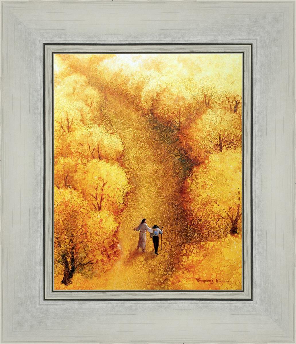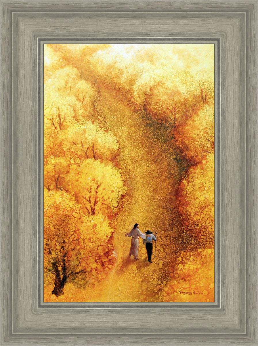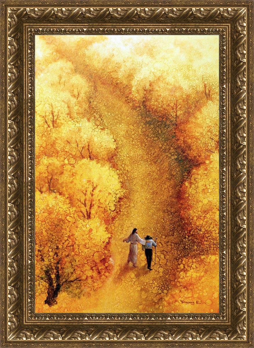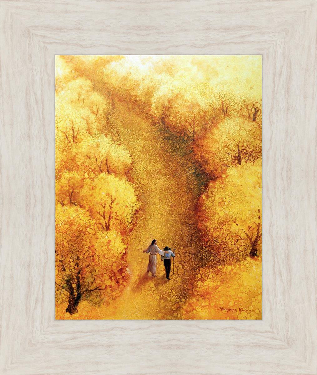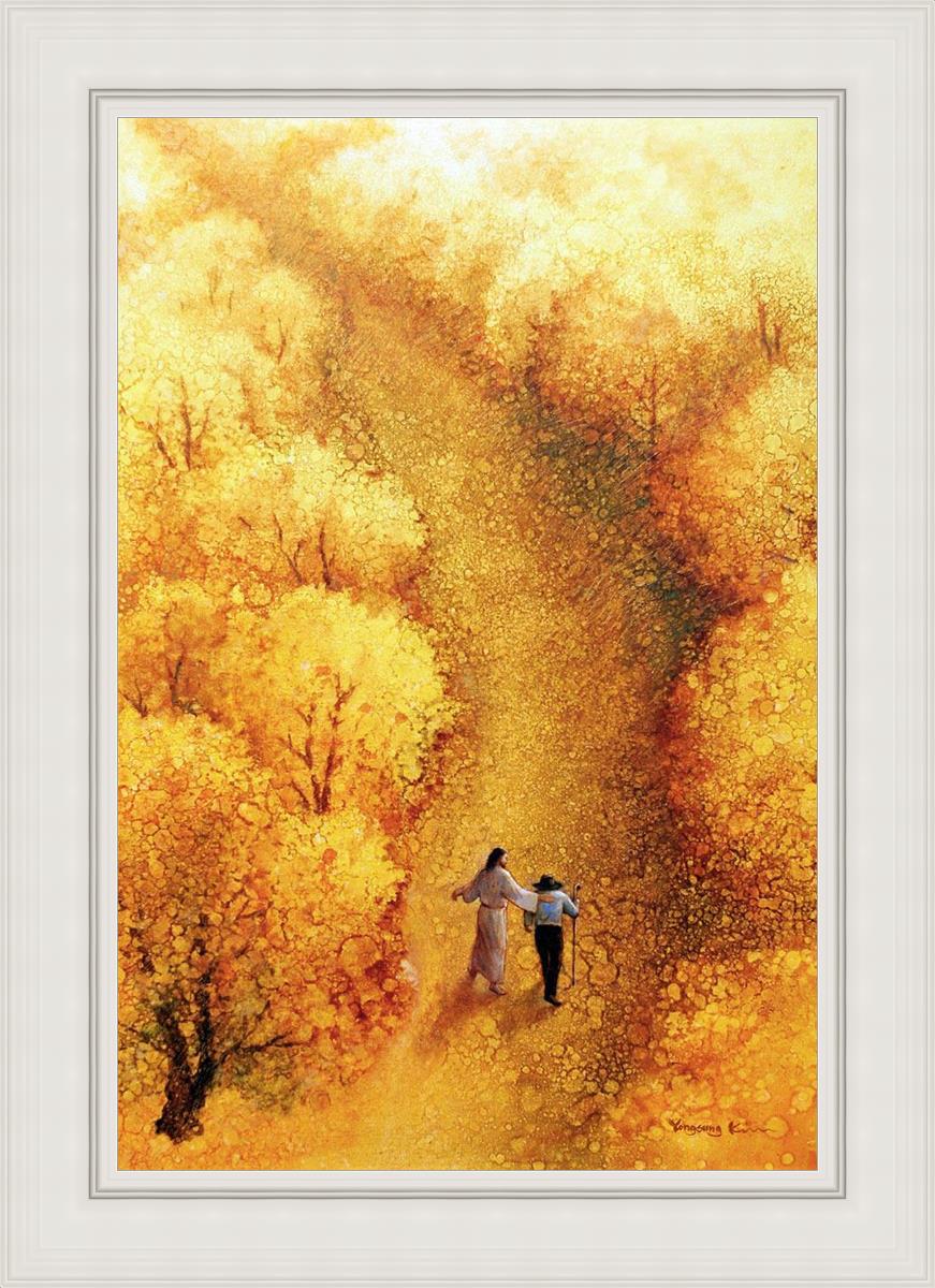This painting portrays Jesus walking alongside a man through a peaceful path lined with golden yellow trees. It exudes a sense of calm and companionship, as Jesus compassionately walks with the man, offering His comfort and guidance. The man, leaning on a cane, walks with a measured step, his posture reflecting both the weight of his journey and the quiet assurance he finds in the Savior’s presence. The contrast between the man’s cane and Jesus’ gentle, yet firm, presence symbolizes the strength found in divine companionship. By Your Side captures the intimate, personal relationship between Jesus and His followers, reminding us that, no matter the journey, He walks with us—always by our side—offering His love, strength, and support.