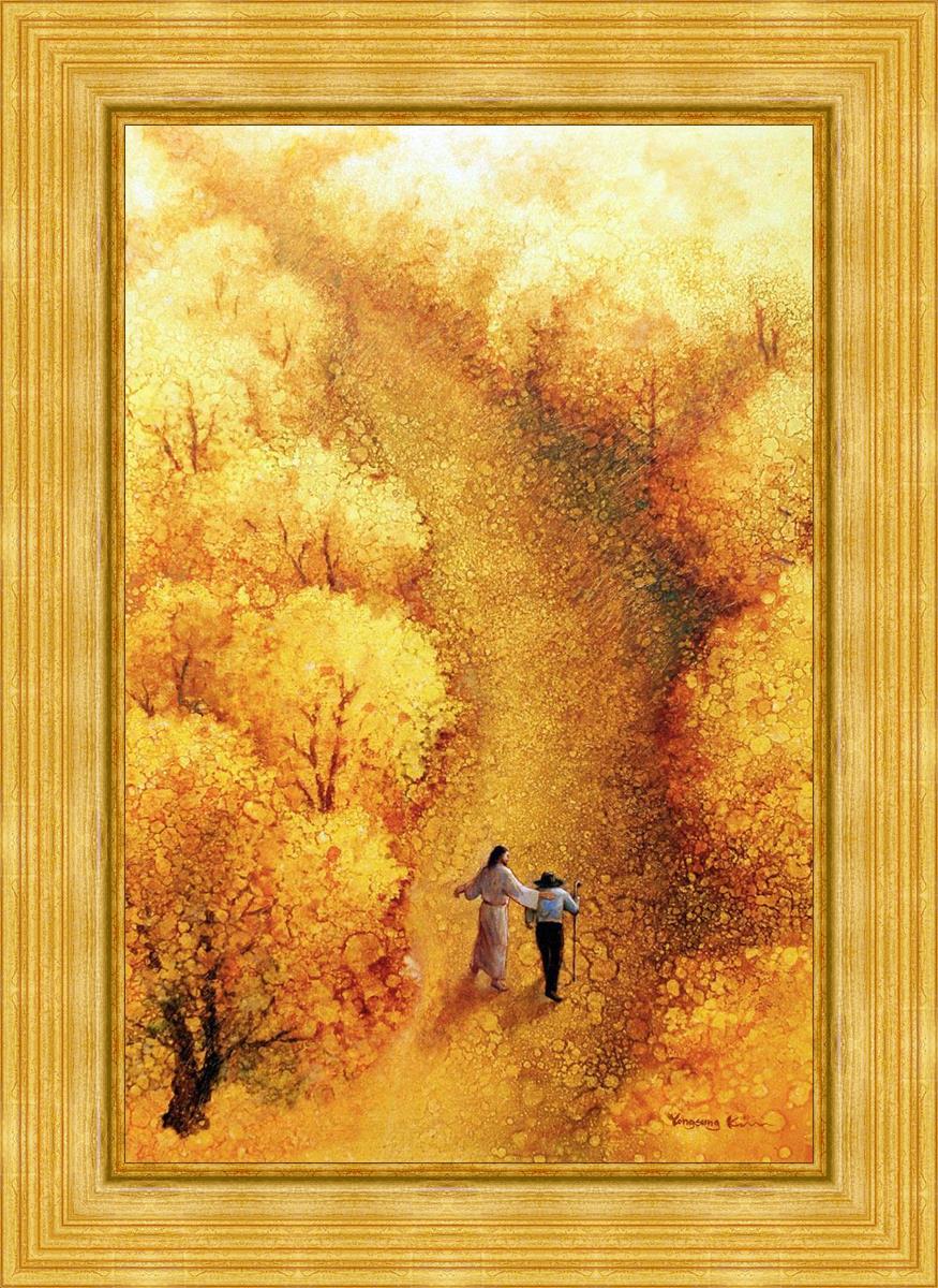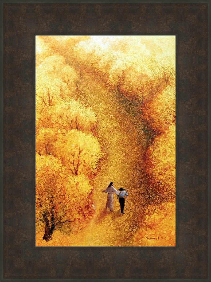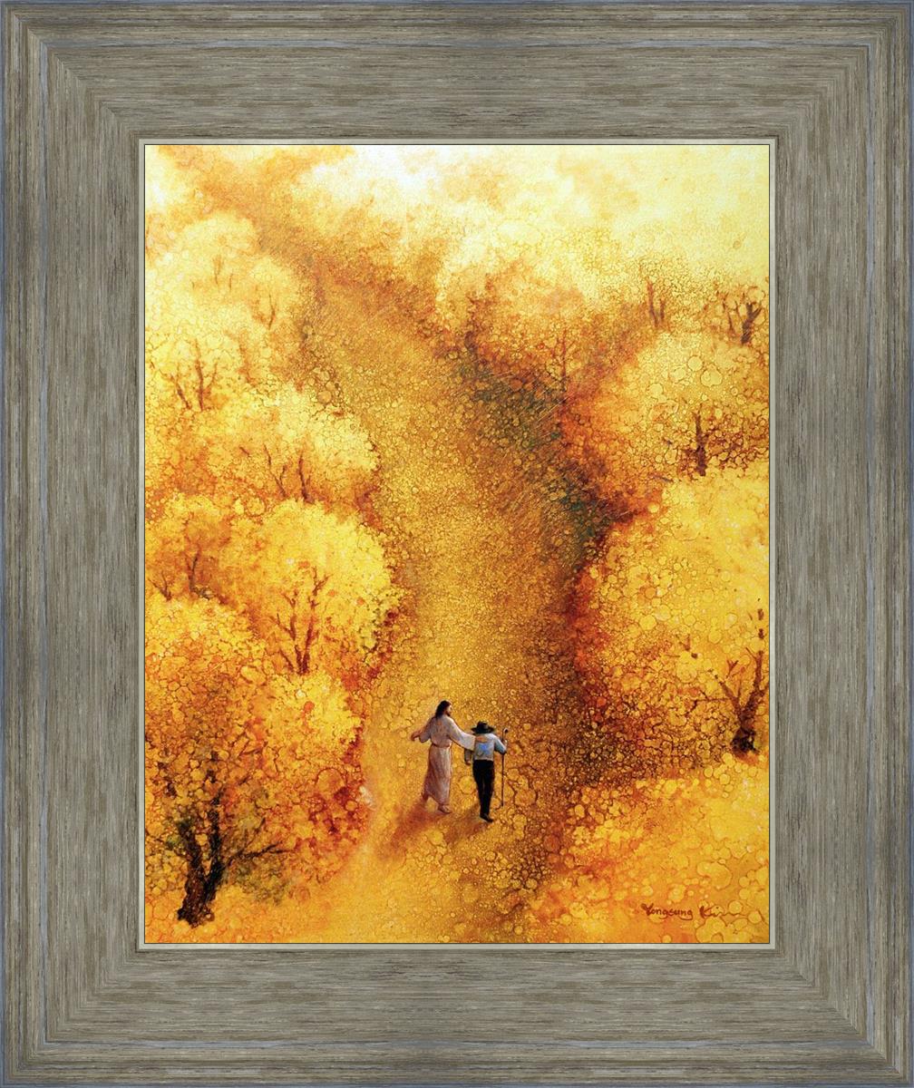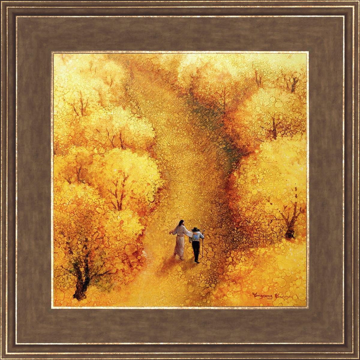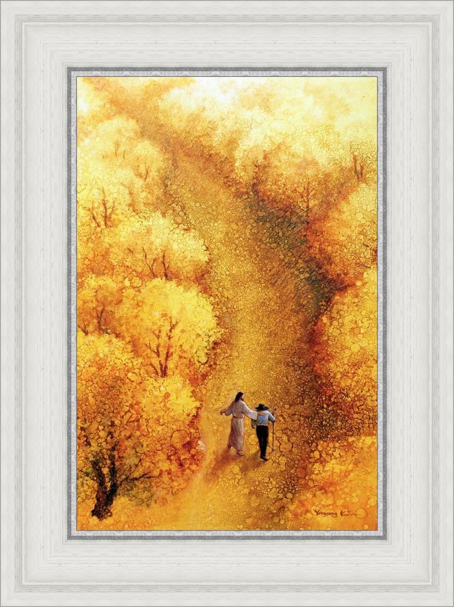 This painting portrays Jesus walking alongside a man through a peaceful path lined with golden yellow trees. It exudes a sense of calm and companionship, as Jesus compassionately walks with the man, offering His comfort and guidance. The man, leaning on a cane, walks with a measured step, his posture reflecting both the weight of his journey and the quiet assurance he finds in the Savior’s presence. The contrast between the man’s cane and Jesus’ gentle, yet firm, presence symbolizes the strength found in divine companionship. By Your Side captures the intimate, personal relationship between Jesus and His followers, reminding us that, no matter the journey, He walks with us—always by our side—offering His love, strength, and support.