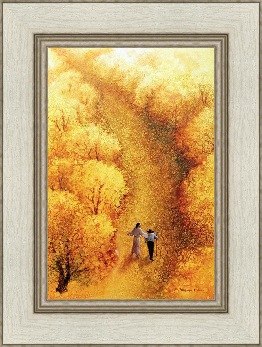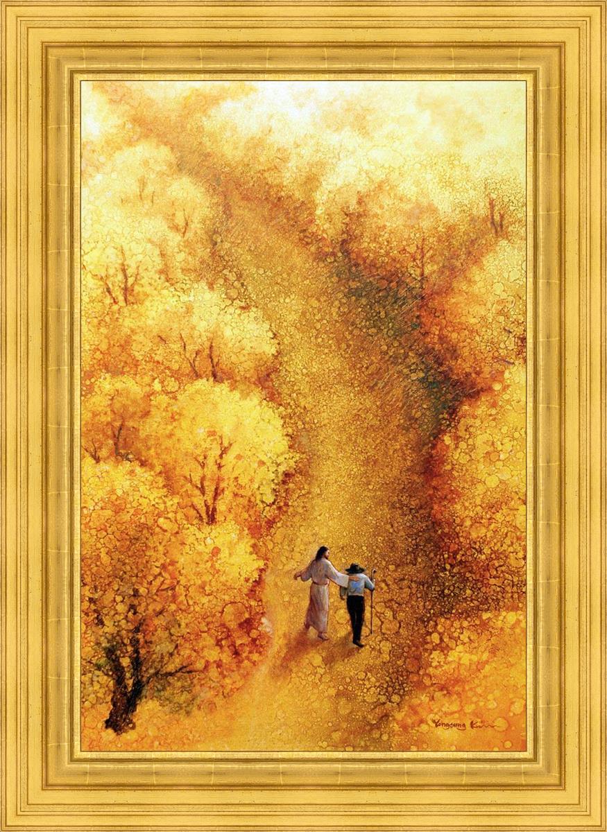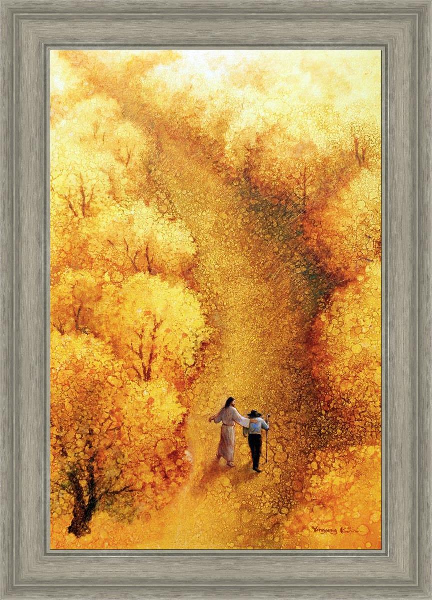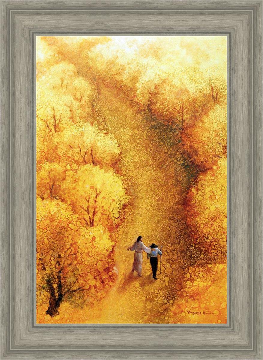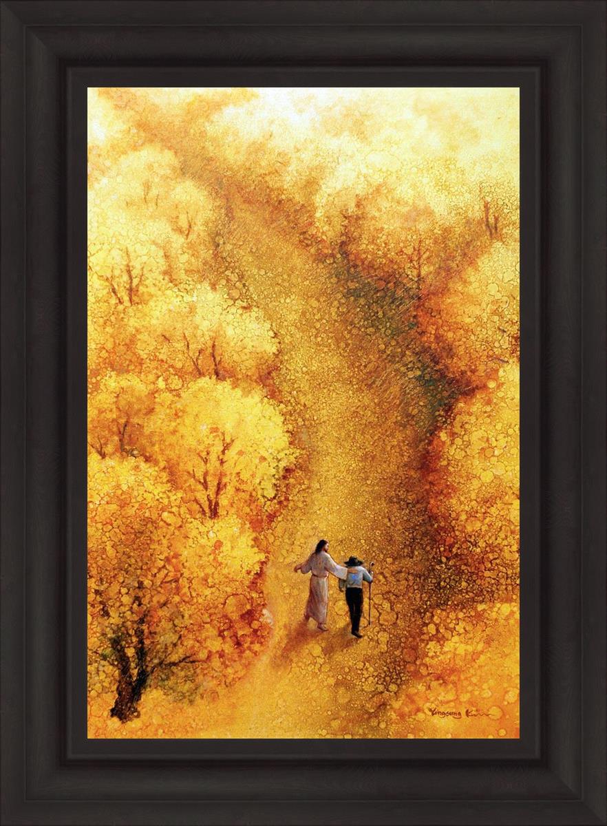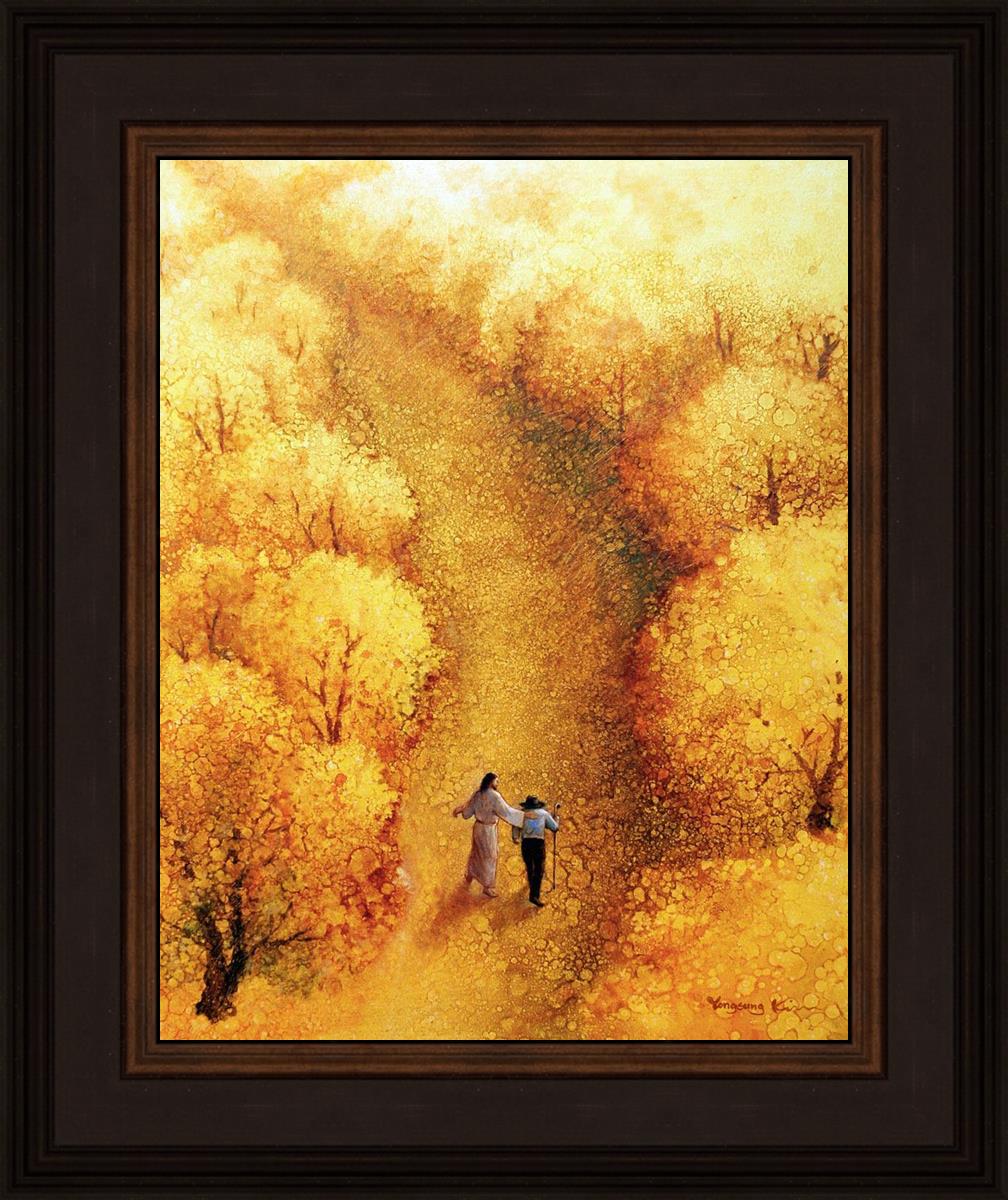 This painting portrays Jesus walking alongside a man through a peaceful path lined with golden yellow trees. It exudes a sense of calm and companionship, as Jesus compassionately walks with the man, offering His comfort and guidance. The man, leaning on a cane, walks with a measured step, his posture reflecting both the weight of his journey and the quiet assurance he finds in the Savior’s presence. The contrast between the man’s cane and Jesus’ gentle, yet firm, presence symbolizes the strength found in divine companionship. By Your Side captures the intimate, personal relationship between Jesus and His followers, reminding us that, no matter the journey, He walks with us—always by our side—offering His love, strength, and support.