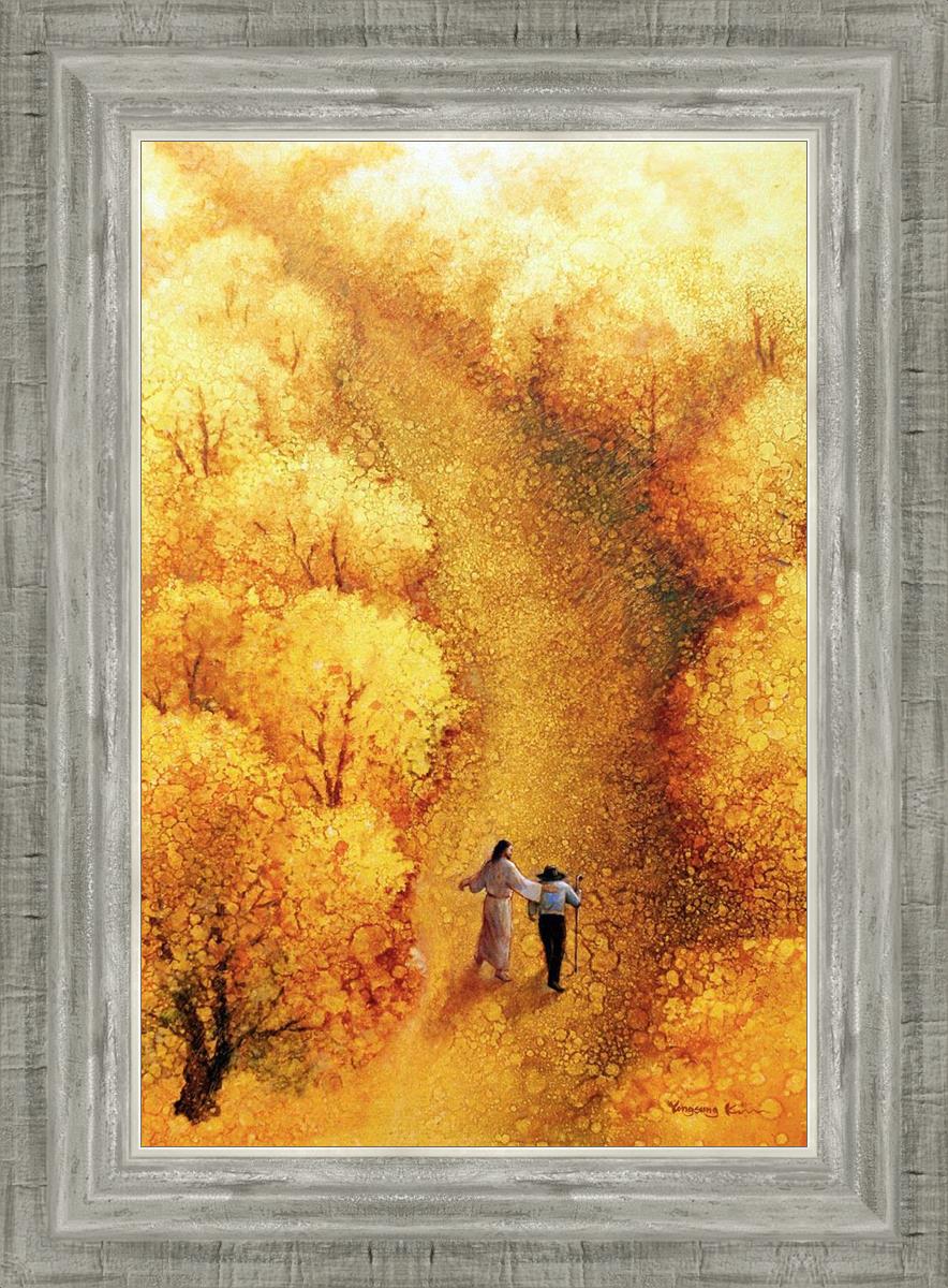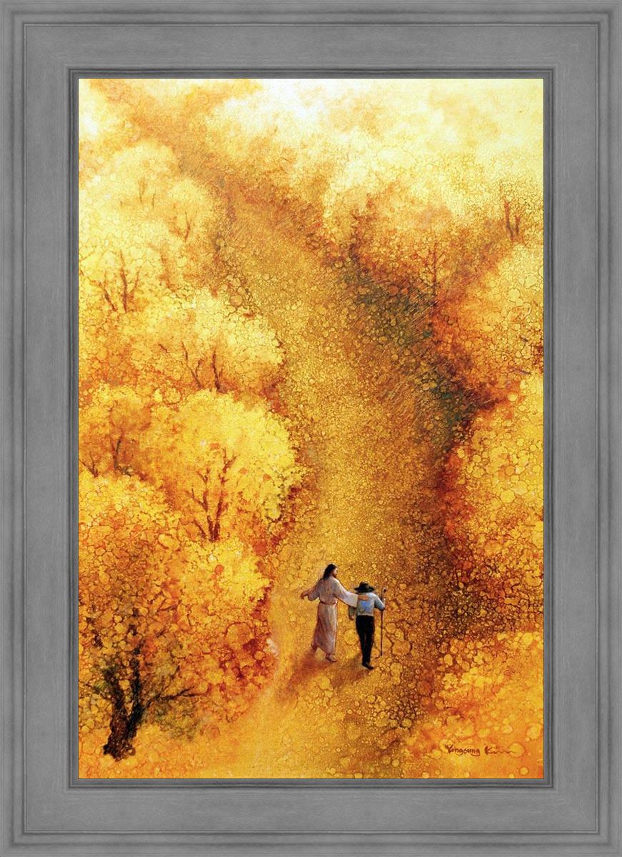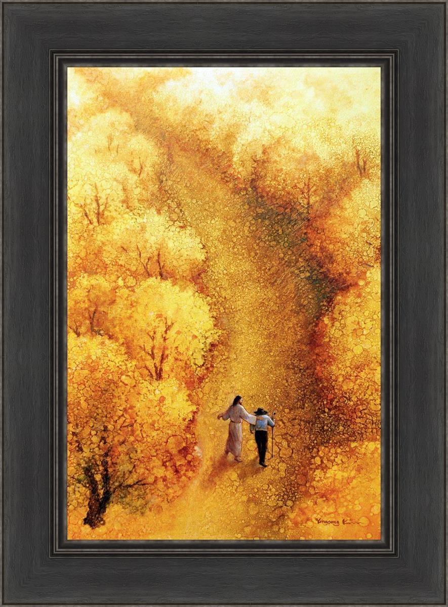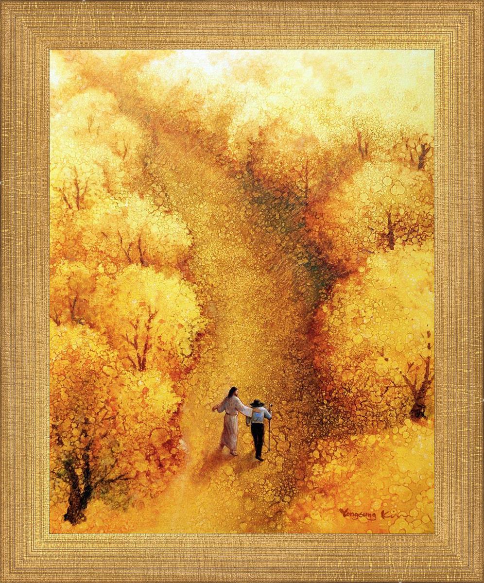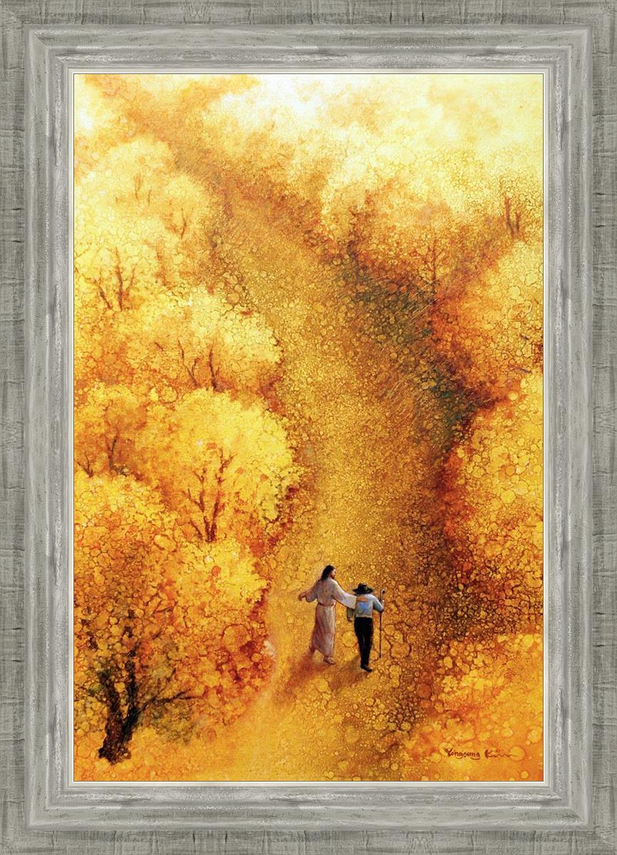 This painting portrays Jesus walking alongside a man through a peaceful path lined with golden yellow trees. It exudes a sense of calm and companionship, as Jesus compassionately walks with the man, offering His comfort and guidance. The man, leaning on a cane, walks with a measured step, his posture reflecting both the weight of his journey and the quiet assurance he finds in the Savior’s presence. The contrast between the man’s cane and Jesus’ gentle, yet firm, presence symbolizes the strength found in divine companionship. By Your Side captures the intimate, personal relationship between Jesus and His followers, reminding us that, no matter the journey, He walks with us—always by our side—offering His love, strength, and support.