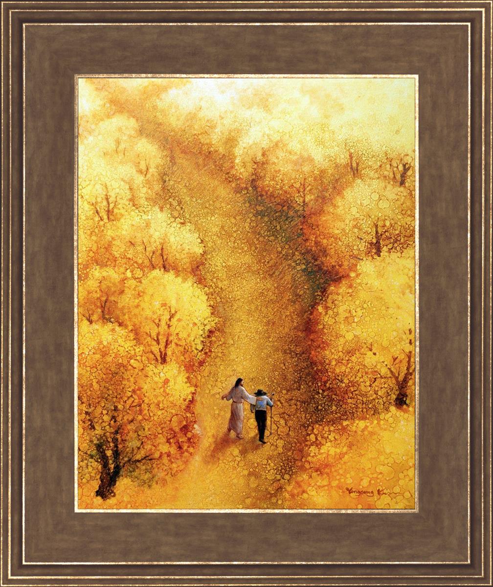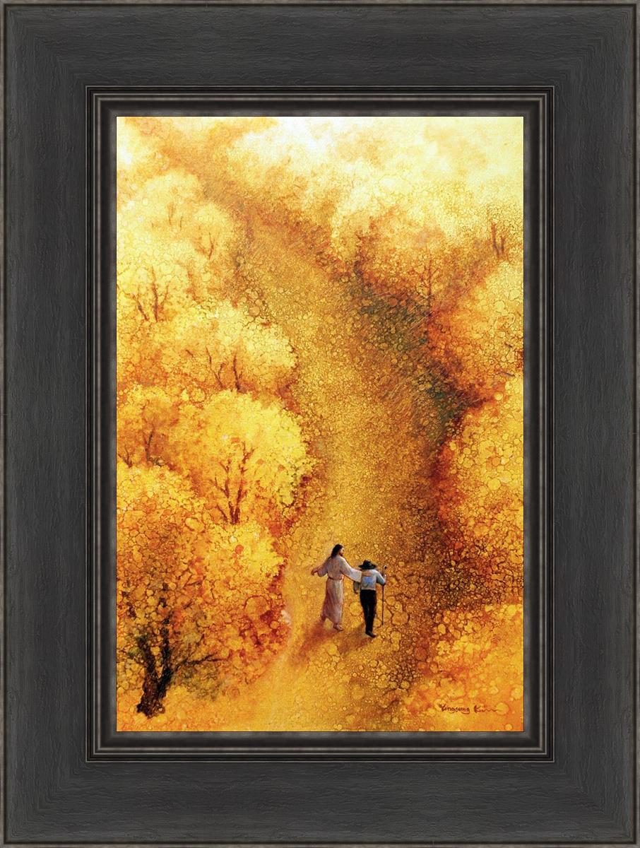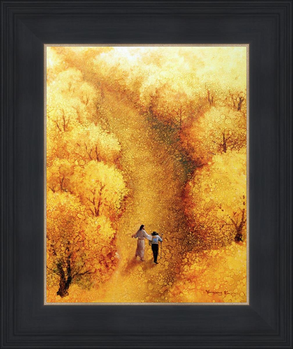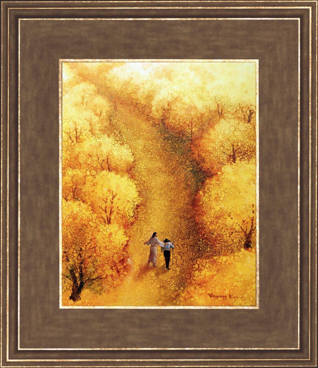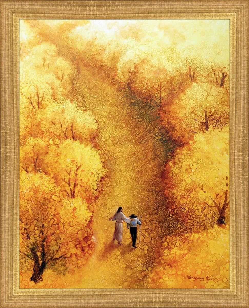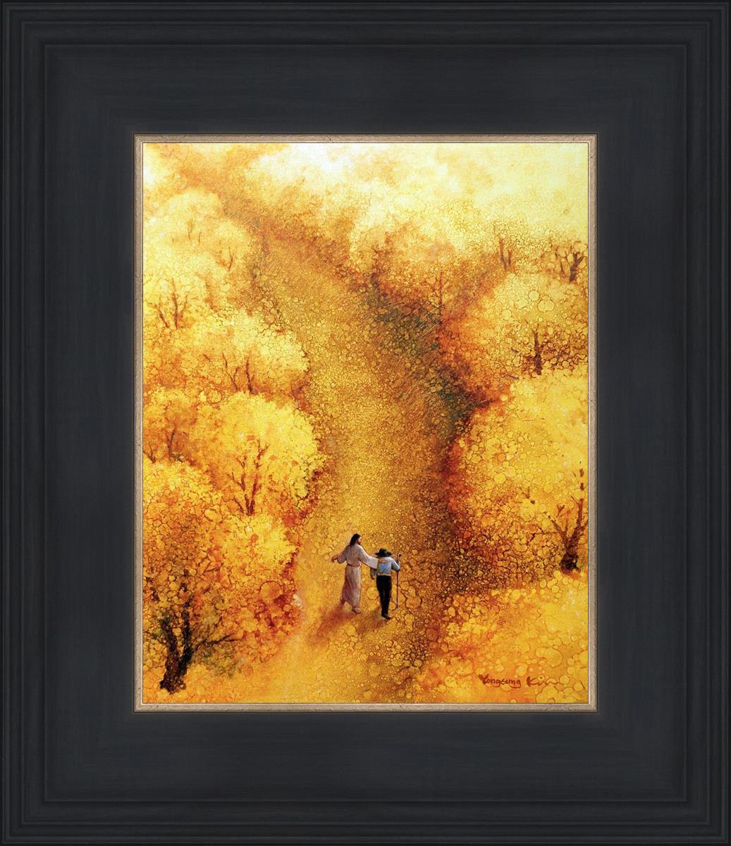 This painting portrays Jesus walking alongside a man through a peaceful path lined with golden yellow trees. It exudes a sense of calm and companionship, as Jesus compassionately walks with the man, offering His comfort and guidance. The man, leaning on a cane, walks with a measured step, his posture reflecting both the weight of his journey and the quiet assurance he finds in the Savior’s presence. The contrast between the man’s cane and Jesus’ gentle, yet firm, presence symbolizes the strength found in divine companionship. By Your Side captures the intimate, personal relationship between Jesus and His followers, reminding us that, no matter the journey, He walks with us—always by our side—offering His love, strength, and support.