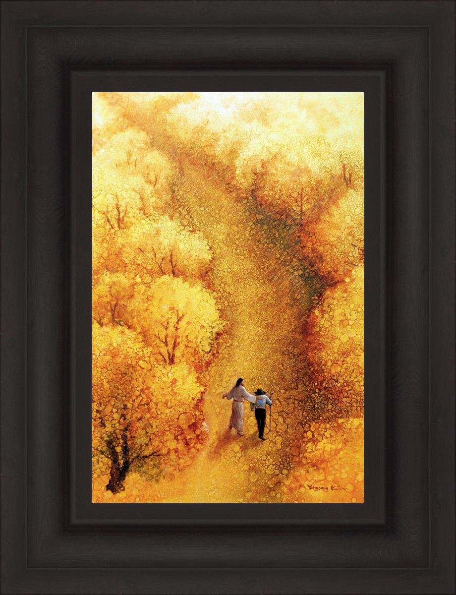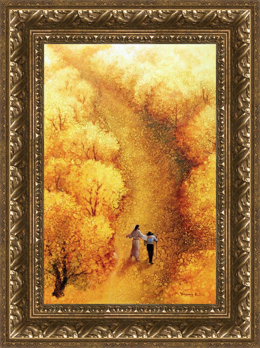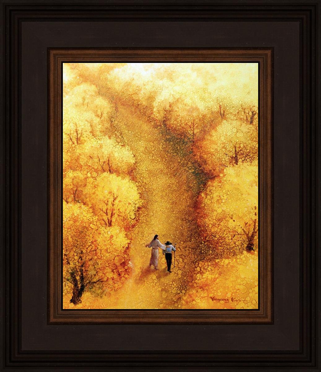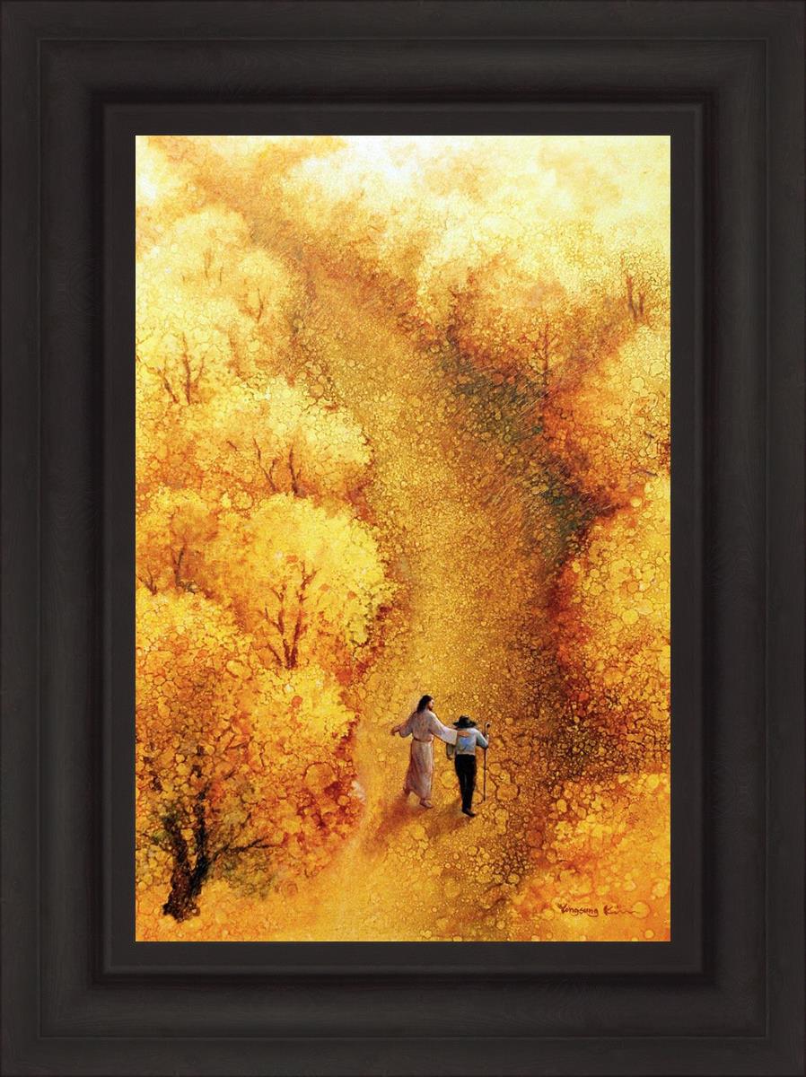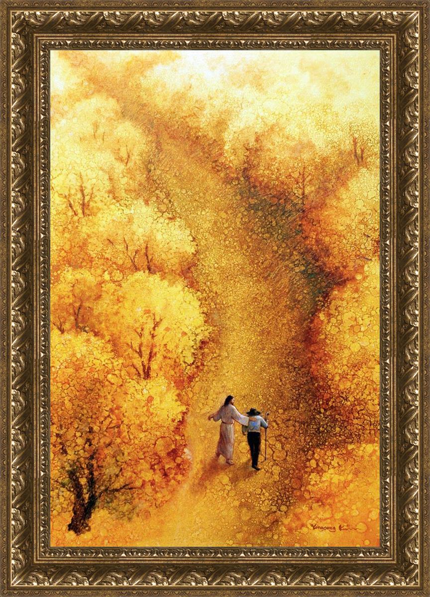 This painting portrays Jesus walking alongside a man through a peaceful path lined with golden yellow trees. It exudes a sense of calm and companionship, as Jesus compassionately walks with the man, offering His comfort and guidance. The man, leaning on a cane, walks with a measured step, his posture reflecting both the weight of his journey and the quiet assurance he finds in the Savior’s presence. The contrast between the man’s cane and Jesus’ gentle, yet firm, presence symbolizes the strength found in divine companionship. By Your Side captures the intimate, personal relationship between Jesus and His followers, reminding us that, no matter the journey, He walks with us—always by our side—offering His love, strength, and support.