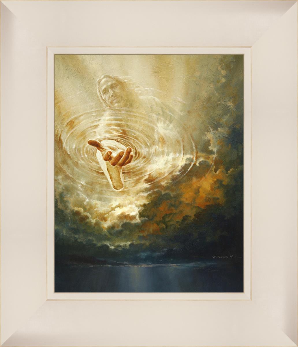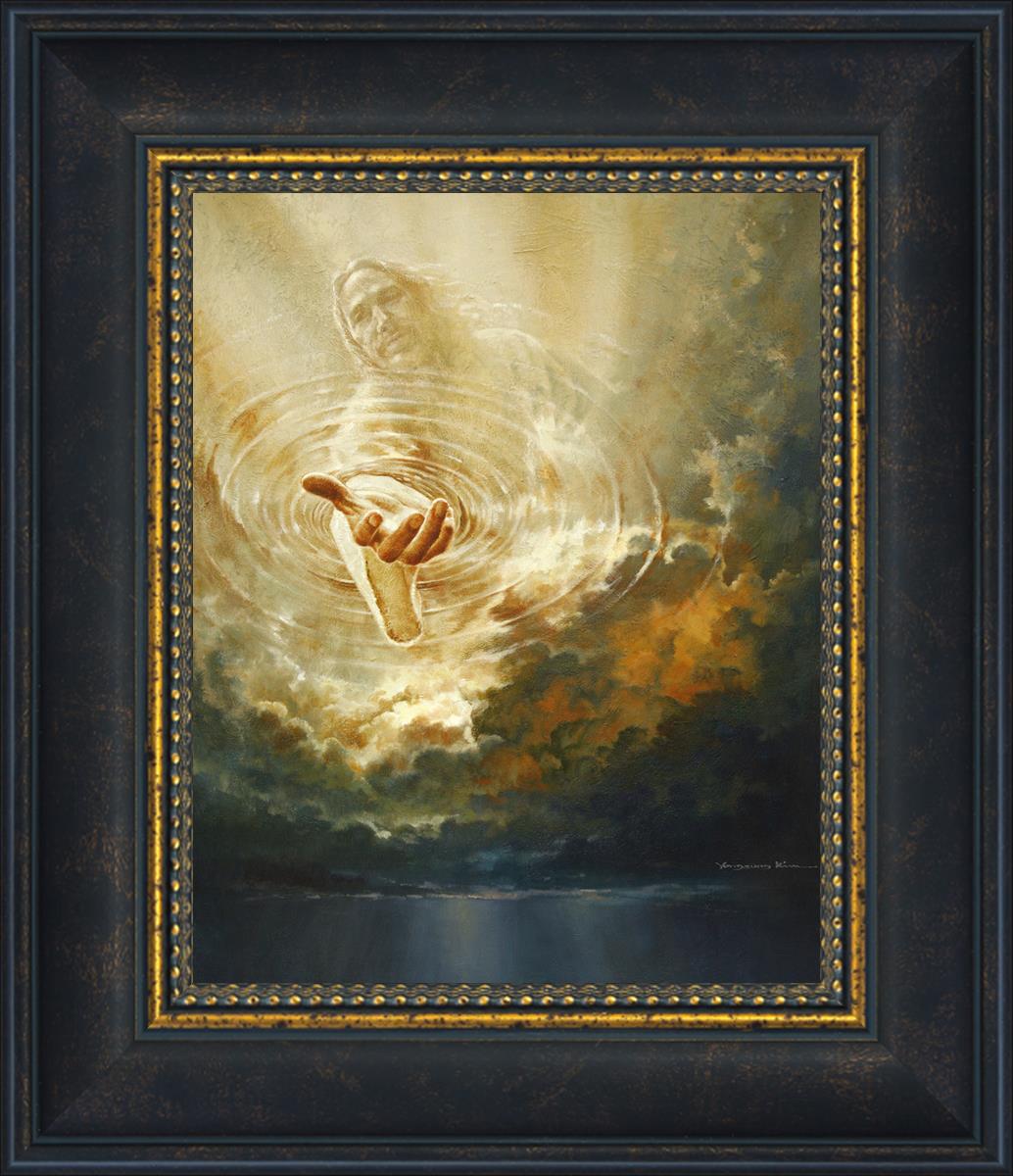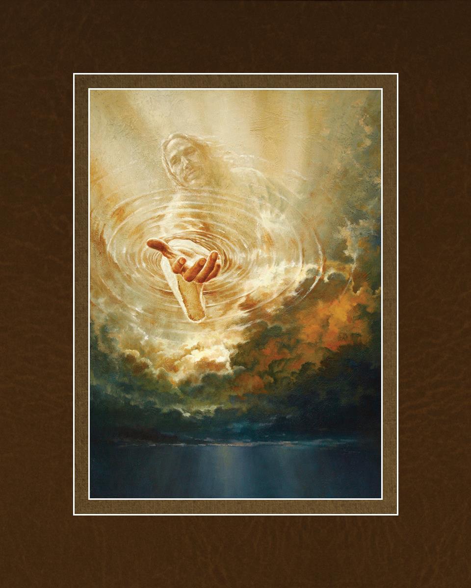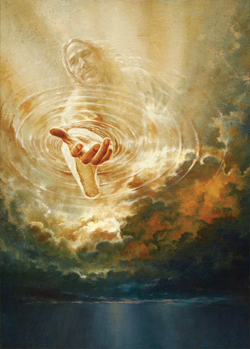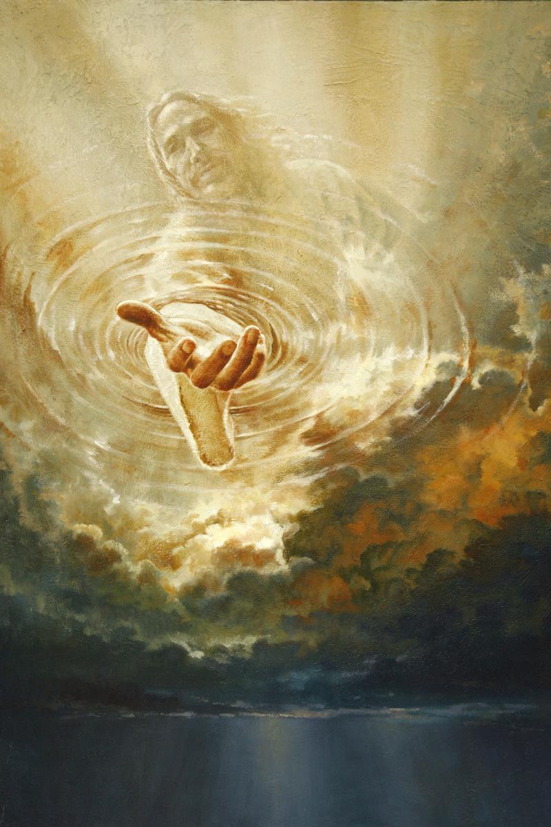 This painting captures a moment of divine intervention, where the Savior is portrayed with one hand reaching down from heaven through thick clouds. His hand seems to beckon or offer comfort to those below, a symbol of grace and salvation. The dark clouds surrounding Jesus create a contrast, heightening the sense of mystery and awe, as if the heavens themselves are opening in response to a call. Calling evokes a powerful feeling of hope, inviting the viewer to reflect the promise of His presence and guidance in times of uncertainty.