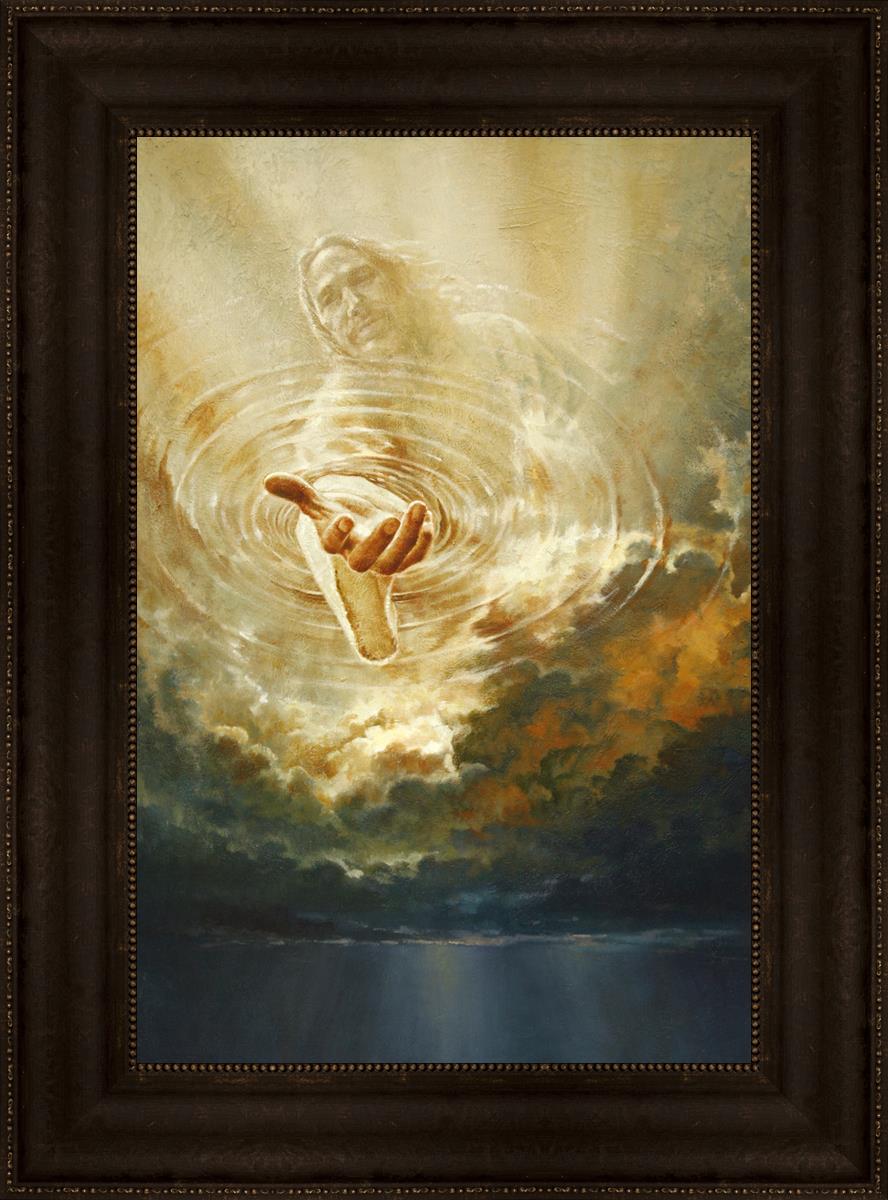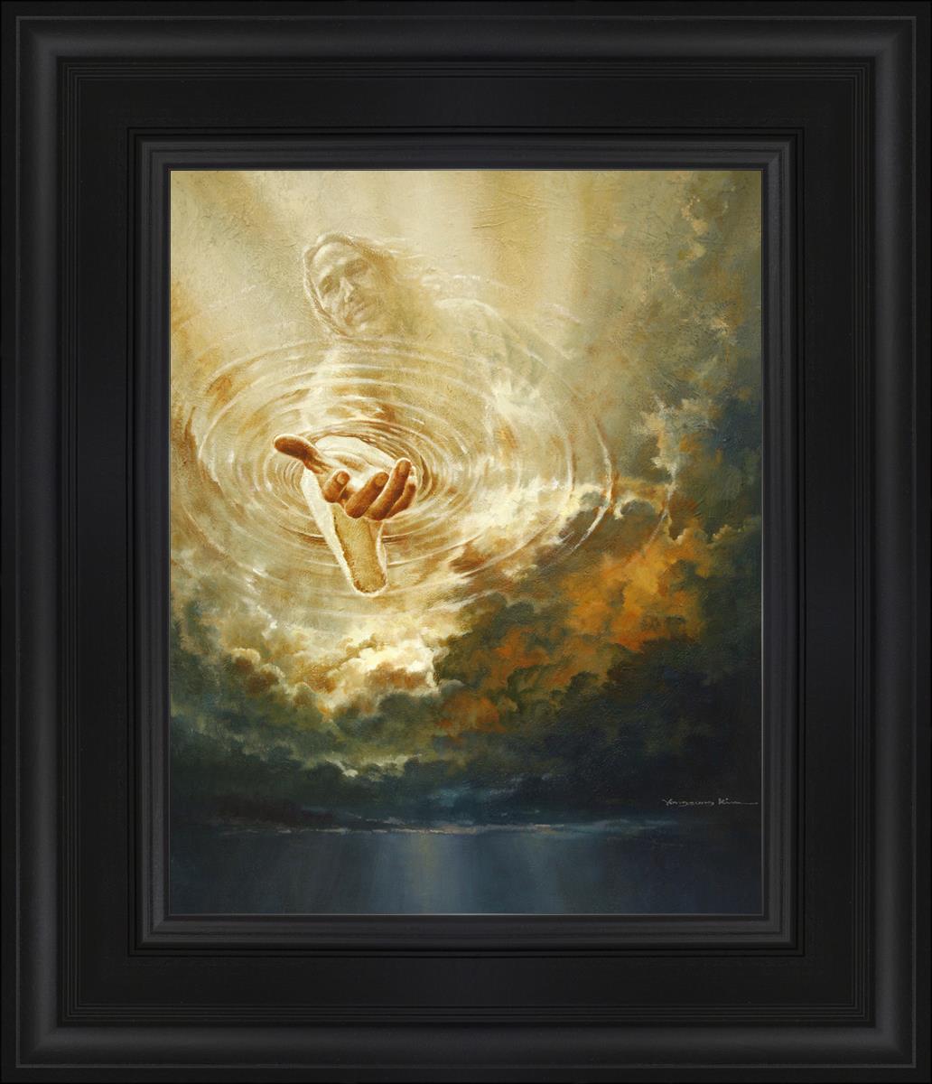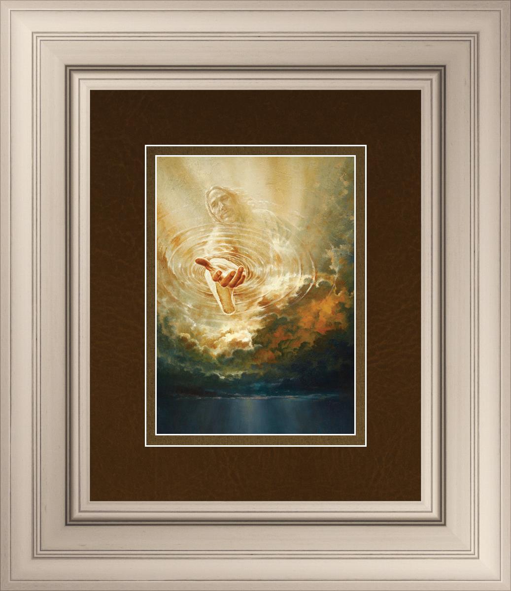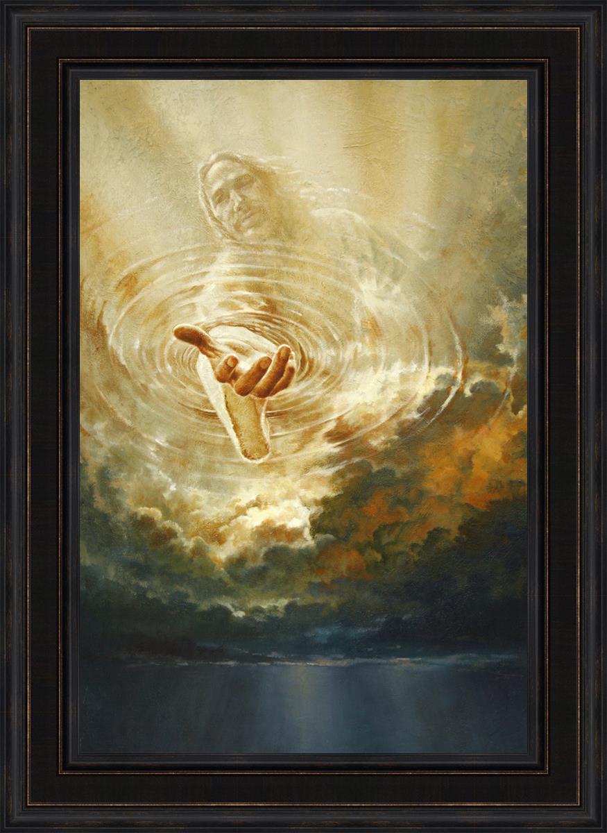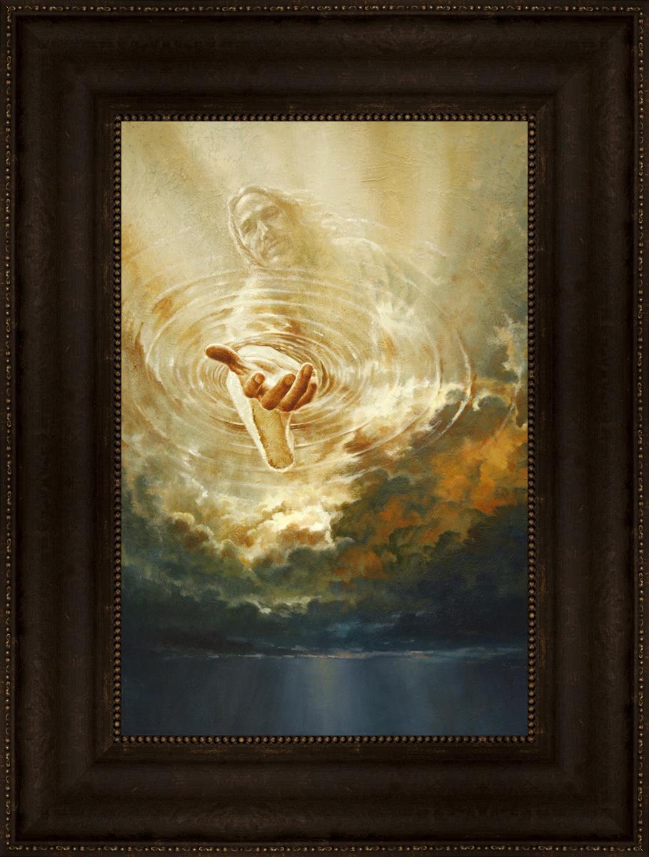 This painting captures a moment of divine intervention, where the Savior is portrayed with one hand reaching down from heaven through thick clouds. His hand seems to beckon or offer comfort to those below, a symbol of grace and salvation. The dark clouds surrounding Jesus create a contrast, heightening the sense of mystery and awe, as if the heavens themselves are opening in response to a call. Calling evokes a powerful feeling of hope, inviting the viewer to reflect the promise of His presence and guidance in times of uncertainty.