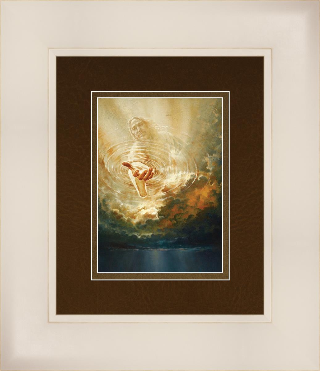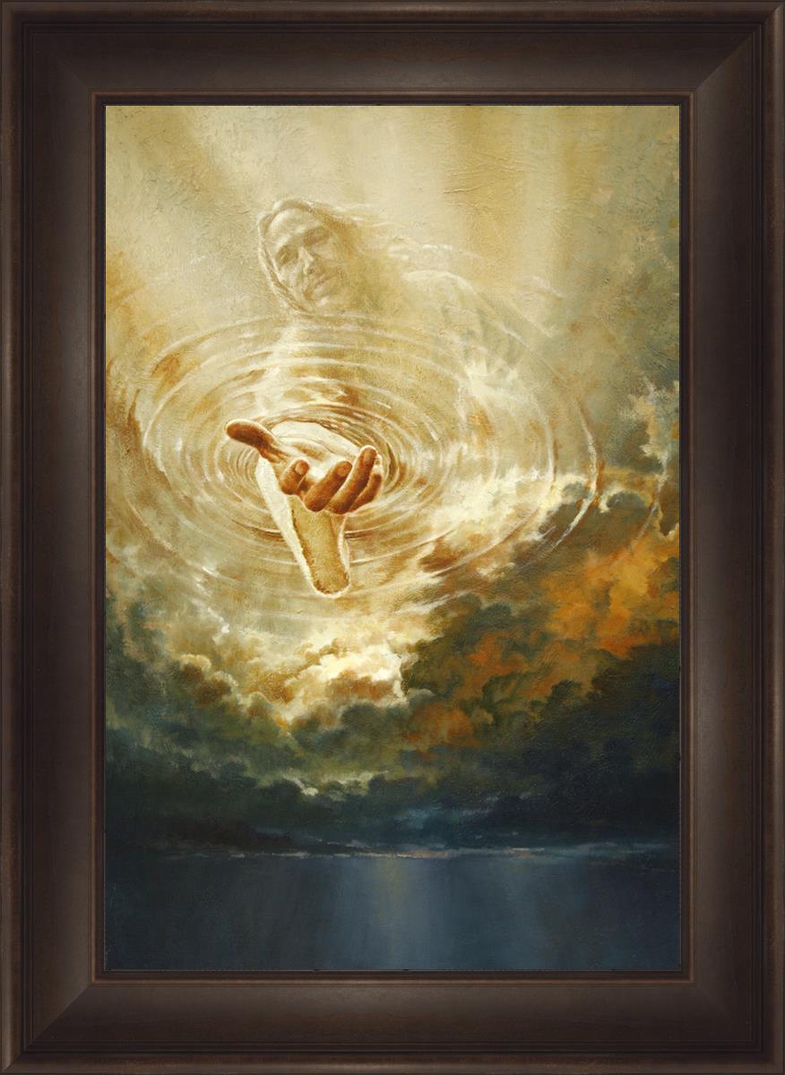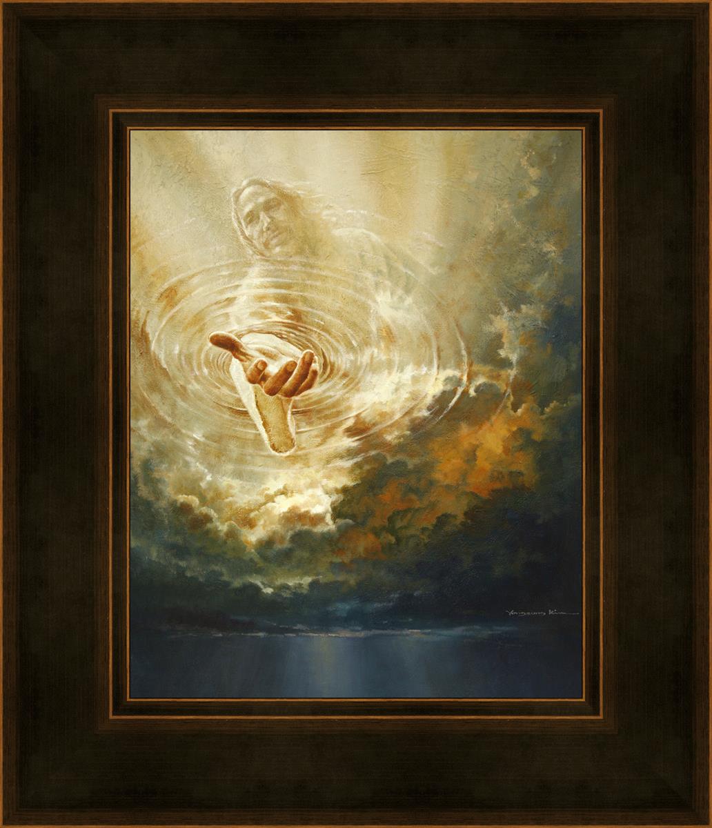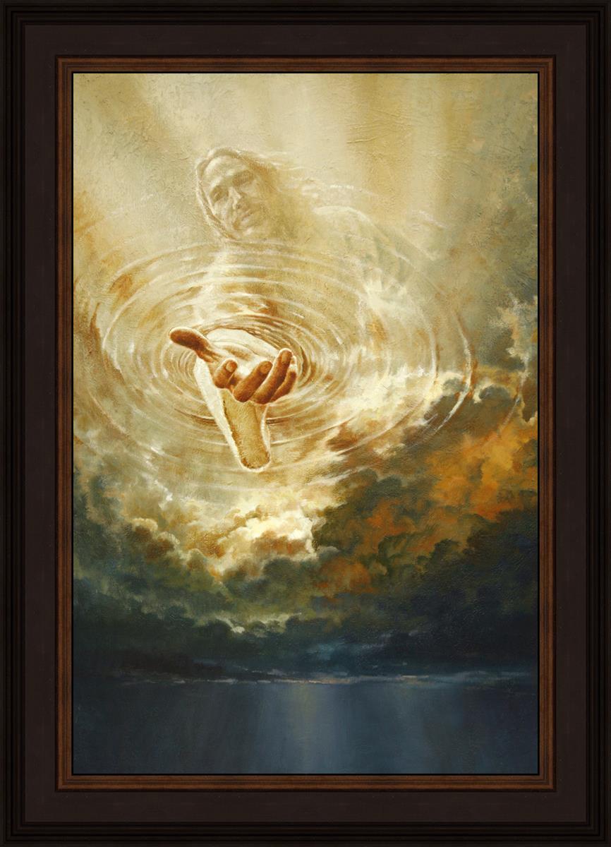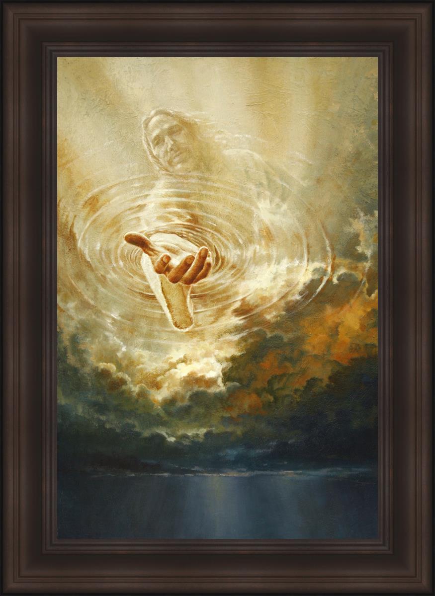 This painting captures a moment of divine intervention, where the Savior is portrayed with one hand reaching down from heaven through thick clouds. His hand seems to beckon or offer comfort to those below, a symbol of grace and salvation. The dark clouds surrounding Jesus create a contrast, heightening the sense of mystery and awe, as if the heavens themselves are opening in response to a call. Calling evokes a powerful feeling of hope, inviting the viewer to reflect the promise of His presence and guidance in times of uncertainty.