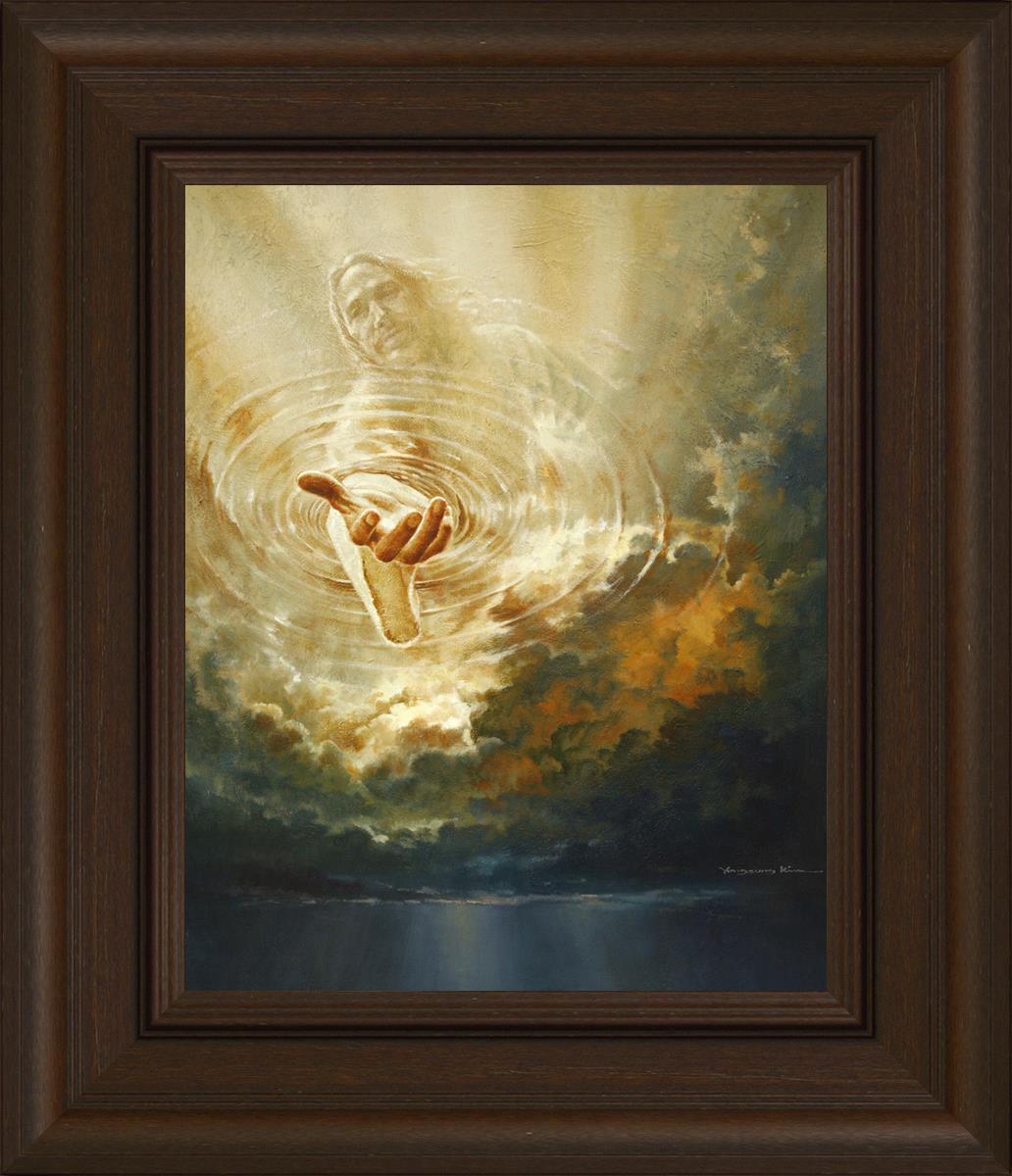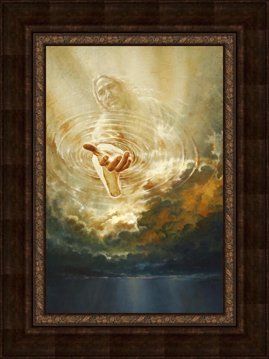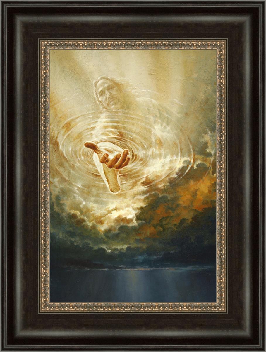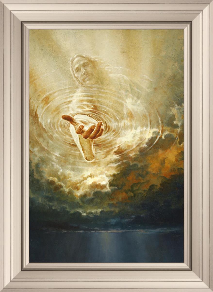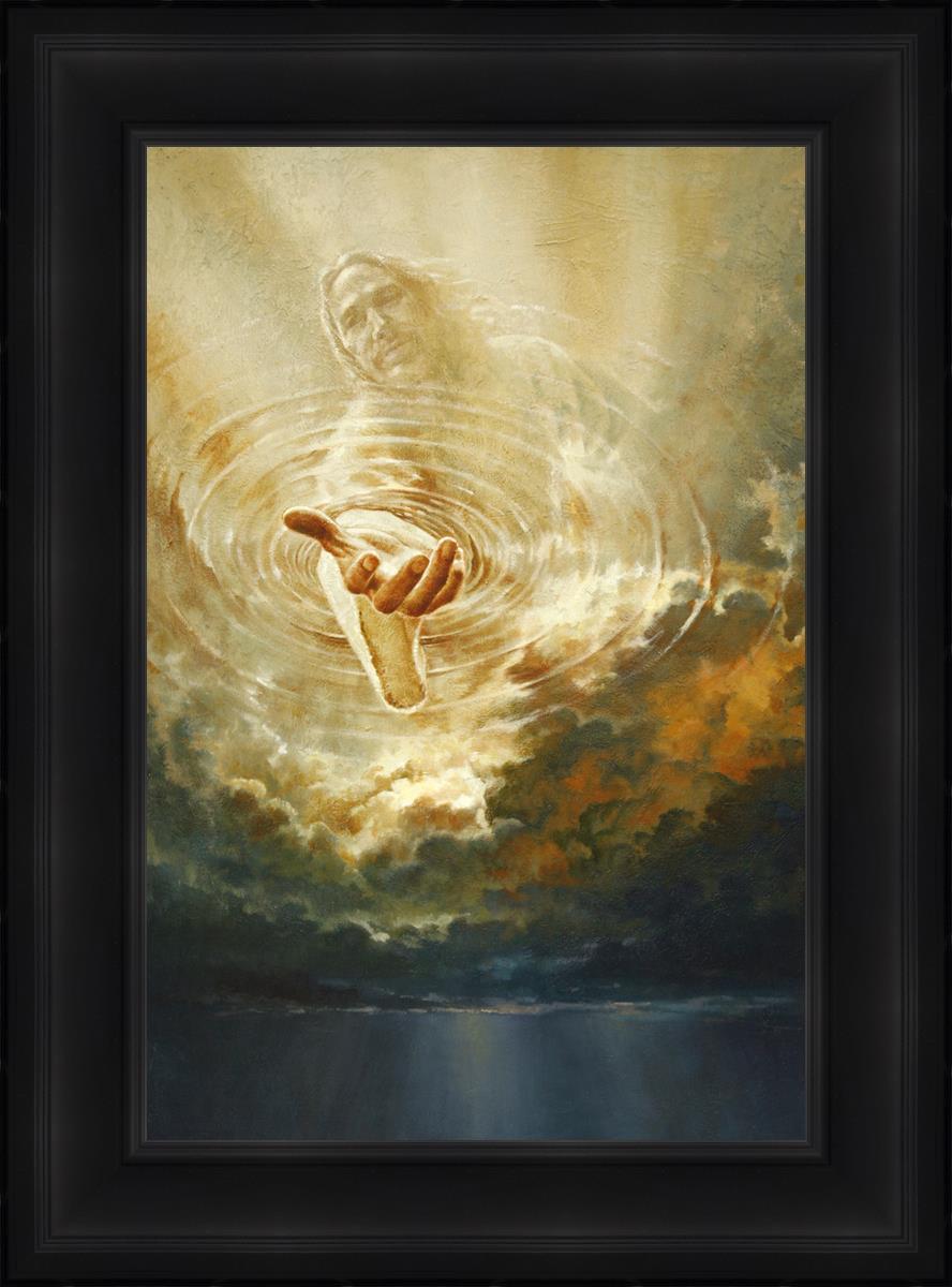 This painting captures a moment of divine intervention, where the Savior is portrayed with one hand reaching down from heaven through thick clouds. His hand seems to beckon or offer comfort to those below, a symbol of grace and salvation. The dark clouds surrounding Jesus create a contrast, heightening the sense of mystery and awe, as if the heavens themselves are opening in response to a call. Calling evokes a powerful feeling of hope, inviting the viewer to reflect the promise of His presence and guidance in times of uncertainty.