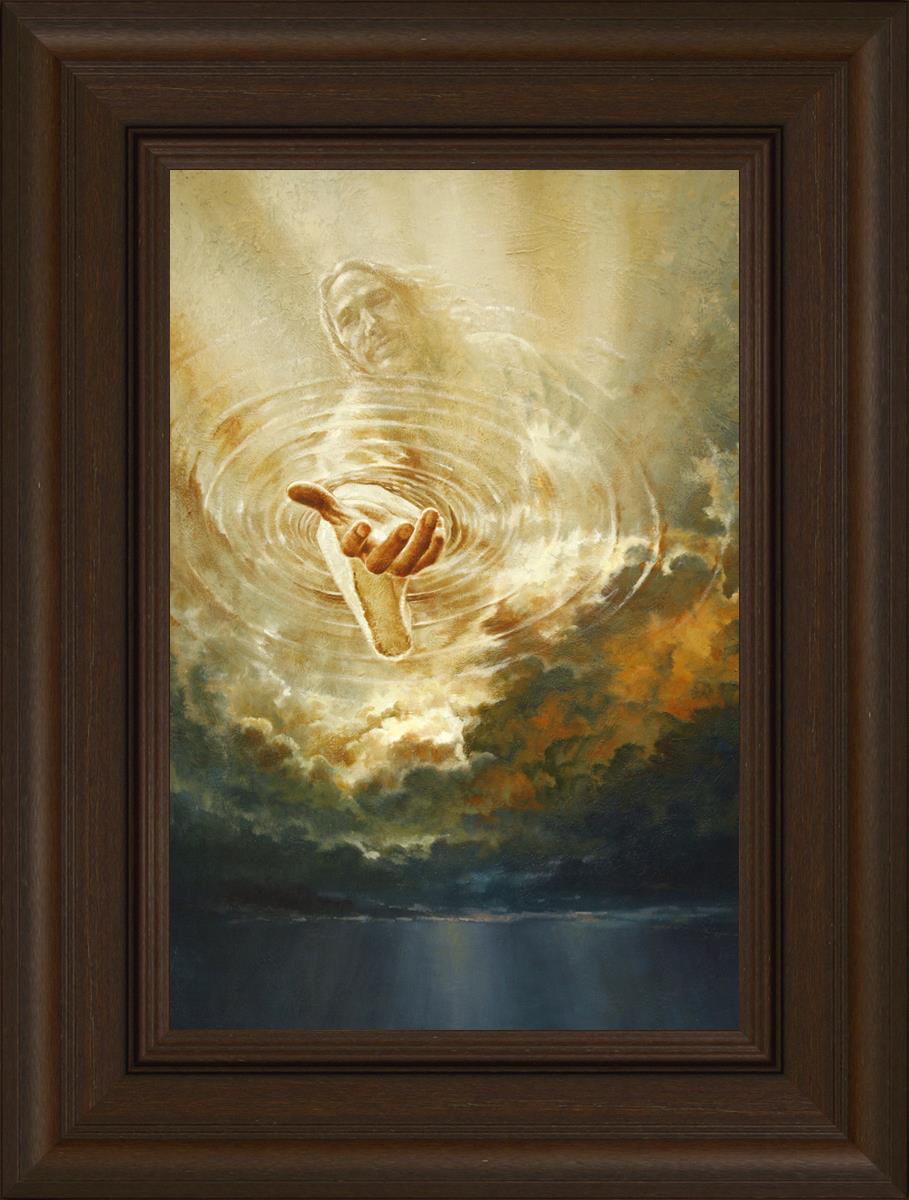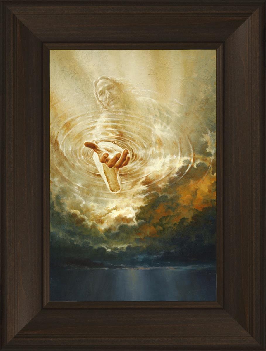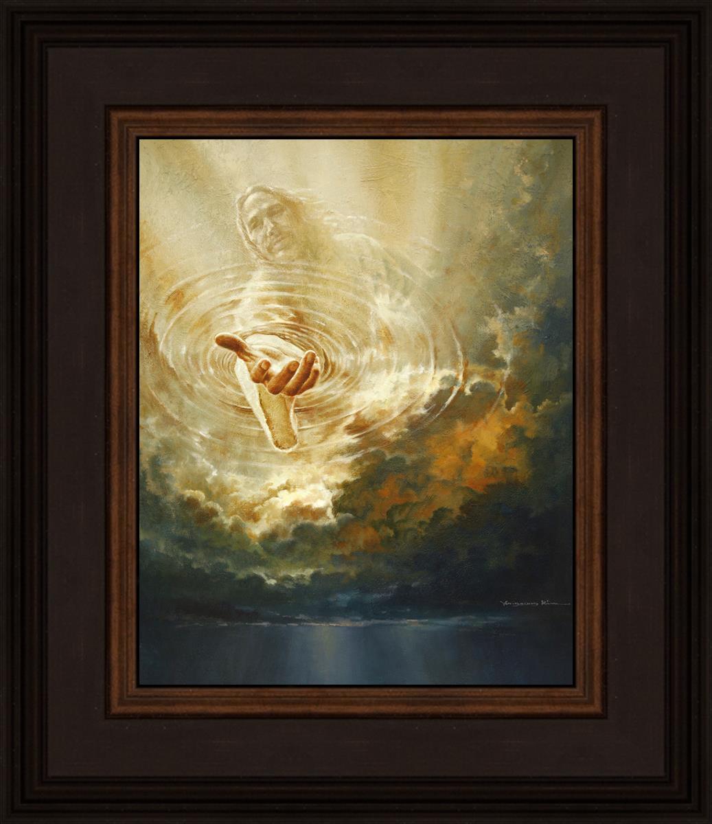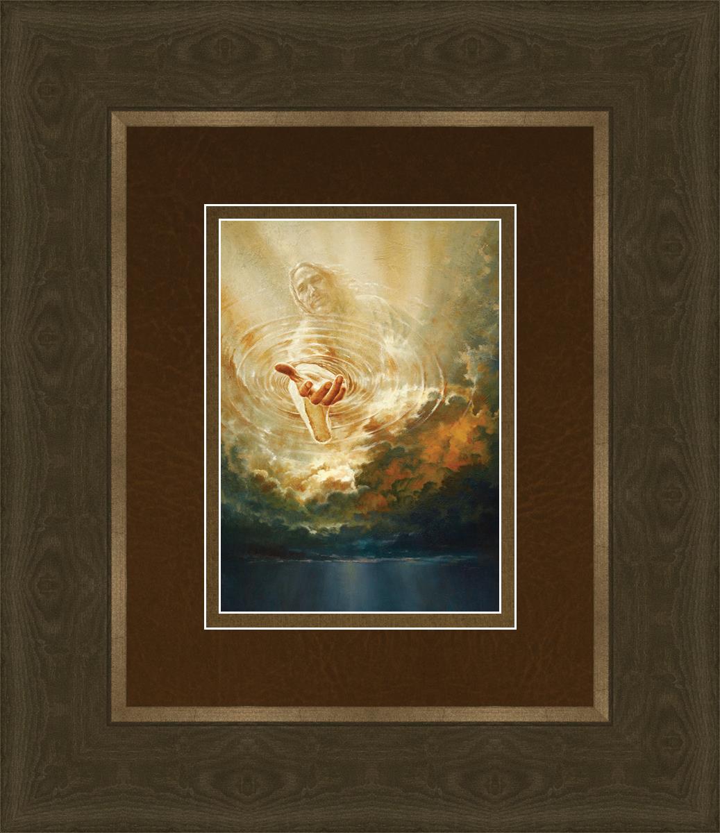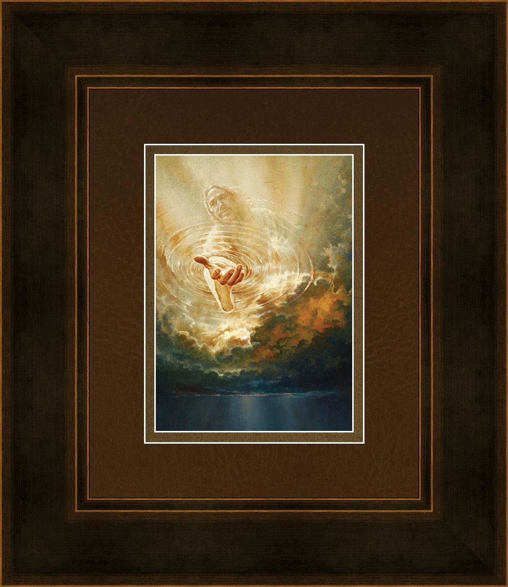 This painting captures a moment of divine intervention, where the Savior is portrayed with one hand reaching down from heaven through thick clouds. His hand seems to beckon or offer comfort to those below, a symbol of grace and salvation. The dark clouds surrounding Jesus create a contrast, heightening the sense of mystery and awe, as if the heavens themselves are opening in response to a call. Calling evokes a powerful feeling of hope, inviting the viewer to reflect the promise of His presence and guidance in times of uncertainty.