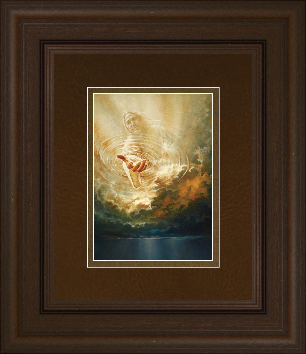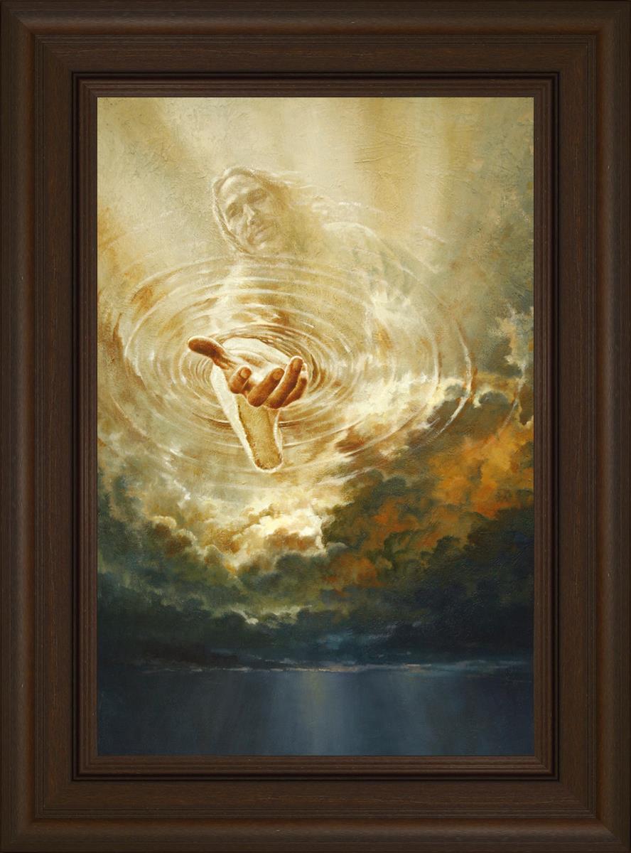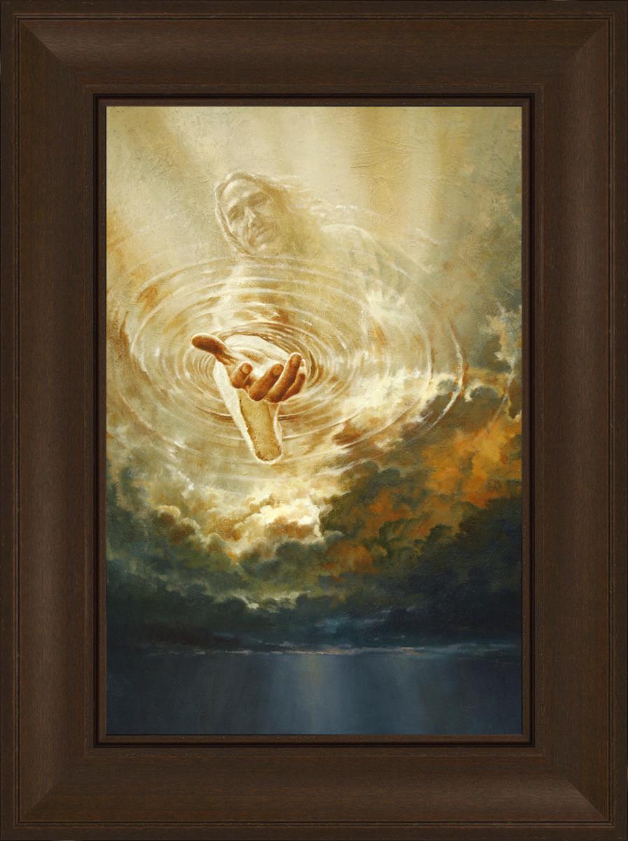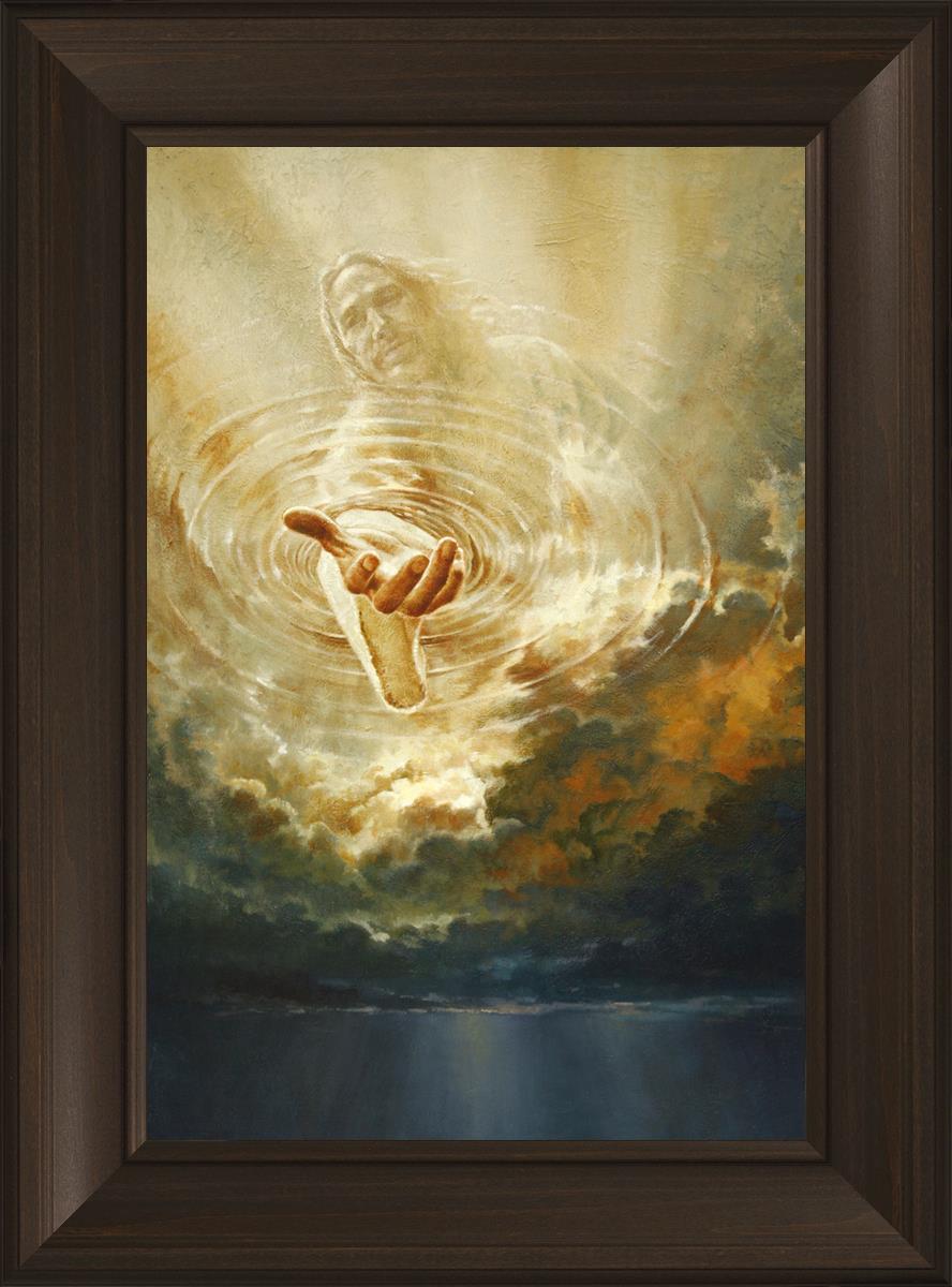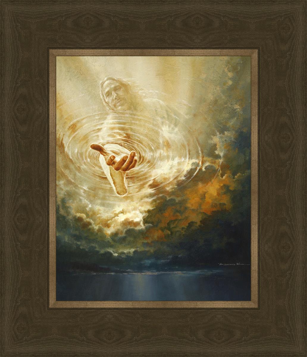 This painting captures a moment of divine intervention, where the Savior is portrayed with one hand reaching down from heaven through thick clouds. His hand seems to beckon or offer comfort to those below, a symbol of grace and salvation. The dark clouds surrounding Jesus create a contrast, heightening the sense of mystery and awe, as if the heavens themselves are opening in response to a call. Calling evokes a powerful feeling of hope, inviting the viewer to reflect the promise of His presence and guidance in times of uncertainty.