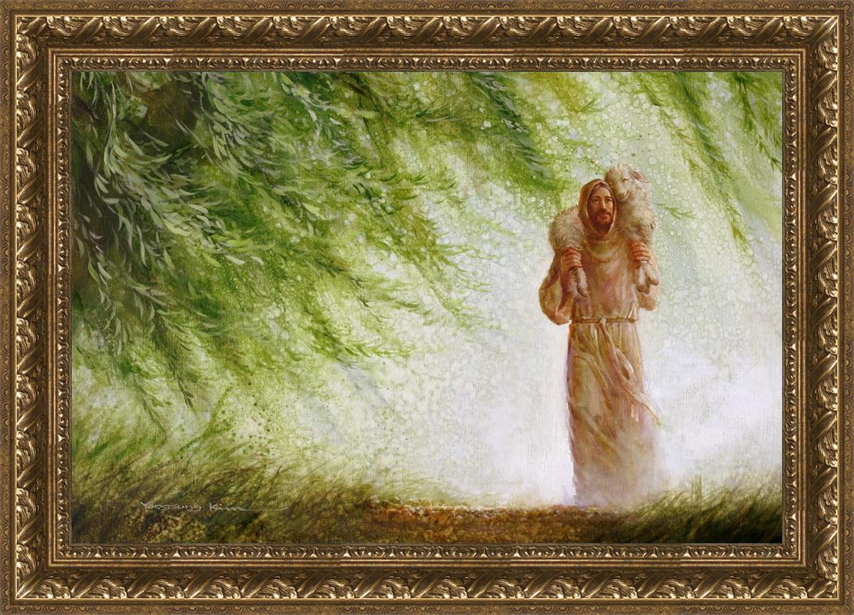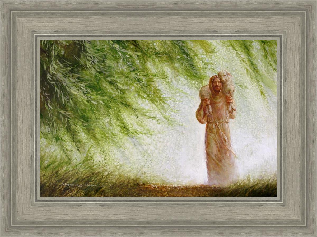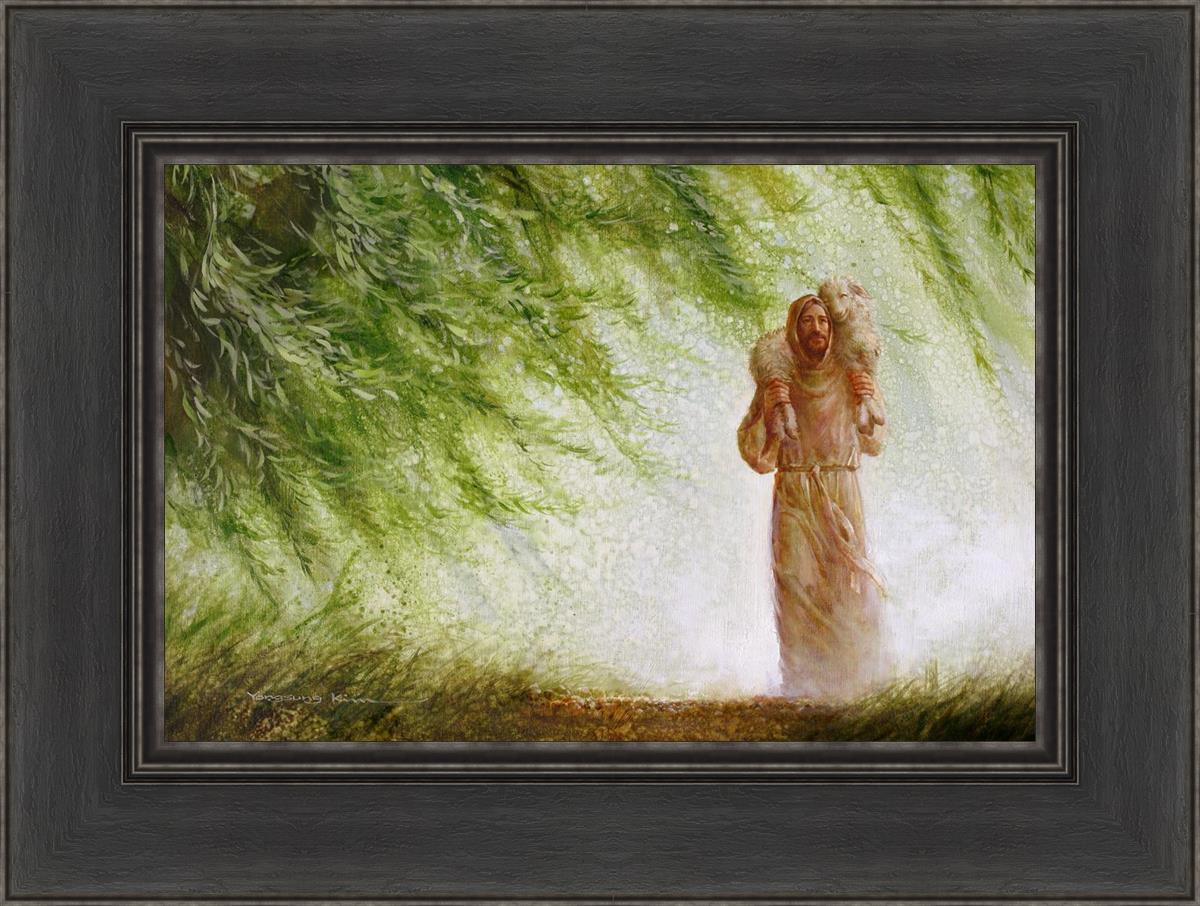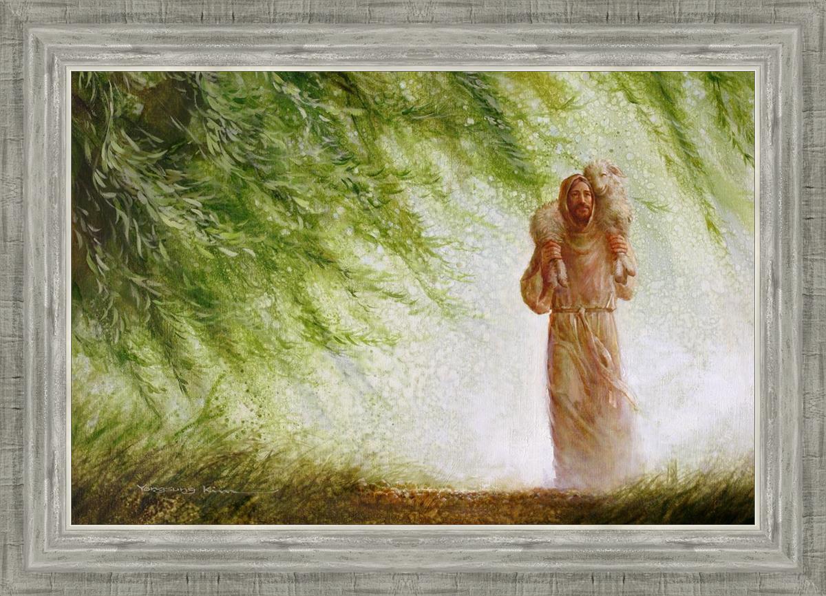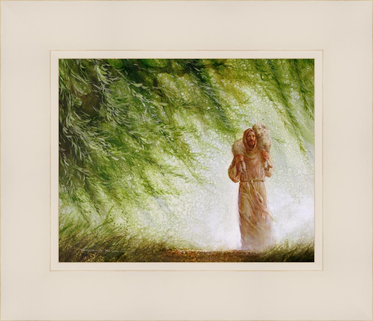 This painting powerfully captures a moment of protection and care, as Jesus Christ carries a lamb on His shoulders. The lamb represents the lost, the weary, and the broken, finding refuge in His embrace. Christ carrying the lamb on His shoulders serves as a visual metaphor for divine love and the promise that no one is ever too lost to be found. Carry On invites the viewer to reflect on the Savior's enduring presence and His loving support in times of difficulty, offering a message of hope, strength, and grace.