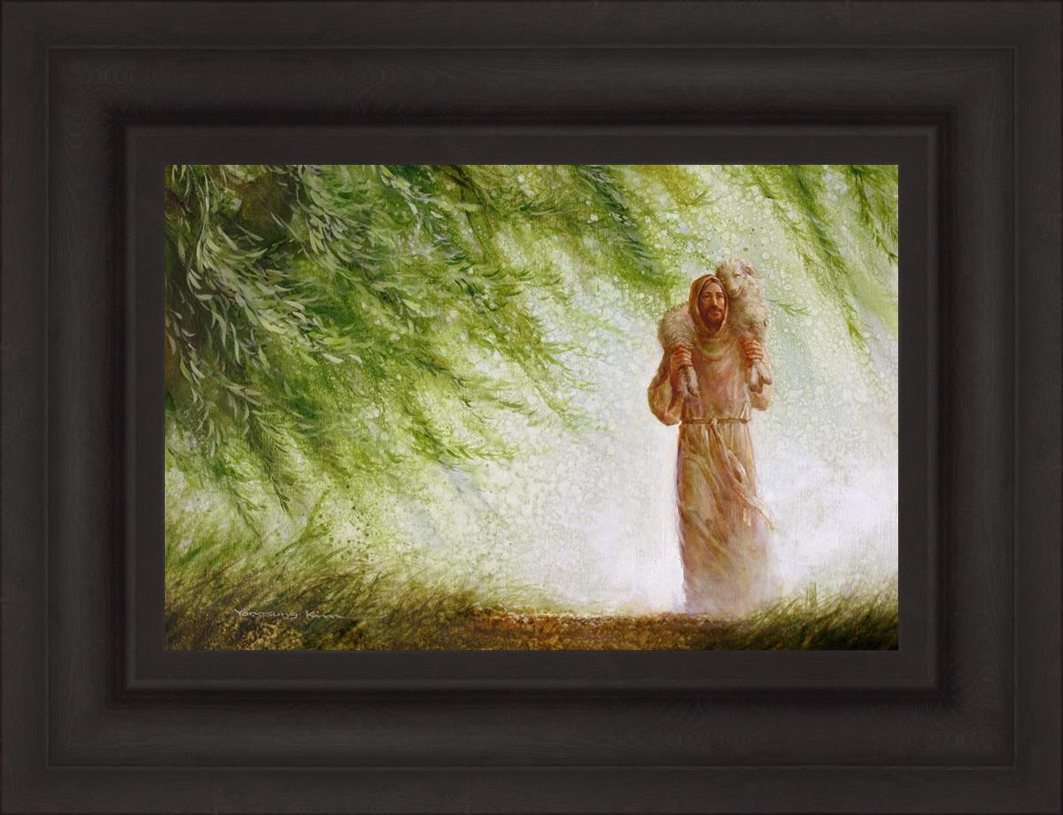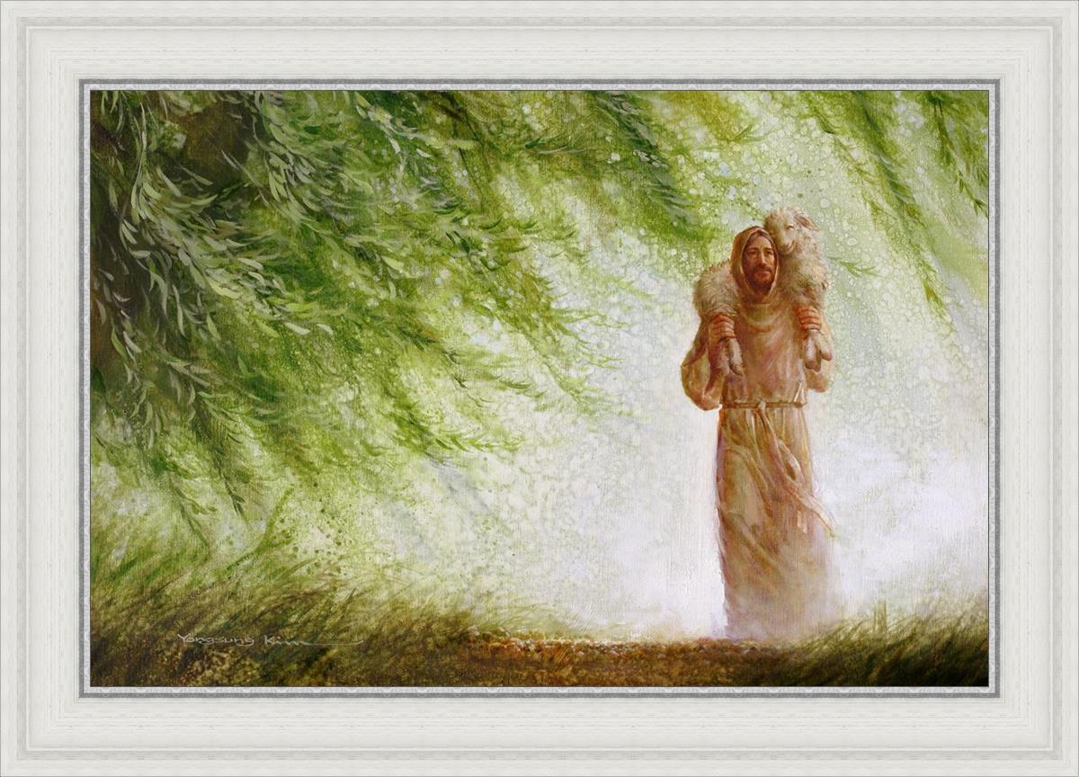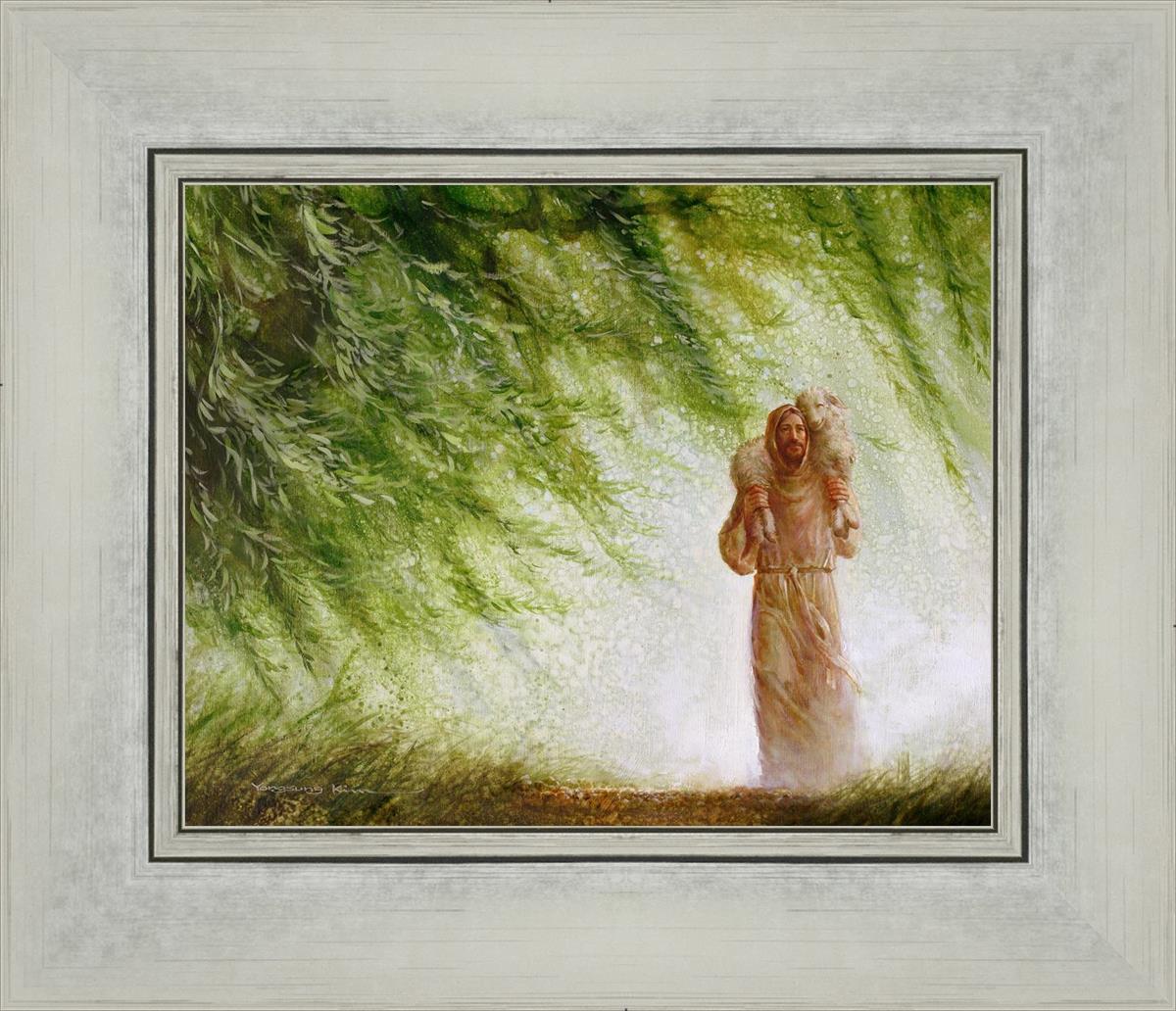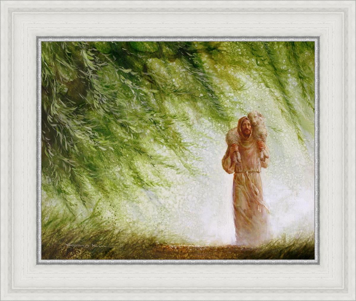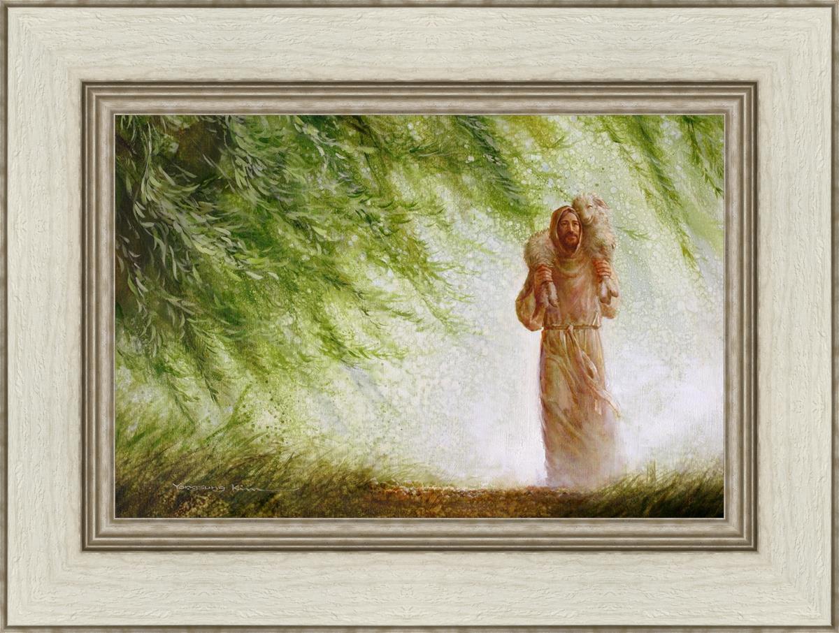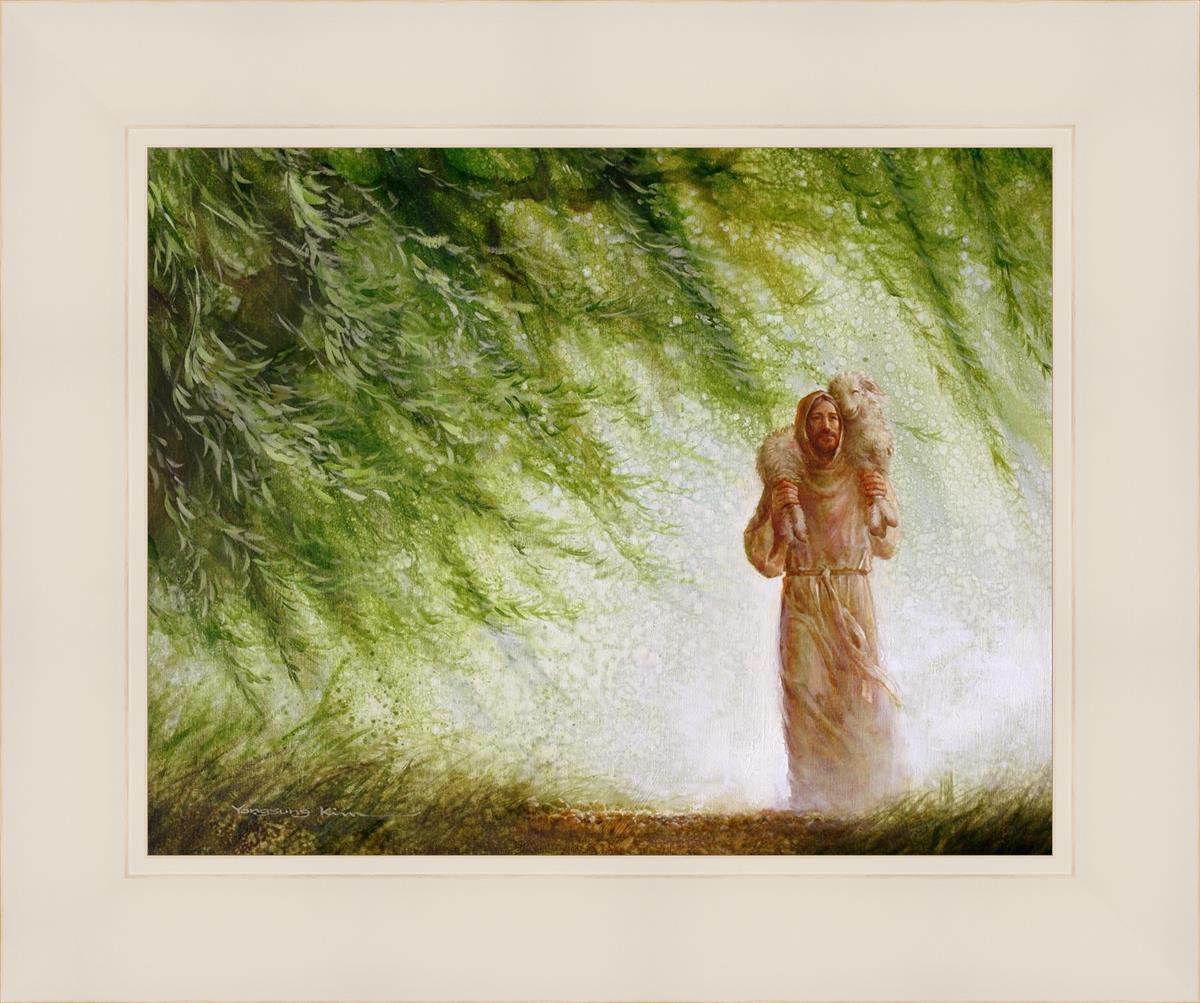 This painting powerfully captures a moment of protection and care, as Jesus Christ carries a lamb on His shoulders. The lamb represents the lost, the weary, and the broken, finding refuge in His embrace. Christ carrying the lamb on His shoulders serves as a visual metaphor for divine love and the promise that no one is ever too lost to be found. Carry On invites the viewer to reflect on the Savior's enduring presence and His loving support in times of difficulty, offering a message of hope, strength, and grace.