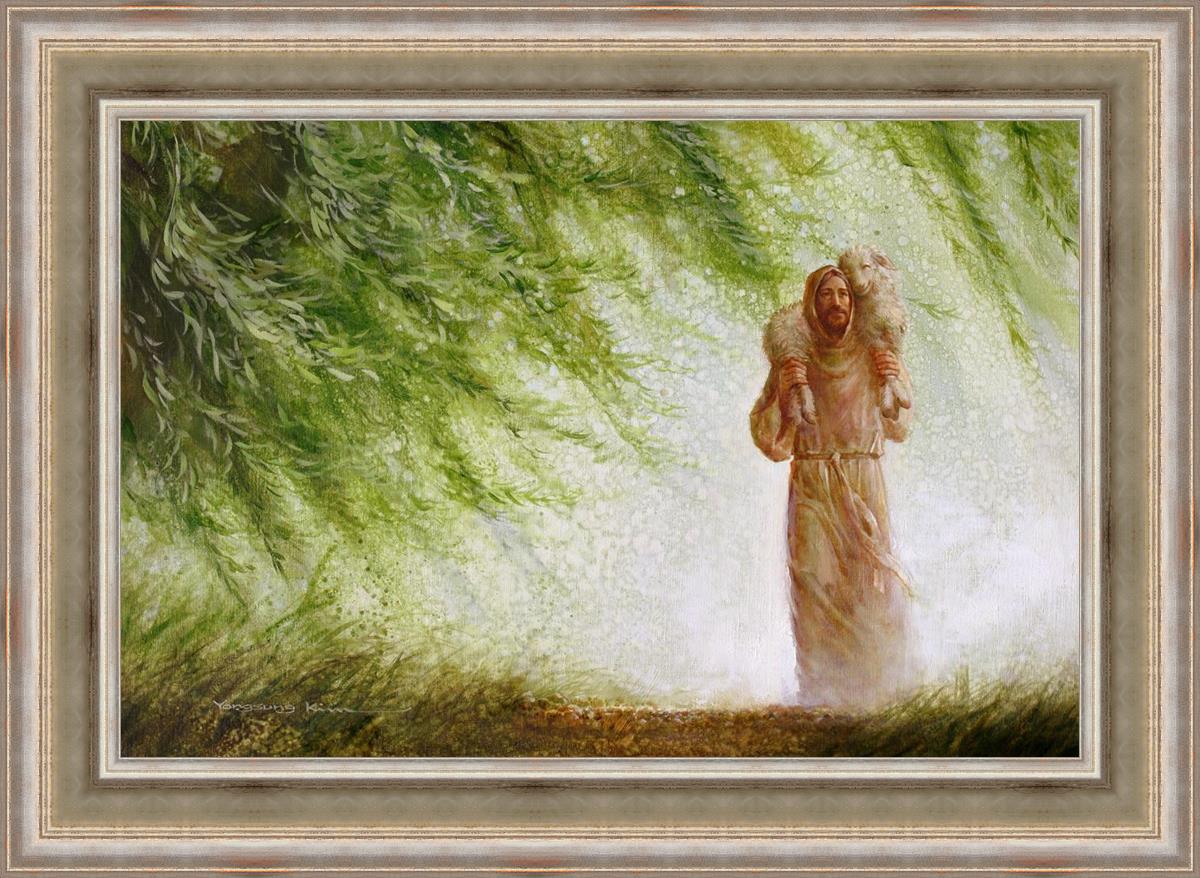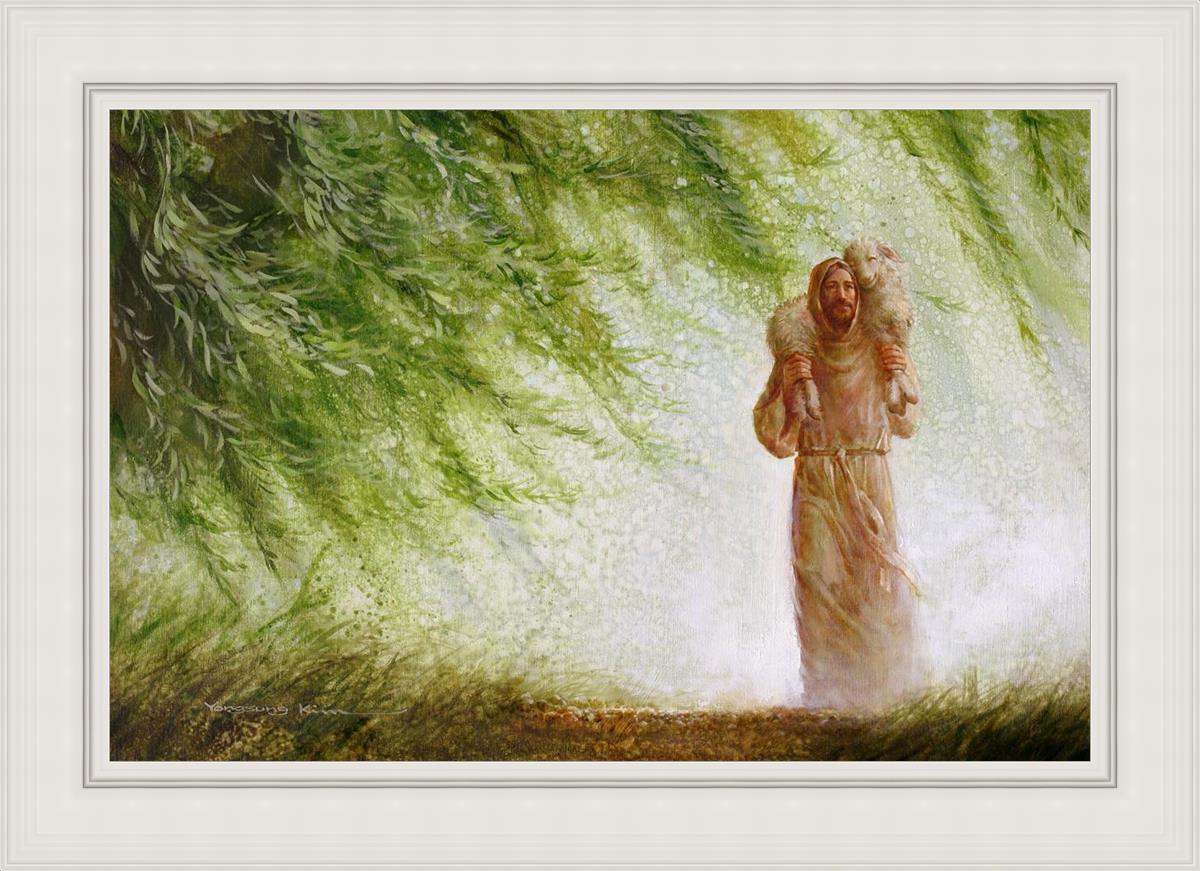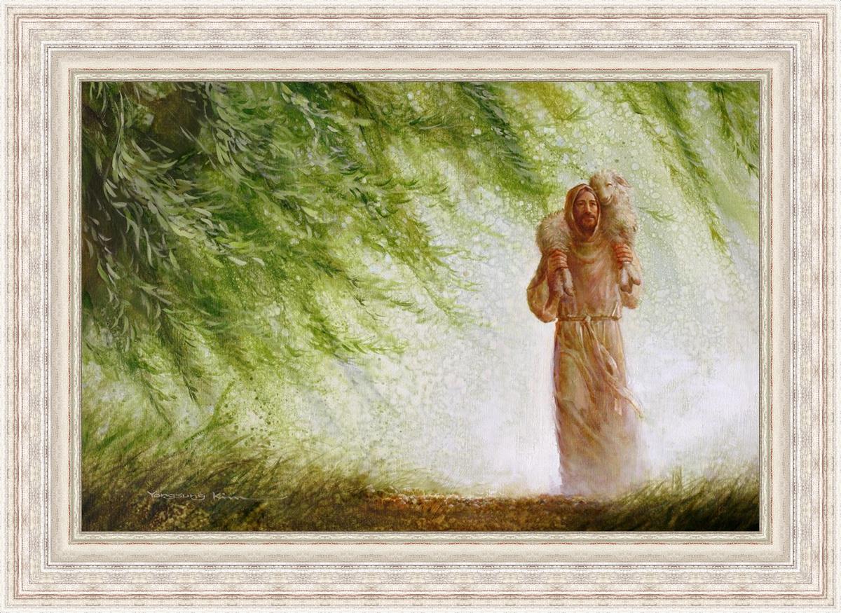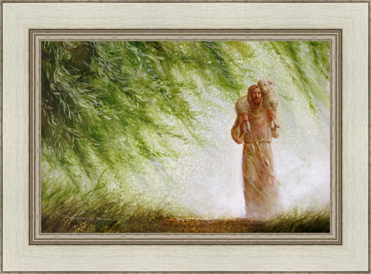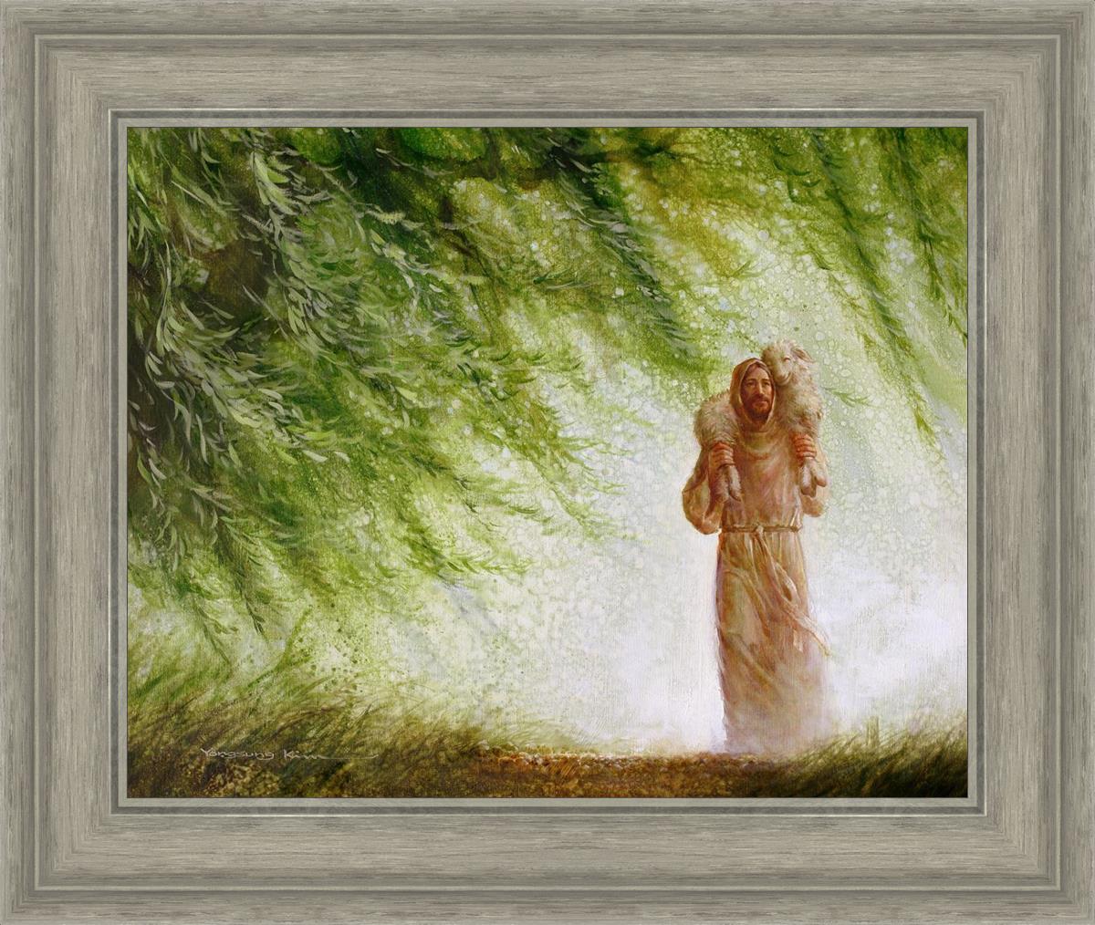 This painting powerfully captures a moment of protection and care, as Jesus Christ carries a lamb on His shoulders. The lamb represents the lost, the weary, and the broken, finding refuge in His embrace. Christ carrying the lamb on His shoulders serves as a visual metaphor for divine love and the promise that no one is ever too lost to be found. Carry On invites the viewer to reflect on the Savior's enduring presence and His loving support in times of difficulty, offering a message of hope, strength, and grace.