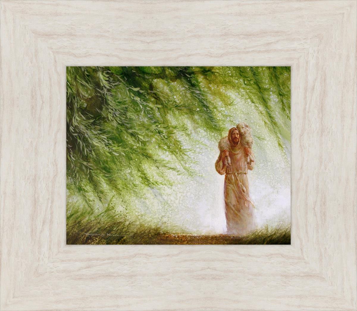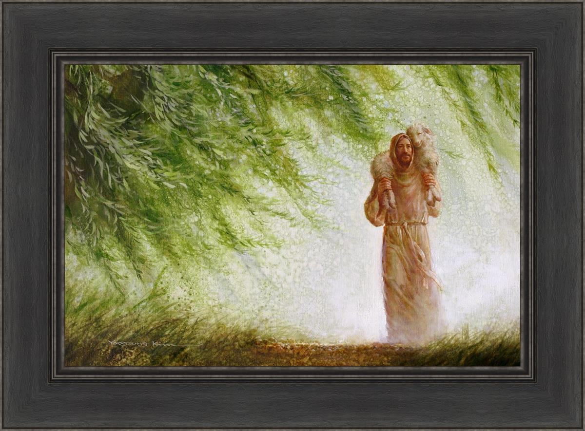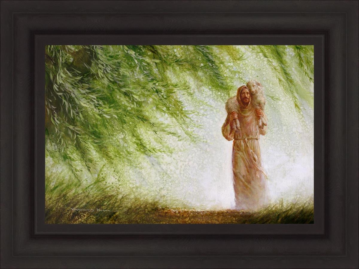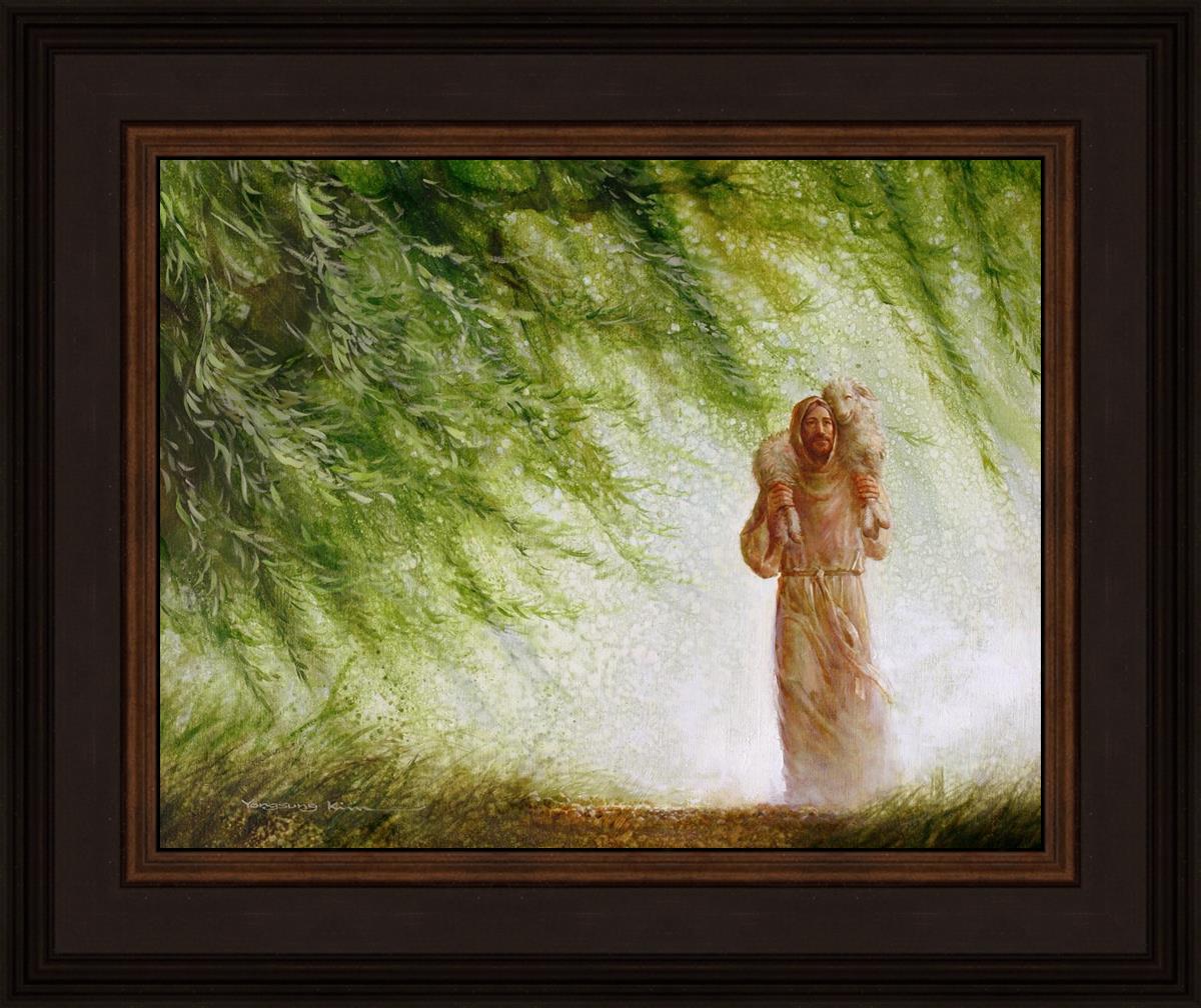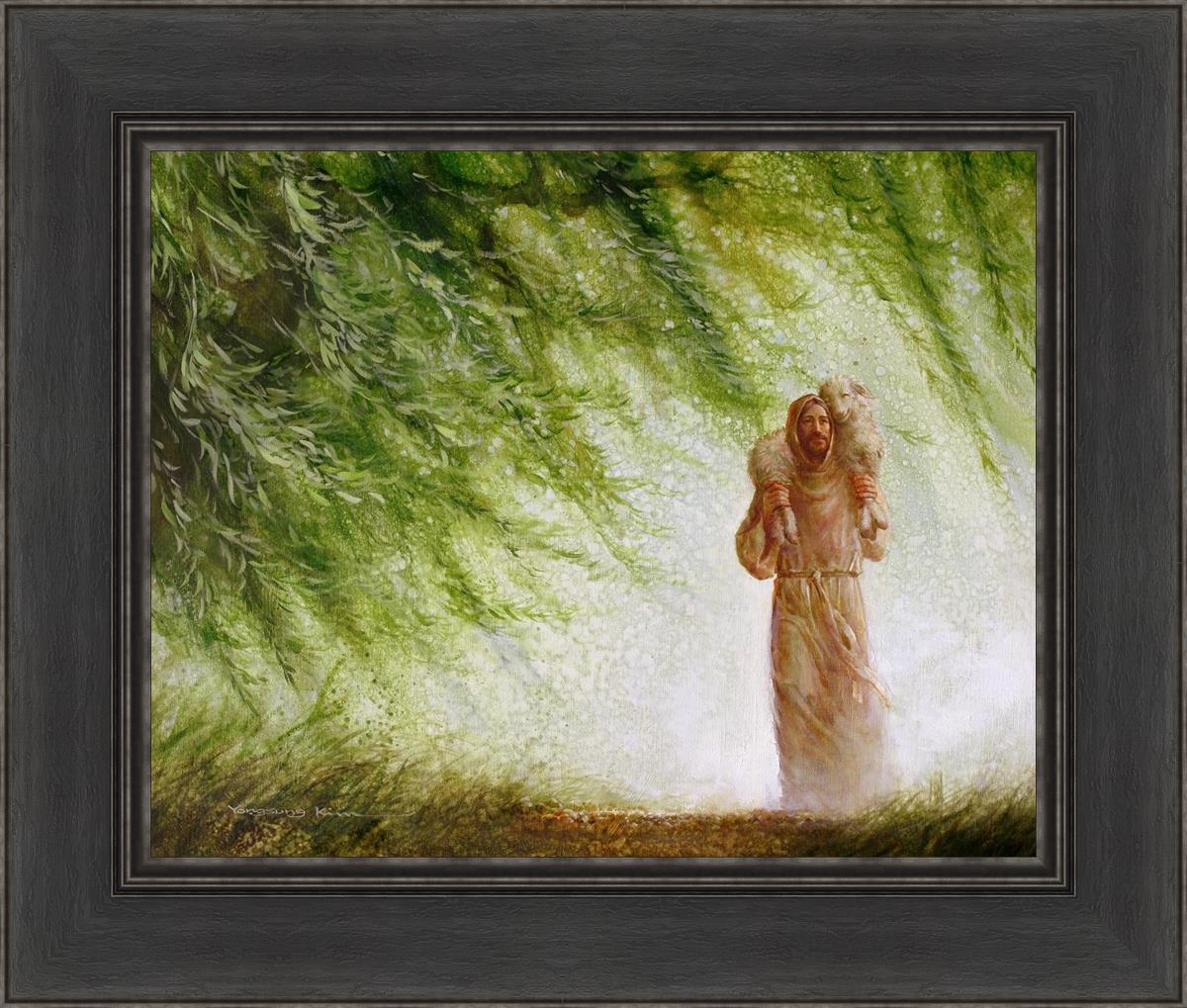 This painting powerfully captures a moment of protection and care, as Jesus Christ carries a lamb on His shoulders. The lamb represents the lost, the weary, and the broken, finding refuge in His embrace. Christ carrying the lamb on His shoulders serves as a visual metaphor for divine love and the promise that no one is ever too lost to be found. Carry On invites the viewer to reflect on the Savior's enduring presence and His loving support in times of difficulty, offering a message of hope, strength, and grace.