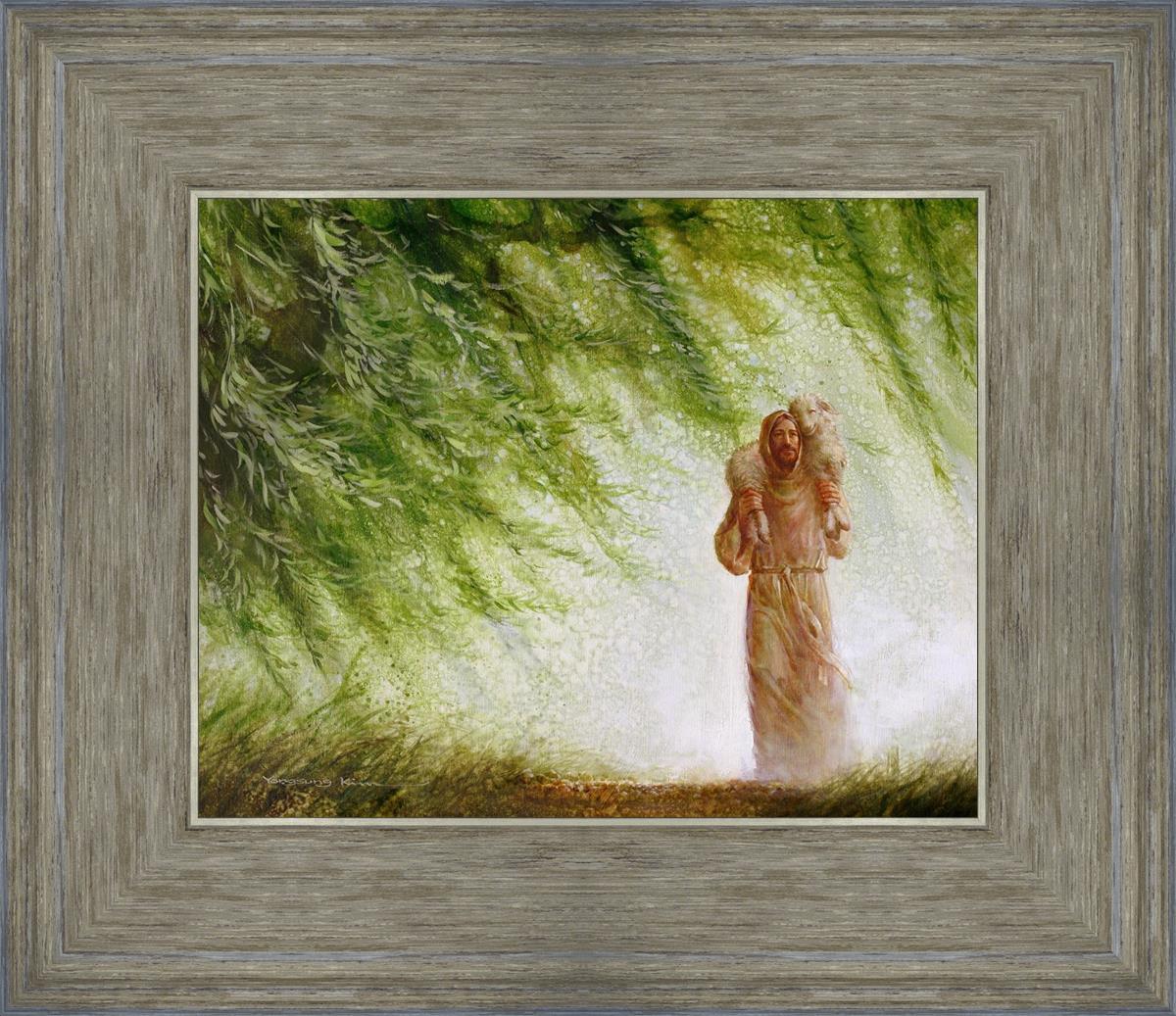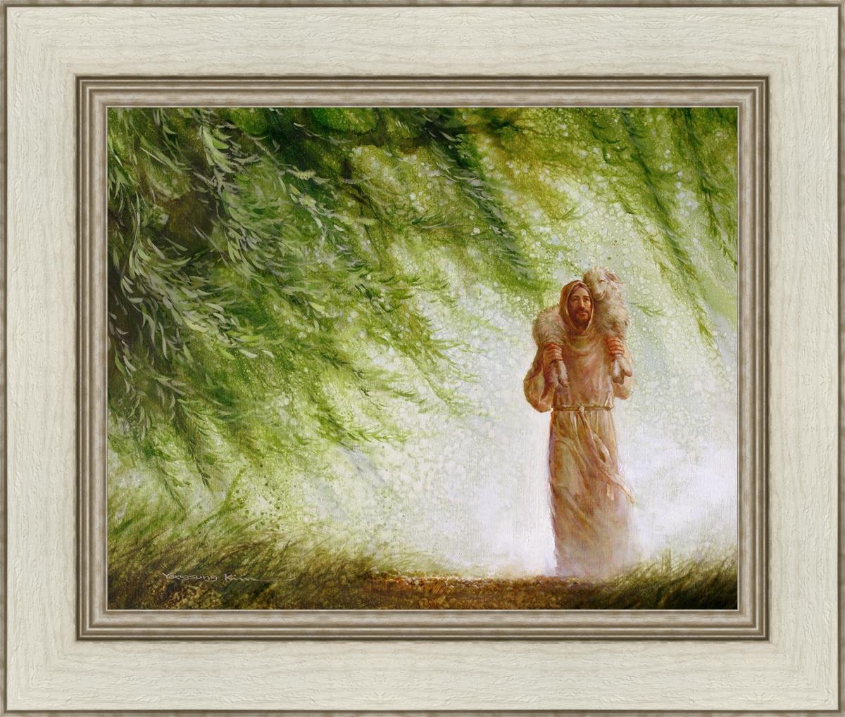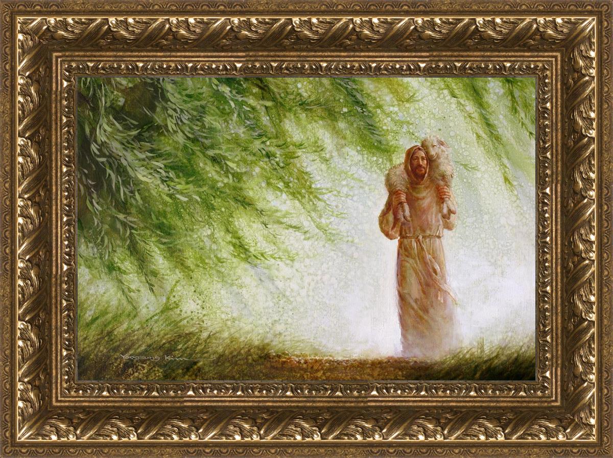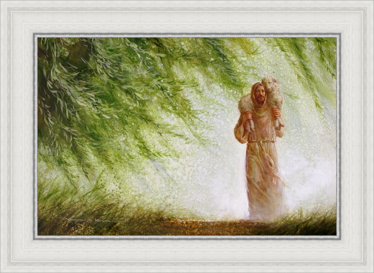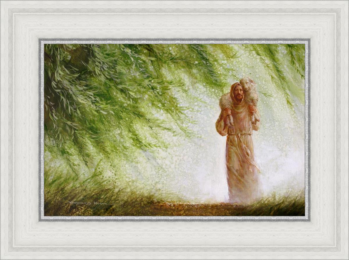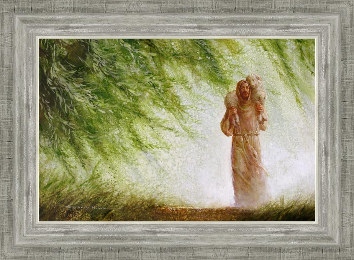 This painting powerfully captures a moment of protection and care, as Jesus Christ carries a lamb on His shoulders. The lamb represents the lost, the weary, and the broken, finding refuge in His embrace. Christ carrying the lamb on His shoulders serves as a visual metaphor for divine love and the promise that no one is ever too lost to be found. Carry On invites the viewer to reflect on the Savior's enduring presence and His loving support in times of difficulty, offering a message of hope, strength, and grace.