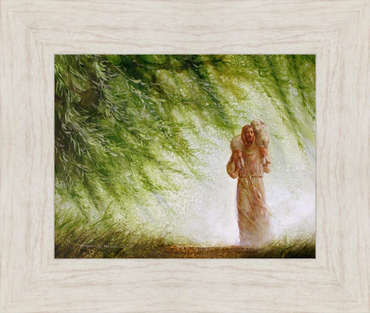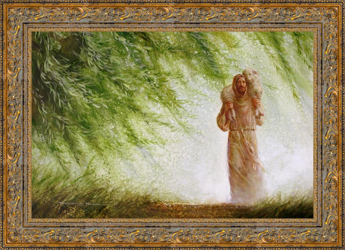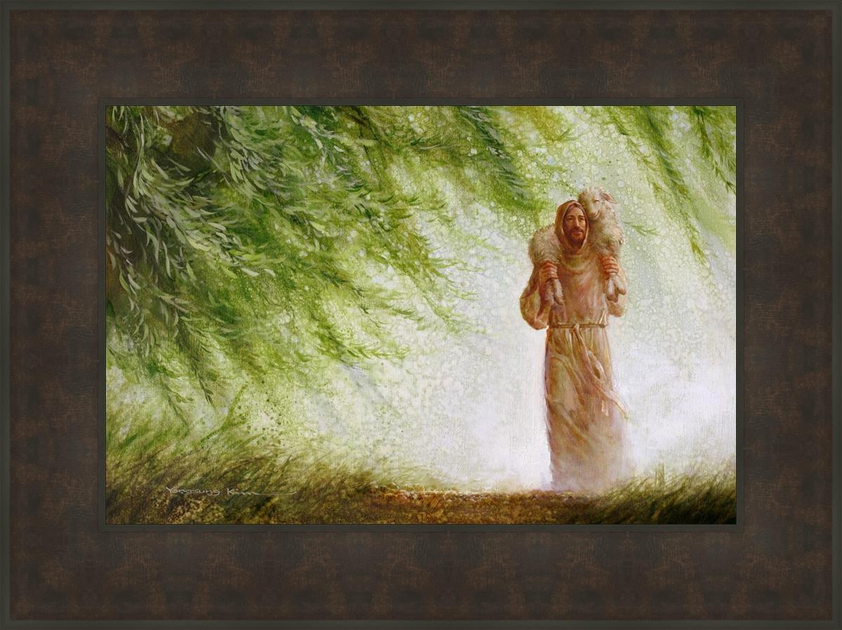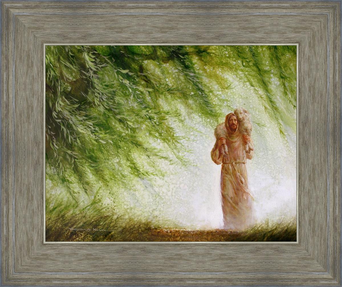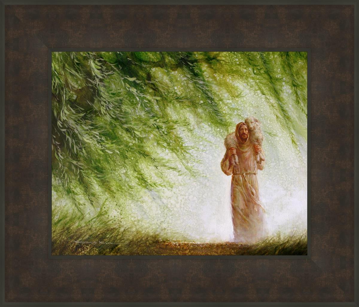 This painting powerfully captures a moment of protection and care, as Jesus Christ carries a lamb on His shoulders. The lamb represents the lost, the weary, and the broken, finding refuge in His embrace. Christ carrying the lamb on His shoulders serves as a visual metaphor for divine love and the promise that no one is ever too lost to be found. Carry On invites the viewer to reflect on the Savior's enduring presence and His loving support in times of difficulty, offering a message of hope, strength, and grace.